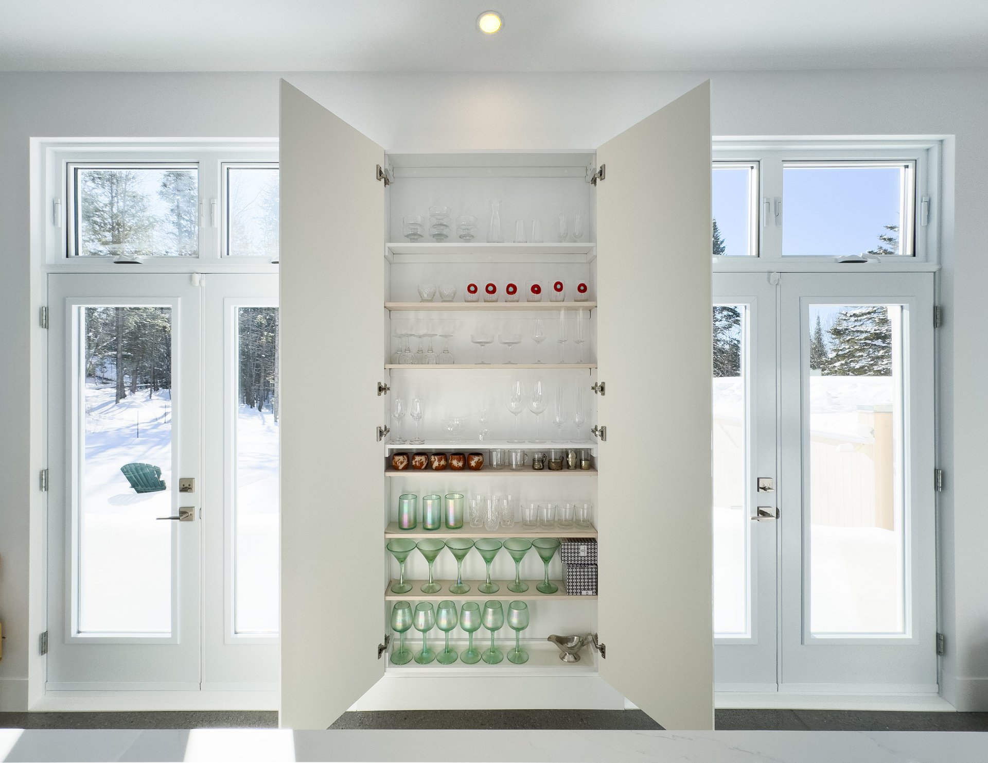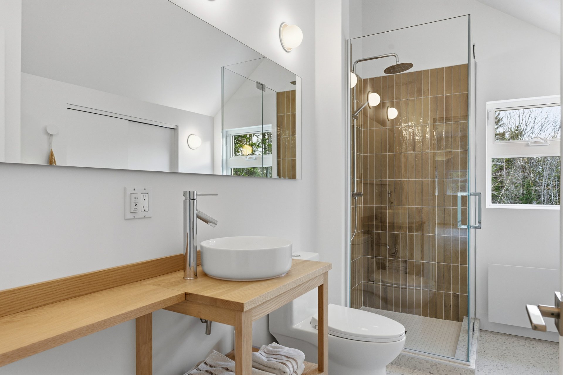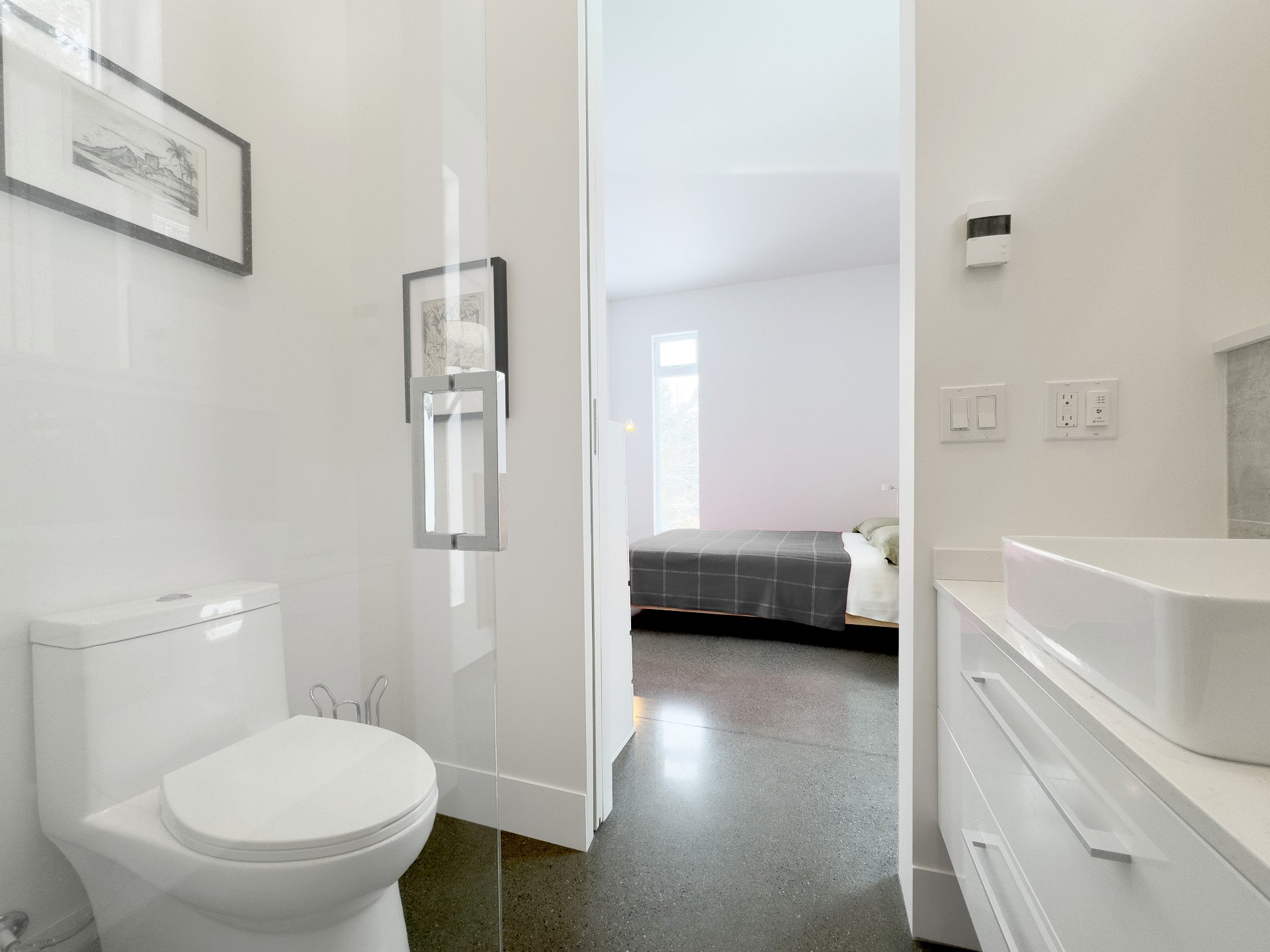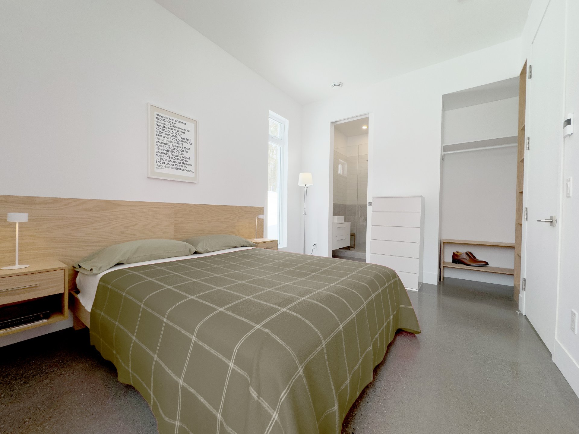 Les espaces de vie se développent dans une logique de fluidité et d'efficacité. Le rez-de-chaussée, baigné de lumière, rassemble une aire ouverte où cuisine fonctionnelle, espace dinette et salon avec poêle au bois et bibliothèque intégrée s'inscrivent dans une continuité horizontale cohérente. Les planchers radiants assurent un confort diffus et constant, amplifiant la sensation de calme et de bien-être.