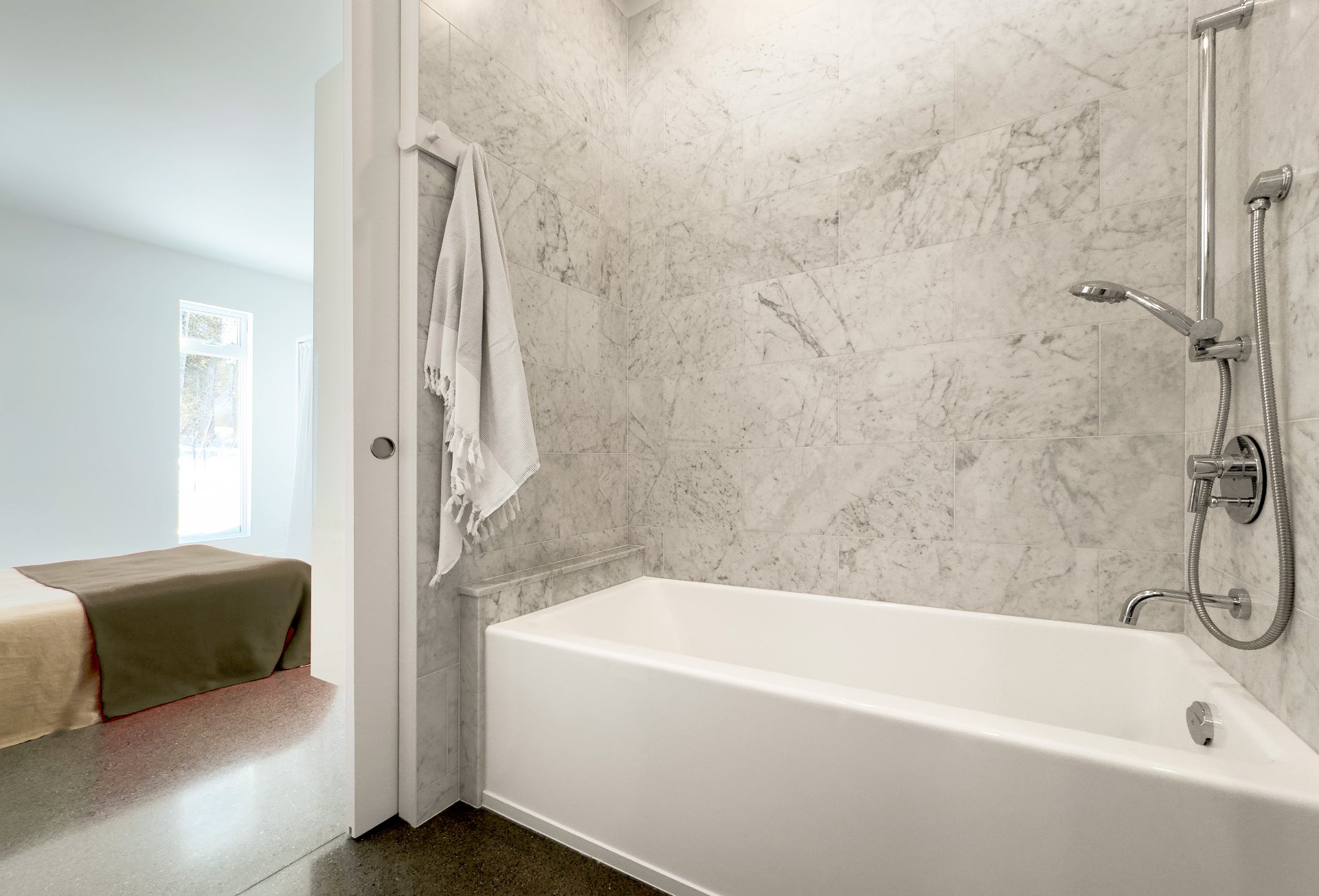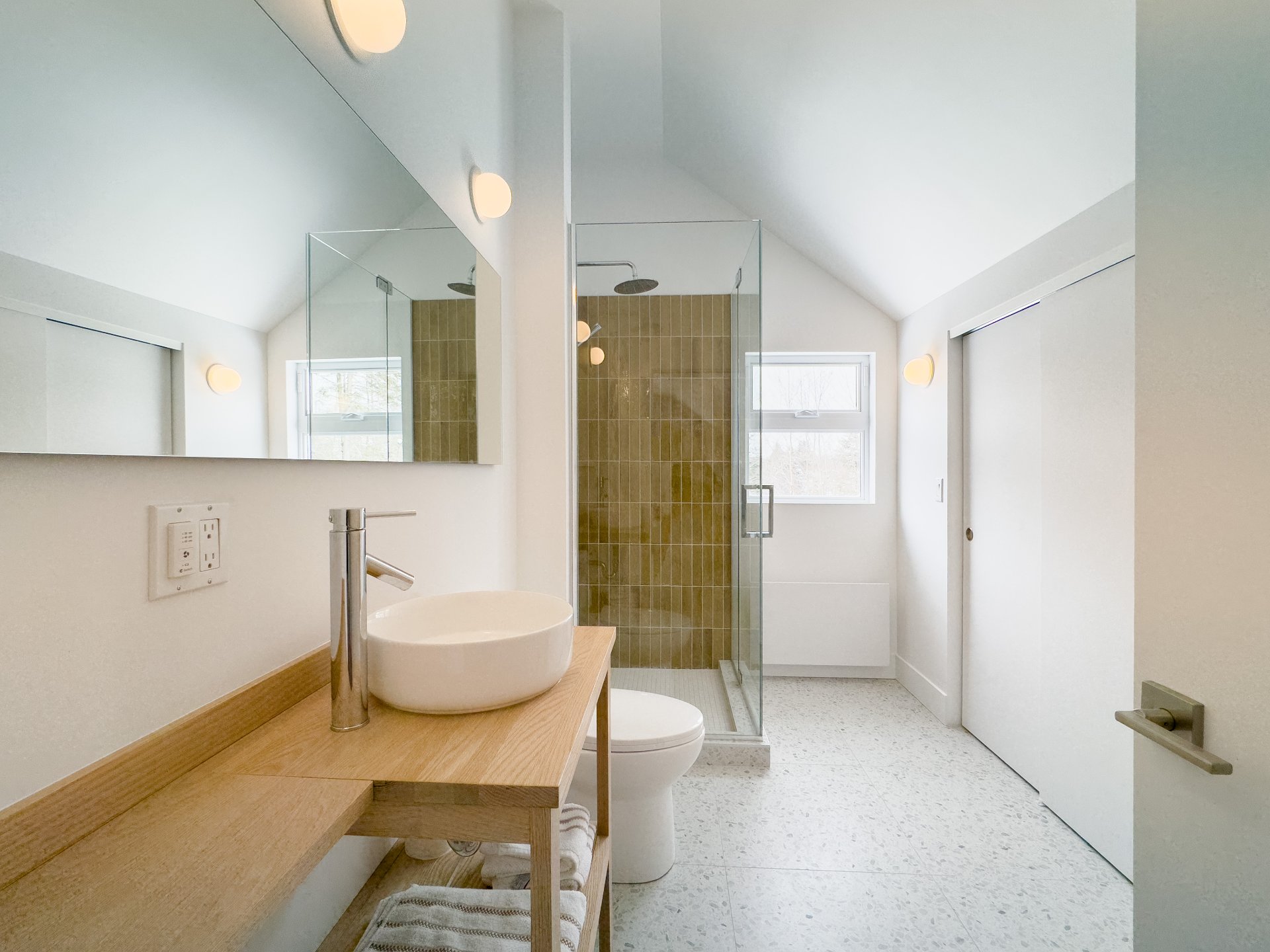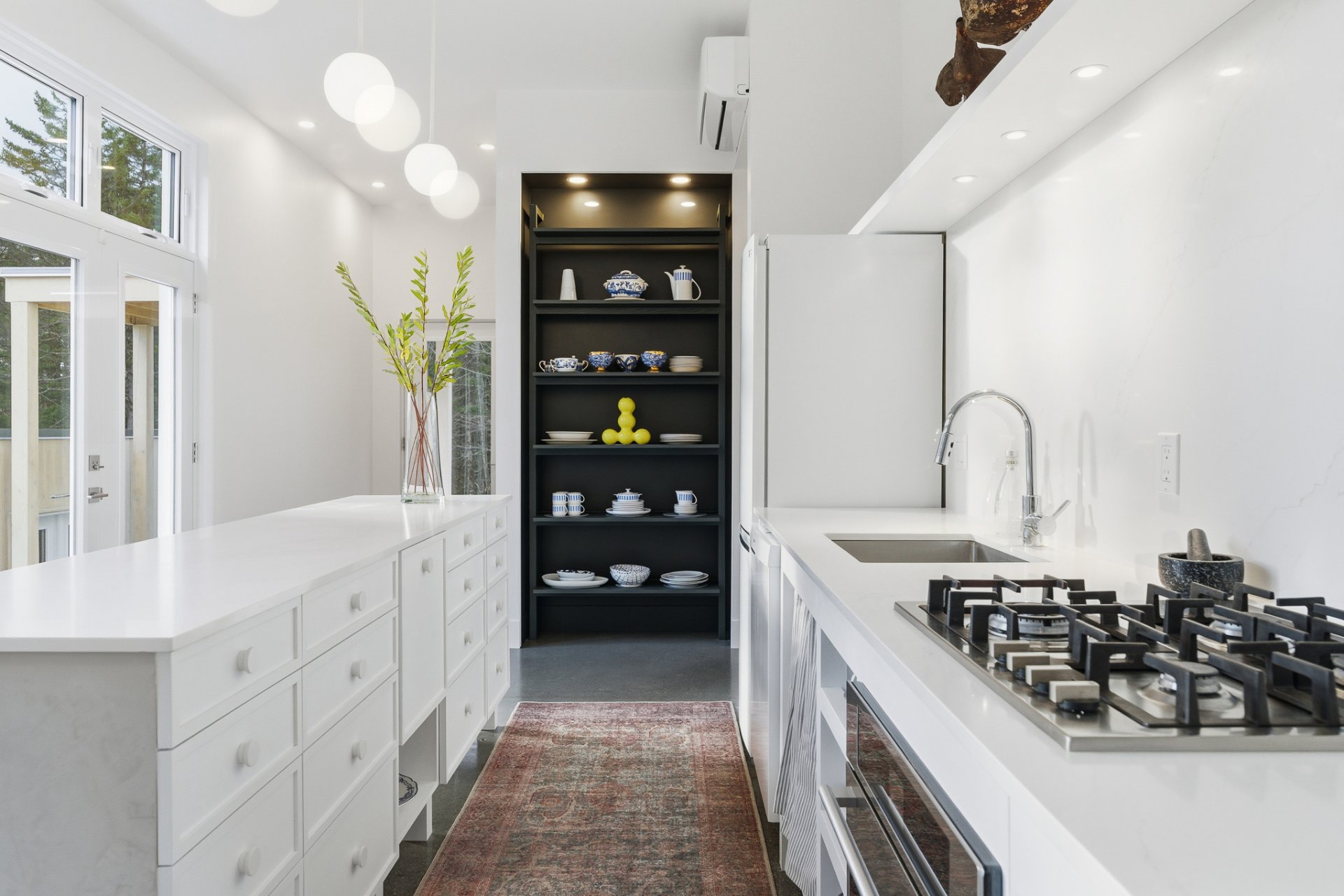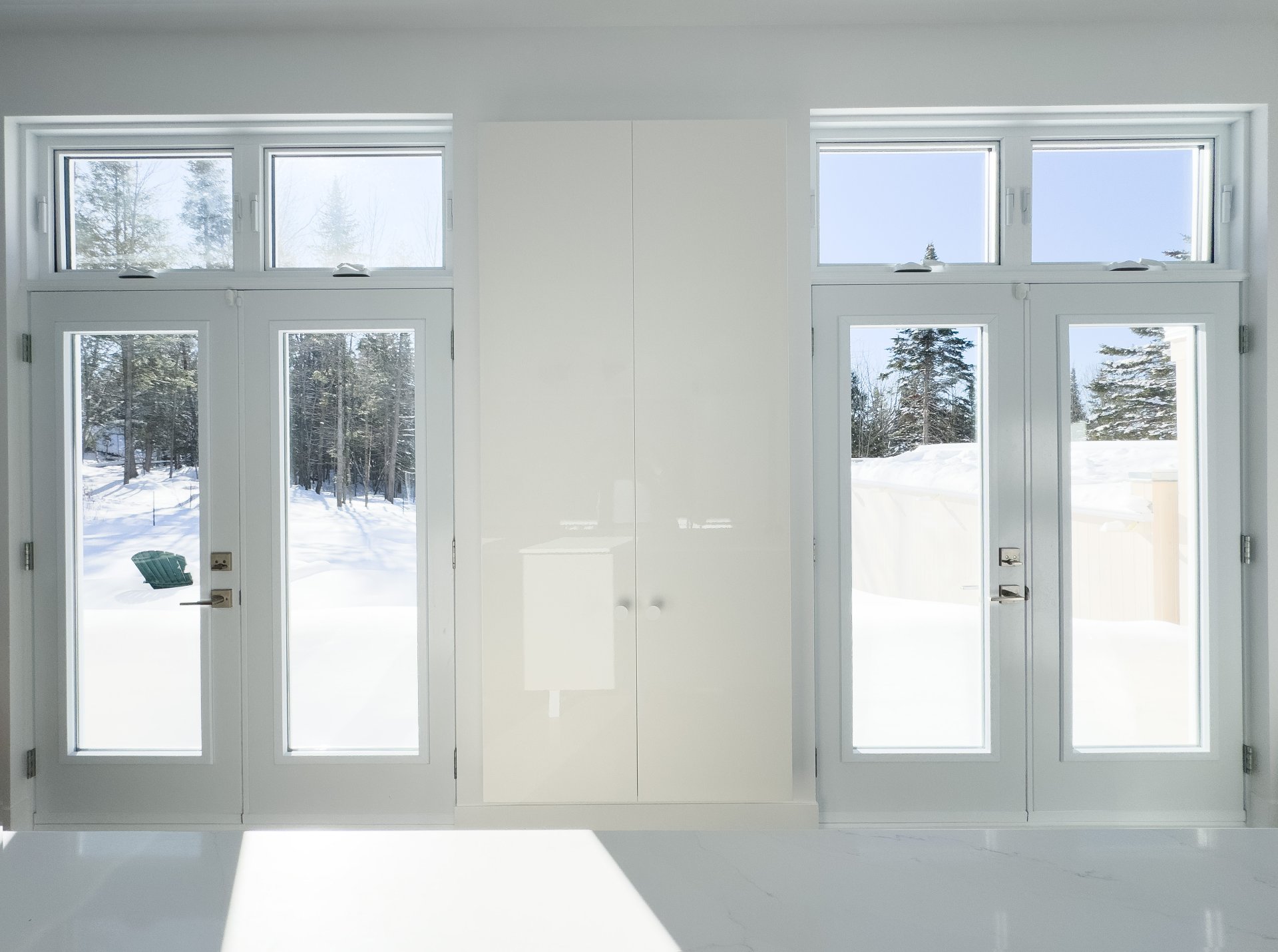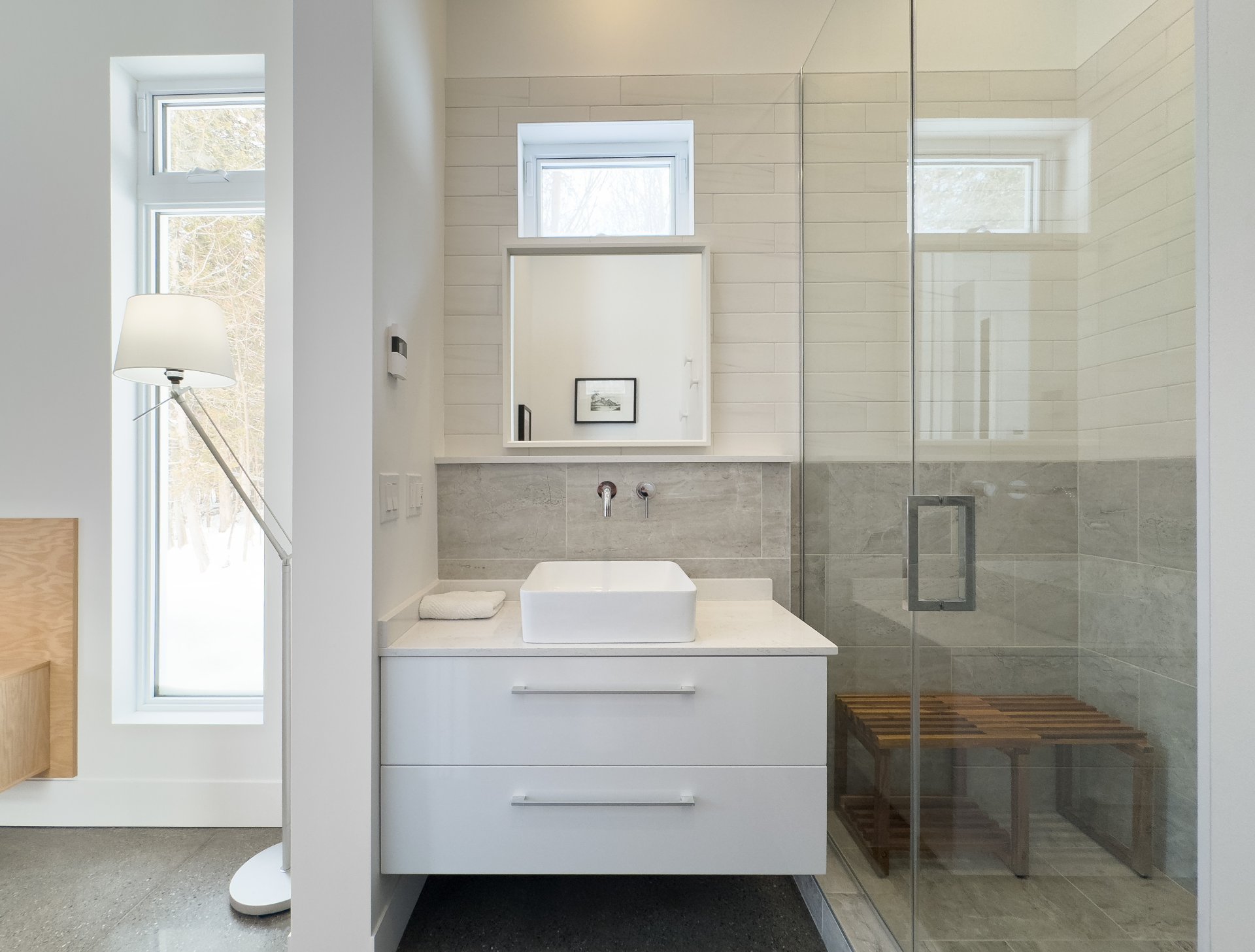 Les espaces de vie se développent dans une logique de fluidité et d'efficacité. Le rez-de-chaussée, baigné de lumière, rassemble une aire ouverte où cuisine fonctionnelle, espace dinette et salon avec poêle au bois et bibliothèque intégrée s'inscrivent dans une continuité horizontale cohérente. Les planchers radiants assurent un confort diffus et constant, amplifiant la sensation de calme et de bien-être.