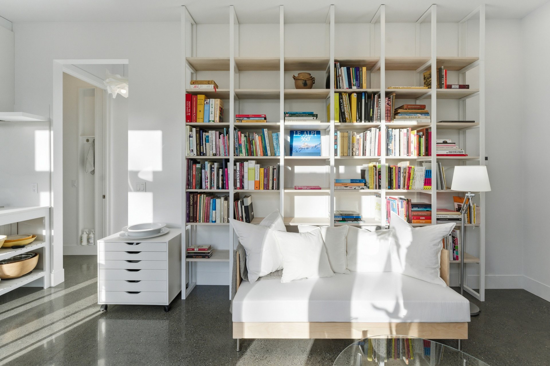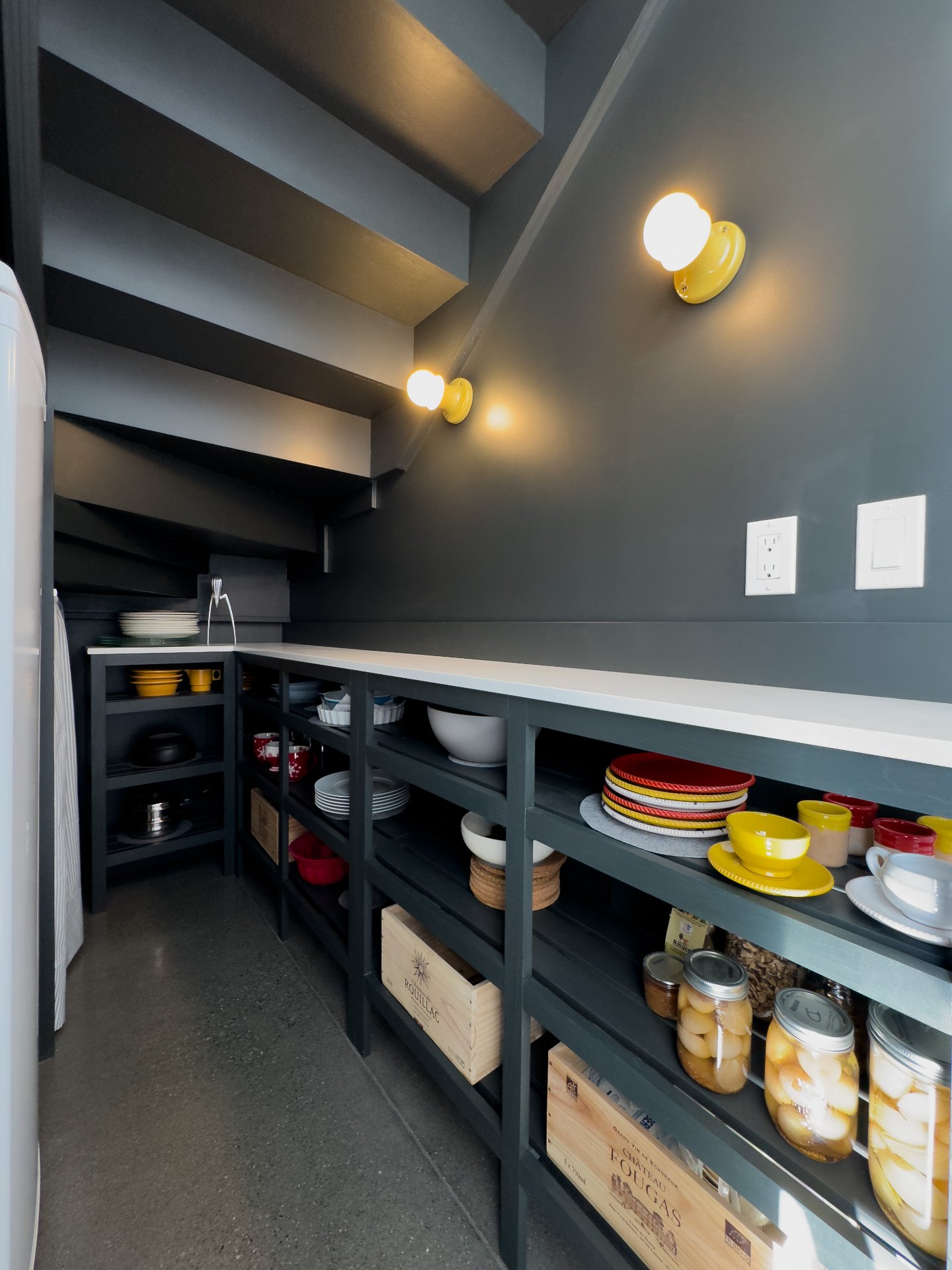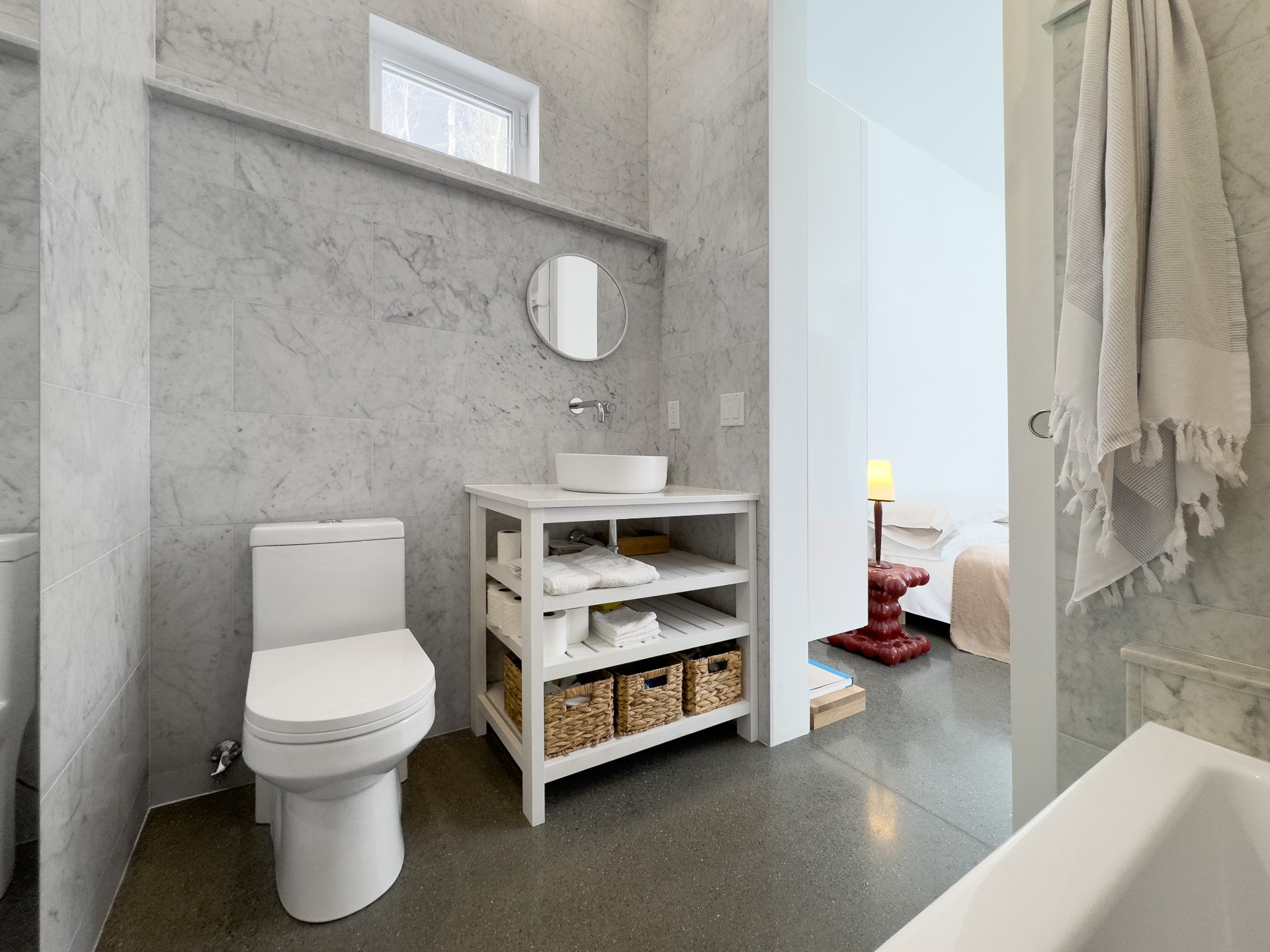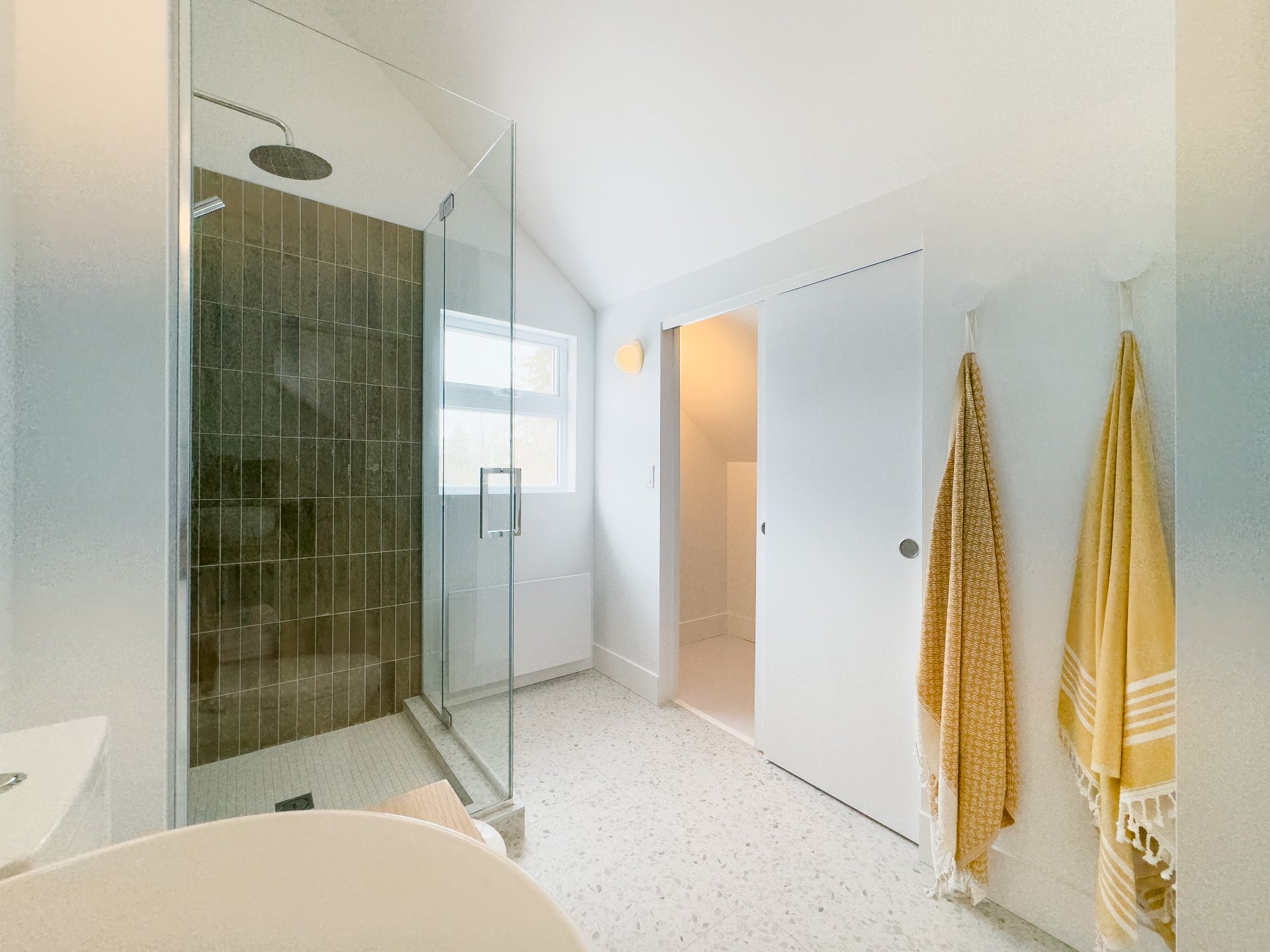 Les espaces de vie se développent dans une logique de fluidité et d'efficacité. Le rez-de-chaussée, baigné de lumière, rassemble une aire ouverte où cuisine fonctionnelle, espace dinette et salon avec poêle au bois et bibliothèque intégrée s'inscrivent dans une continuité horizontale cohérente. Les planchers radiants assurent un confort diffus et constant, amplifiant la sensation de calme et de bien-être.