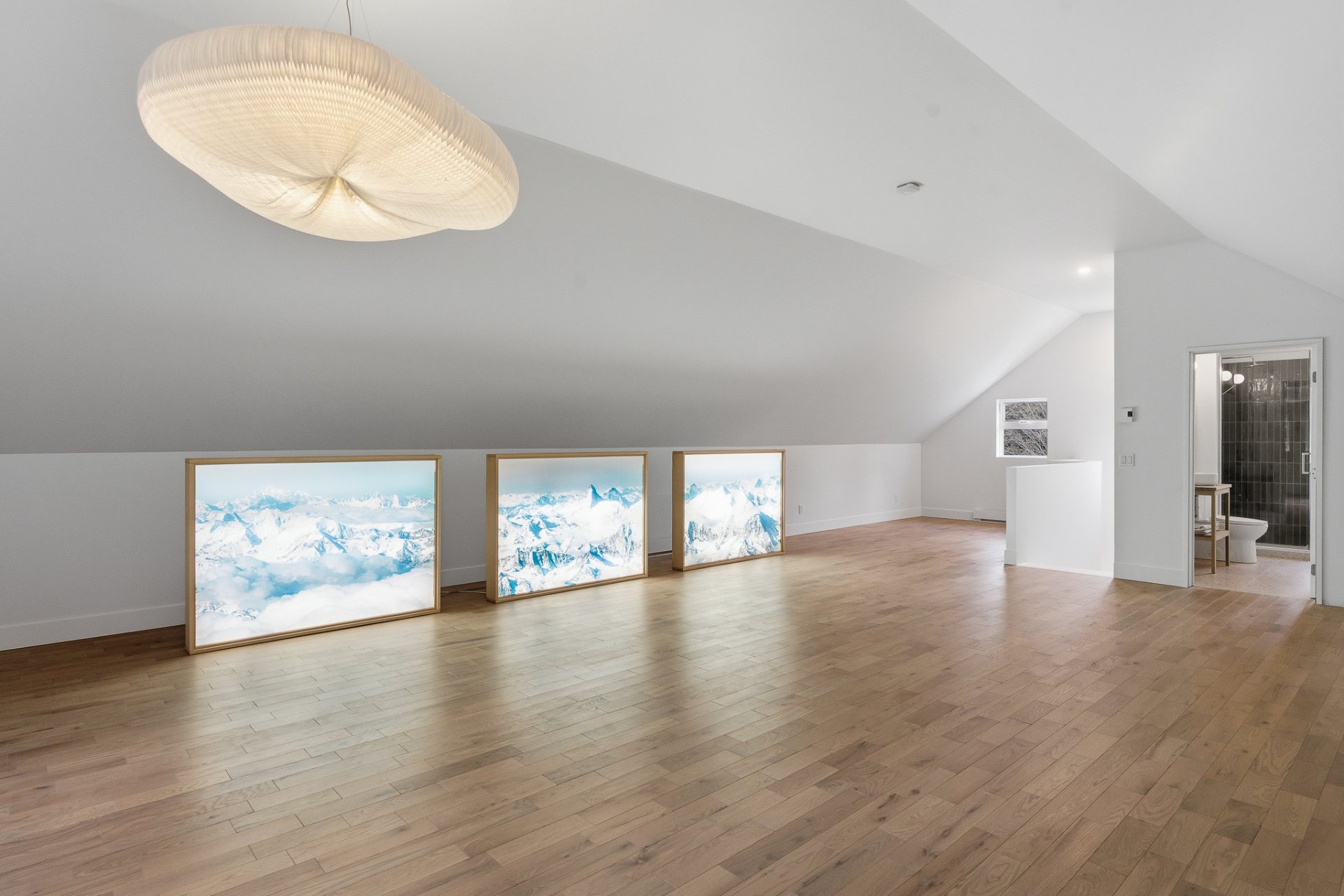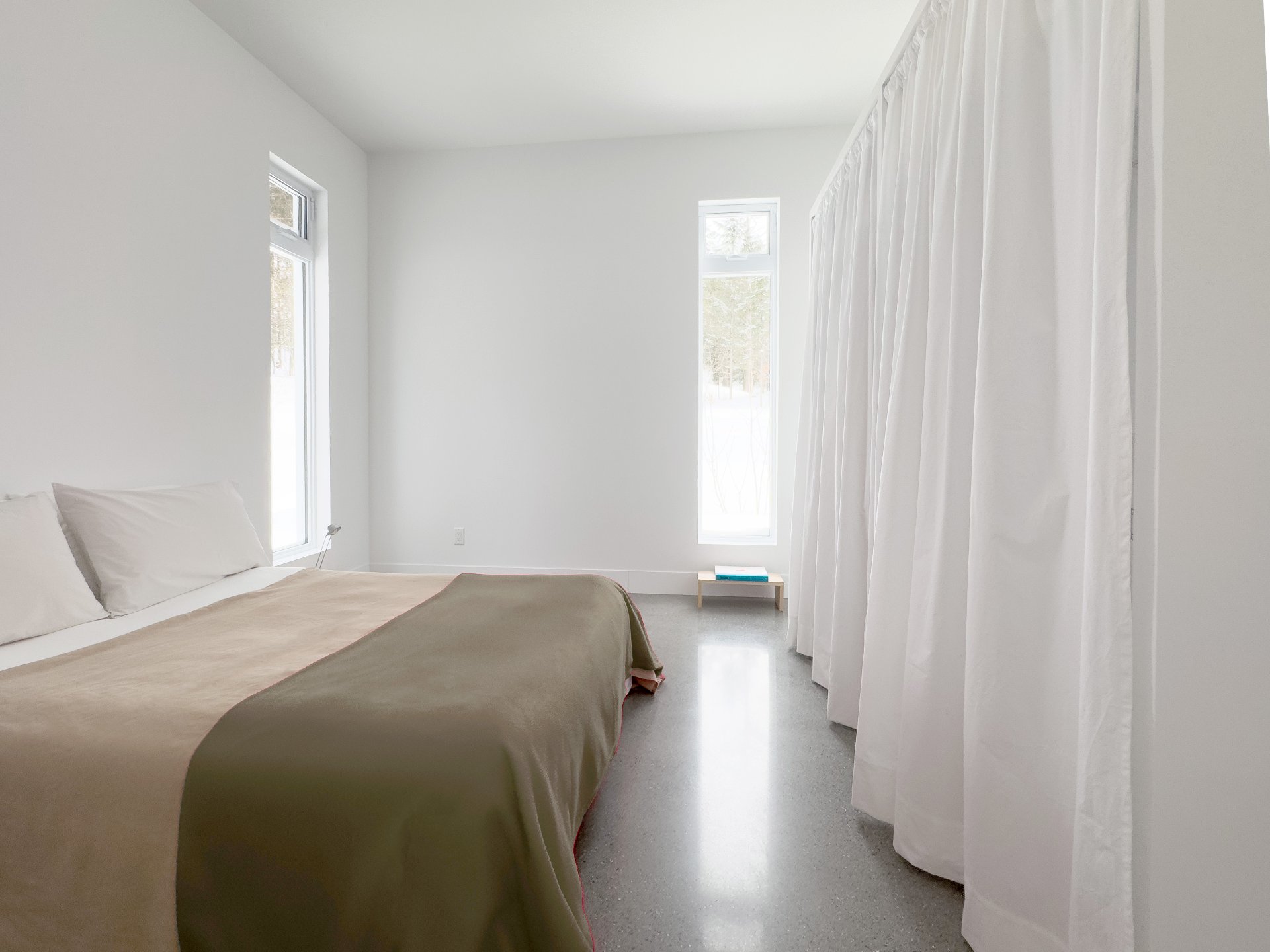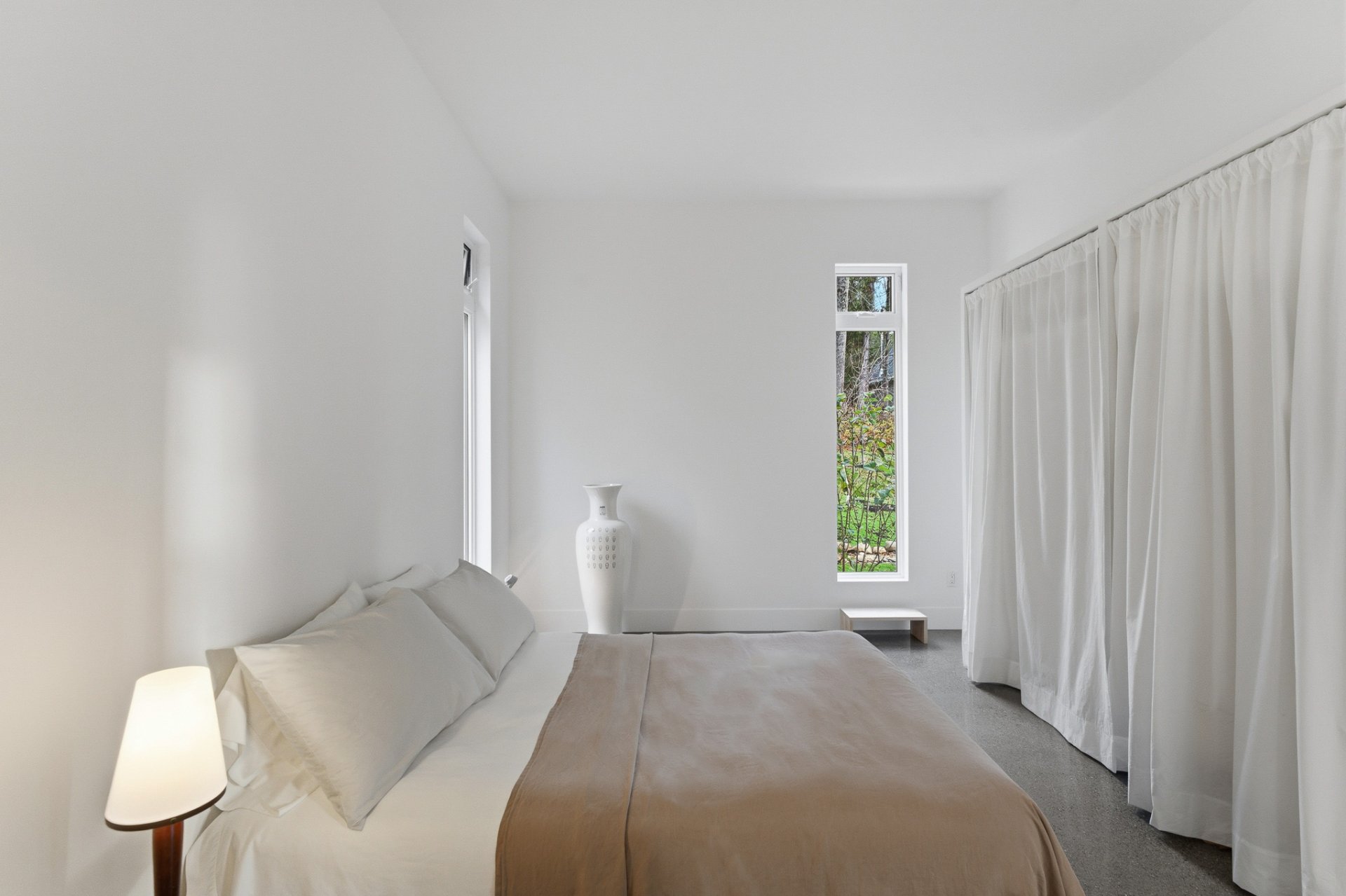 La volumétrie simple et les lignes droites expriment une esthétique minimaliste et intemporelle, où la lumière devient un élément structurant de l'expérience quotidienne. La vaste fenestration, orientée avec justesse vers la cour arrière, capte le mouvement du soleil tout au long de la journée et encadre des vues apaisantes sur les jardins, les pommiers et la forêt en arrière-plan. L'intimité y est subtilement protégée par la disposition réfléchie des ouvertures et du garage, qui forme une barrière visuelle naturelle.