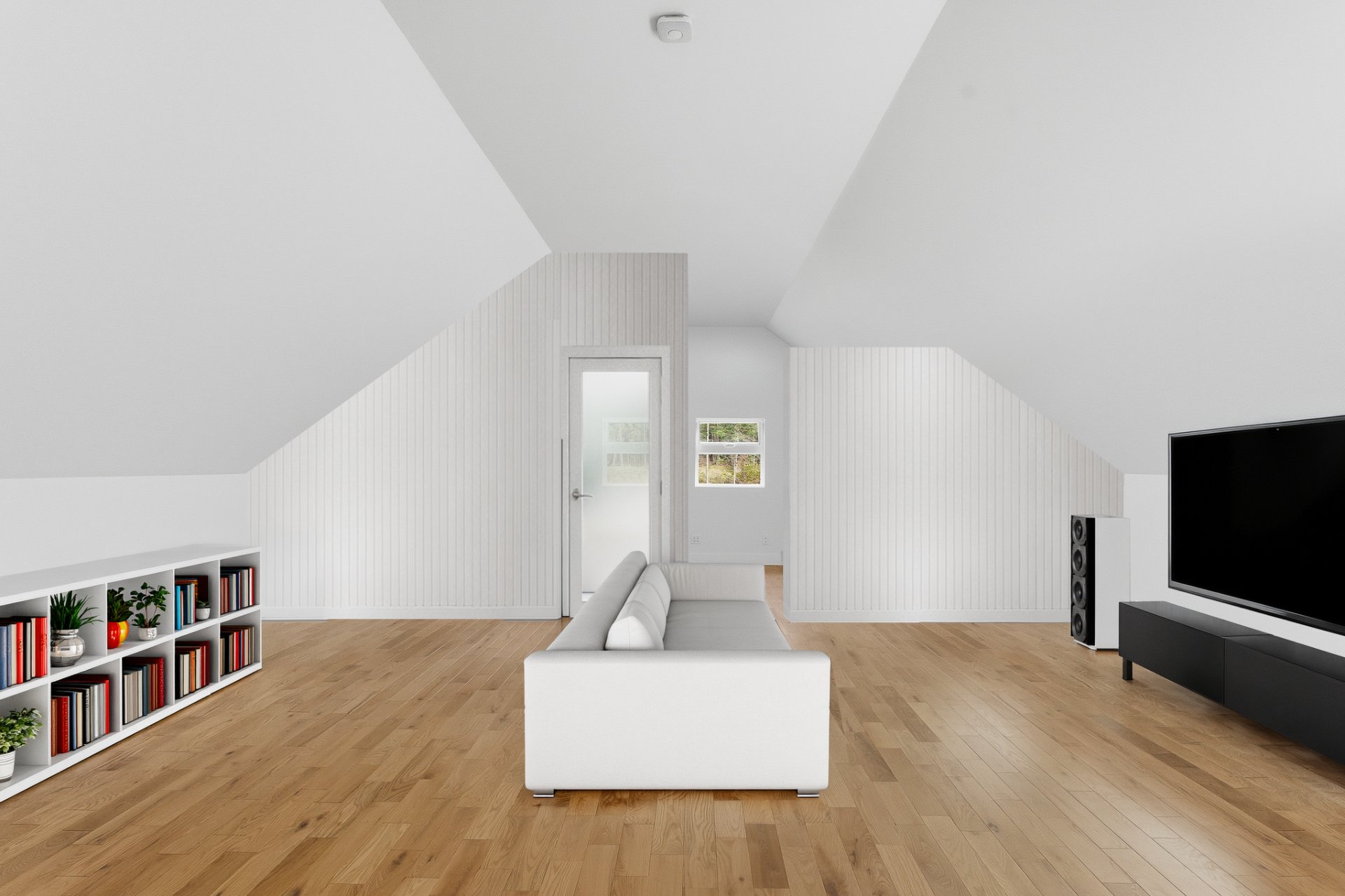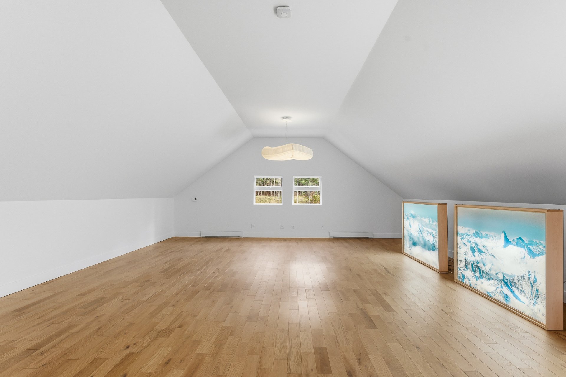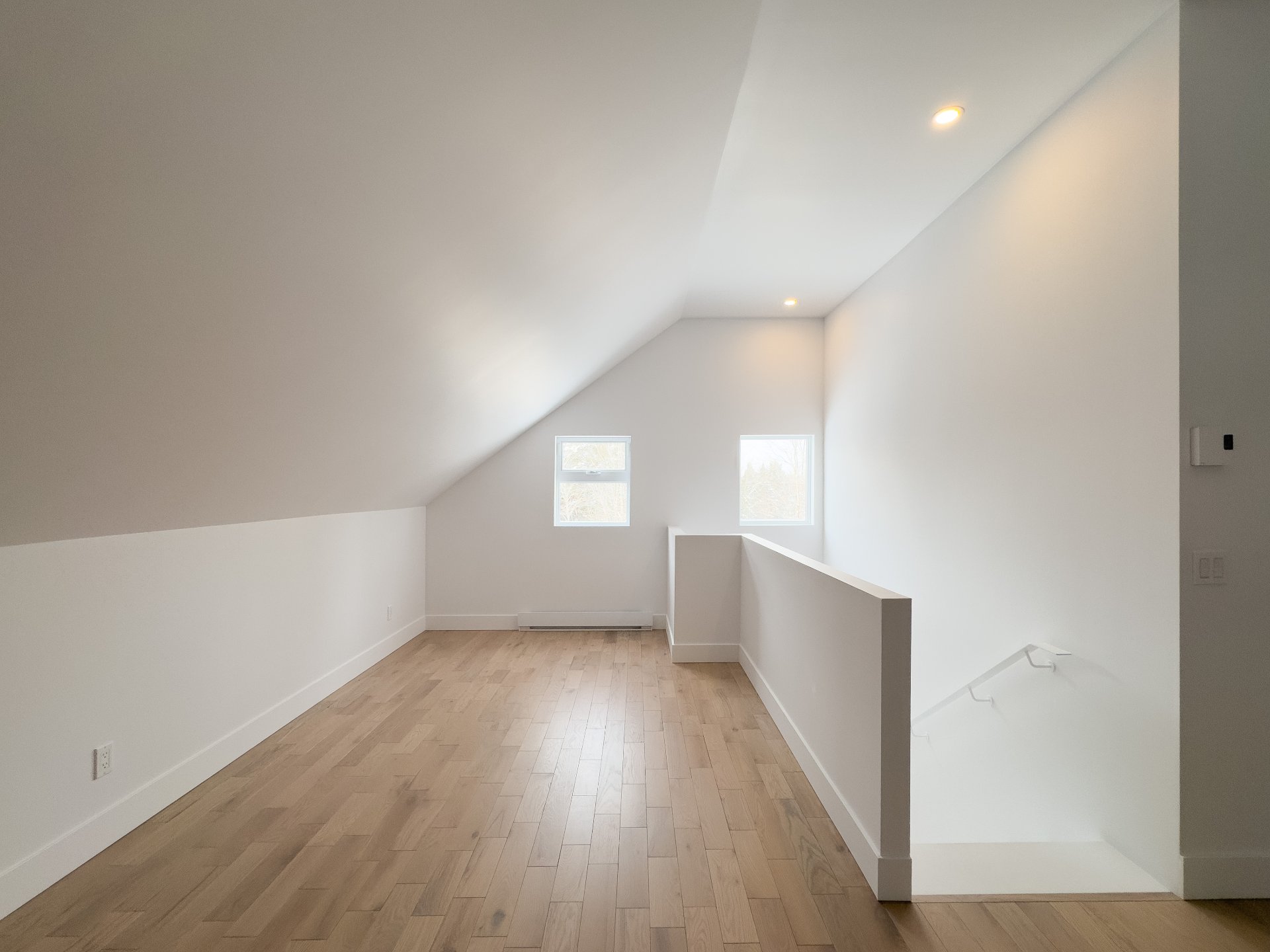 La propriété compte deux suites principales, chacune dotée de sa salle de bain complète, offrant intimité et équilibre spatial. À l'étage, une grande pièce polyvalente s'élève sous un haut plafond de 10 pieds et s'adapte à toutes les vocations : salon secondaire, bureau d'atelier, espace de jeu ou chambre additionnelle. Une salle de bain complète y complète l'ensemble, permettant une occupation totalement indépendante.