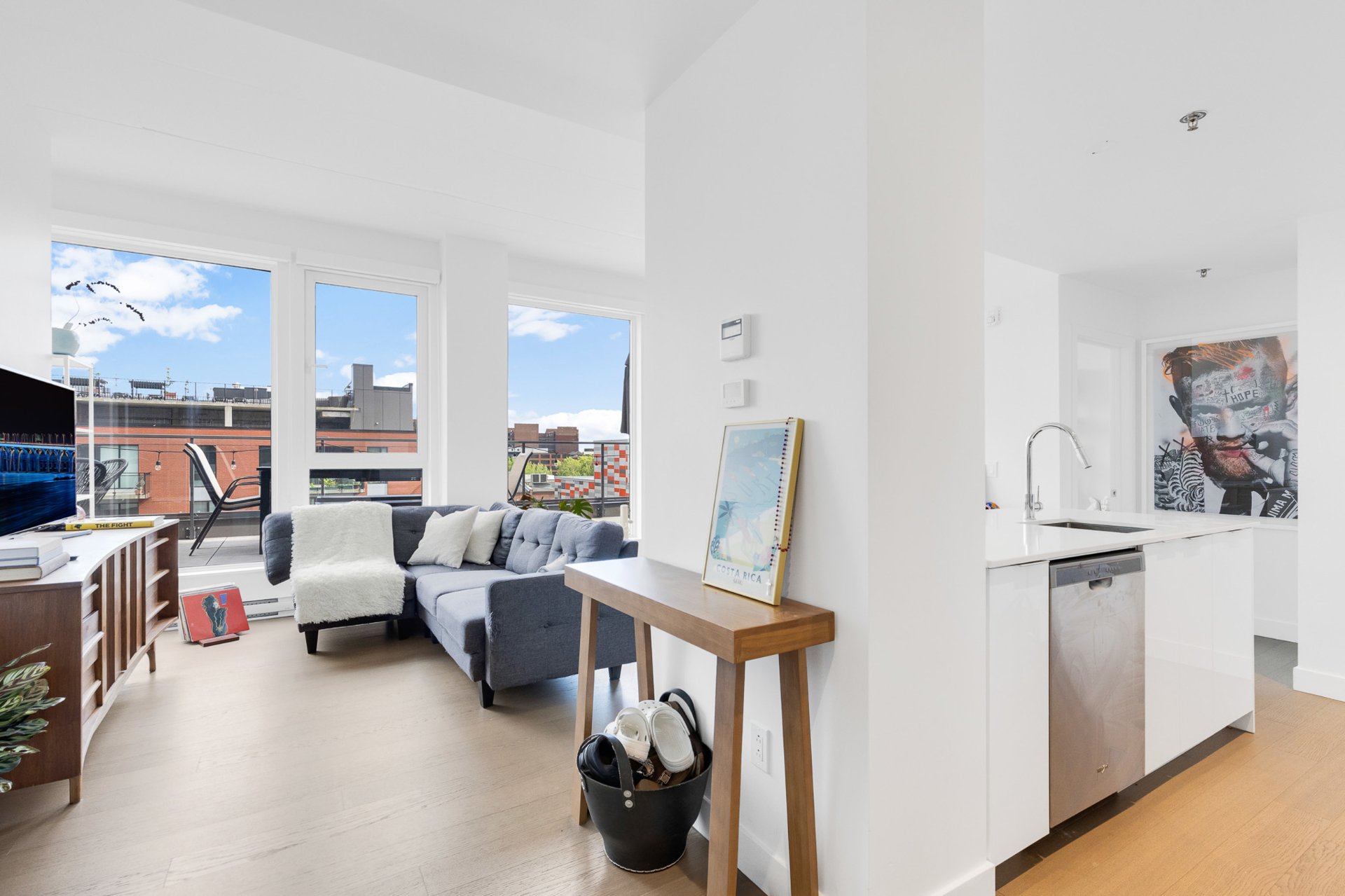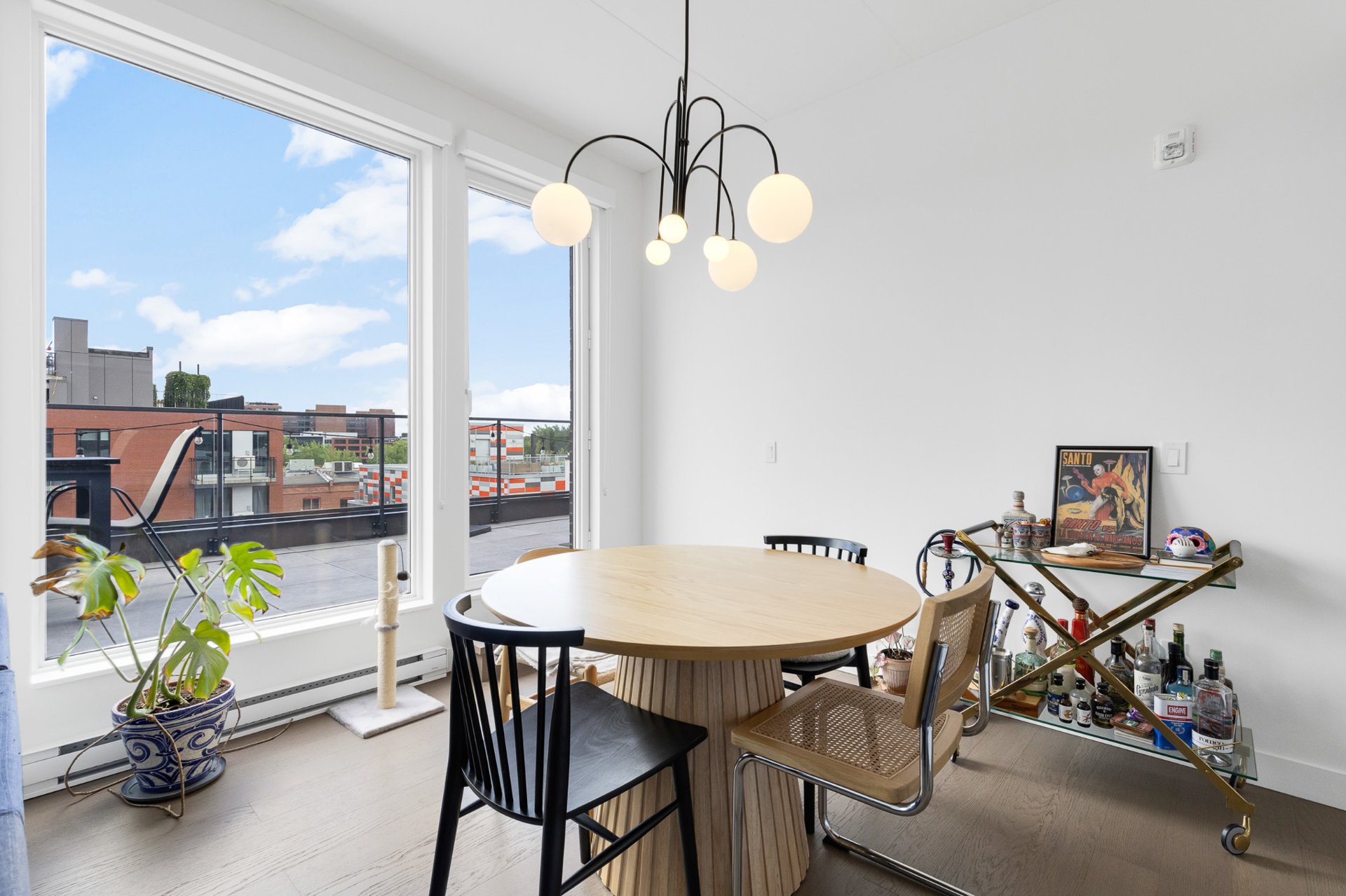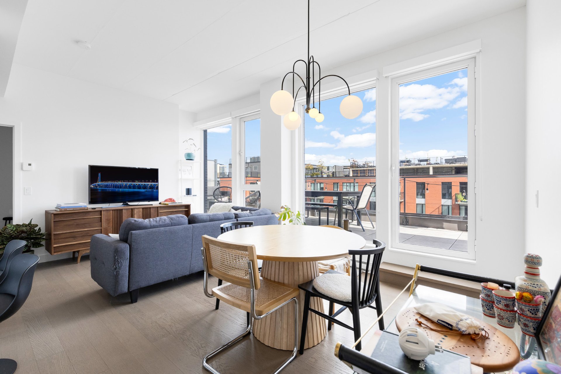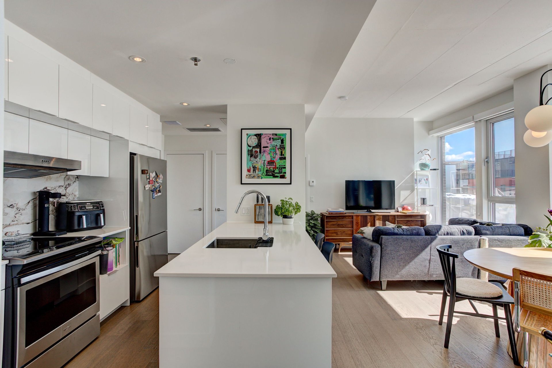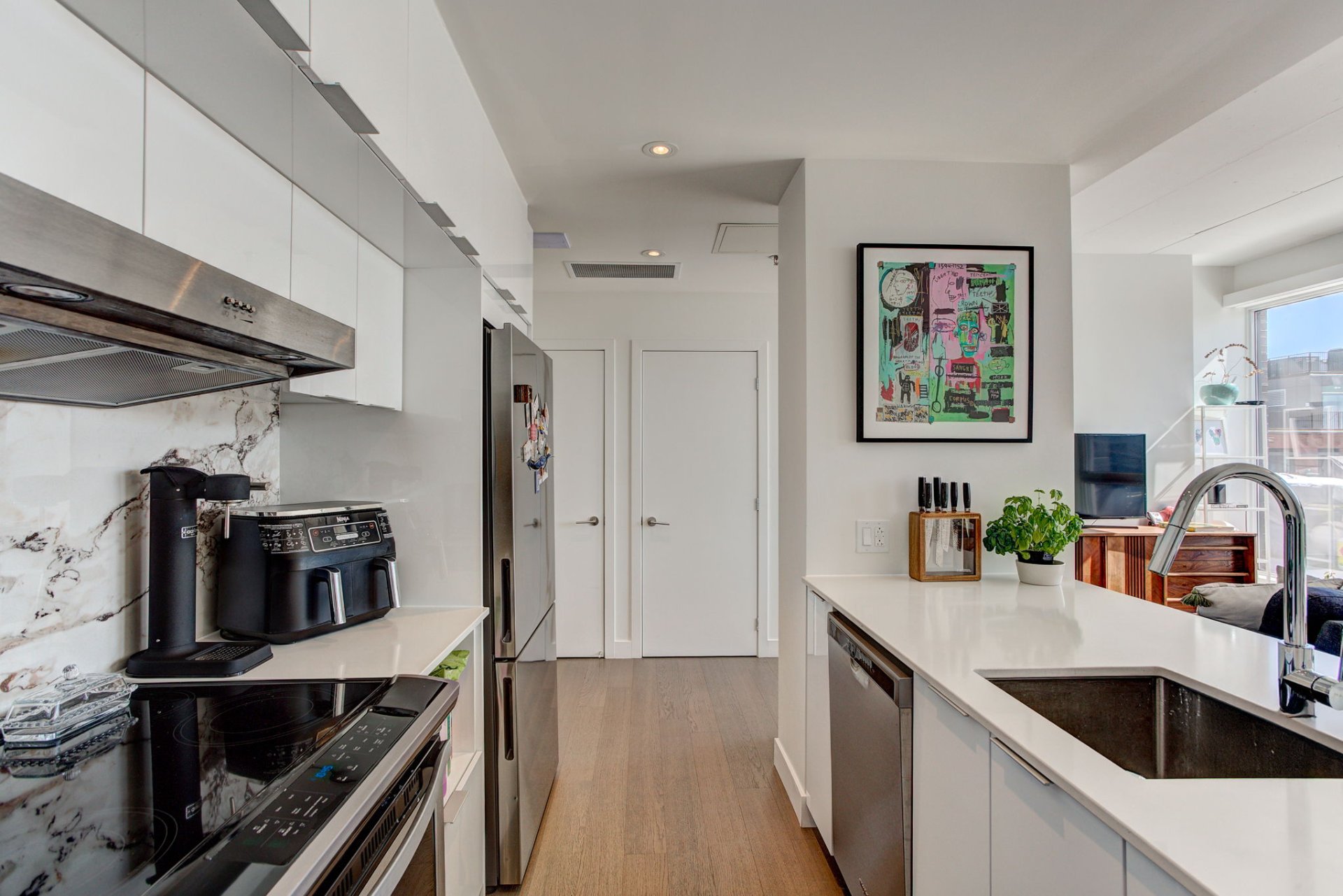 Ce penthouse offre des fenêtres pleine hauteur qui inondent l'espace de lumière naturelle et s'ouvrent sur une terrasse privée de 40 pieds, idéale pour les réceptions. L'aire de vie décloisonnée comprend un salon et une salle à manger spacieux avec plafonds élevés et planchers en bois. La cuisine moderne est équipée de comptoirs en quartz, d'un grand îlot central et d'électros haut de gamme. La chambre principale dispose d'un walk-in et d'une salle de bains attenante, complétée par une deuxième chambre et une salle de bains pour invités. Accès à une salle de sport, piscine extérieure et quartier animé.