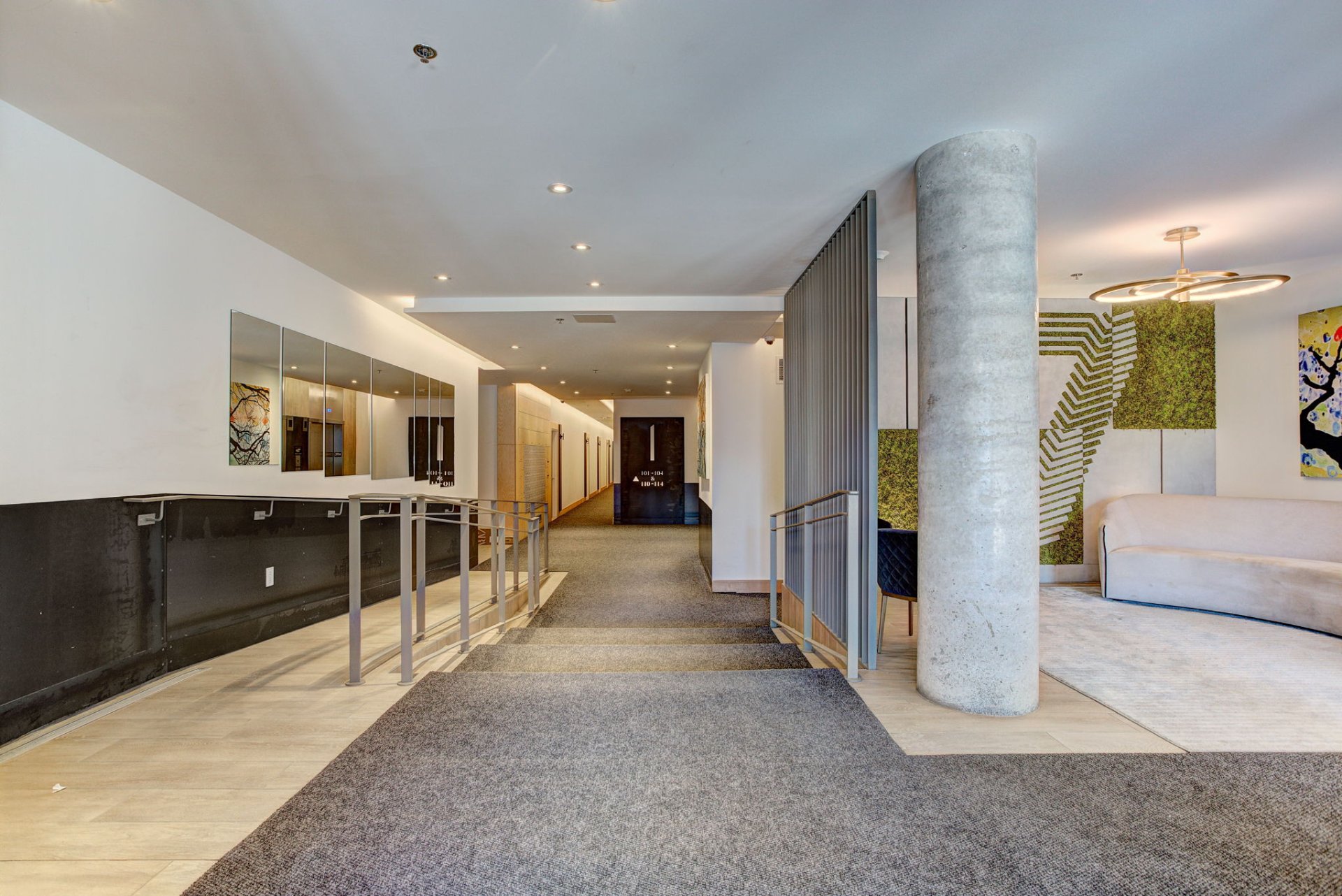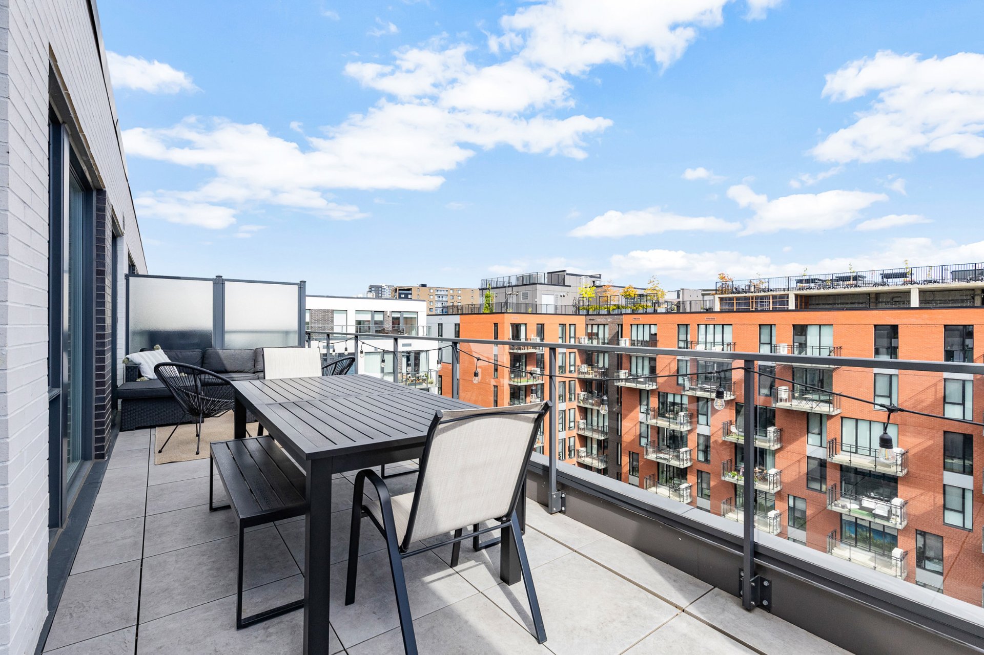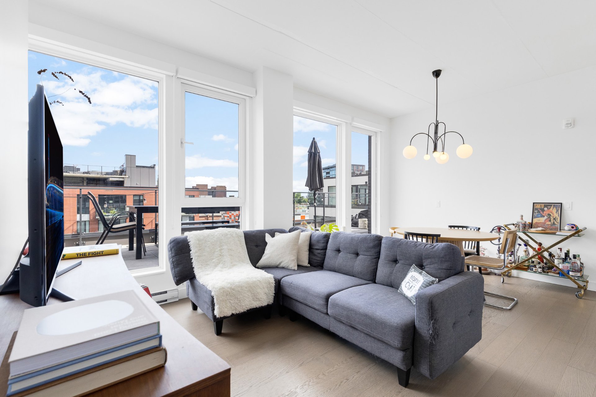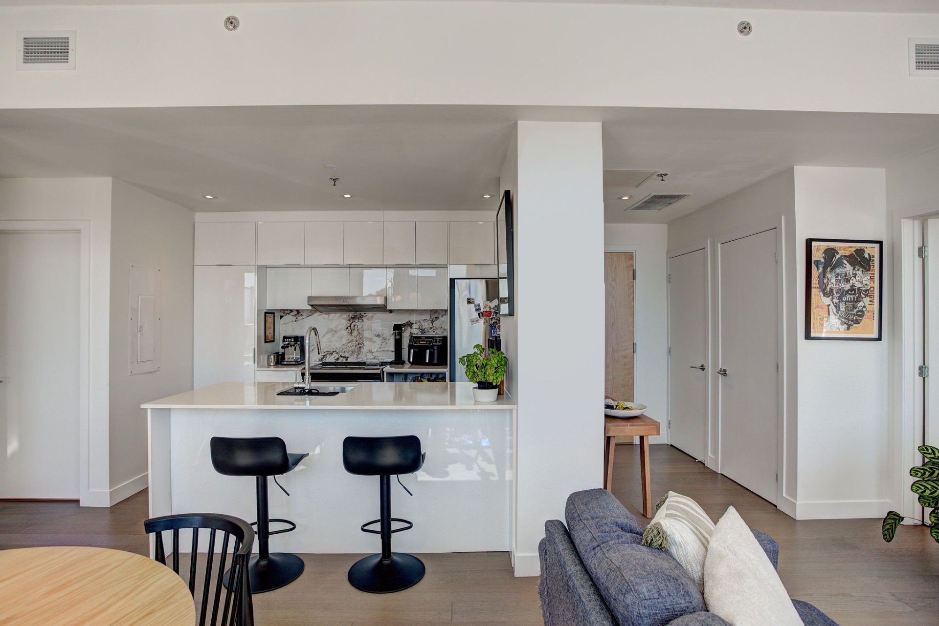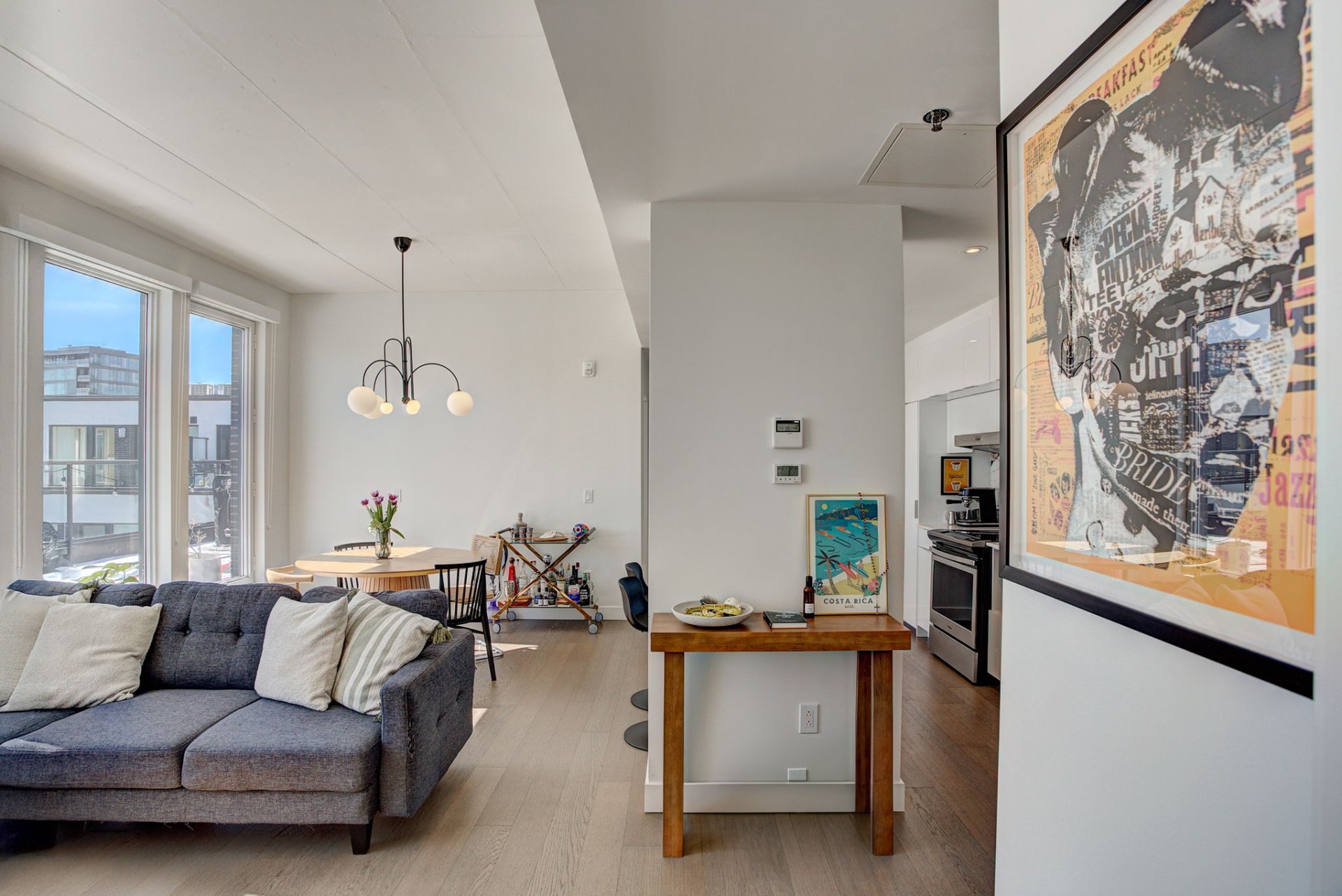 Ce penthouse offre des fenêtres pleine hauteur qui inondent l'espace de lumière naturelle et s'ouvrent sur une terrasse privée de 40 pieds, idéale pour les réceptions. L'aire de vie décloisonnée comprend un salon et une salle à manger spacieux avec plafonds élevés et planchers en bois. La cuisine moderne est équipée de comptoirs en quartz, d'un grand îlot central et d'électros haut de gamme. La chambre principale dispose d'un walk-in et d'une salle de bains attenante, complétée par une deuxième chambre et une salle de bains pour invités. Accès à une salle de sport, piscine extérieure et quartier animé.