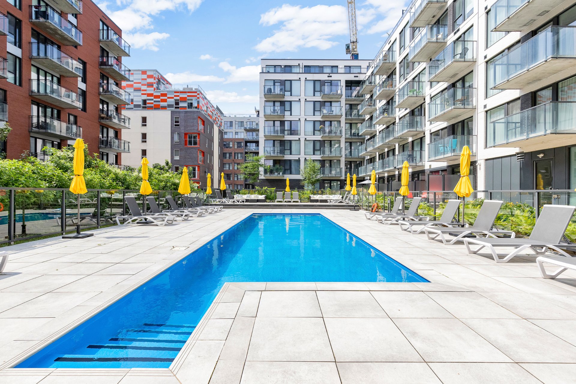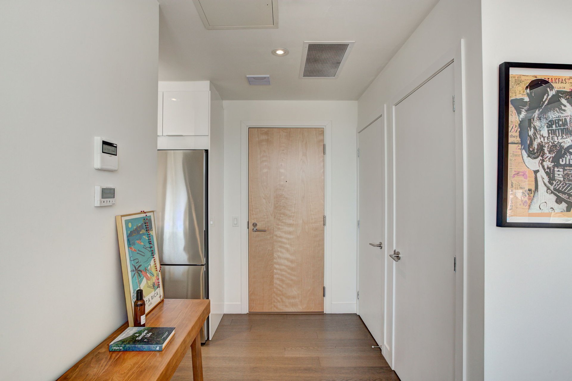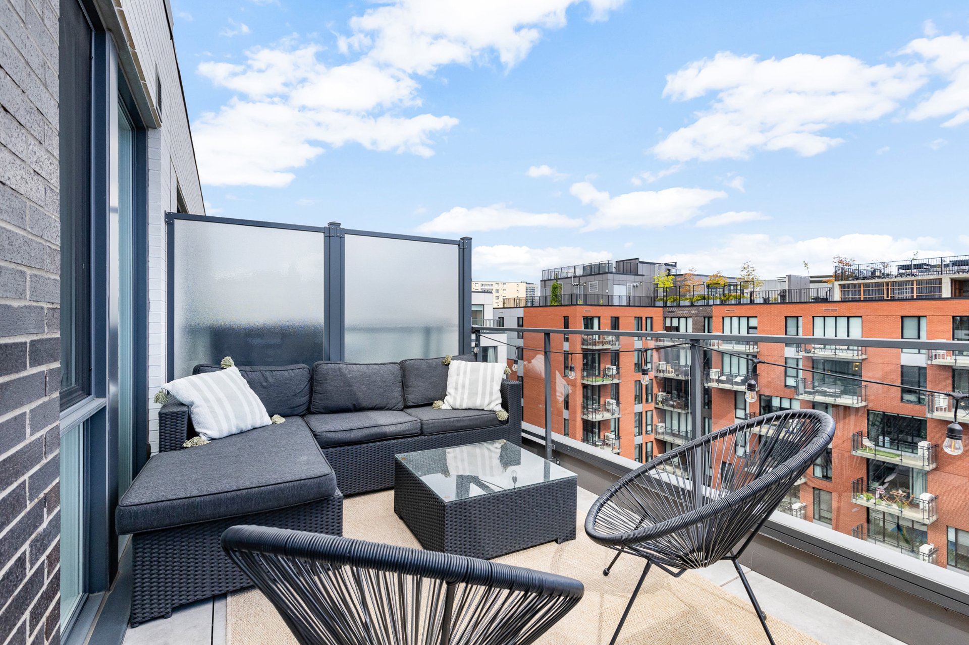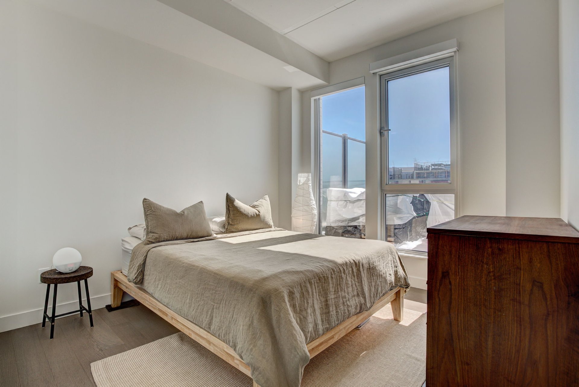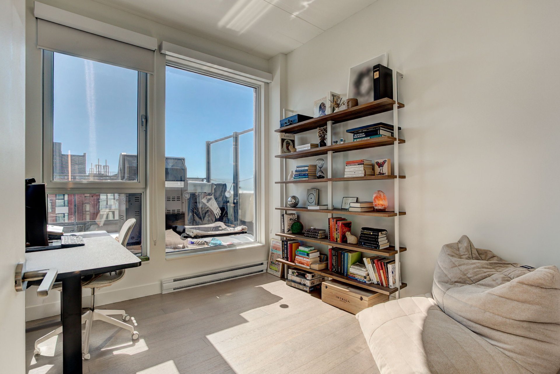 Ce penthouse offre des fenêtres pleine hauteur qui inondent l'espace de lumière naturelle et s'ouvrent sur une terrasse privée de 40 pieds, idéale pour les réceptions. L'aire de vie décloisonnée comprend un salon et une salle à manger spacieux avec plafonds élevés et planchers en bois. La cuisine moderne est équipée de comptoirs en quartz, d'un grand îlot central et d'électros haut de gamme. La chambre principale dispose d'un walk-in et d'une salle de bains attenante, complétée par une deuxième chambre et une salle de bains pour invités. Accès à une salle de sport, piscine extérieure et quartier animé.