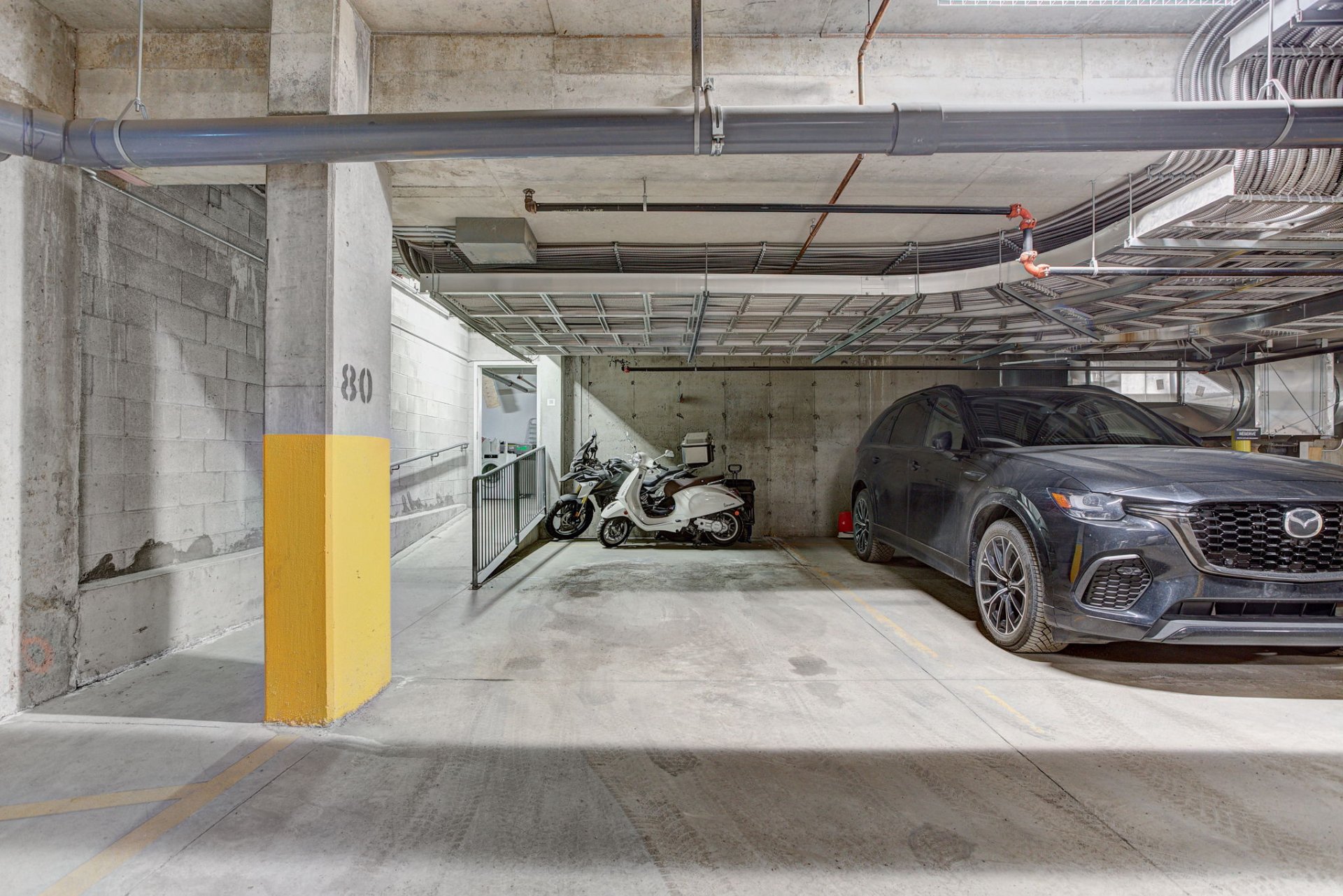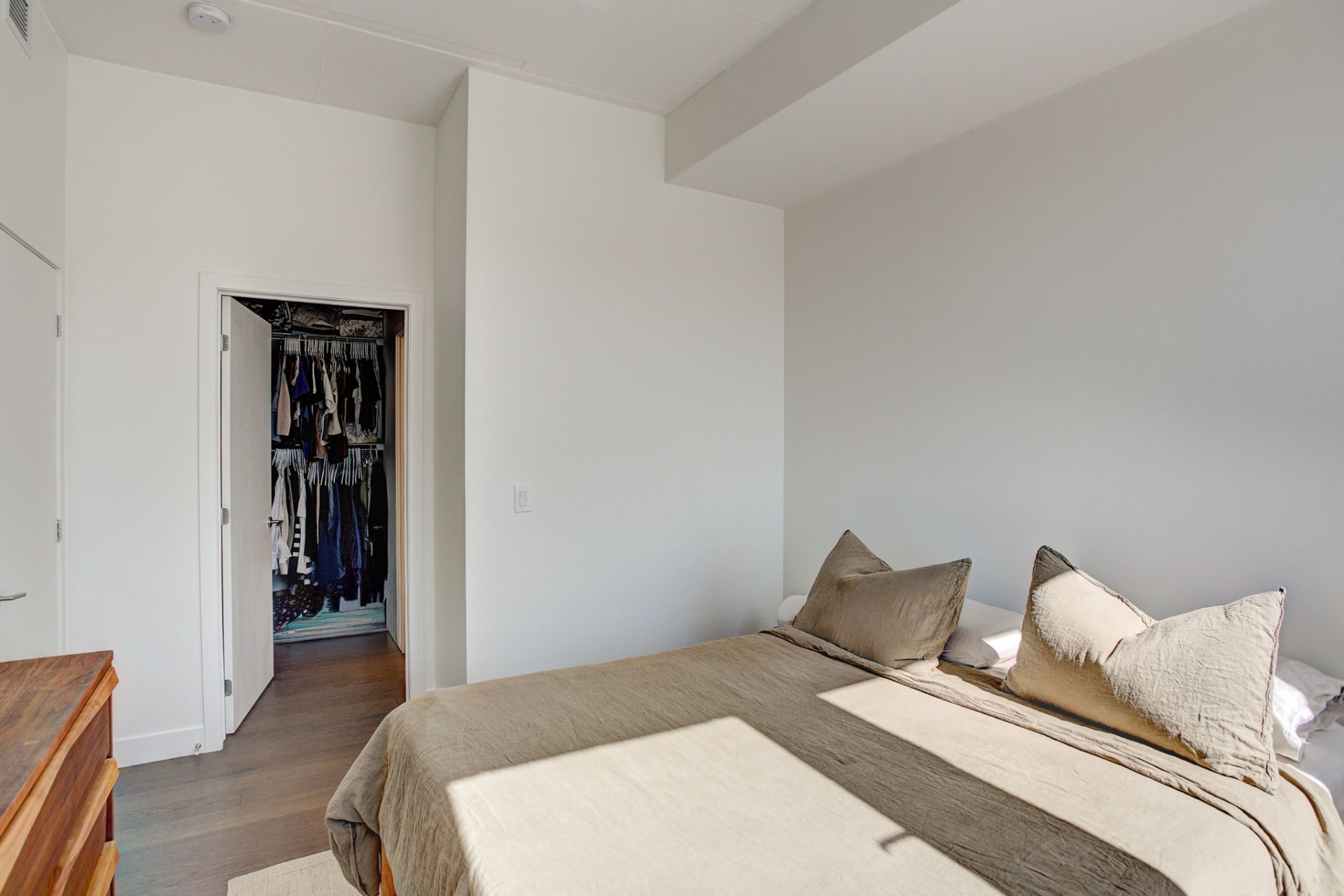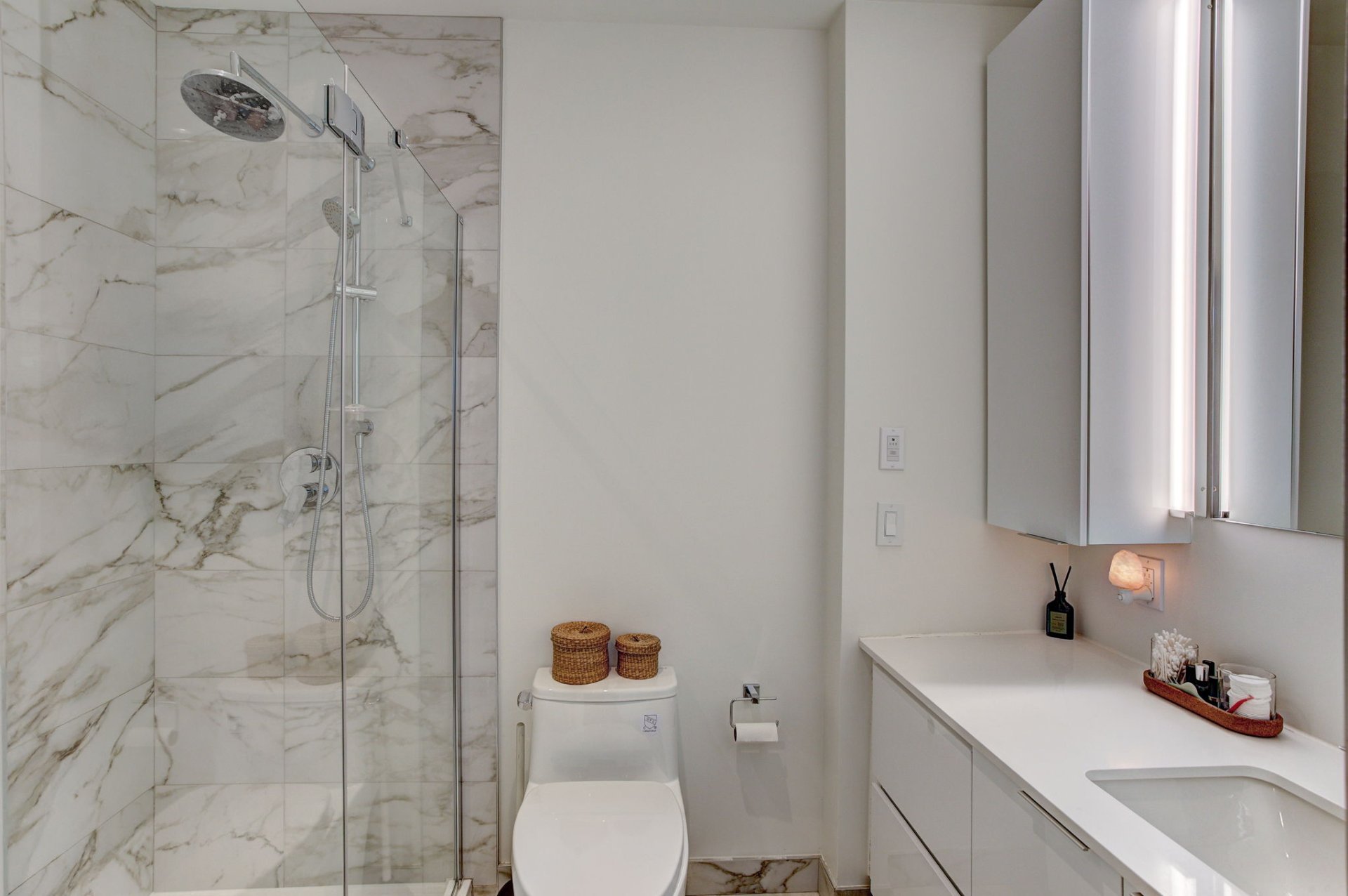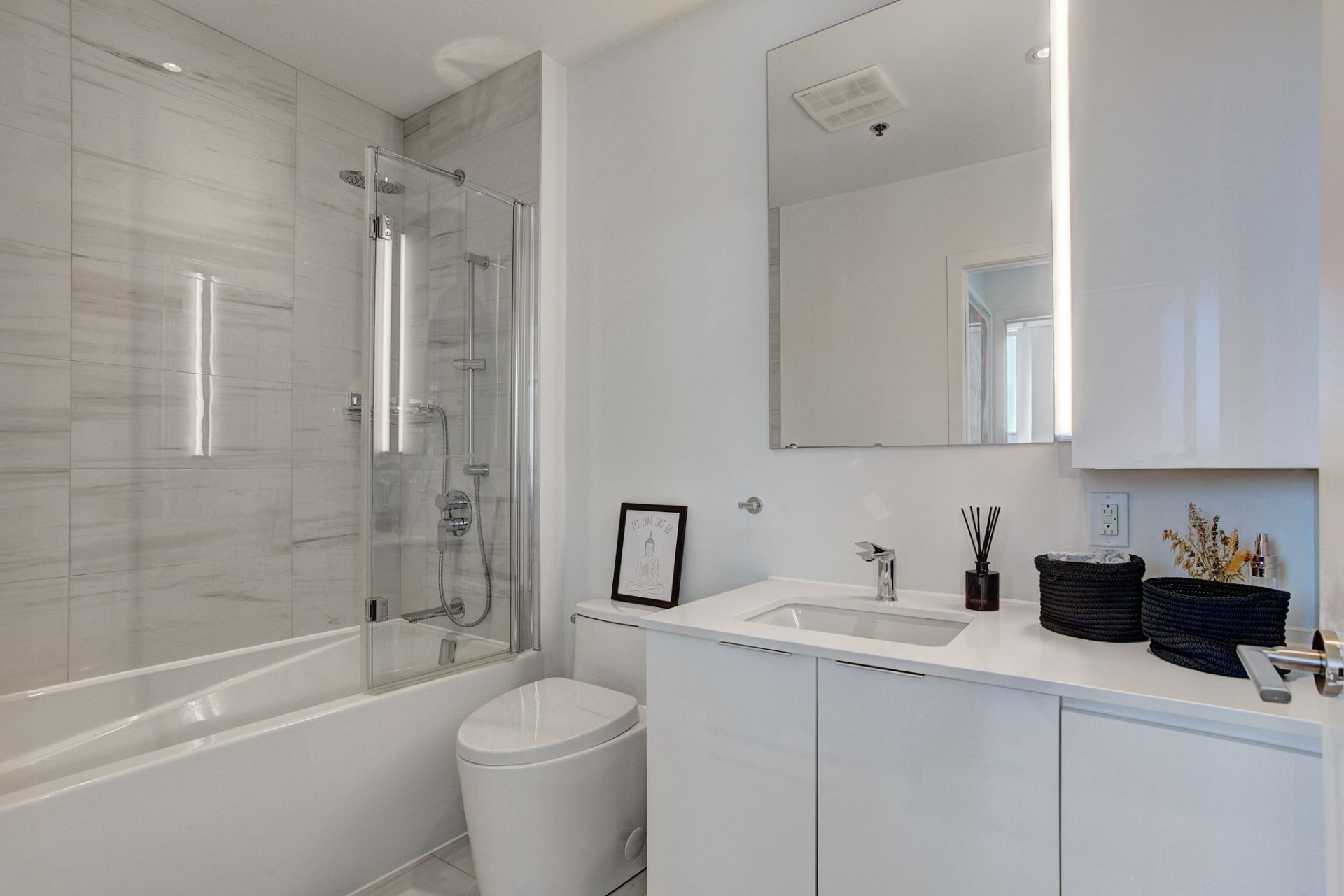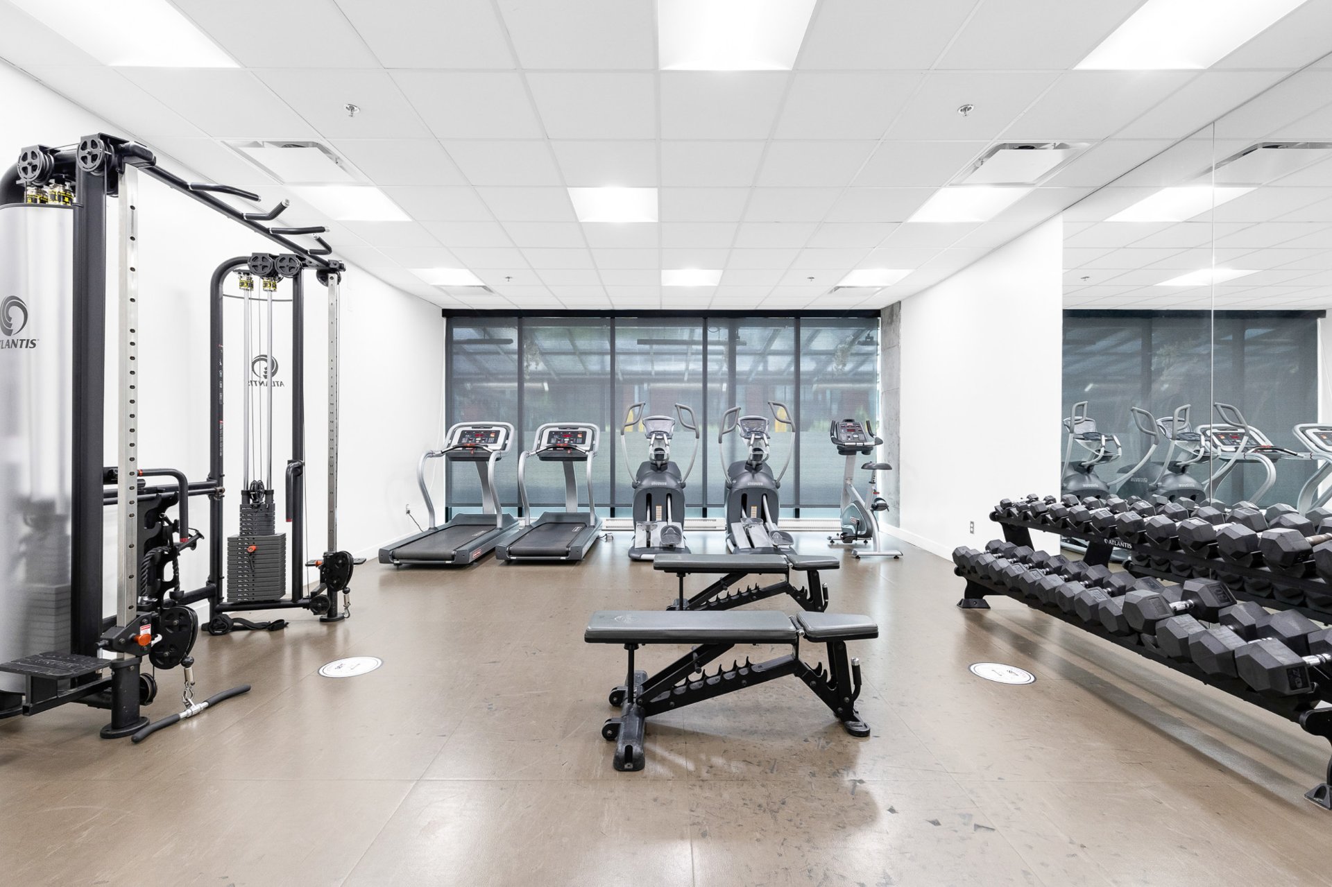 Ce penthouse offre des fenêtres pleine hauteur qui inondent l'espace de lumière naturelle et s'ouvrent sur une terrasse privée de 40 pieds, idéale pour les réceptions. L'aire de vie décloisonnée comprend un salon et une salle à manger spacieux avec plafonds élevés et planchers en bois. La cuisine moderne est équipée de comptoirs en quartz, d'un grand îlot central et d'électros haut de gamme. La chambre principale dispose d'un walk-in et d'une salle de bains attenante, complétée par une deuxième chambre et une salle de bains pour invités. Accès à une salle de sport, piscine extérieure et quartier animé.