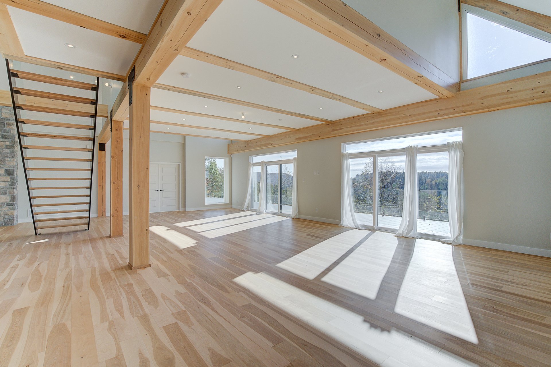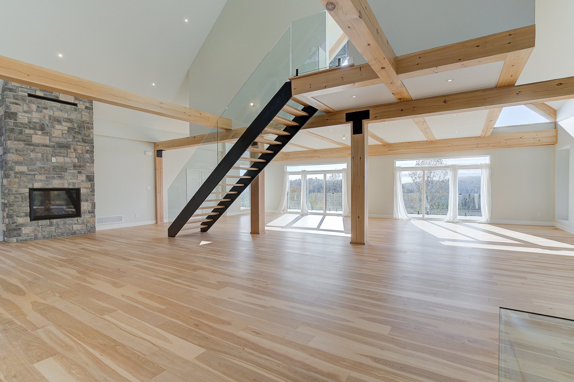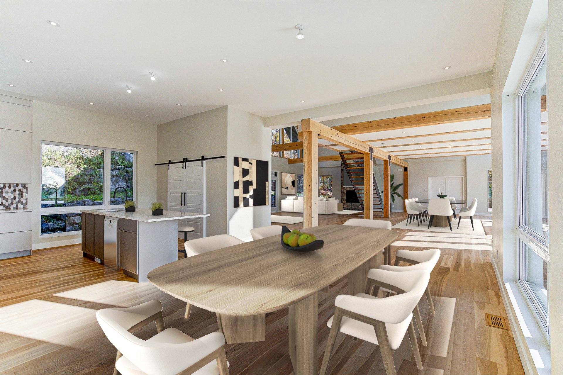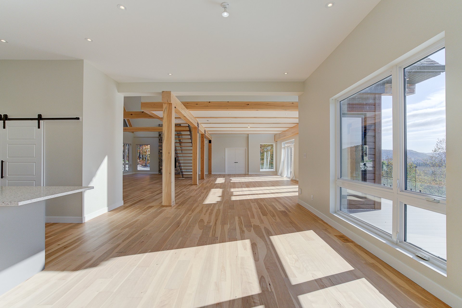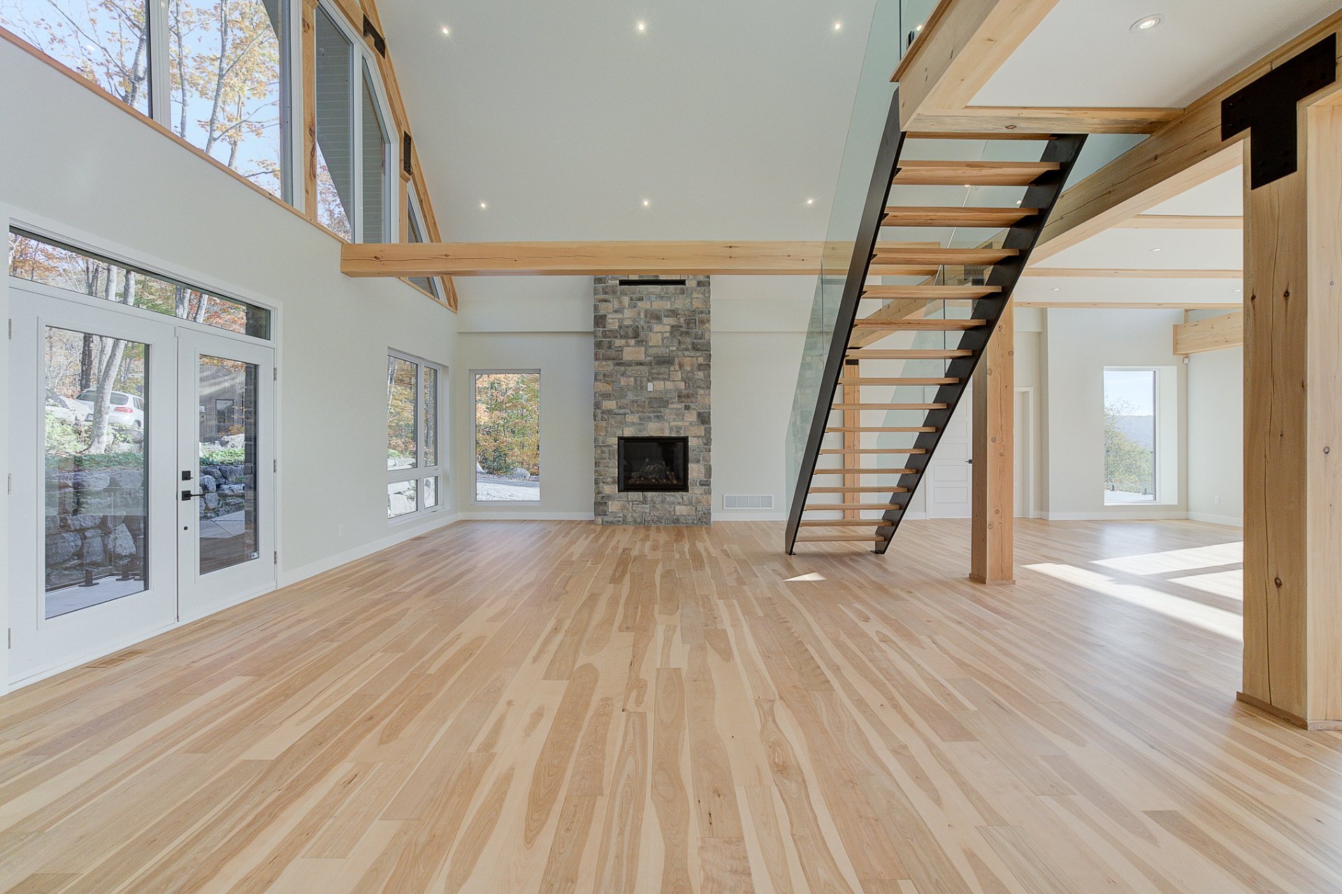 L'entrée s'ouvre sur un vaste espace de vie à aire ouverte, caractérisé par des volumes impressionnants et une luminosité exceptionnelle. Le salon dispose d'un foyer au bois et de plafonds culminant à 27 pieds. La salle à manger, quant à elle, est dotée de deux grandes portes patio qui mènent directement à la terrasse arrière, offrant une vue environnante à couper le souffle. La cuisine comprend un îlot en quartz avec des places assises, ainsi qu'un grand garde-manger de type walk-in. Ce niveau se complète par un bureau/chambre et une salle d'eau.