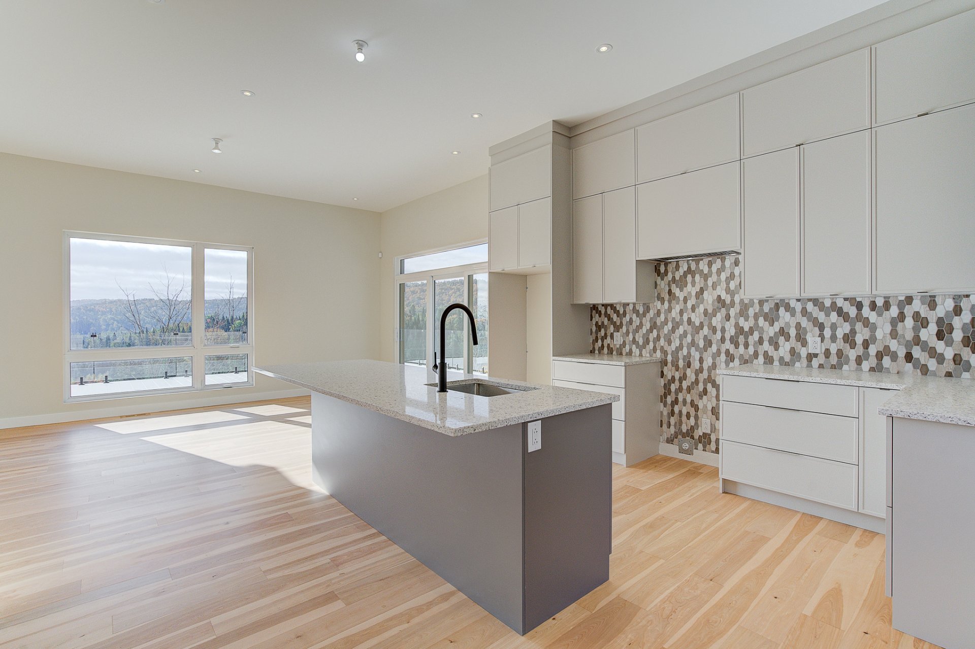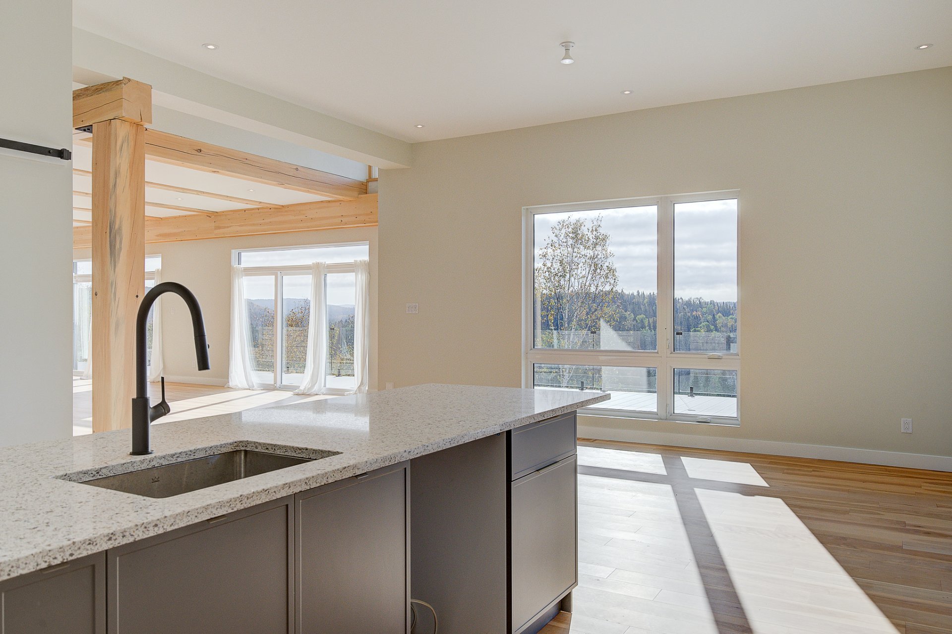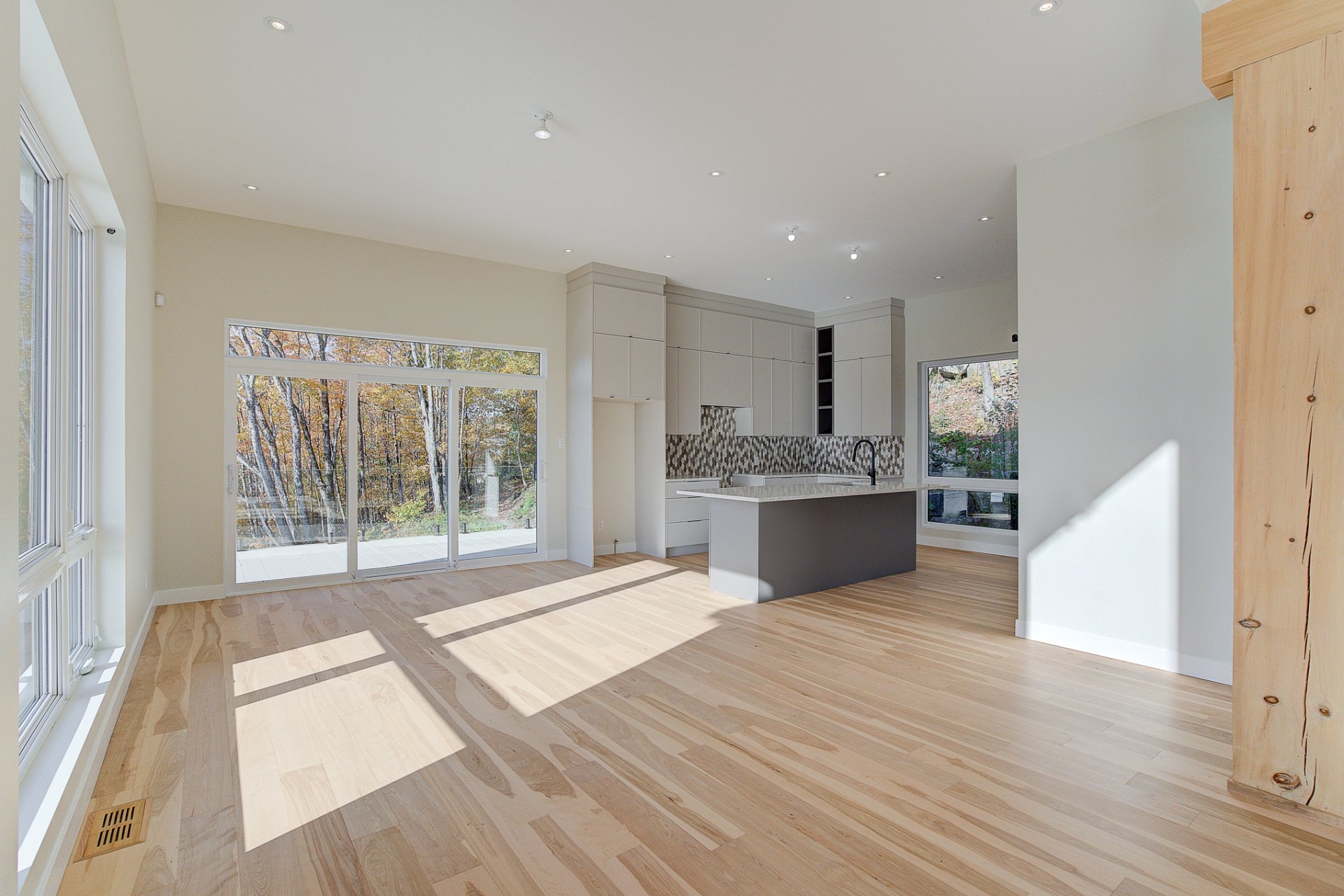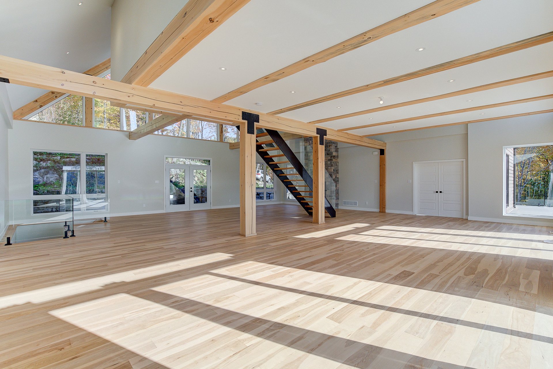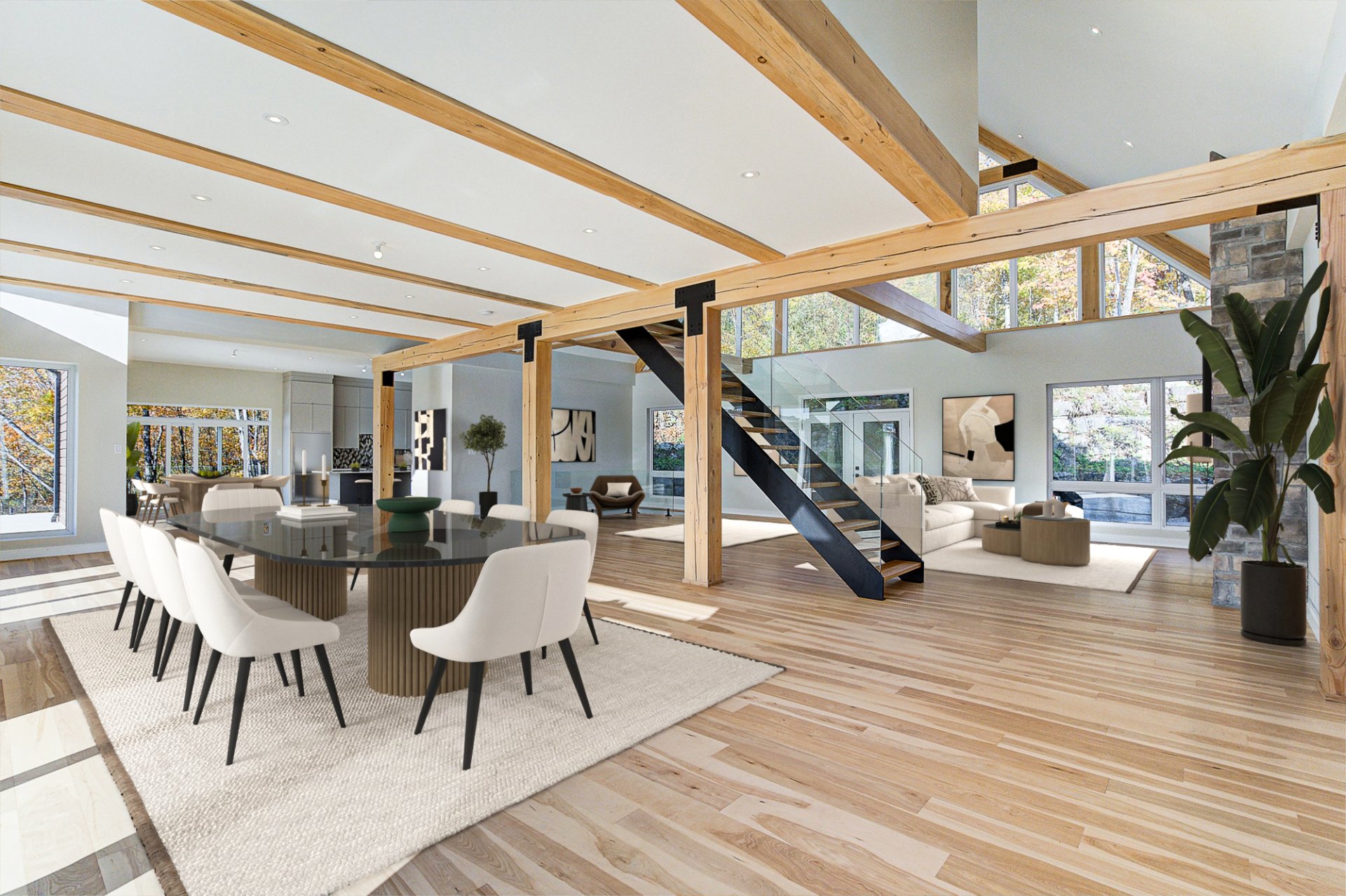 L'entrée s'ouvre sur un vaste espace de vie à aire ouverte, caractérisé par des volumes impressionnants et une luminosité exceptionnelle. Le salon dispose d'un foyer au bois et de plafonds culminant à 27 pieds. La salle à manger, quant à elle, est dotée de deux grandes portes patio qui mènent directement à la terrasse arrière, offrant une vue environnante à couper le souffle. La cuisine comprend un îlot en quartz avec des places assises, ainsi qu'un grand garde-manger de type walk-in. Ce niveau se complète par un bureau/chambre et une salle d'eau.