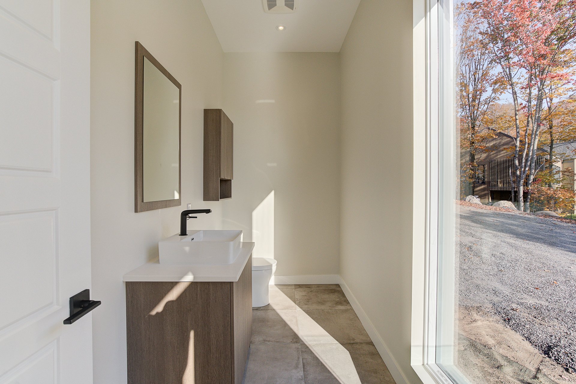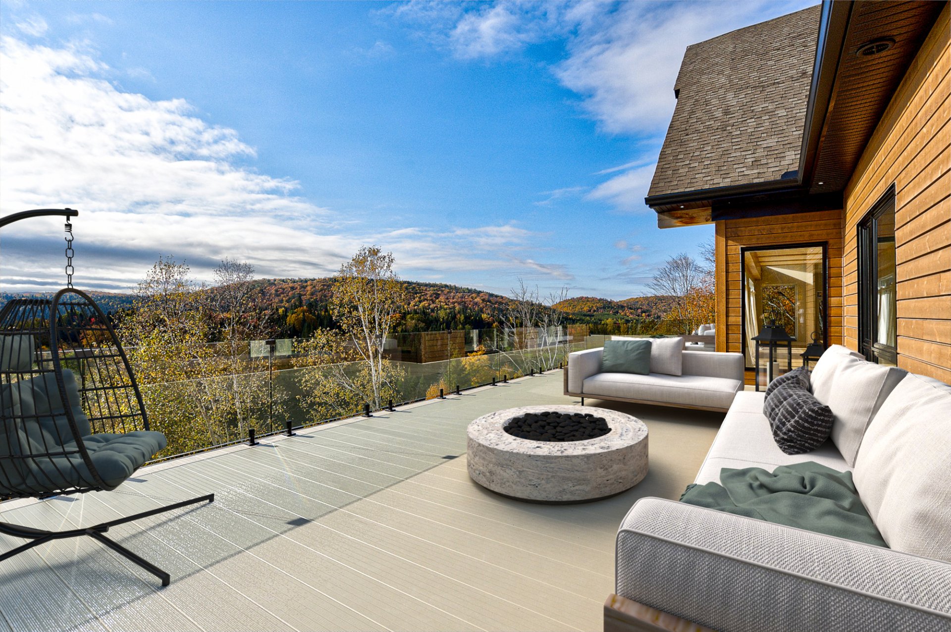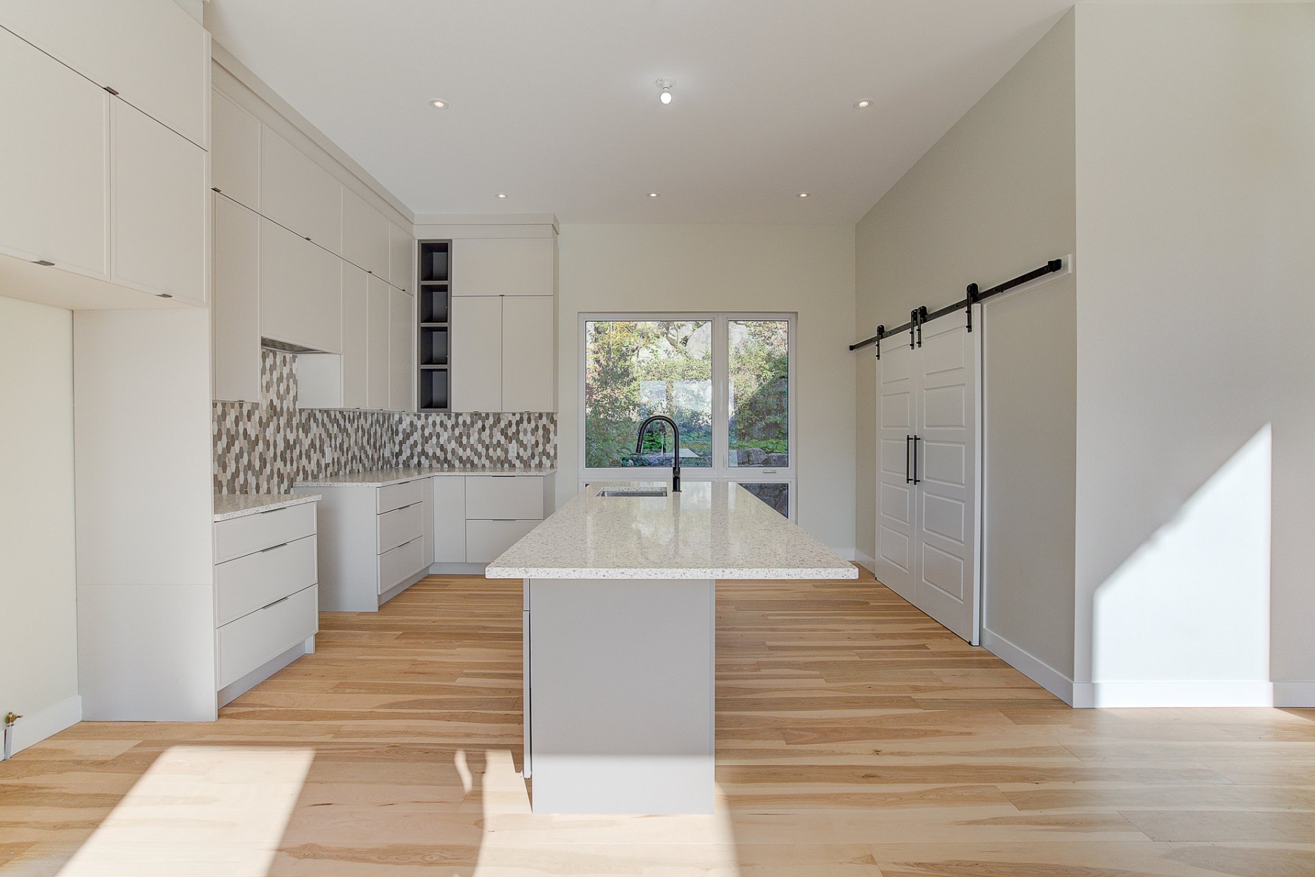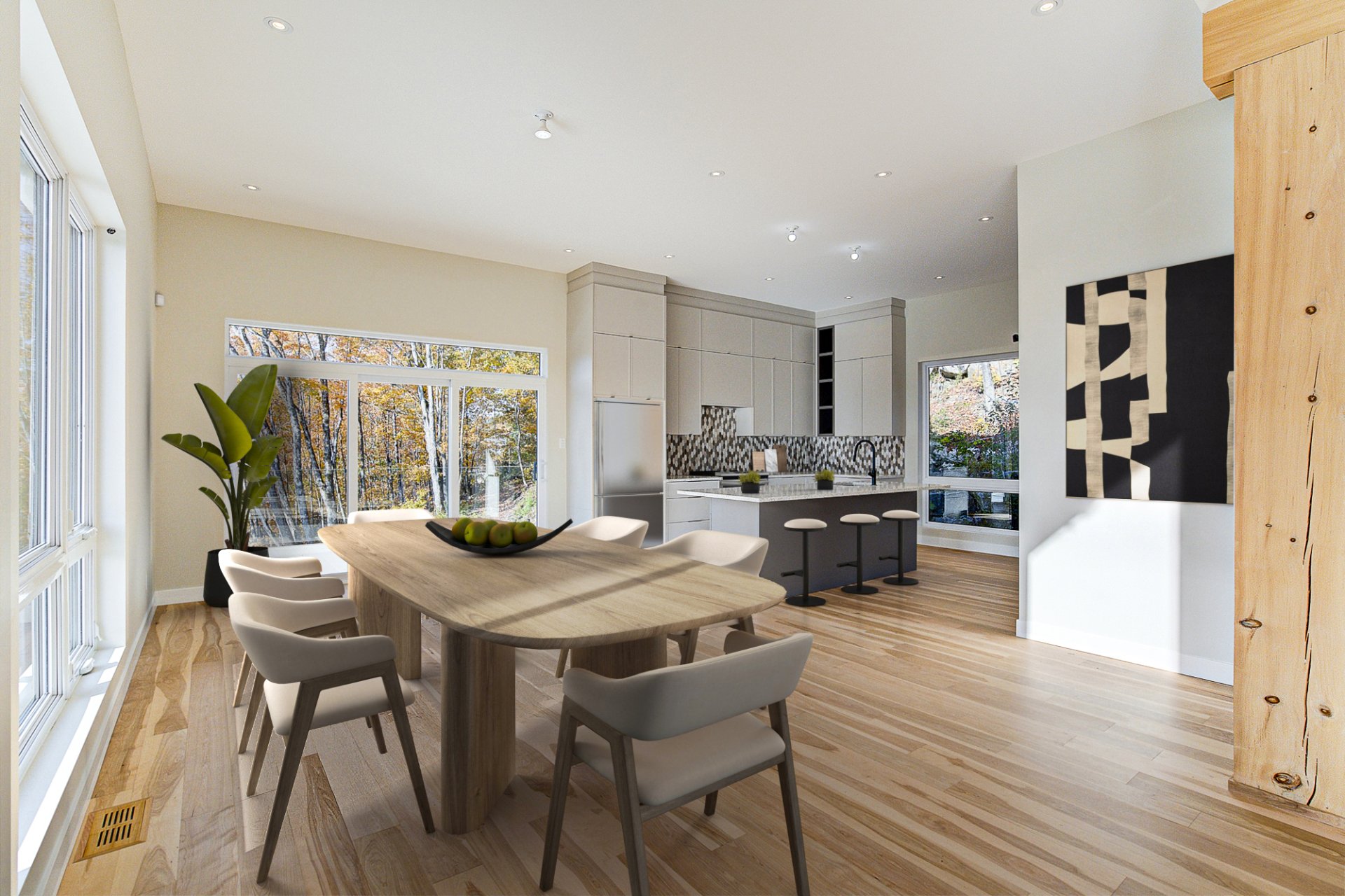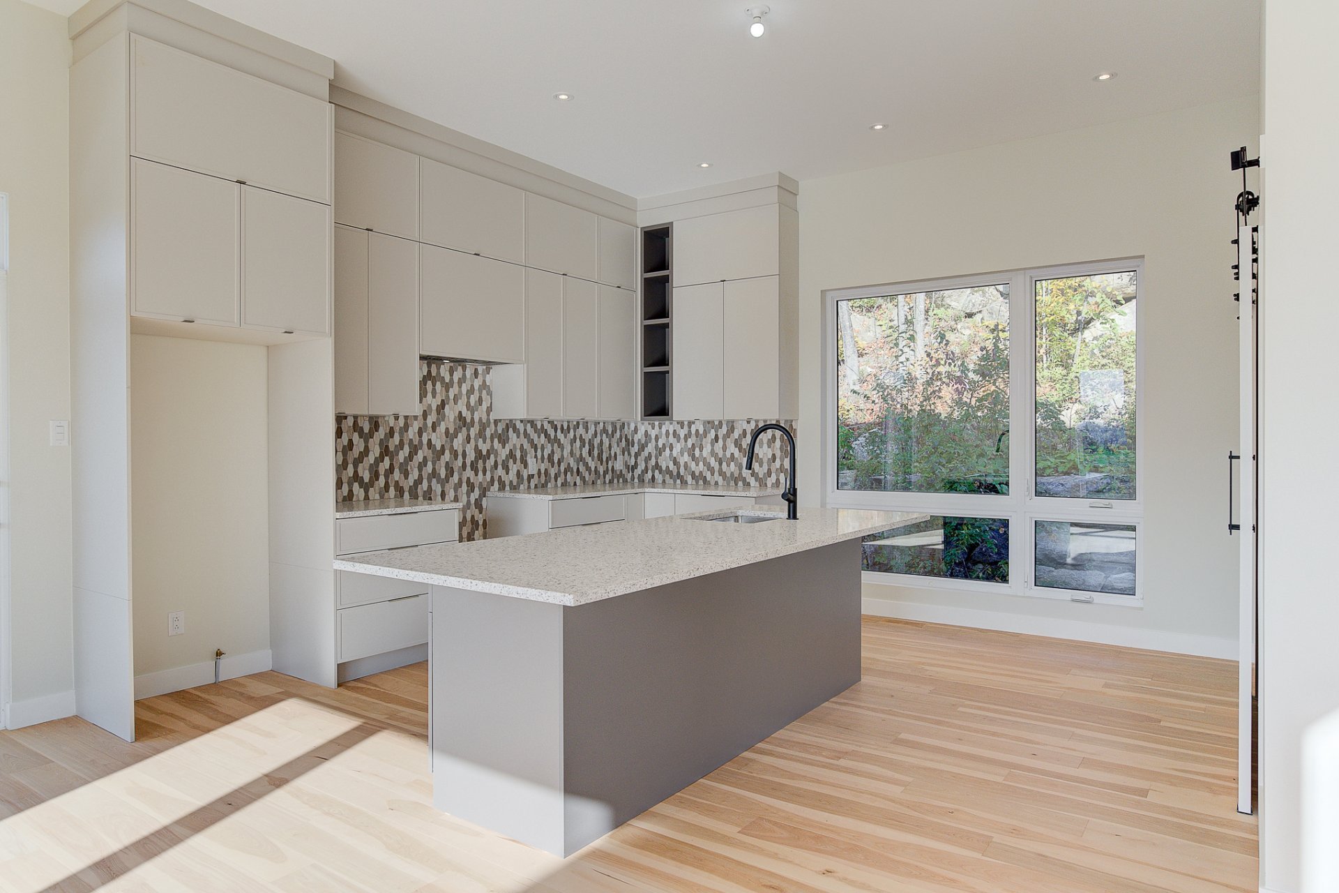 L'entrée s'ouvre sur un vaste espace de vie à aire ouverte, caractérisé par des volumes impressionnants et une luminosité exceptionnelle. Le salon dispose d'un foyer au bois et de plafonds culminant à 27 pieds. La salle à manger, quant à elle, est dotée de deux grandes portes patio qui mènent directement à la terrasse arrière, offrant une vue environnante à couper le souffle. La cuisine comprend un îlot en quartz avec des places assises, ainsi qu'un grand garde-manger de type walk-in. Ce niveau se complète par un bureau/chambre et une salle d'eau.