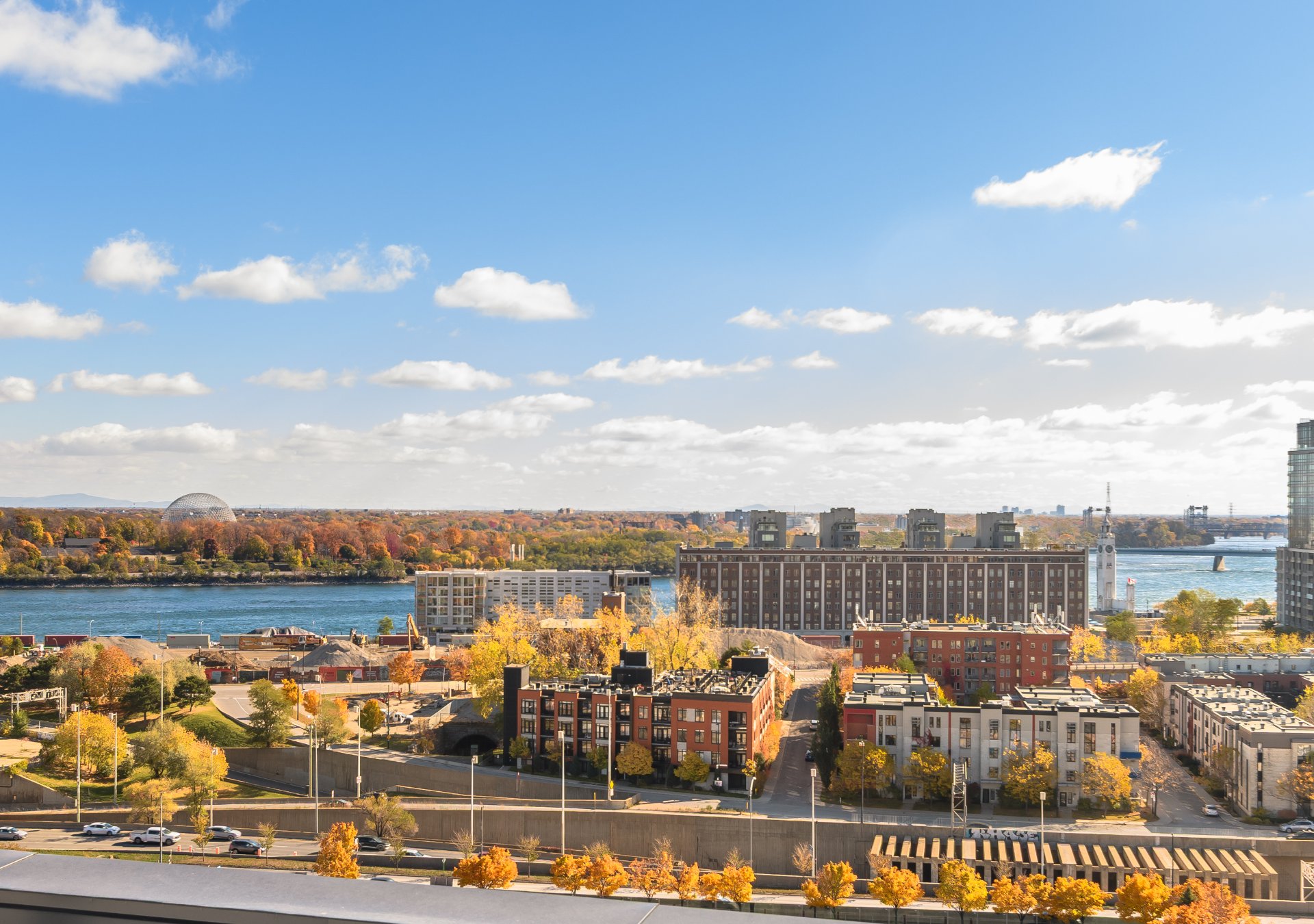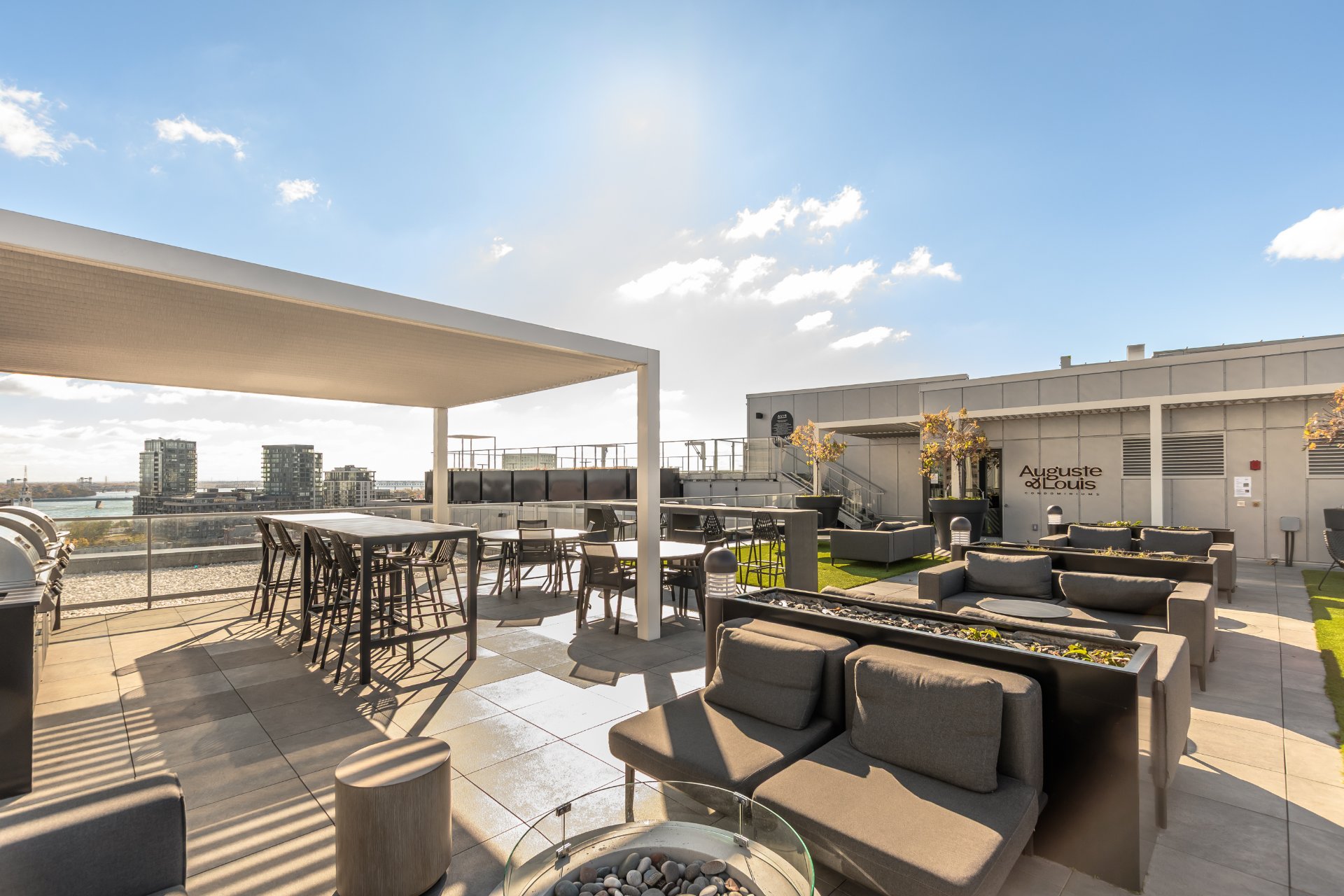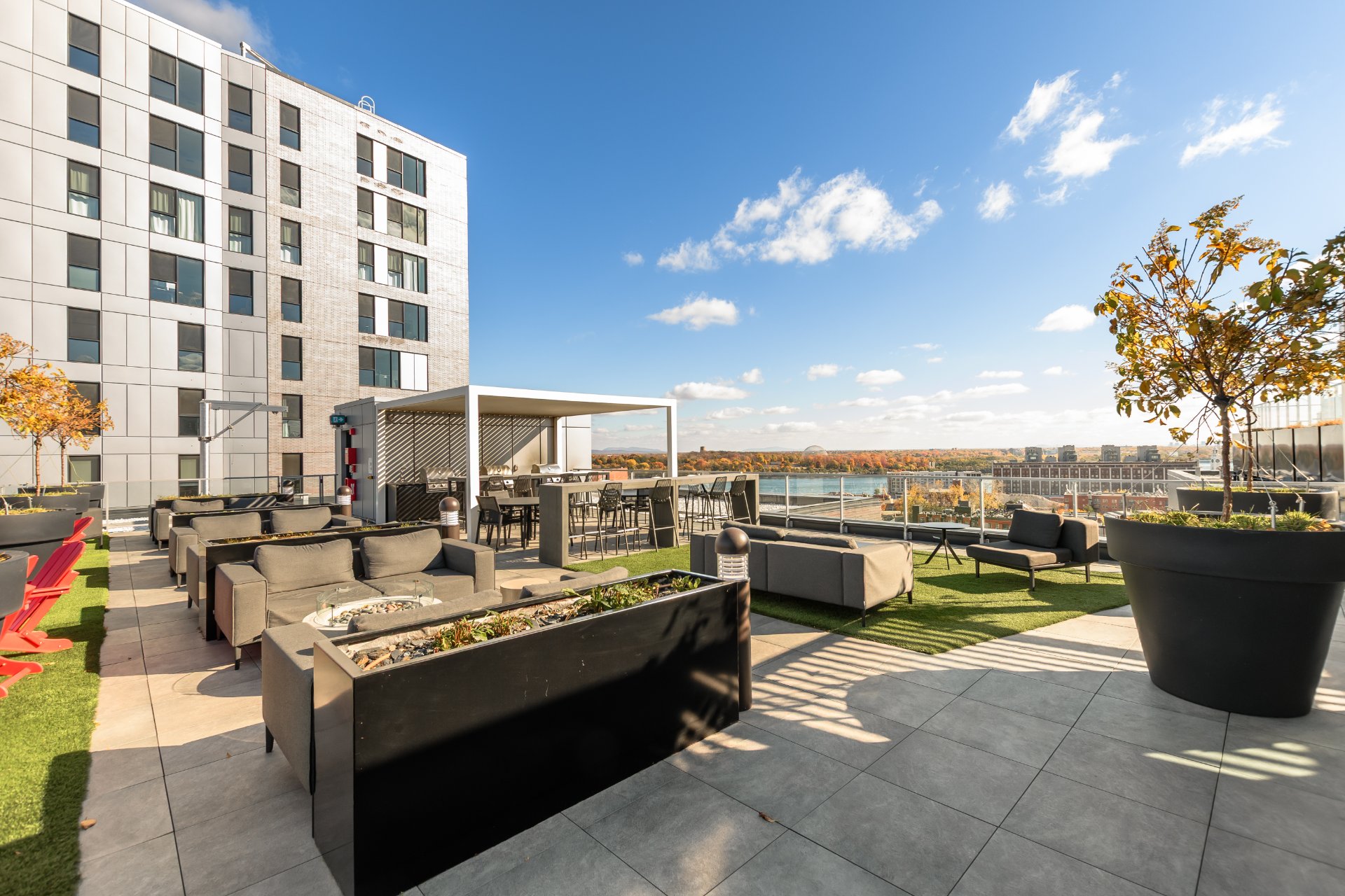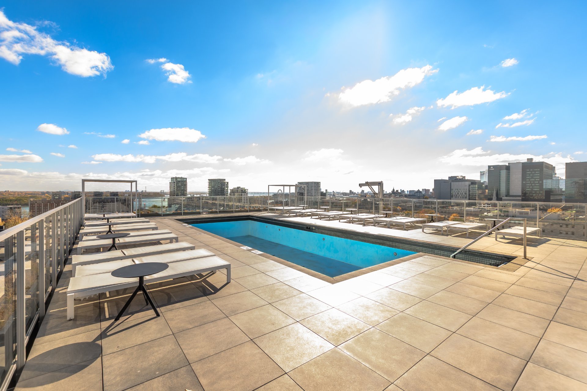 * L'immeuble offre une magnifique terrasse sur le toit au 15ieme étage avec piscine chauffée, un chalet urbain, un espace barbecue et une vue imprenable sur le Vieux-Montréal et le fleuve Saint-Laurent.