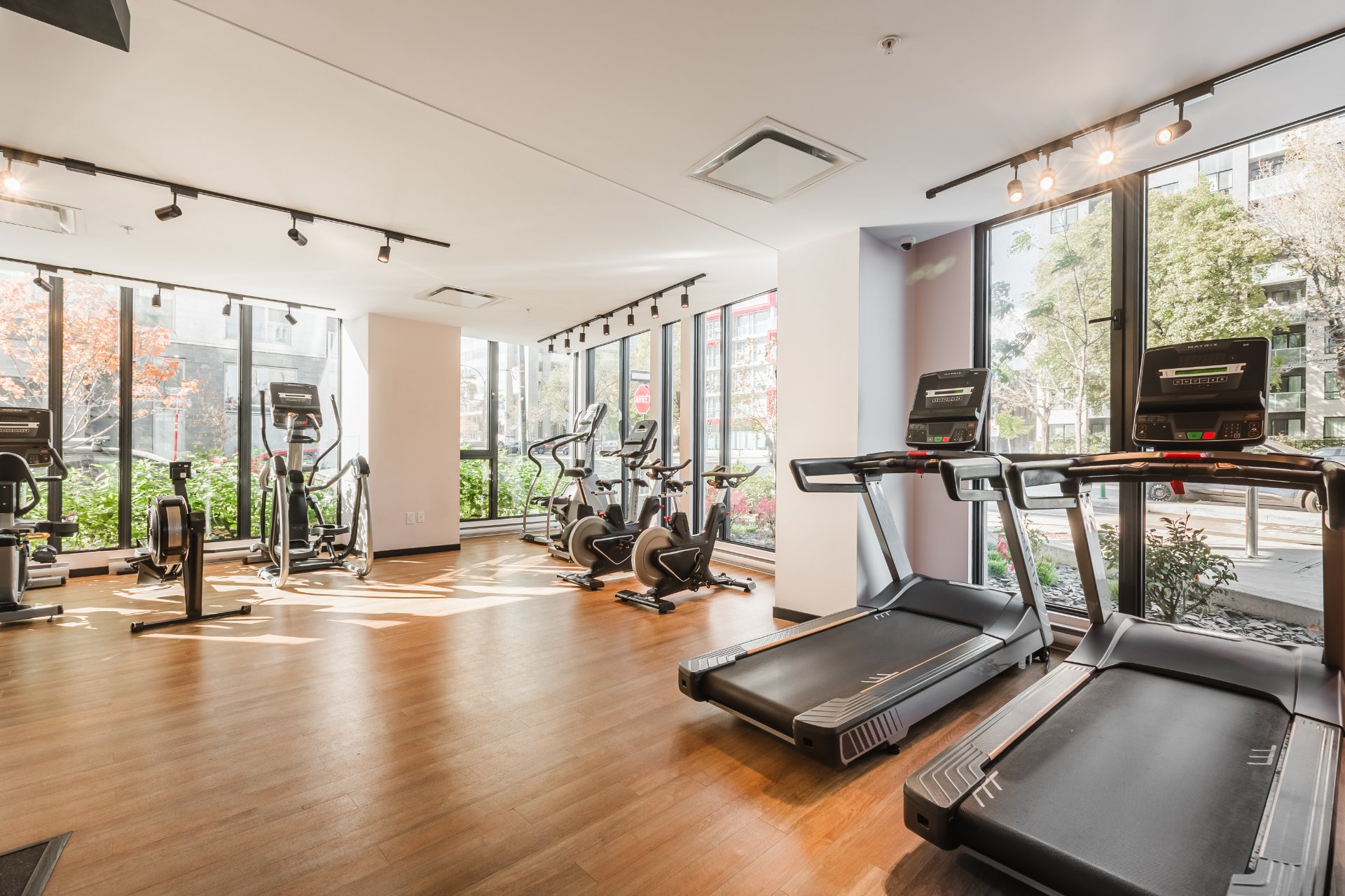 * Salle d'entraînement ultramoderne et entièrement équipée au rez-de-chaussée, entourée de fenêtres pleine hauteur.
