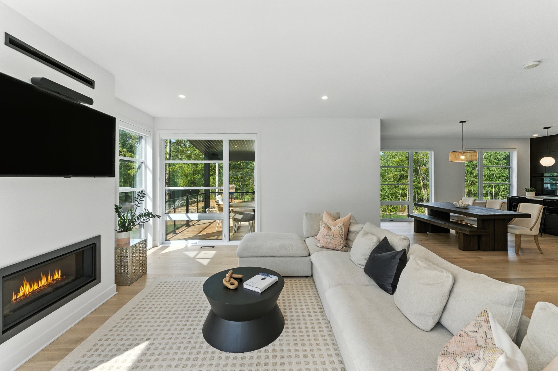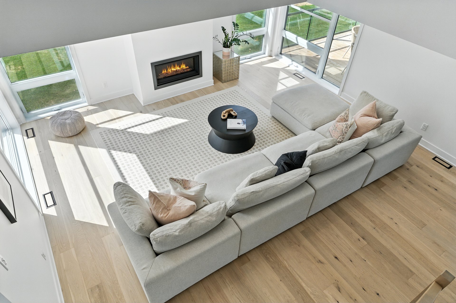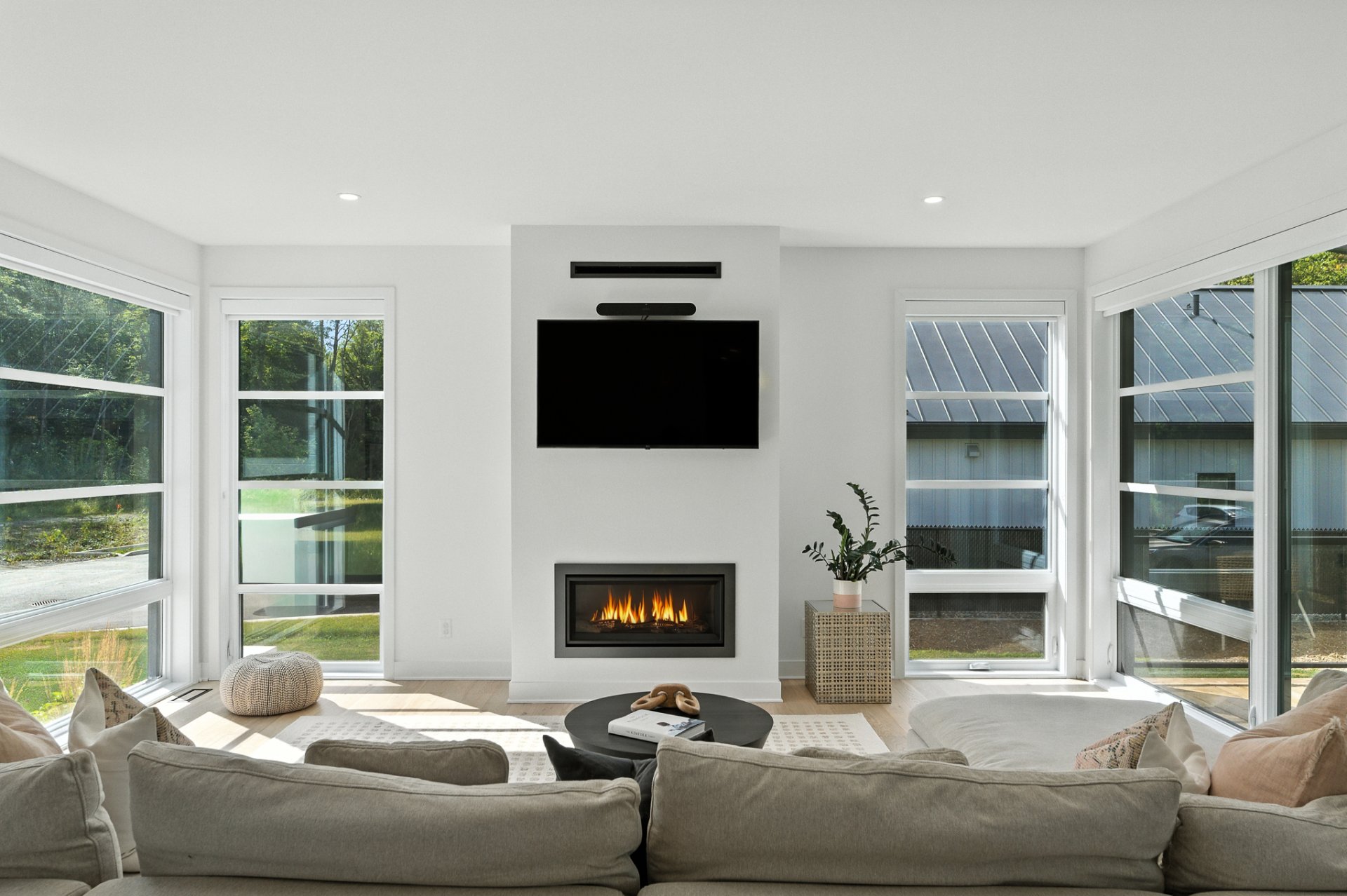 Le foyer au gaz s'impose comme une présence chaleureuse au coeur de la maison, tandis que les planchers de chêne pâle renforcent cette sensation de légèreté.