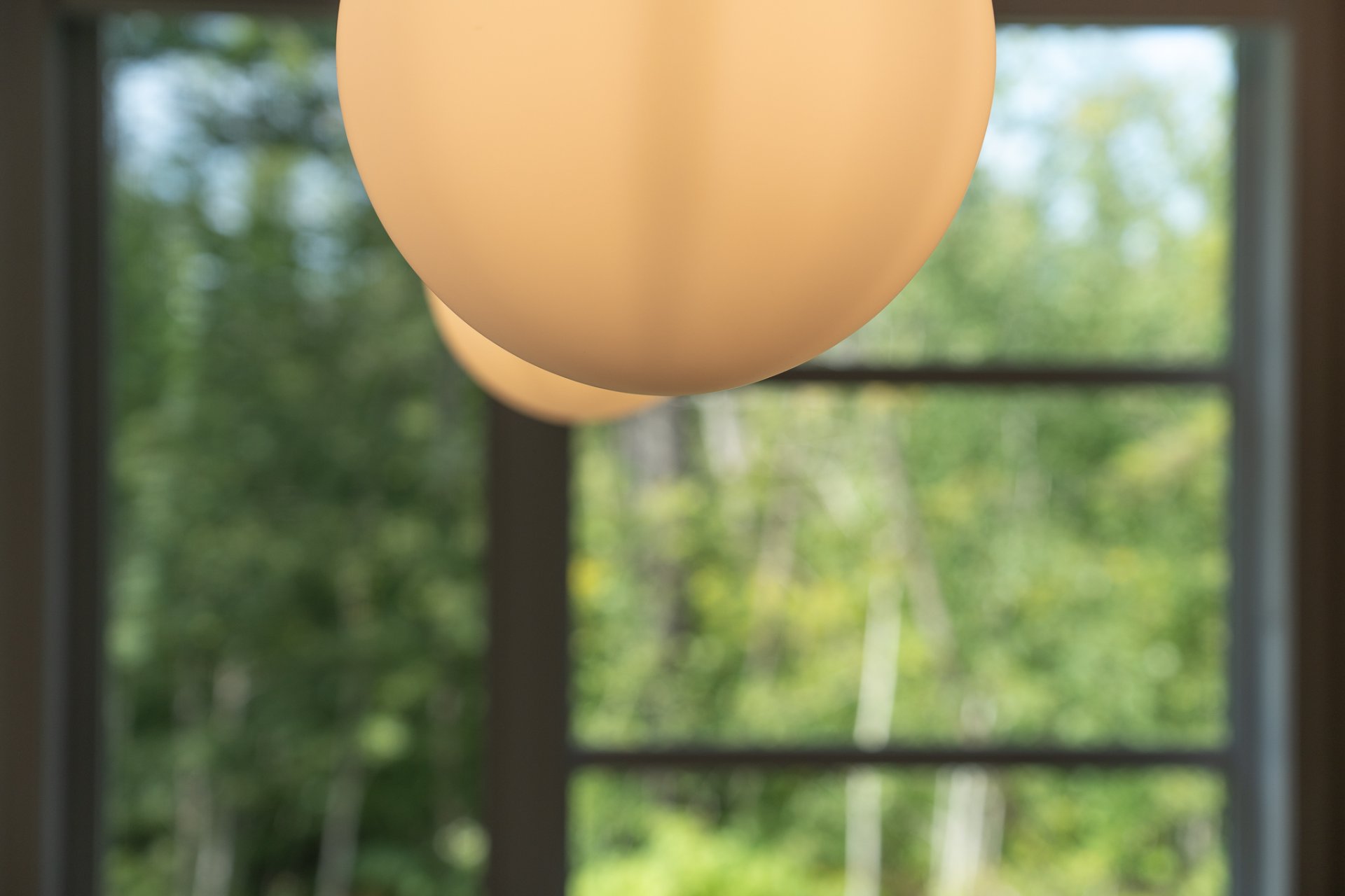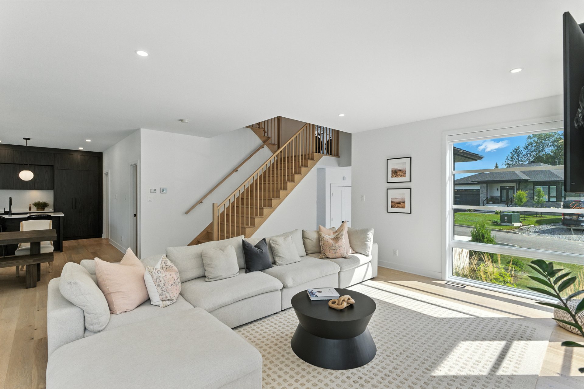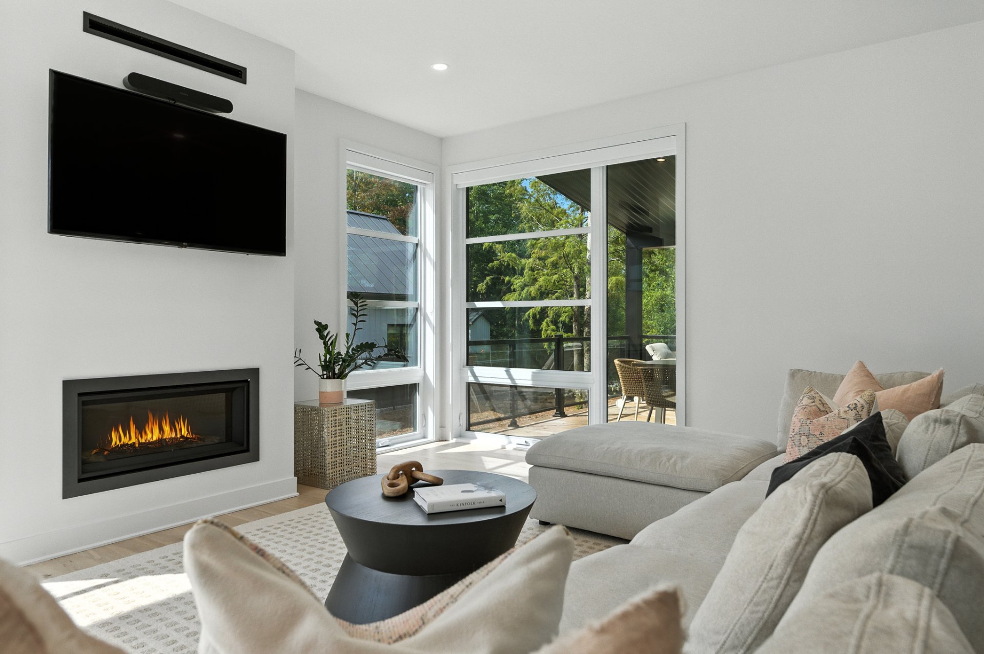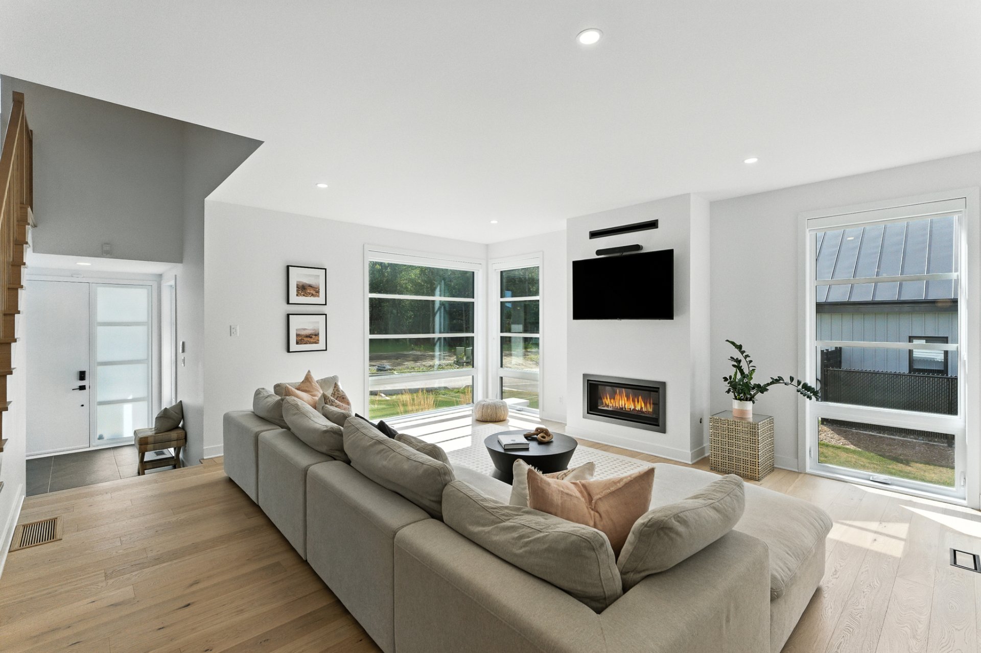 Le foyer au gaz s'impose comme une présence chaleureuse au coeur de la maison, tandis que les planchers de chêne pâle renforcent cette sensation de légèreté.