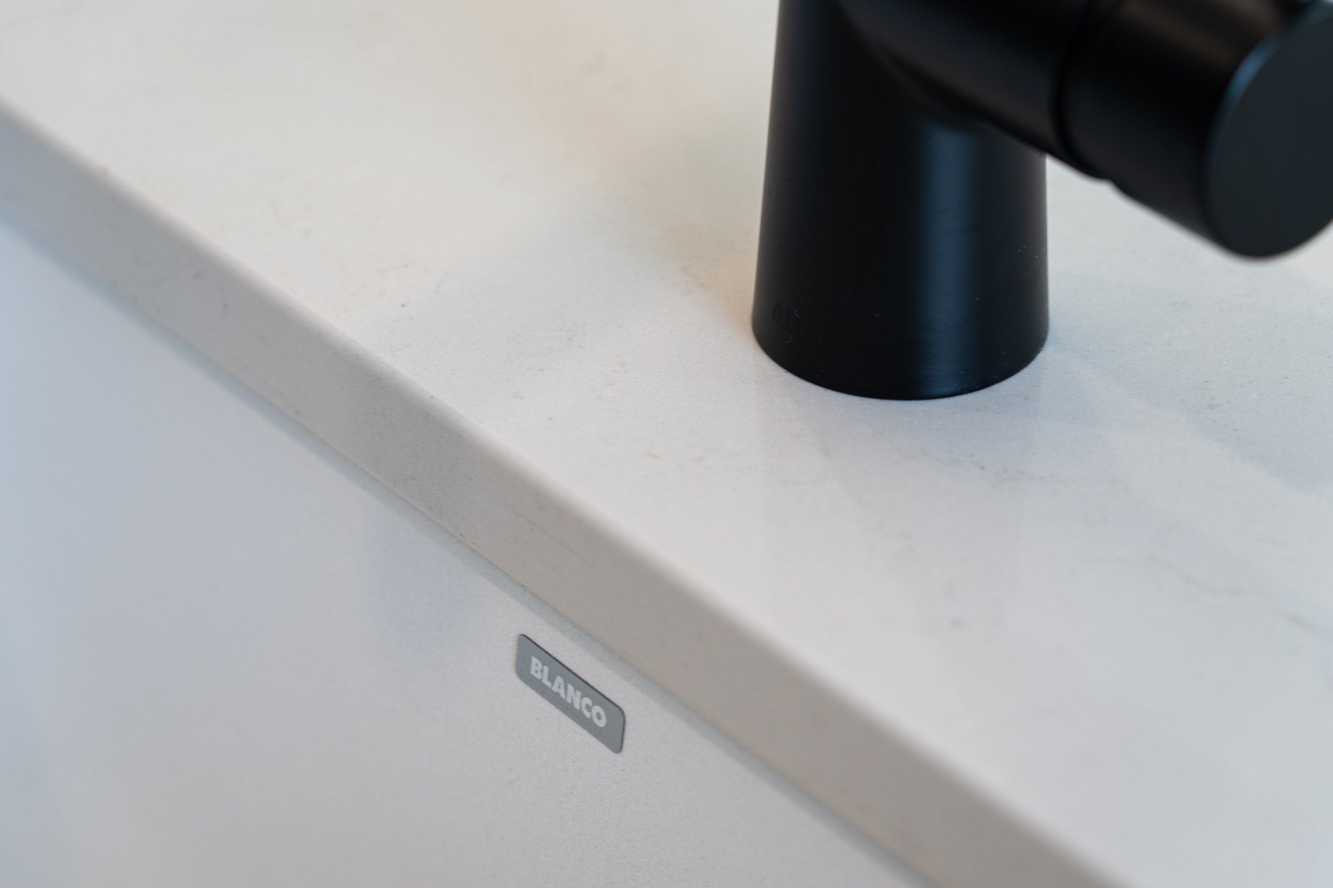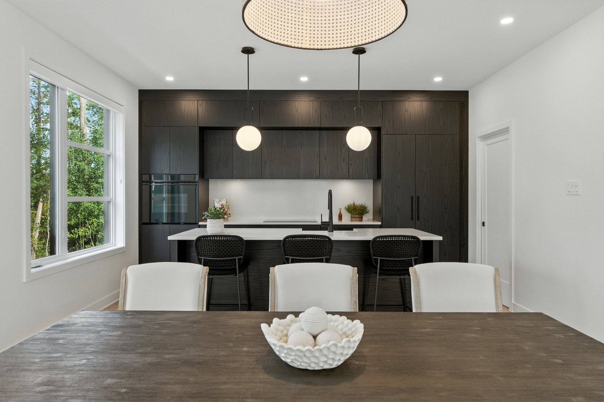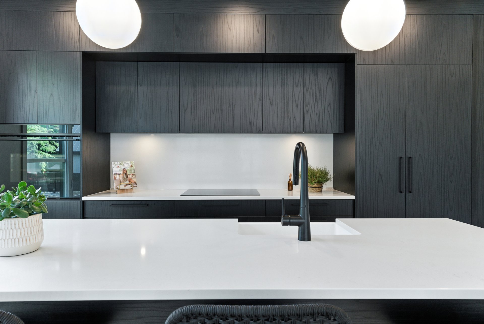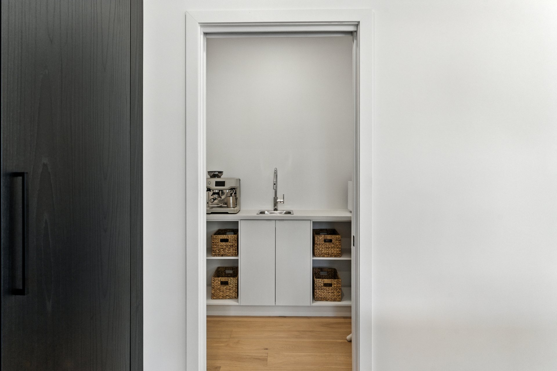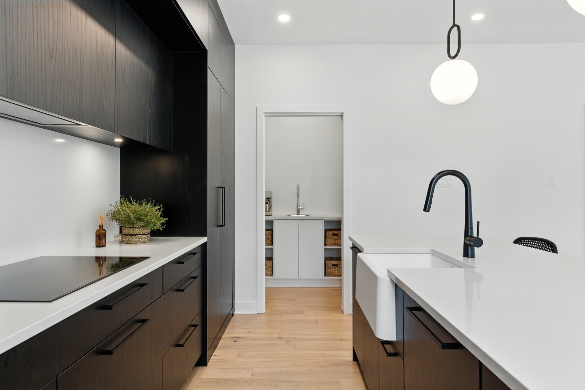 La cuisine combine esthétique et fonctionnalité avec ses électroménagers intégrés disparaissant dans un décor soigné. Le garde-manger attenant devient un allié pratique au quotidien.