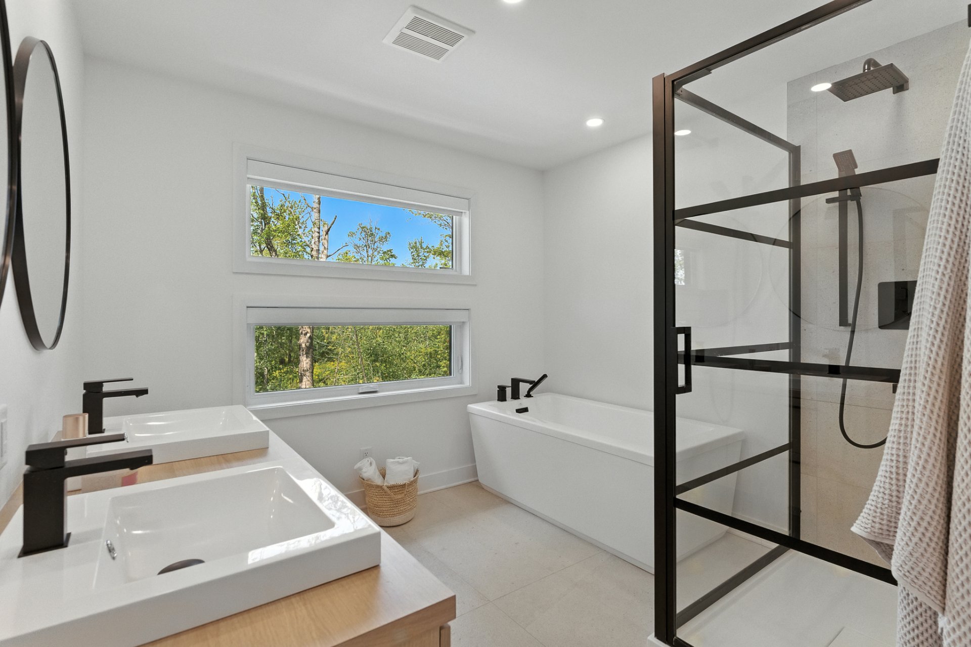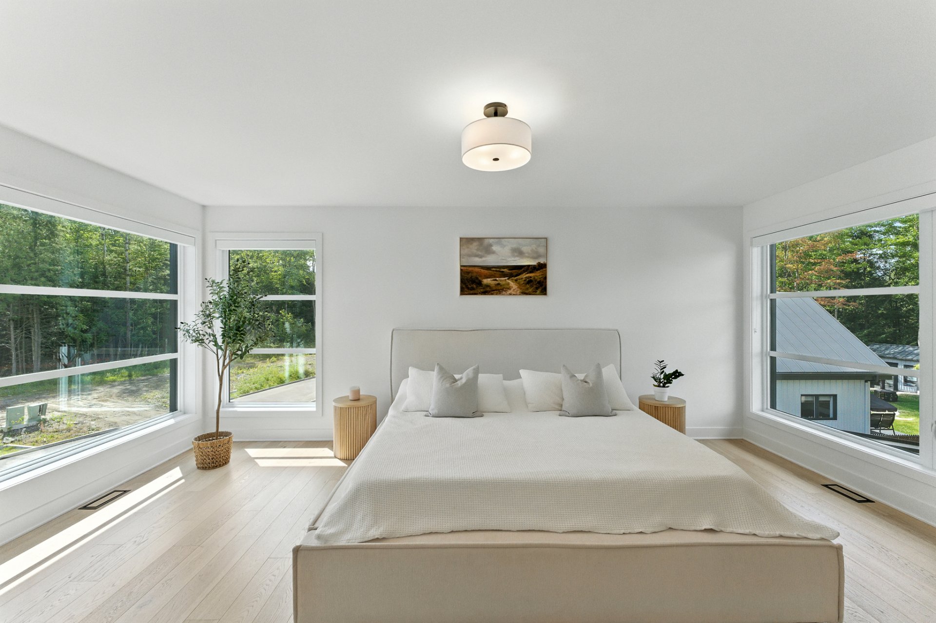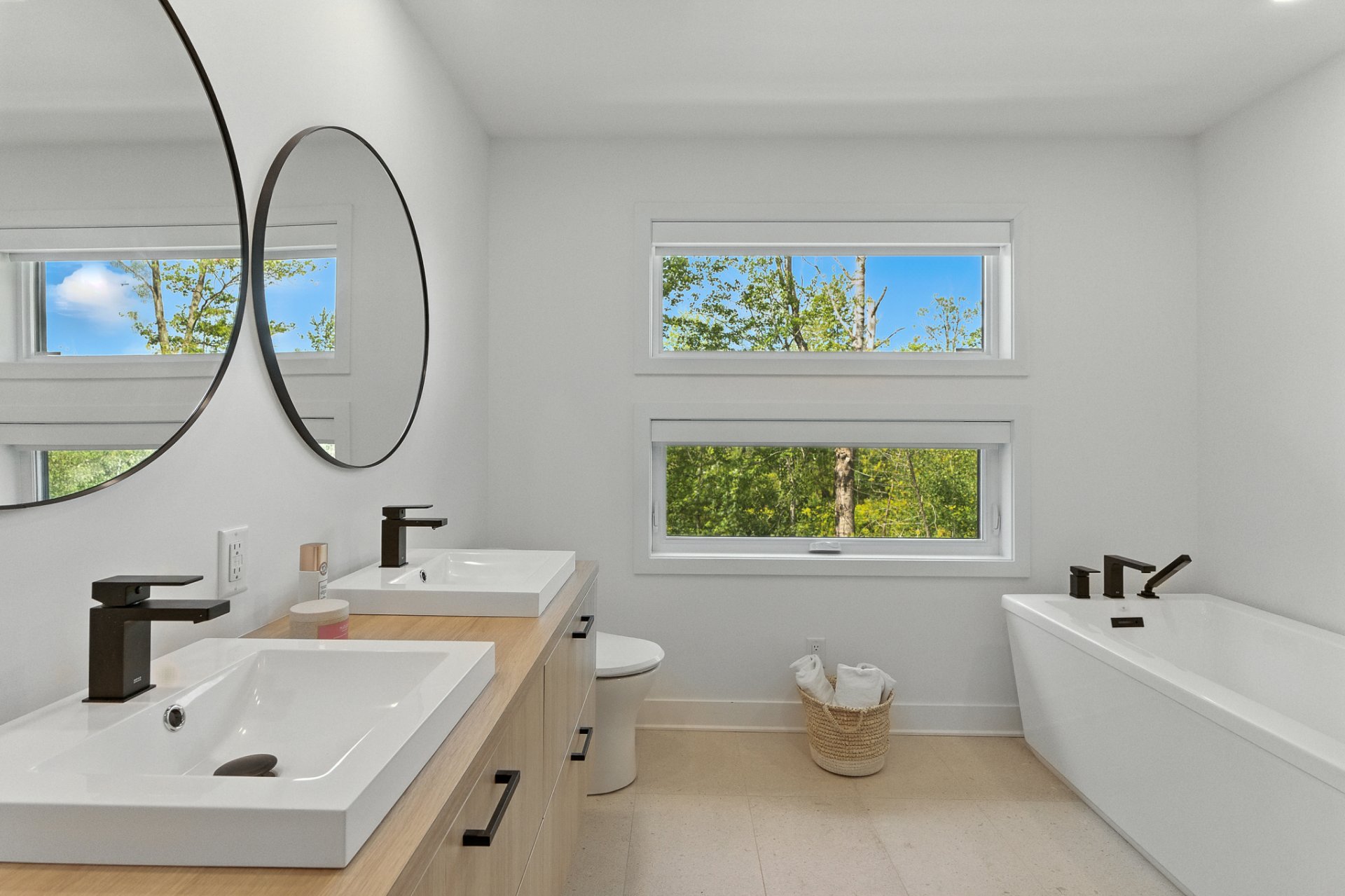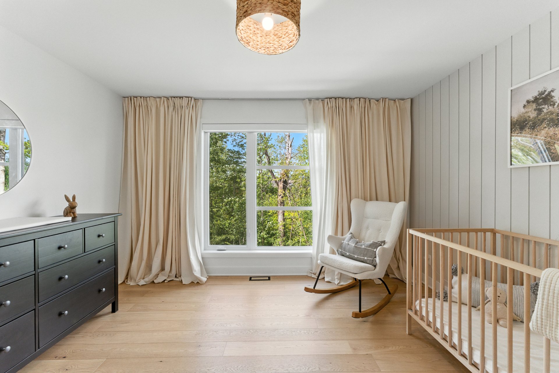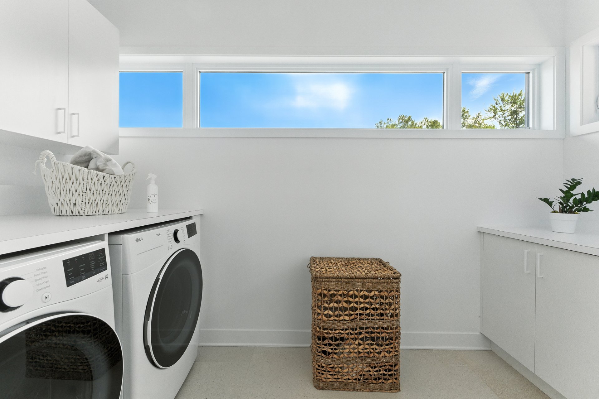À l'étage, la suite principale est conçue comme un espace intime: penderie aménagée et salle de bains attenante aménagée d'un bain autoportant, douche et vanité double. Deux chambres supplémentaires se partagent une salle de bains complète. La salle de lavage, judicieusement équipée de rangements, d'un plan de travail et évier témoigne du même souci de praticité.