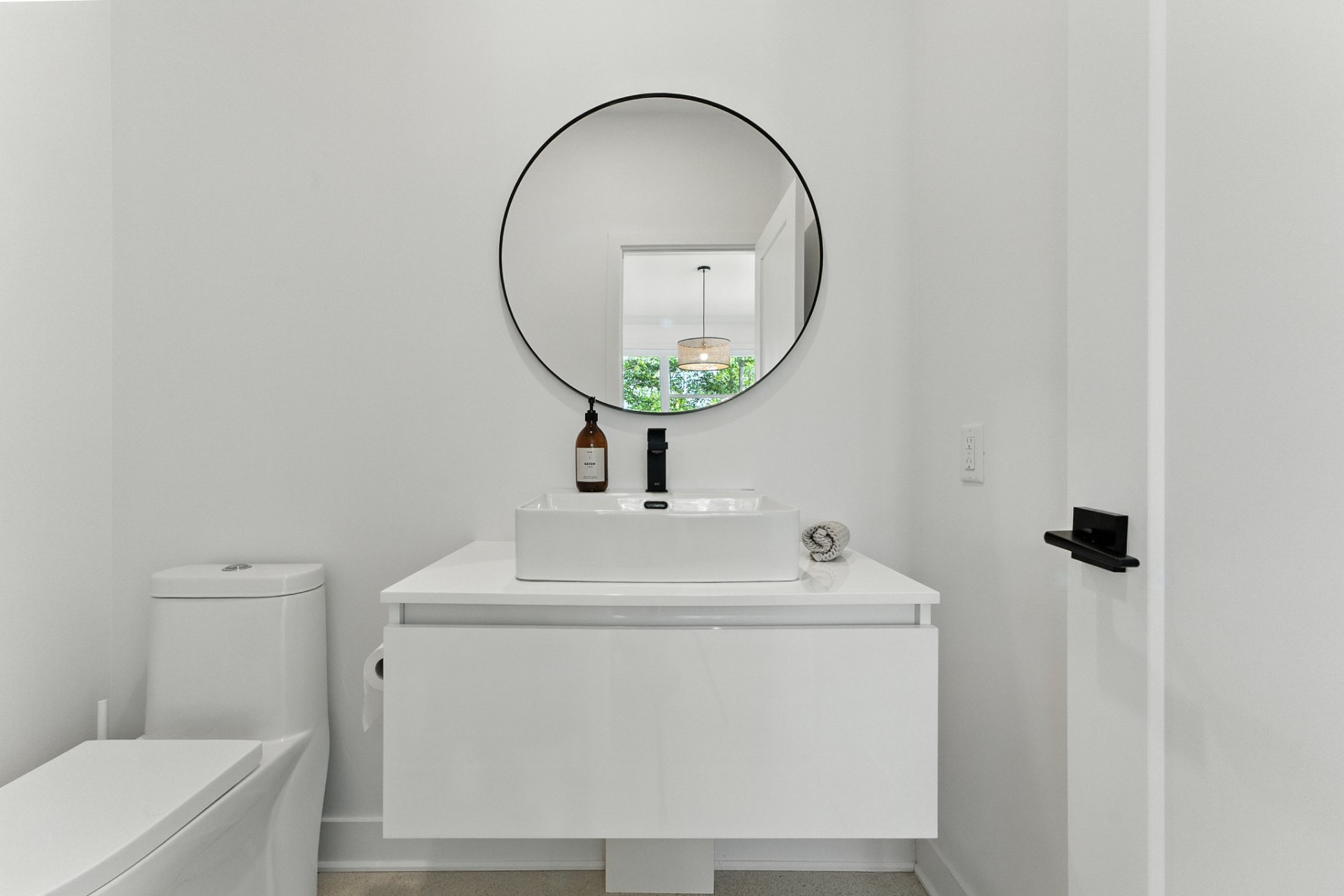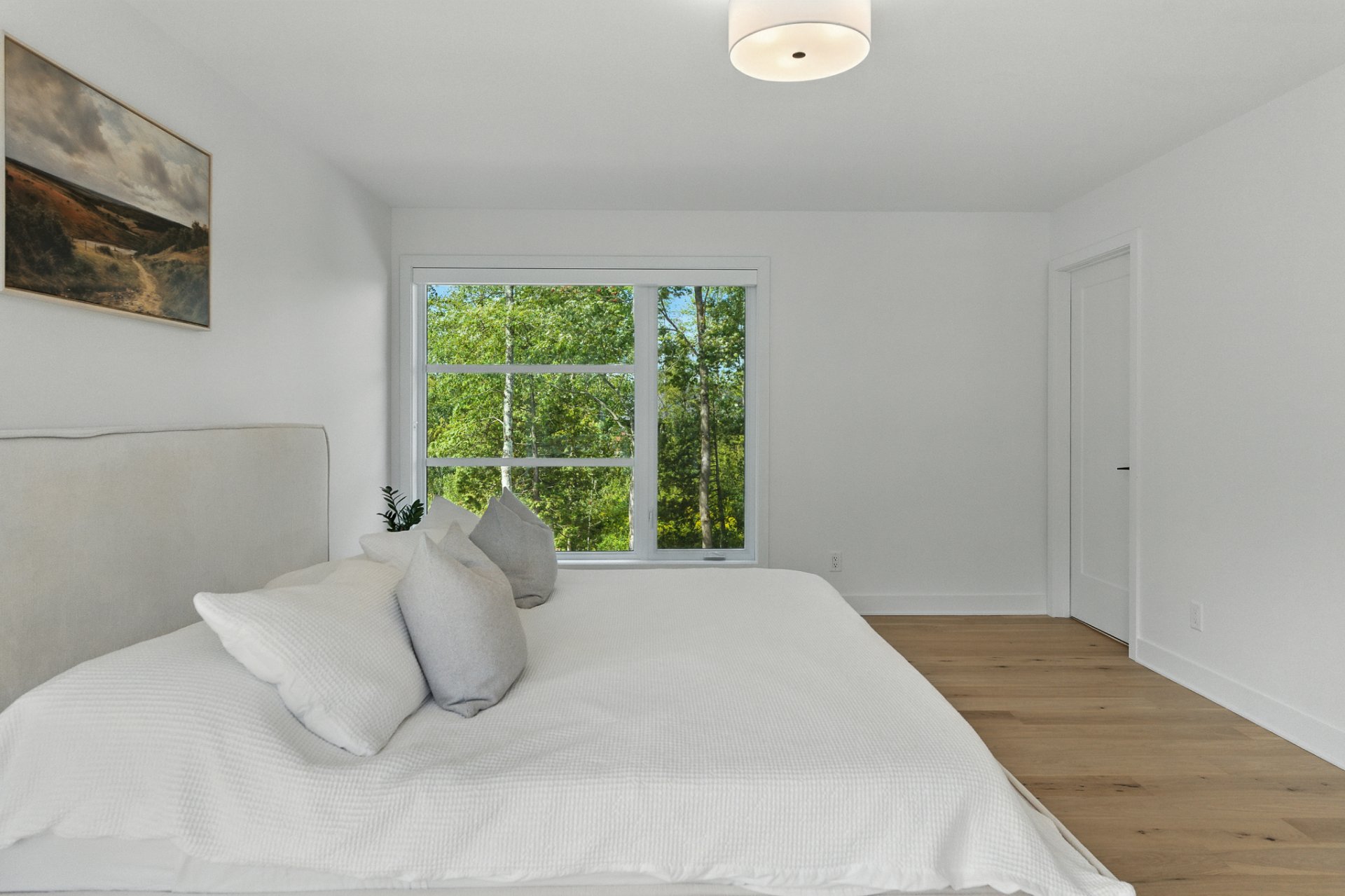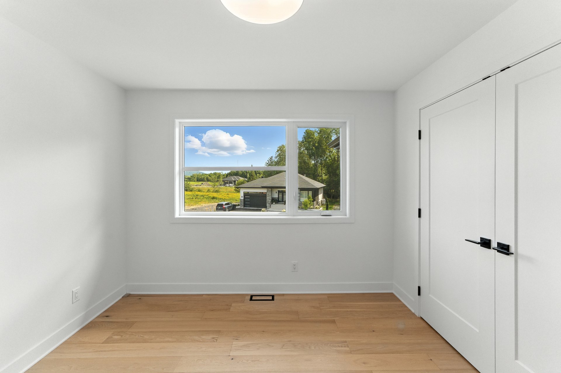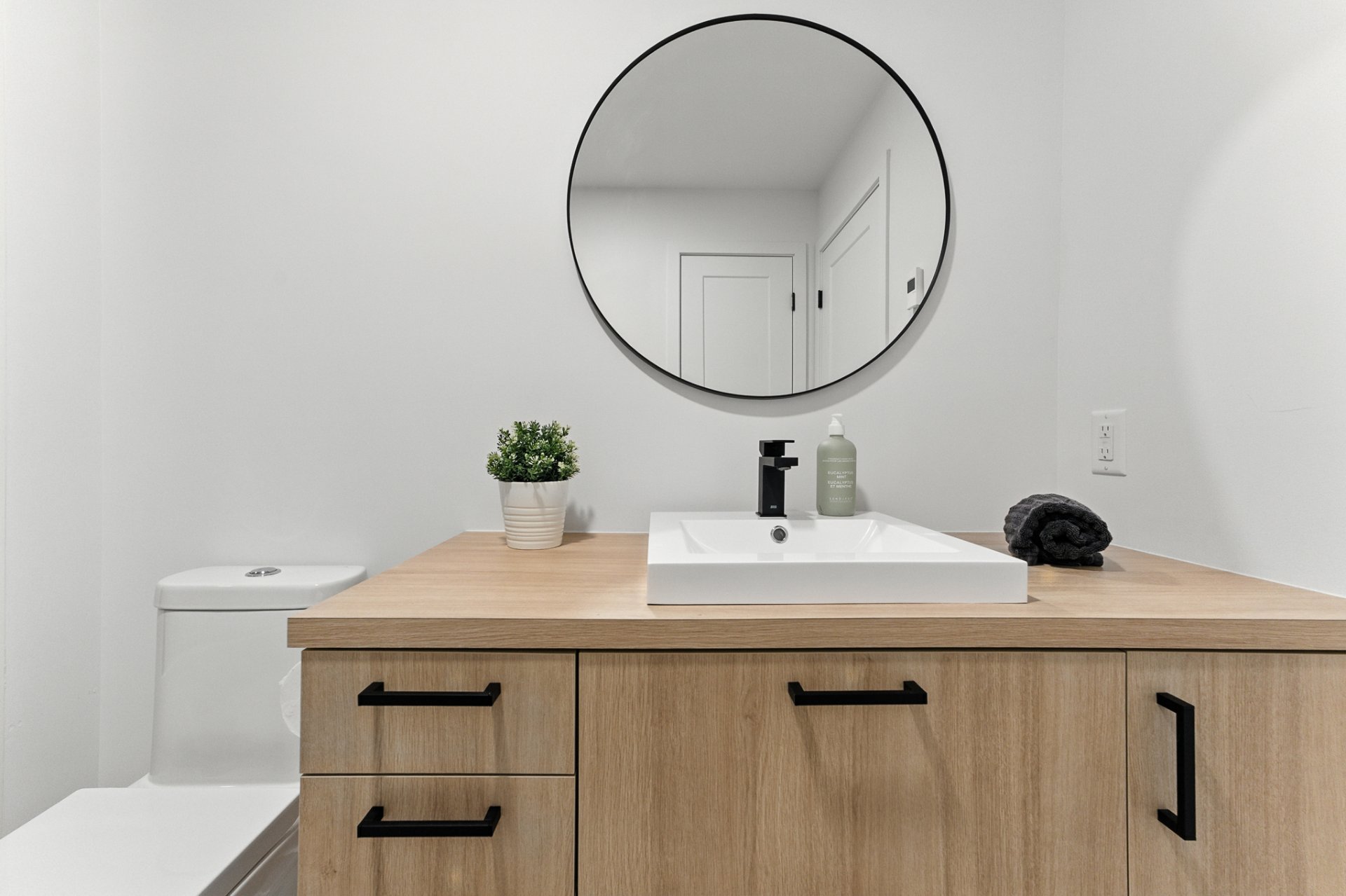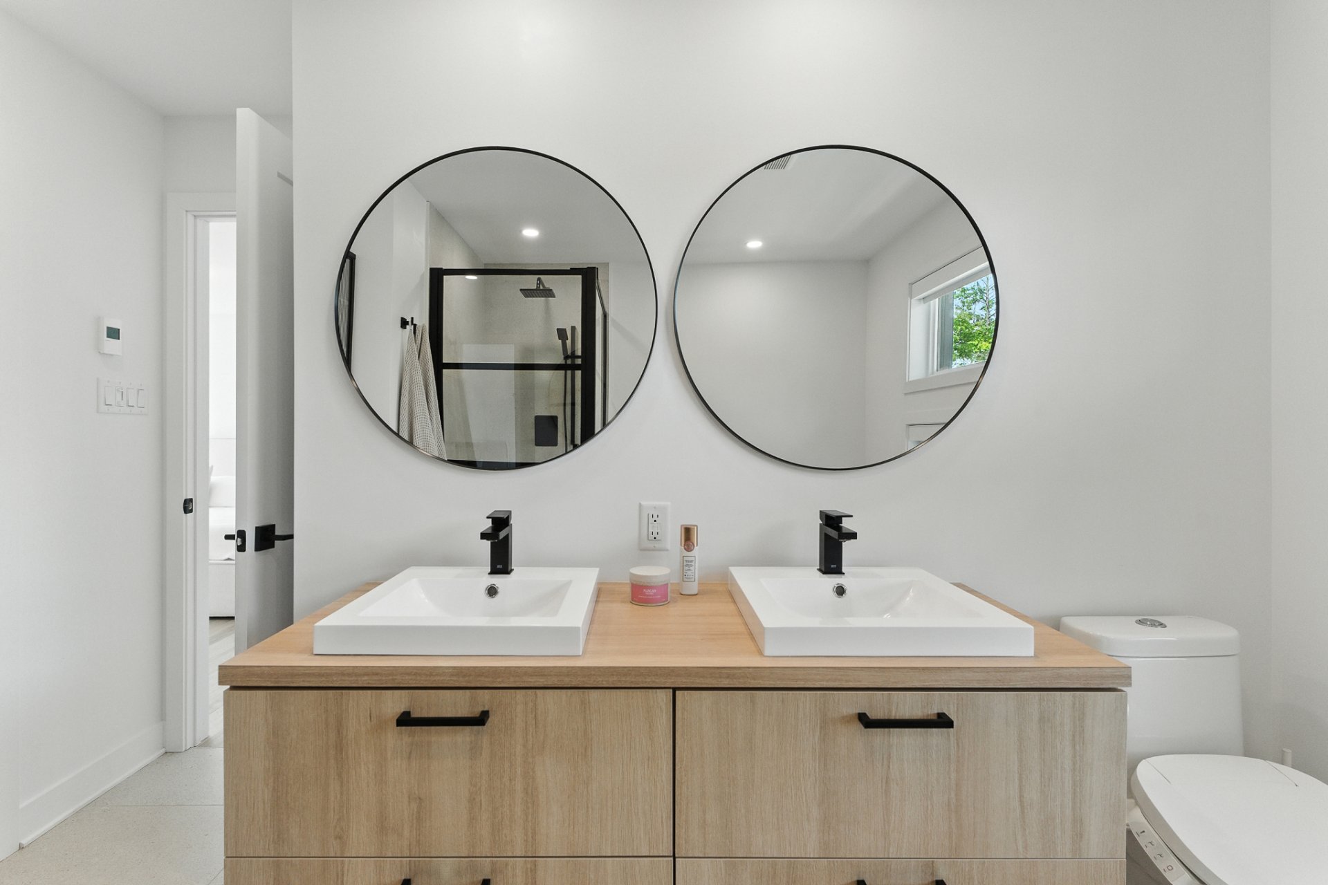À l'étage, la suite principale est conçue comme un espace intime: penderie aménagée et salle de bains attenante aménagée d'un bain autoportant, douche et vanité double. Deux chambres supplémentaires se partagent une salle de bains complète. La salle de lavage, judicieusement équipée de rangements, d'un plan de travail et évier témoigne du même souci de praticité.