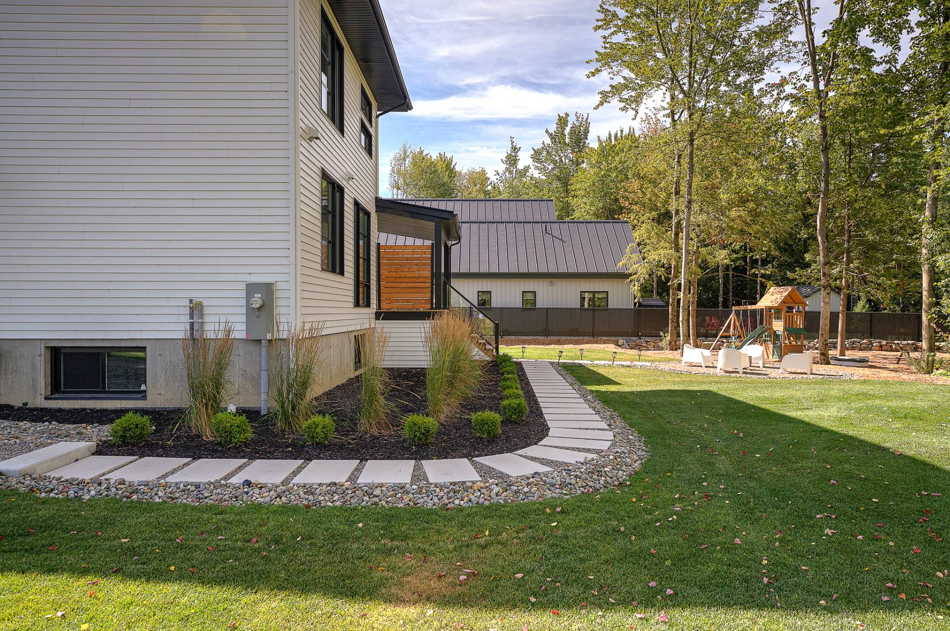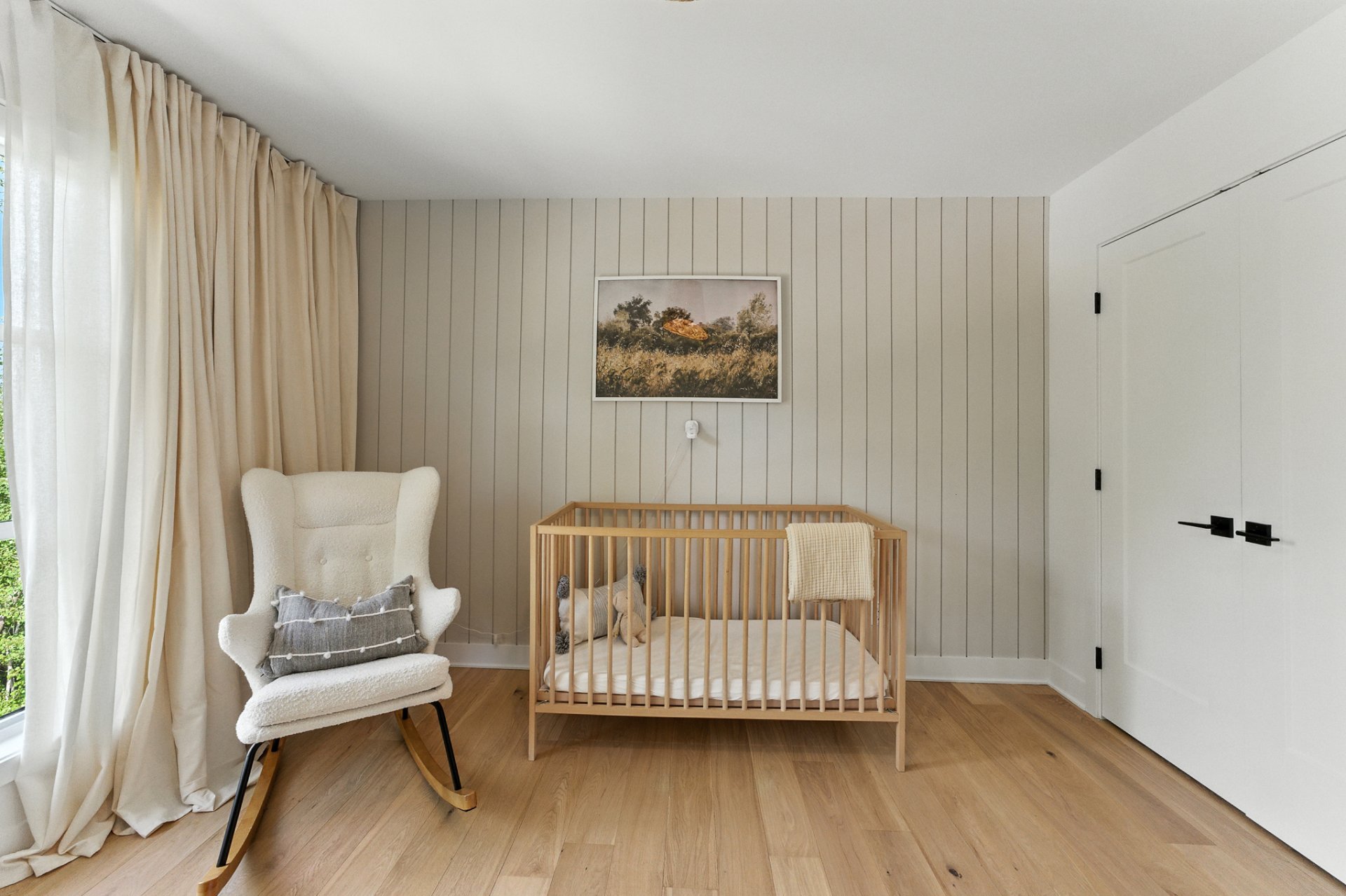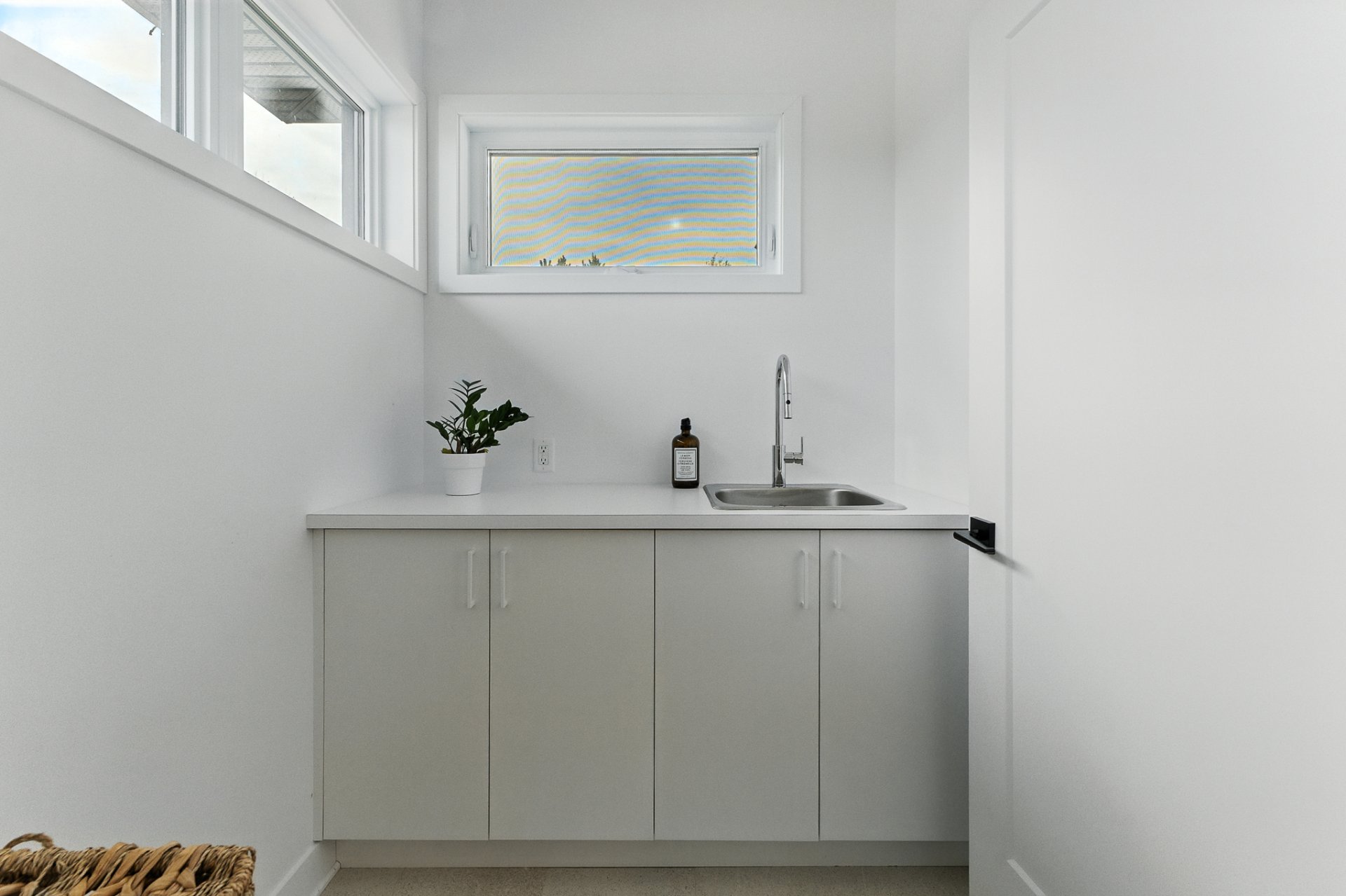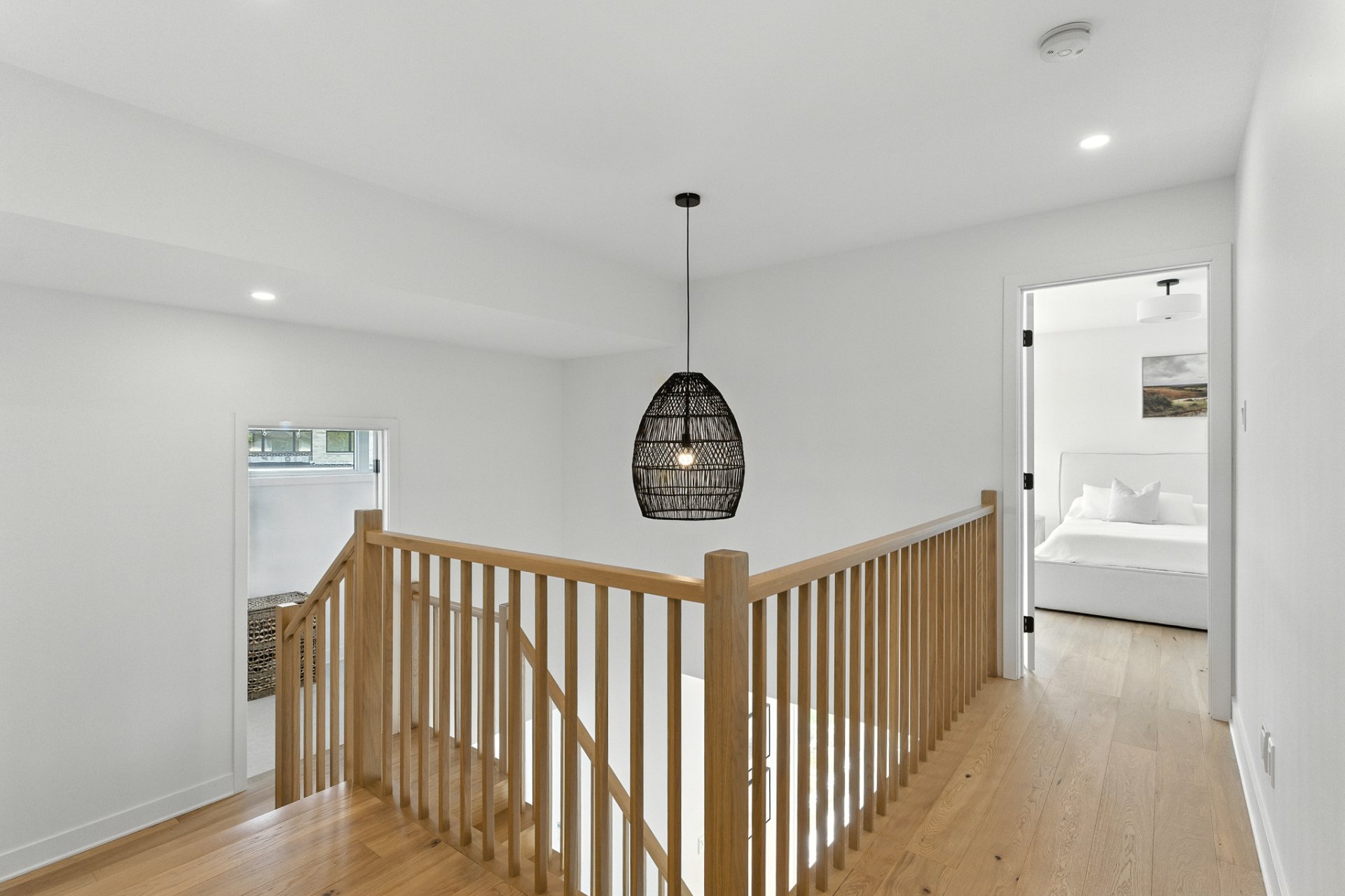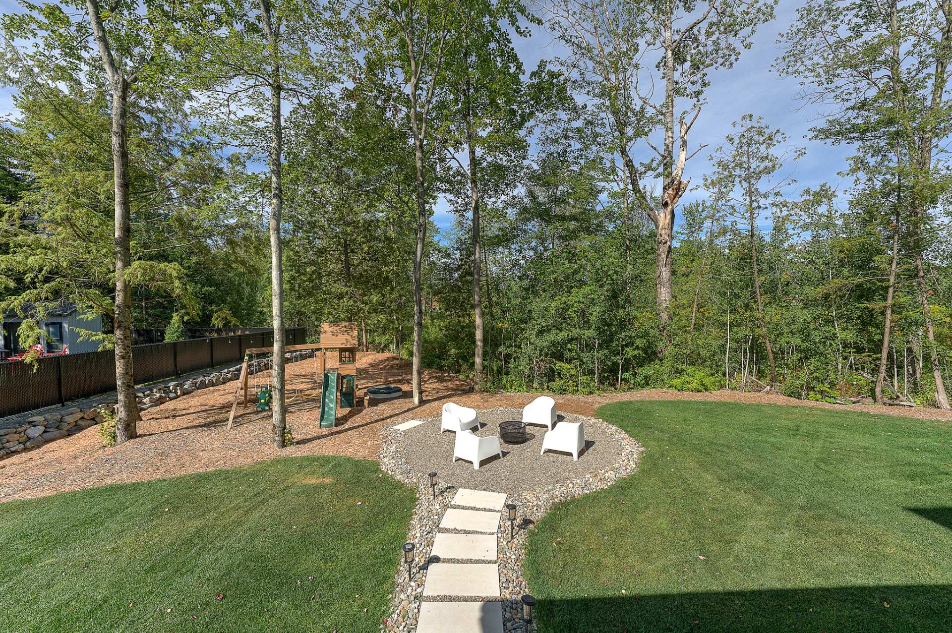 À l'étage, la suite principale est conçue comme un espace intime: penderie aménagée et salle de bains attenante aménagée d'un bain autoportant, douche et vanité double. Deux chambres supplémentaires se partagent une salle de bains complète. La salle de lavage, judicieusement équipée de rangements, d'un plan de travail et évier témoigne du même souci de praticité.