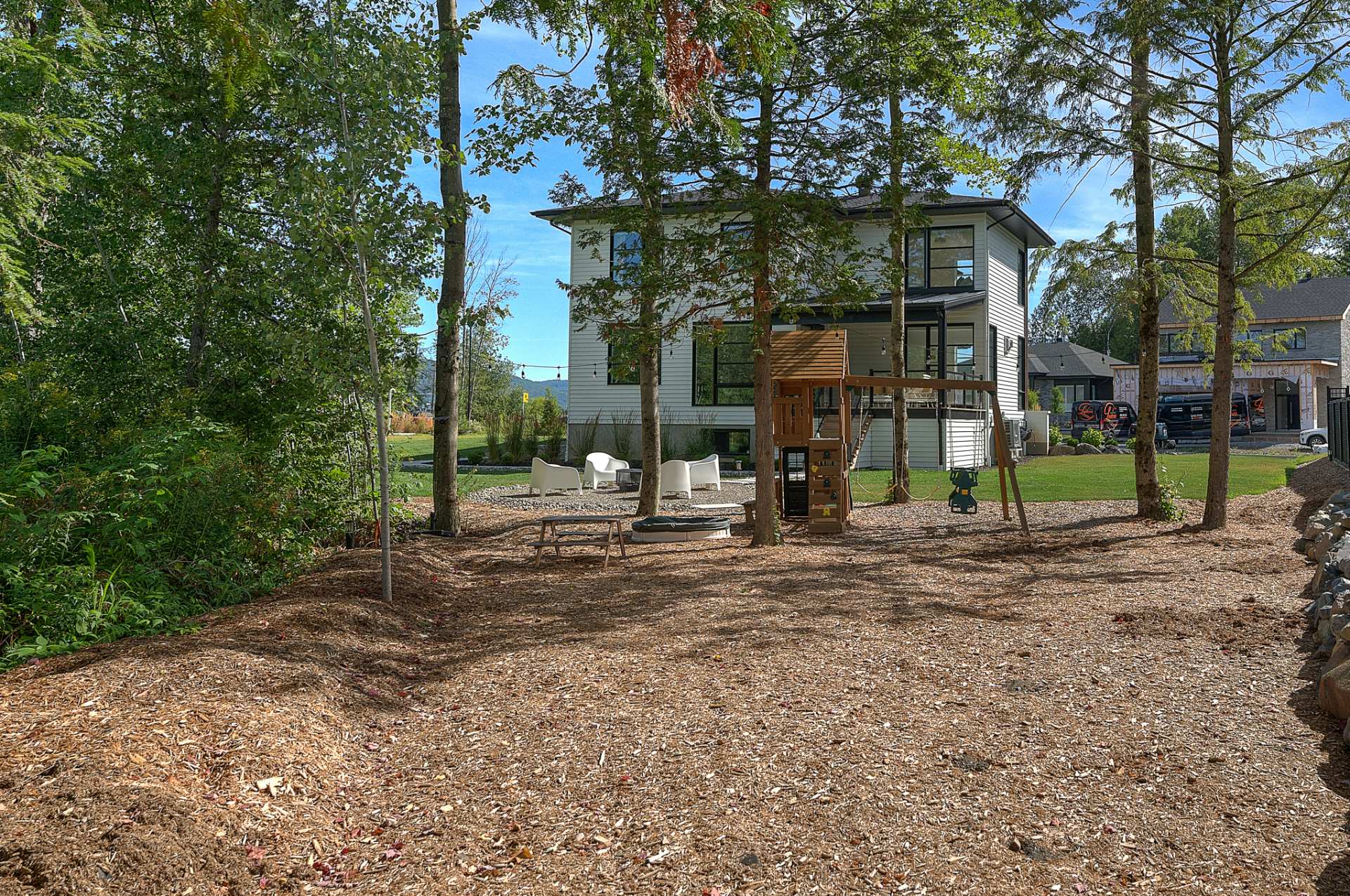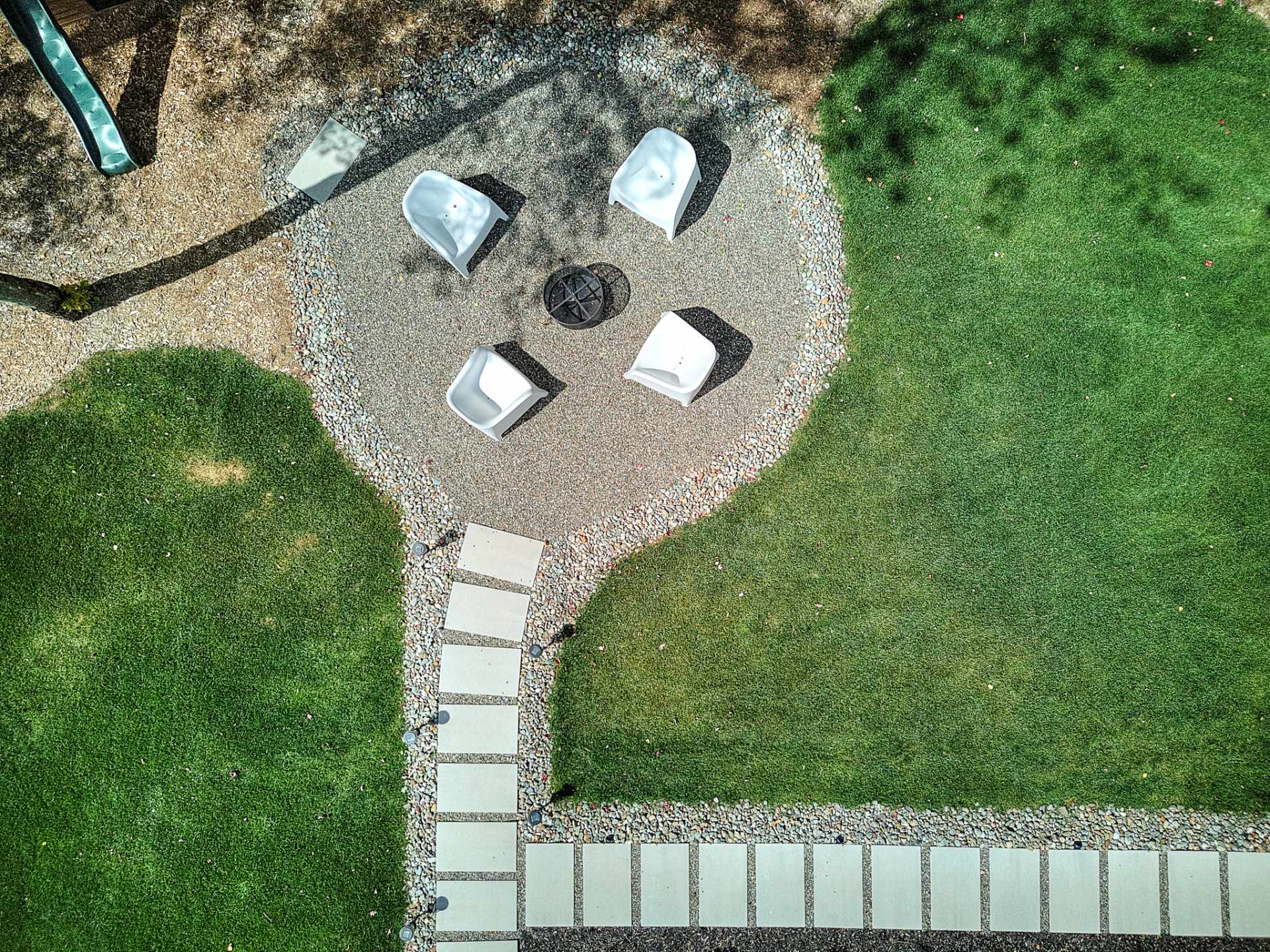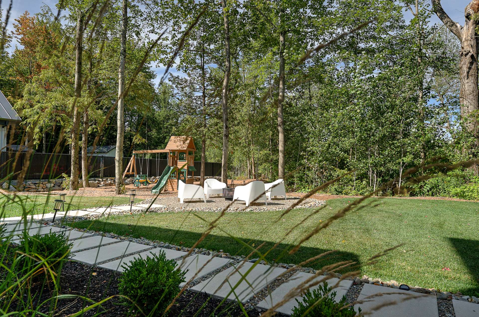 Le garage chauffé est muni d'un évier et d'une porte latérale. La terrasse couverte agrémentée de balustrades en verre, le coin feu aménagé dans la cour et l'espace de jeu parachèvent l'ensemble.
