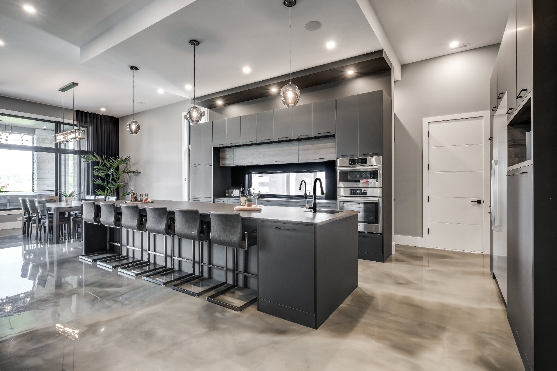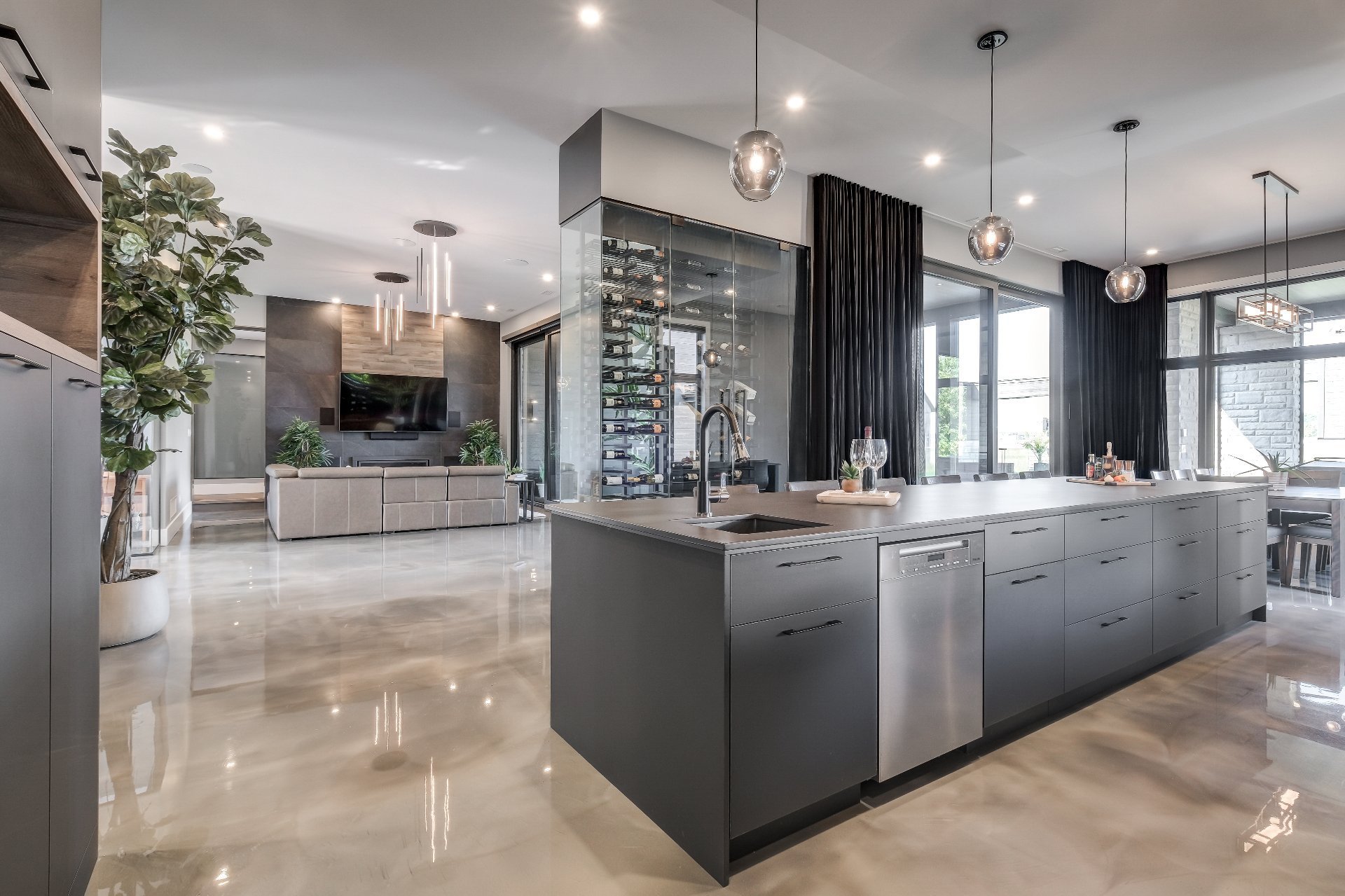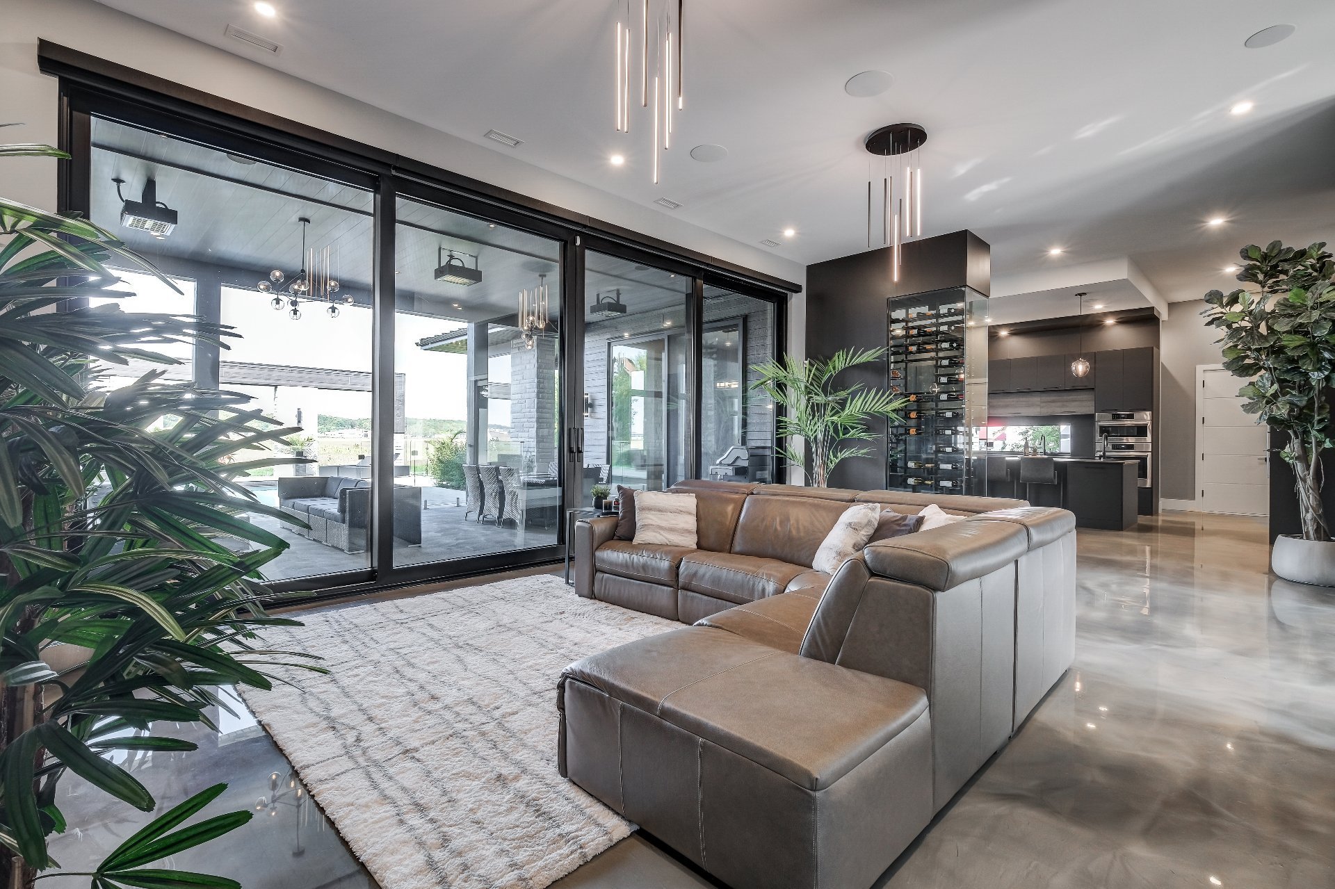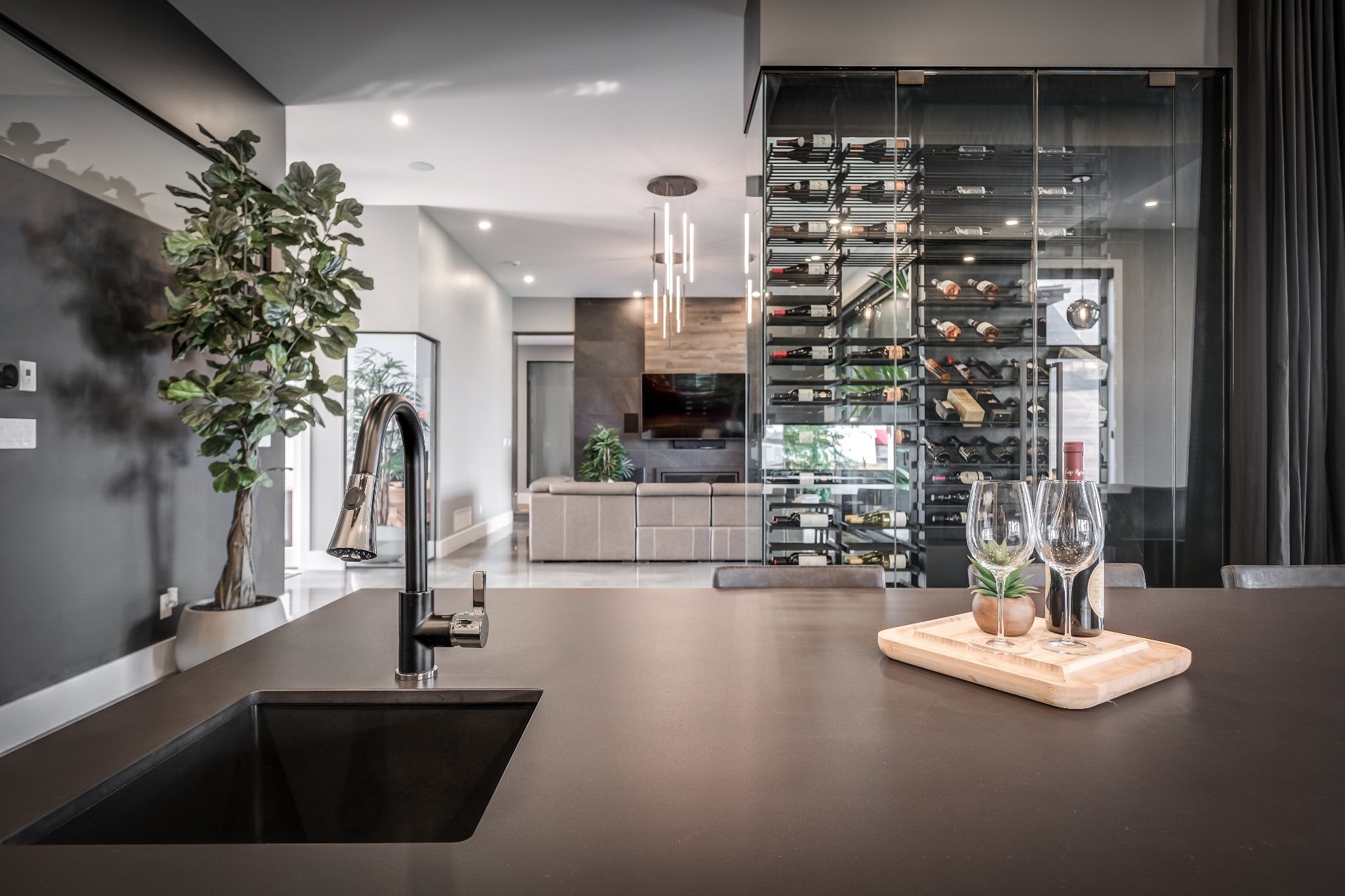 À l'intérieur, l'aire de vie principale à aire ouverte dégage une sensation d'espace et de fluidité. La cuisine, véritable chef-d'oeuvre moderne, se distingue par ses électroménagers encastrés haut de gamme, son immense îlot et son splendide cellier vitré qui s'intègre avec élégance au salon.