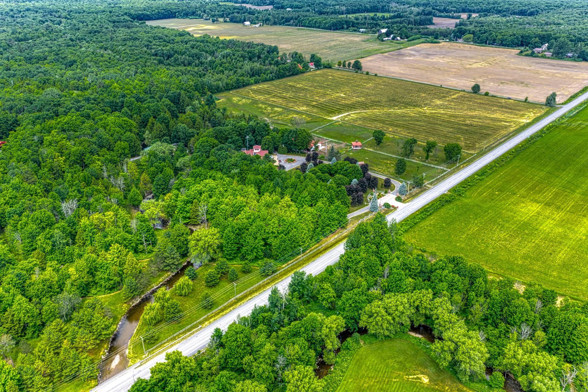 Ce domaine privé niché au coeur de Hinchinbrooke, à 3 minutes de la frontière américaine, s'étend sur environ 140 acres de campagne sereine offrant un mariage rare de splendeur naturelle, d'architecture raffinée et de prestations haut de gamme. La Rivière Hinchinbrooke serpente doucement à travers le domaine, rehaussant l'ambiance paisible, tandis que près de 10kms de sentiers pédestres parfaitement entretenus vous permettent d'explorer la forêt luxuriante et les panoramas paysagers en toute intimité.