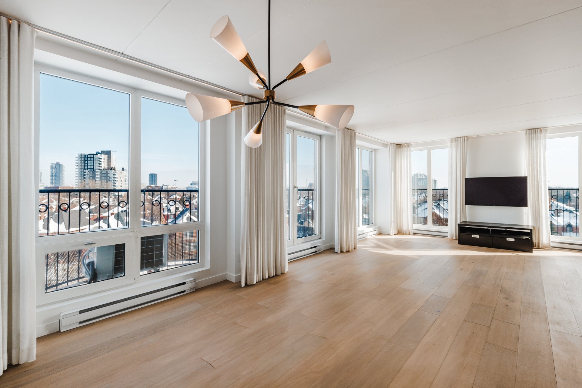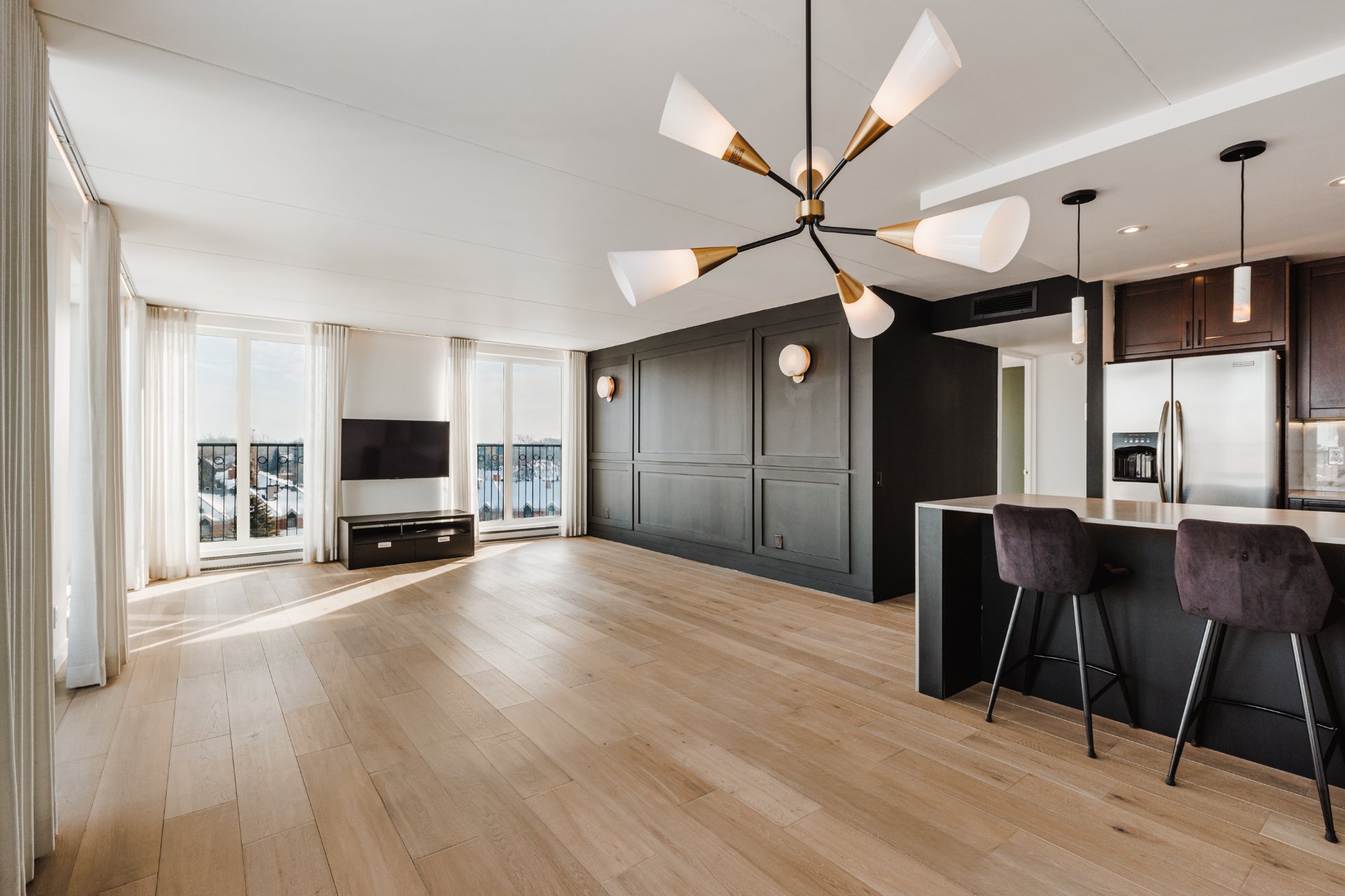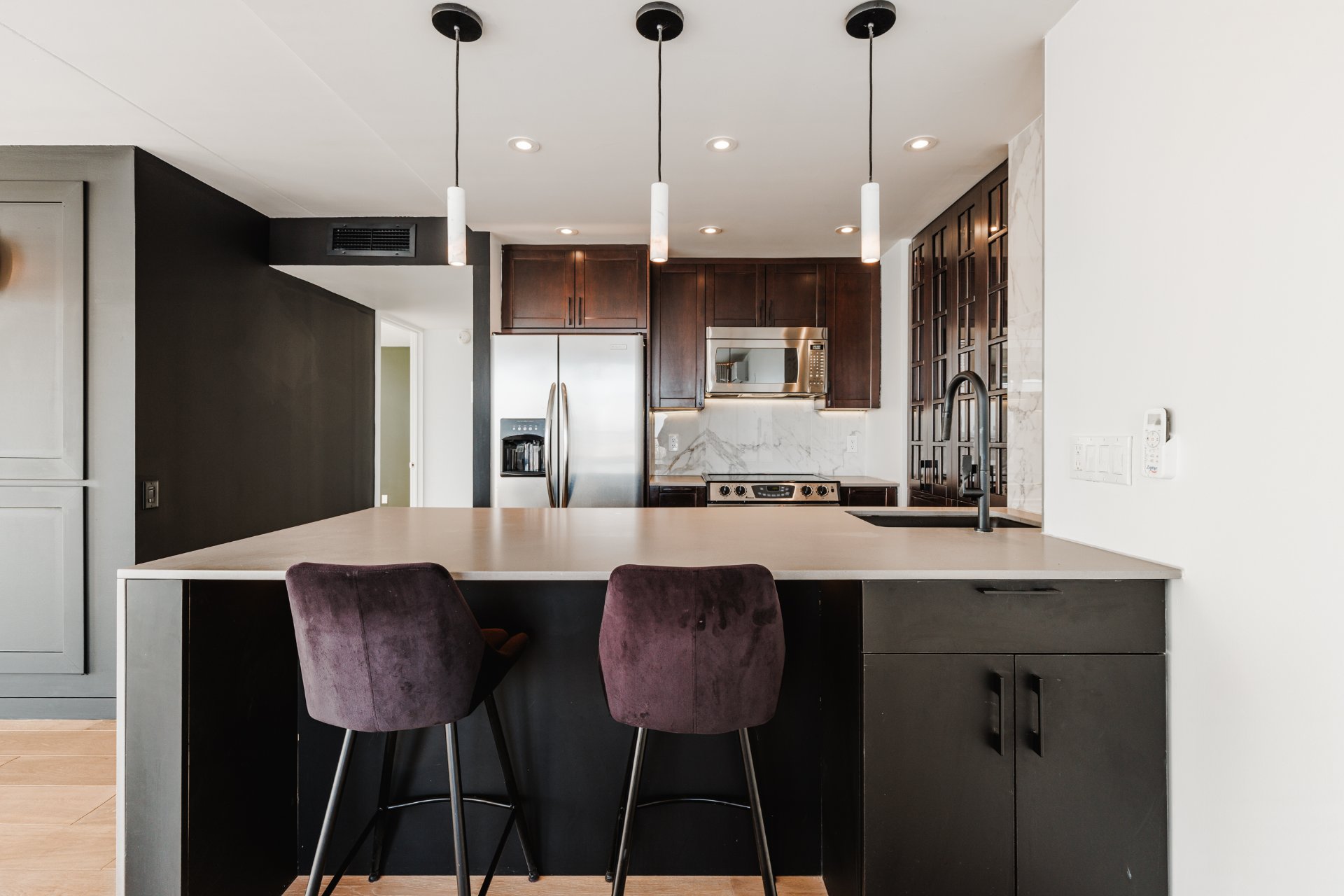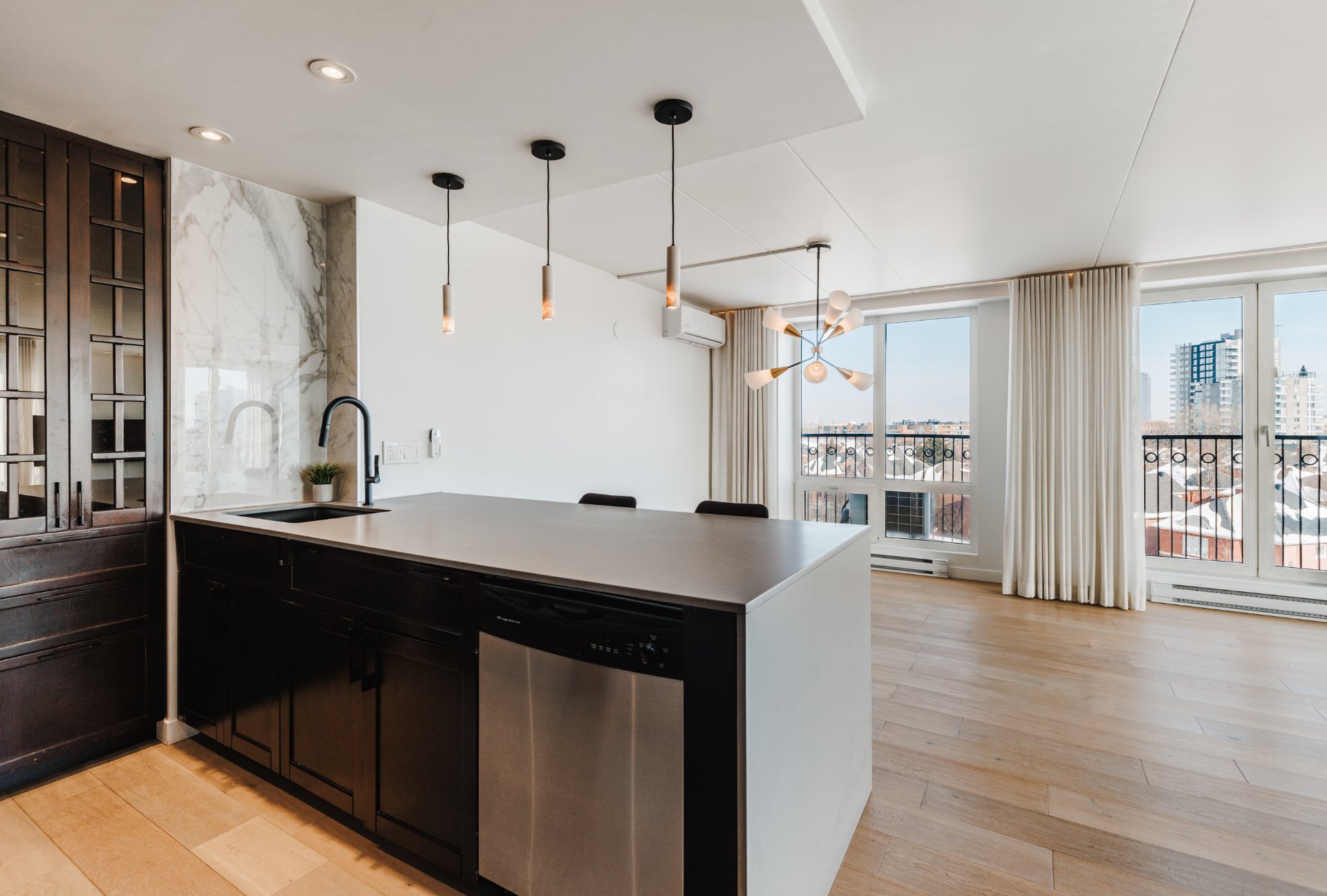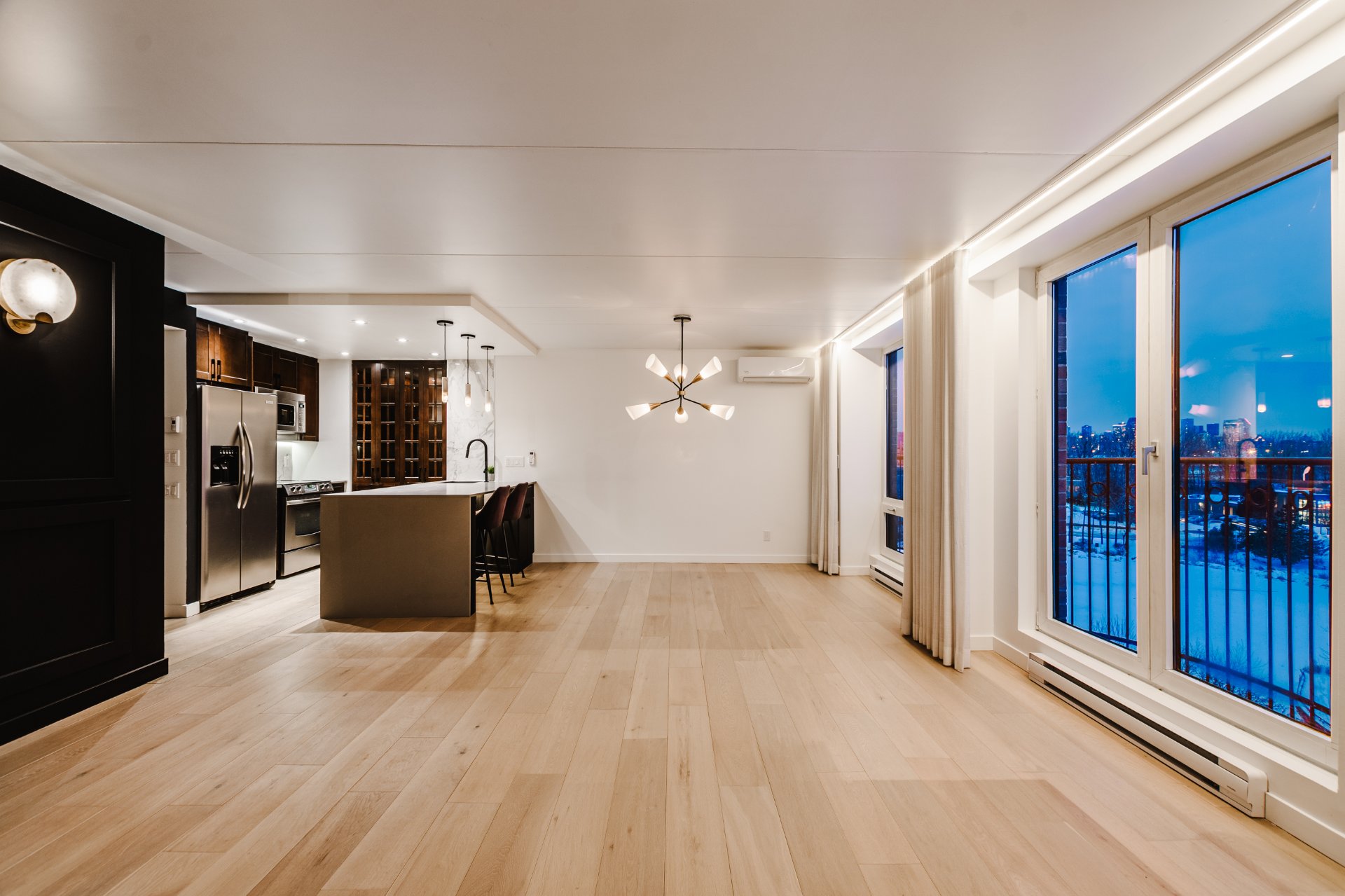 Superbe unité au design contemporain offrant un espace de vie à aire ouverte inondé de lumière naturelle grâce à ses spectaculaires fenêtres pleine hauteur. La cuisine, à la fois élégante et raffinée, propose un vaste îlot et des armoires pleine hauteur, alliant esthétisme et fonctionnalité, un espace idéal pour recevoir.