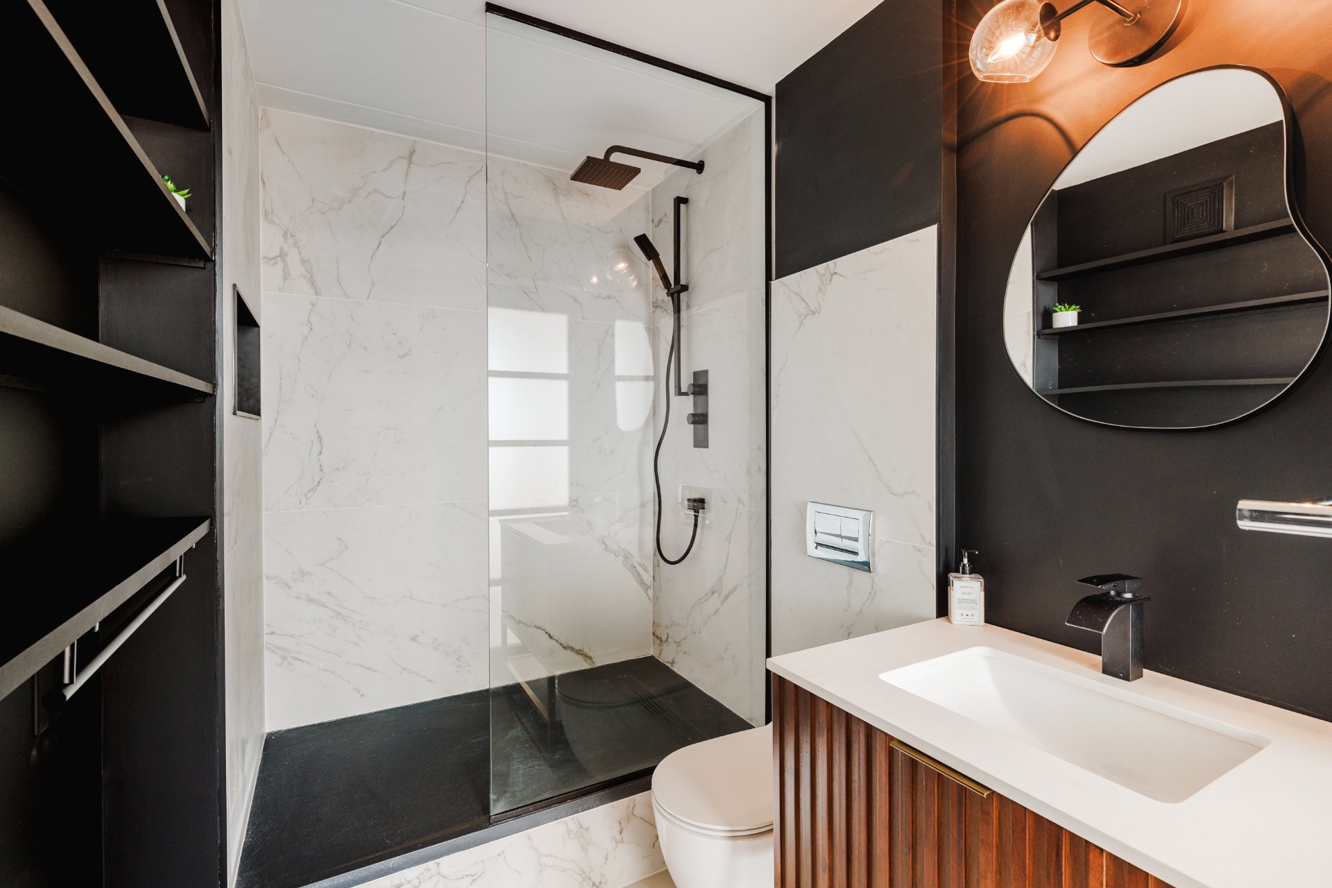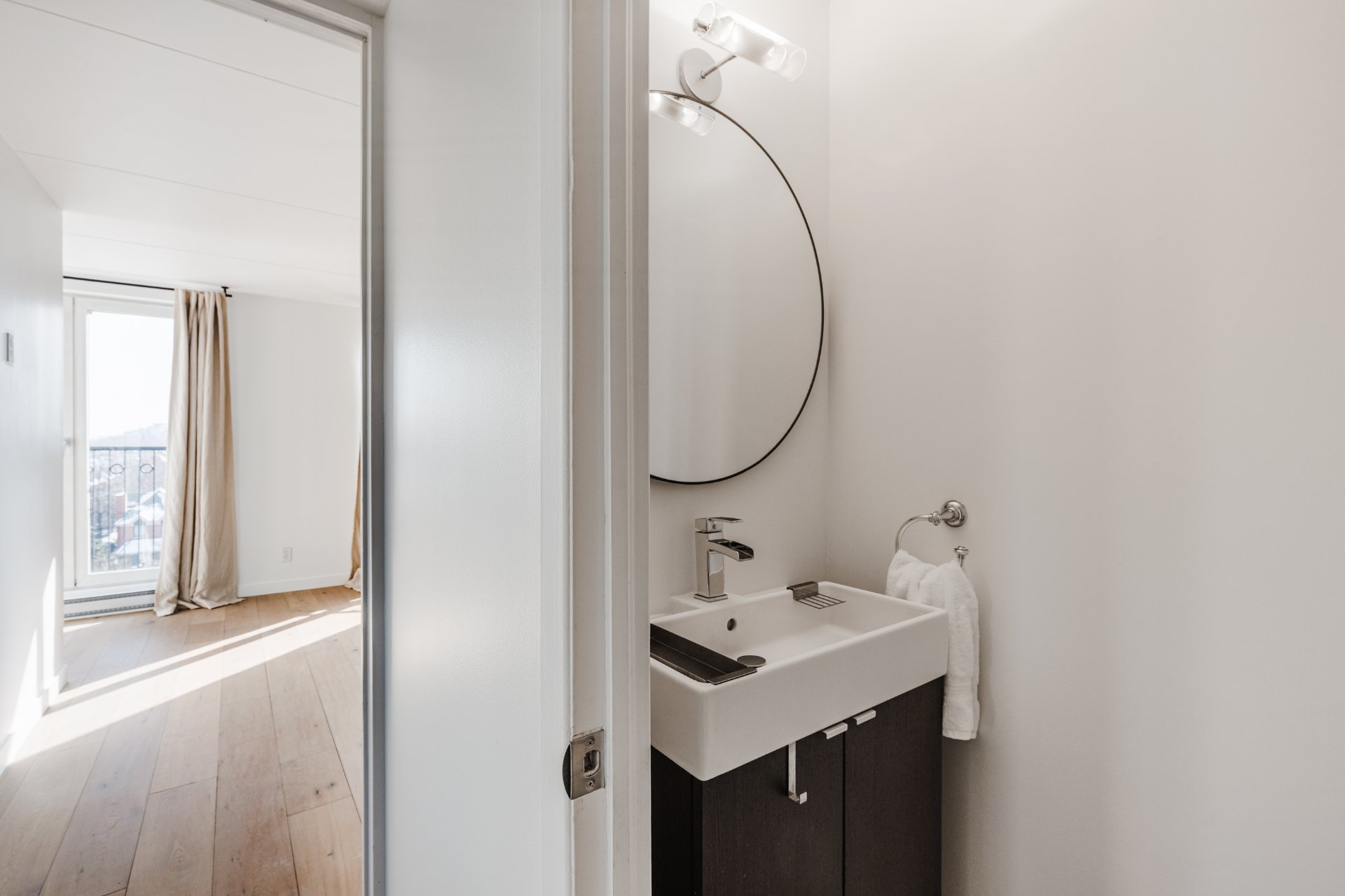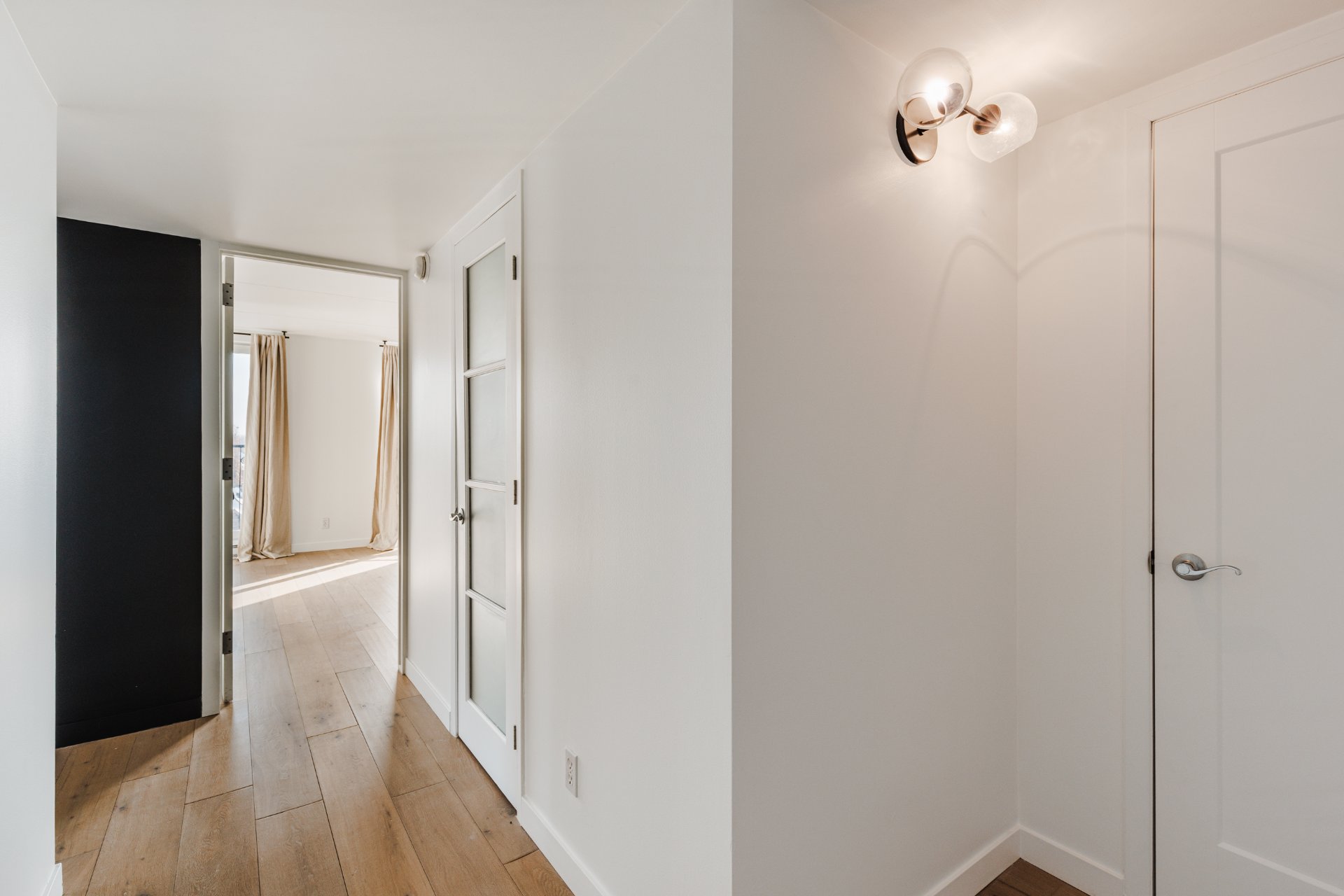 La chambre principale est dotée d'un walk-in et une salle de bain attenante avec douche vitrée au style épuré, tandis qu'une salle d'eau distincte ajoute une touche de commodité appréciée. Un espace laveuse-sécheuse fermé complète l'aménagement de l'unité.