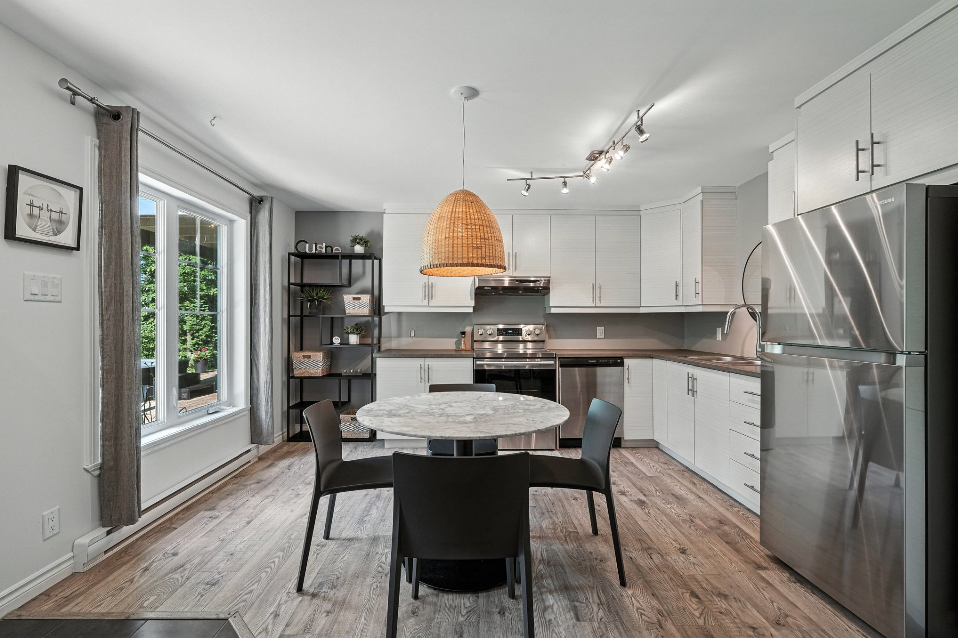Modernes, le salon, la salle à manger et la cuisine se fondent dans un design à aire ouverte, magnifié par un éclairage soigné, des planchers de bois franc et un grand îlot central qui devient le coeur de la pièce. Un spacieux balcon communique avec cet espace, parfait pour prendre des repas à l'extérieur l'été venu.