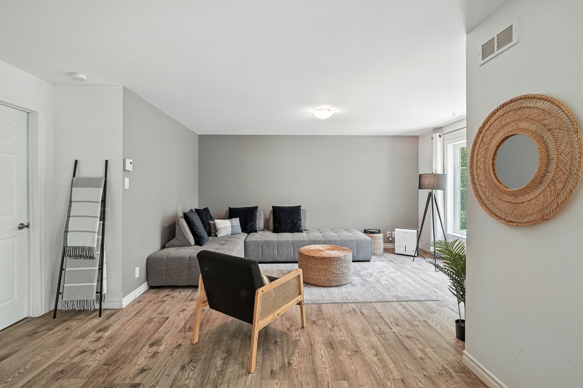 Le rez-de-jardin propose une salle familiale ou une troisième chambre, un espace gym/bureau et une salle d'eau avec espace buanderie. À l'arrière, une porte-patio donne accès à la cour ensoleillée, avec un espace SPA et une deuxième terrasse.
