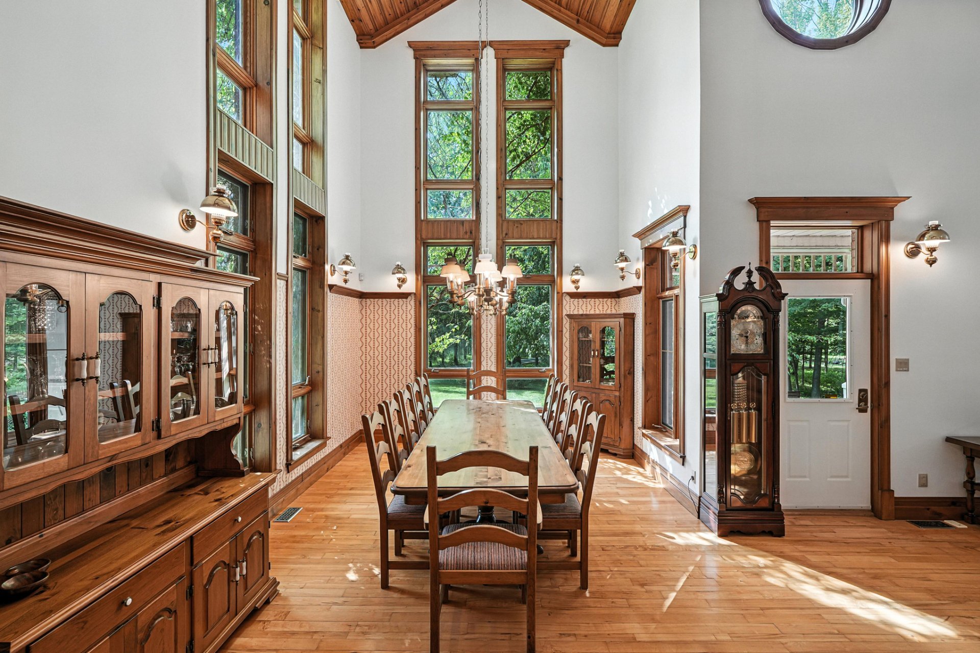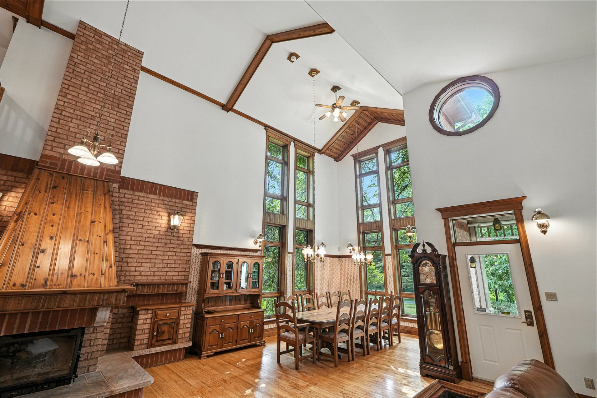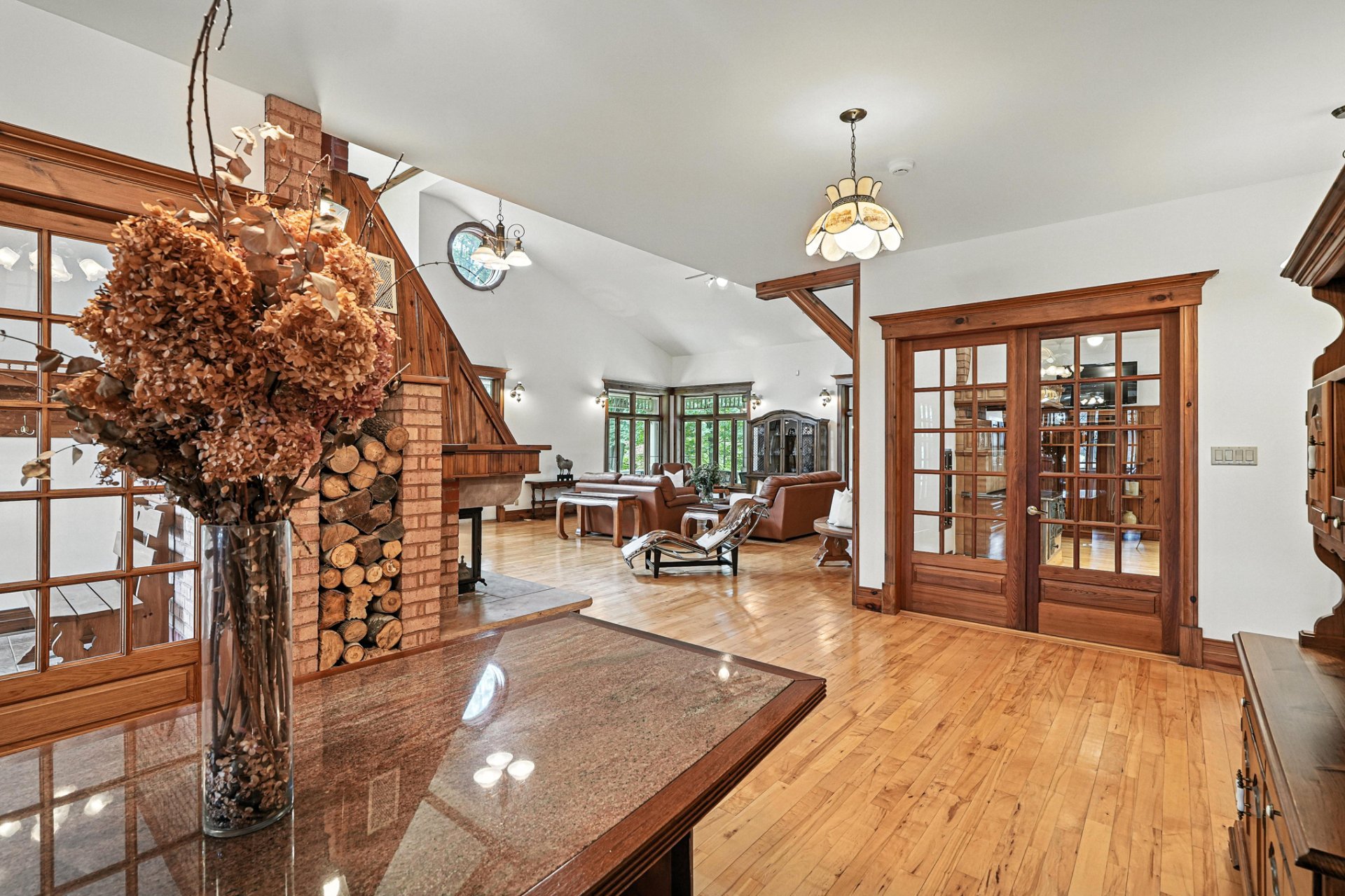 Au coeur du domaine se dresse une majestueuse résidence, où chaque détail reflète l'harmonie entre l'histoire de ce lieu et la modernité. Le rez-de-chaussée impressionne avec son plafond cathédrale et ses vastes fenêtres qui baignent l'intérieur de lumière naturelle offrant des vues panoramiques. Les finitions en bois fastueuses, les briques apparentes et les tons chauds créent une atmosphère à la fois accueillante et sophistiquée dans toute la maison.