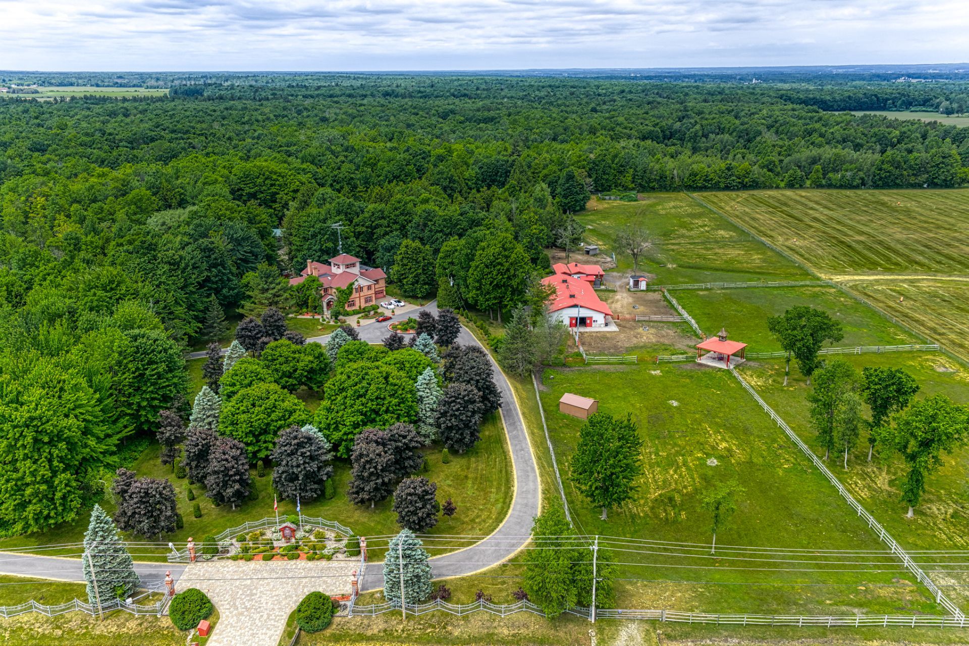 Ce domaine privé niché au coeur de Hinchinbrooke, à 3 minutes de la frontière américaine, s'étend sur environ 140 acres de campagne sereine offrant un mariage rare de splendeur naturelle, d'architecture raffinée et de prestations haut de gamme. La Rivière Hinchinbrooke serpente doucement à travers le domaine, rehaussant l'ambiance paisible, tandis que près de 10kms de sentiers pédestres parfaitement entretenus vous permettent d'explorer la forêt luxuriante et les panoramas paysagers en toute intimité.
