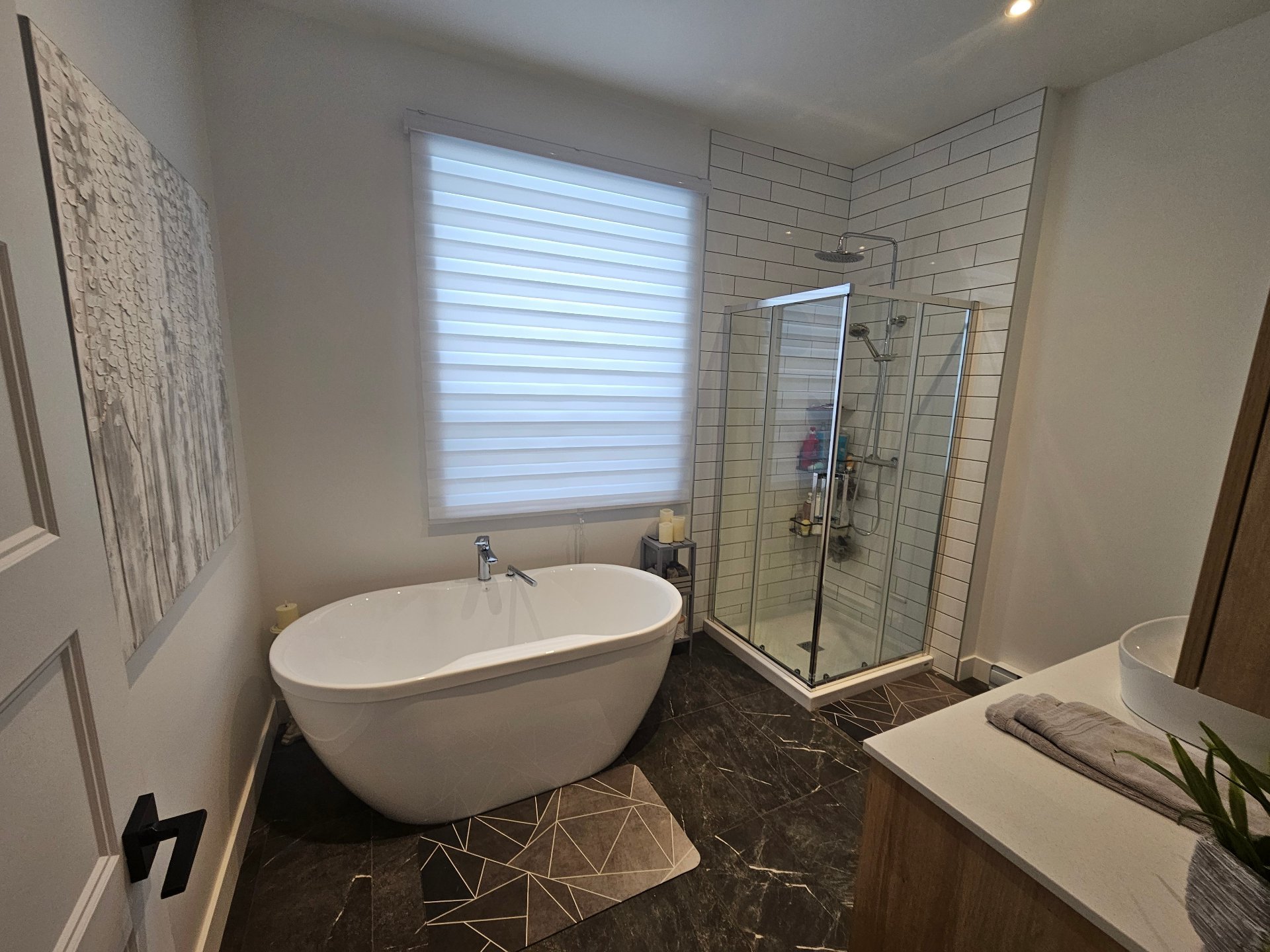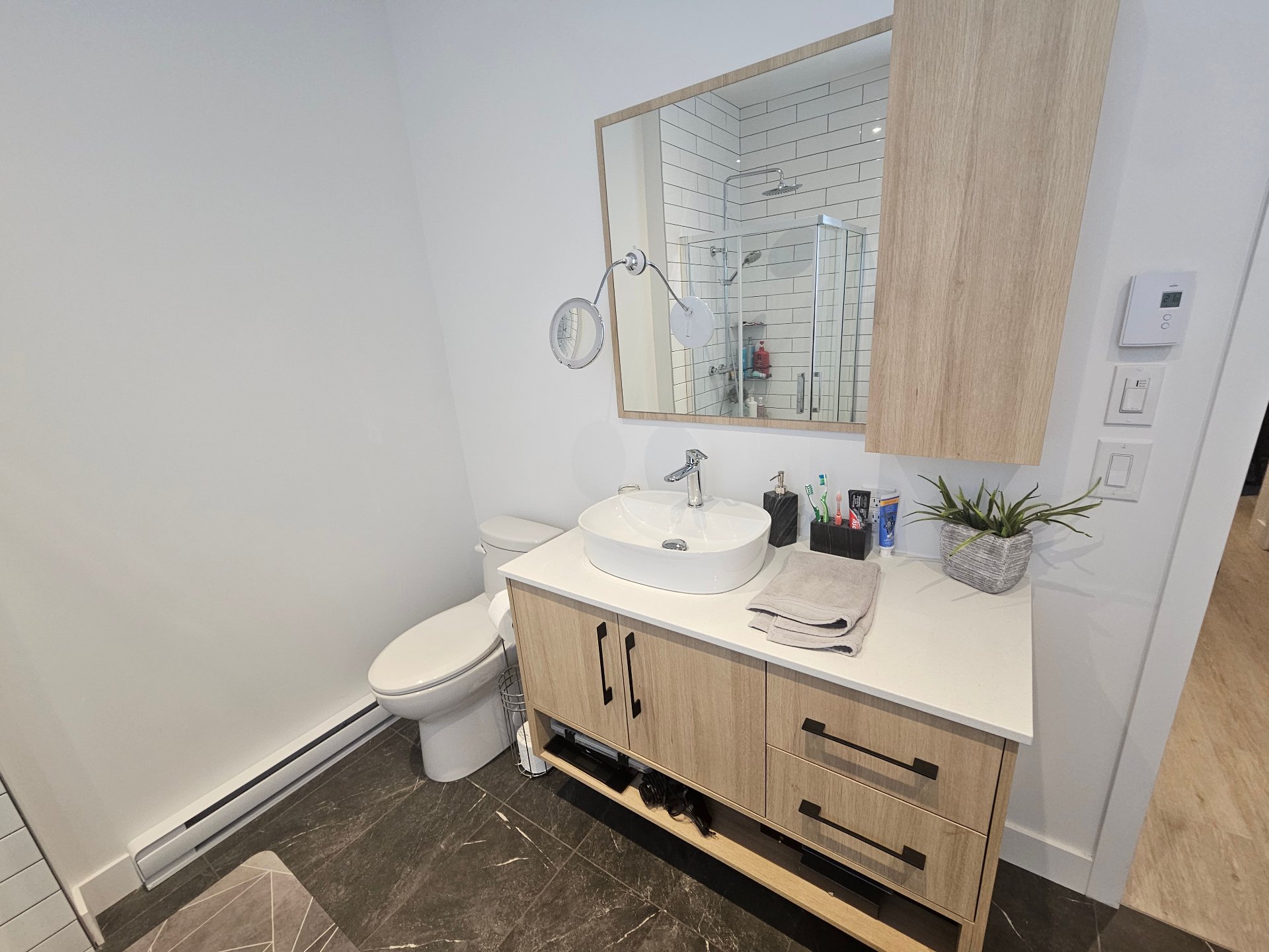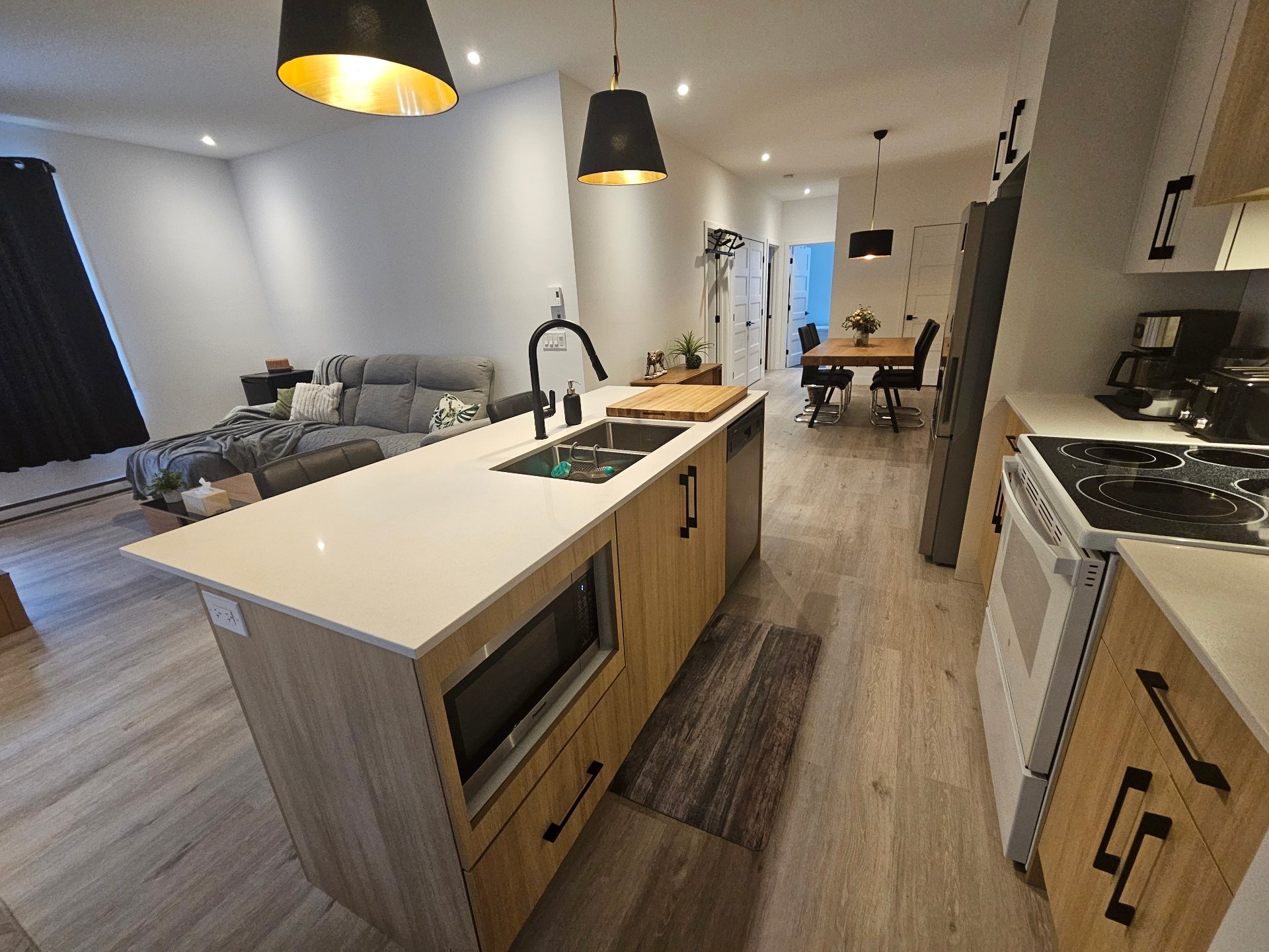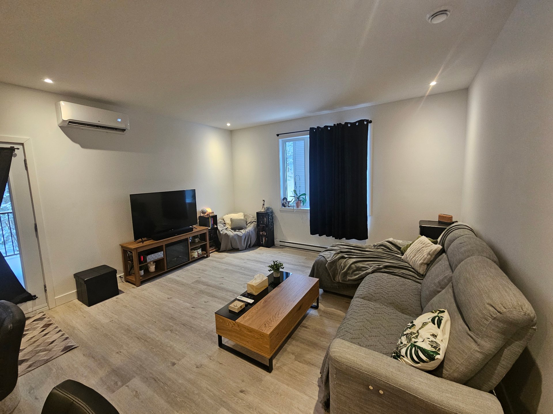 L'appartement bénéficie d'une belle luminosité et d'une disposition fonctionnelle. La cuisine moderne comprend un îlot avec comptoir en quartz. Le logement est équipé d'une thermopompe, d'un échangeur d'air et d'un aspirateur central. La salle de bain offre un bain autoportant, et le store de la fenêtre est inclus. Les deux chambres disposent d'un garde-robe walk-in pour un rangement optimal. Chats acceptés; chiens permis sous conditions.