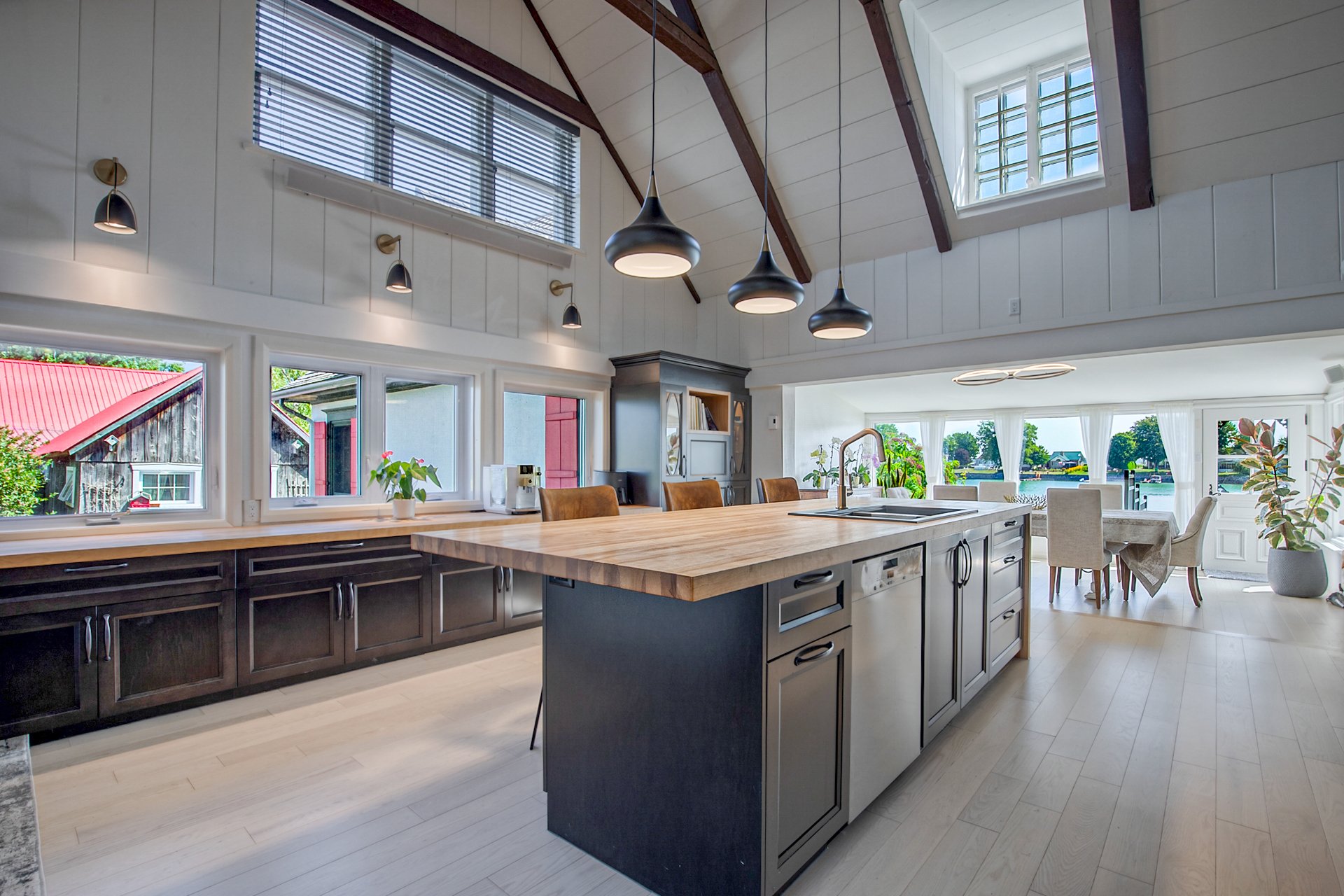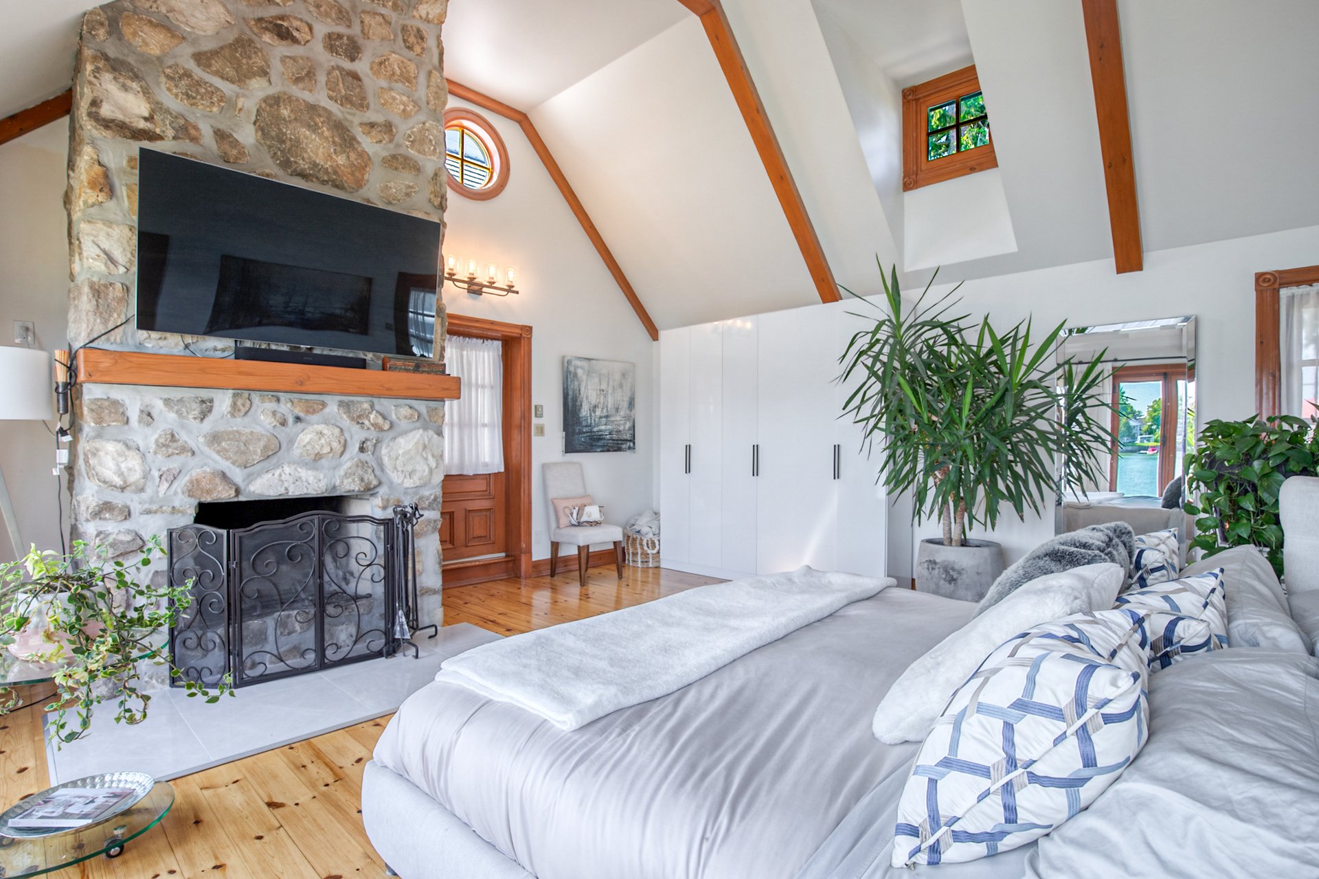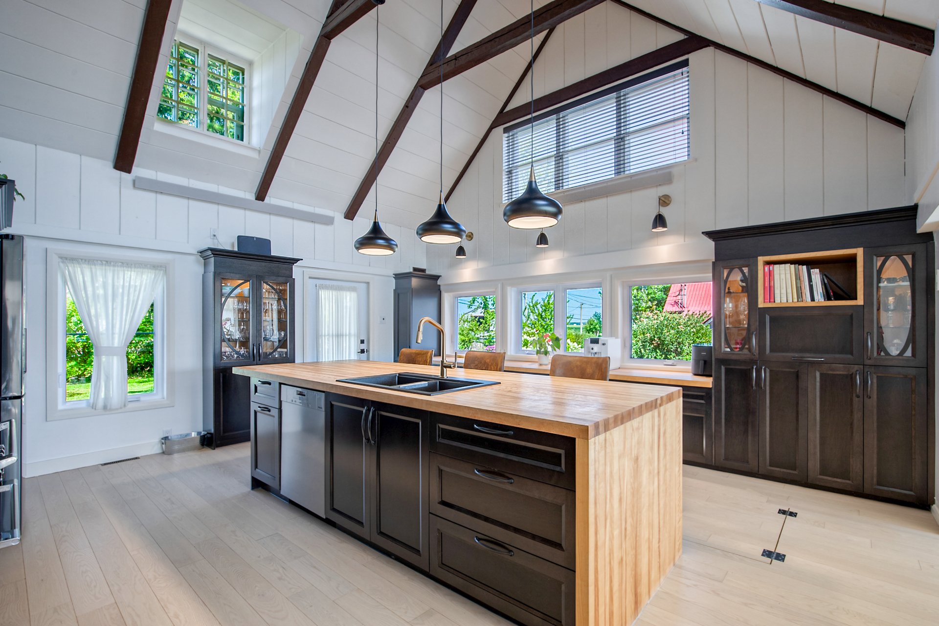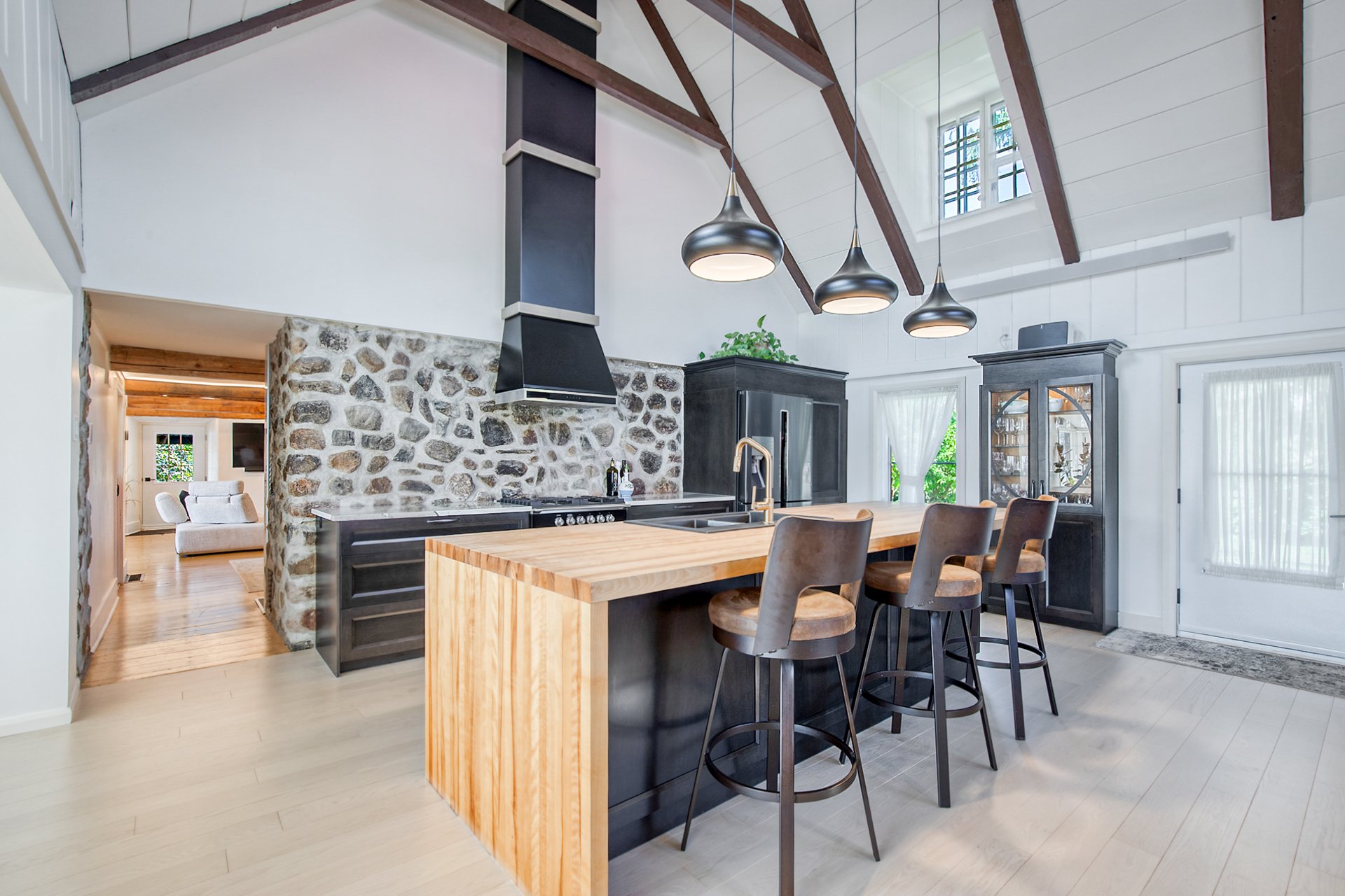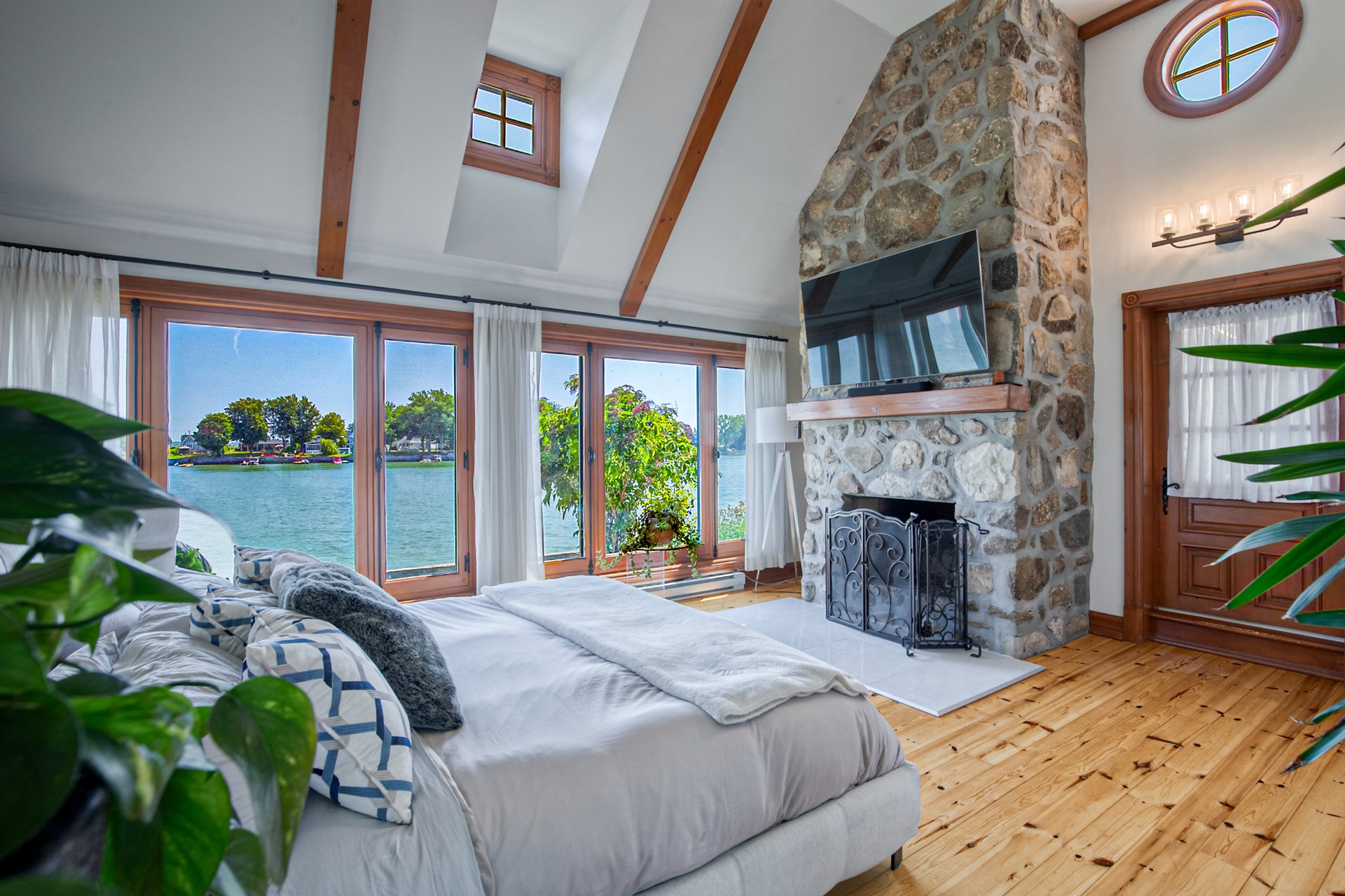 À l'intérieur, la cuisine aux plafonds cathédrale marie matériaux nobles et mur de pierre impressionnant. Une suite au rez-de-chaussée, spectaculaire avec foyer au bois et fenestration abondante, vous offre des levers de soleil inoubliables sur la rivière.