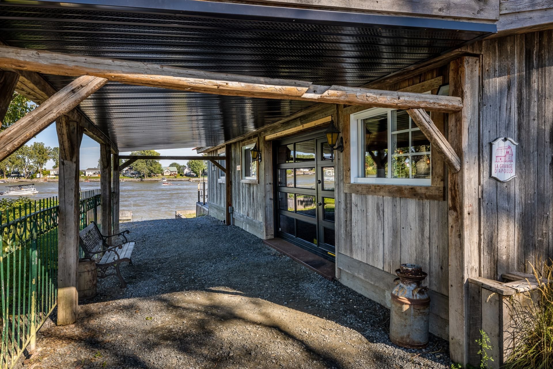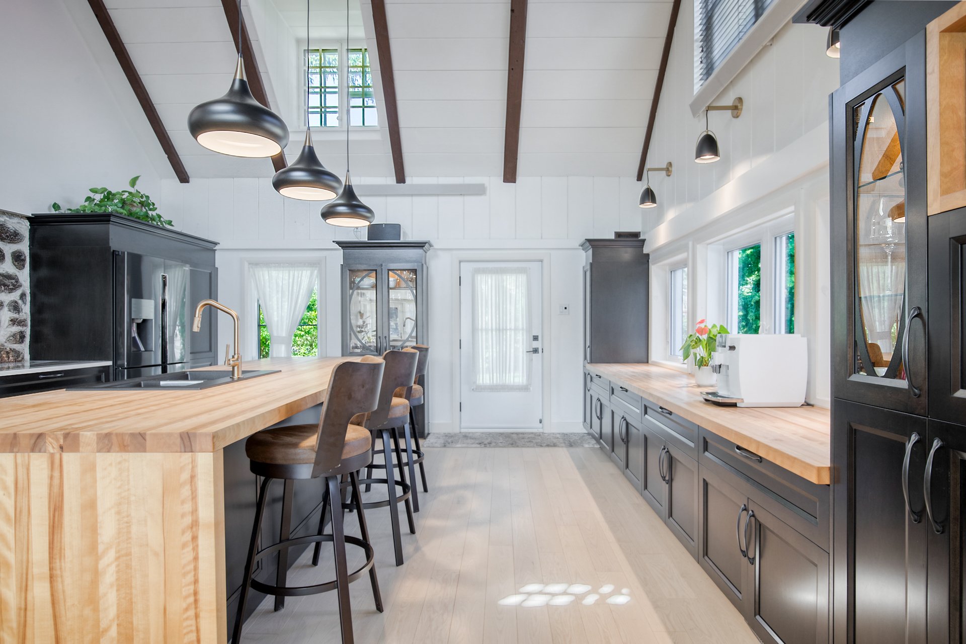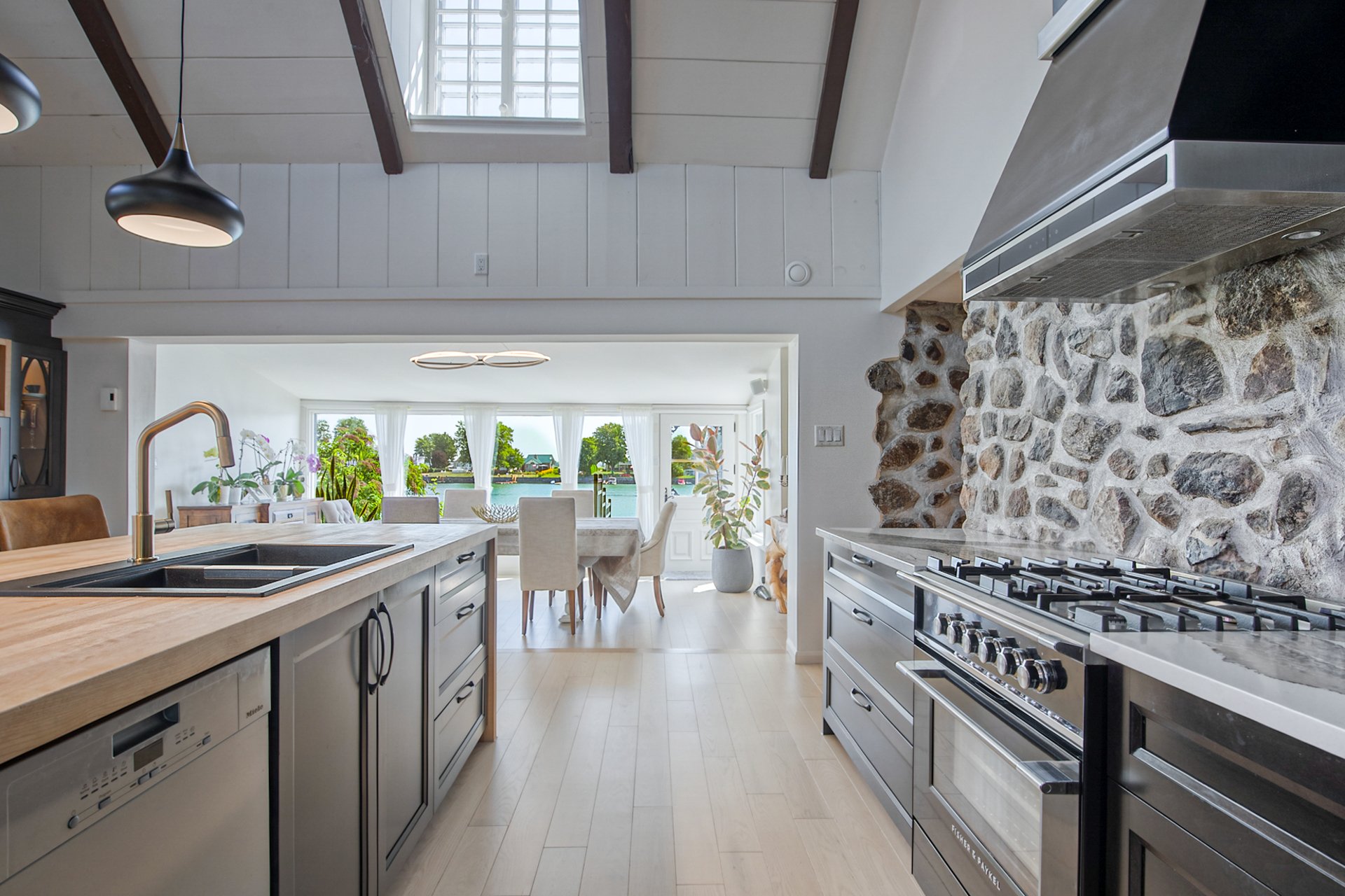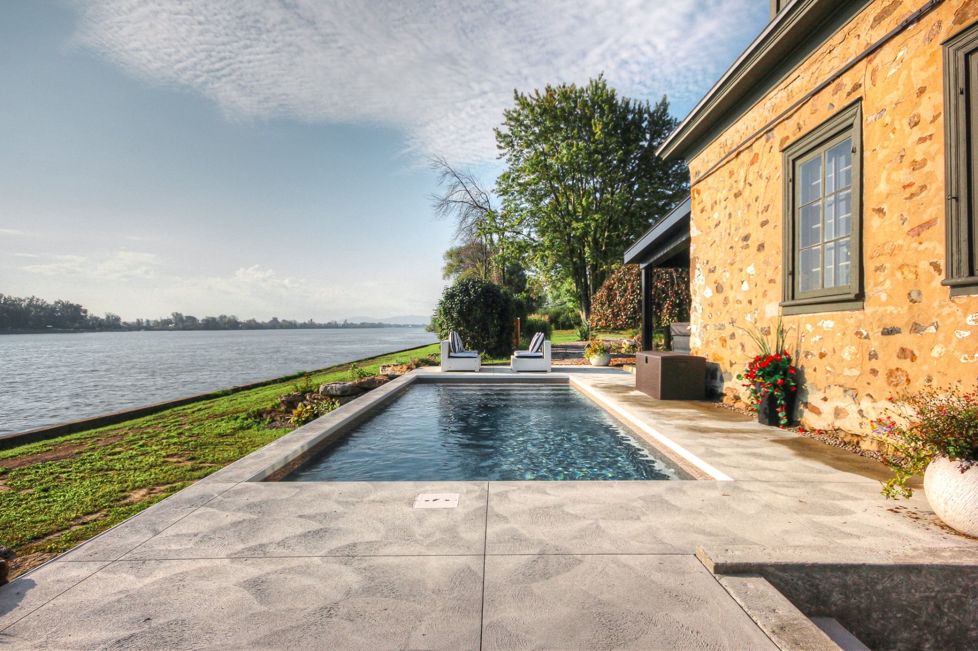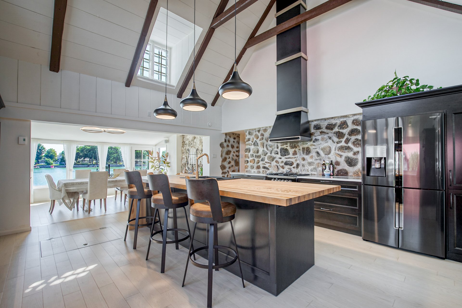À l'intérieur, la cuisine aux plafonds cathédrale marie matériaux nobles et mur de pierre impressionnant. Une suite au rez-de-chaussée, spectaculaire avec foyer au bois et fenestration abondante, vous offre des levers de soleil inoubliables sur la rivière.