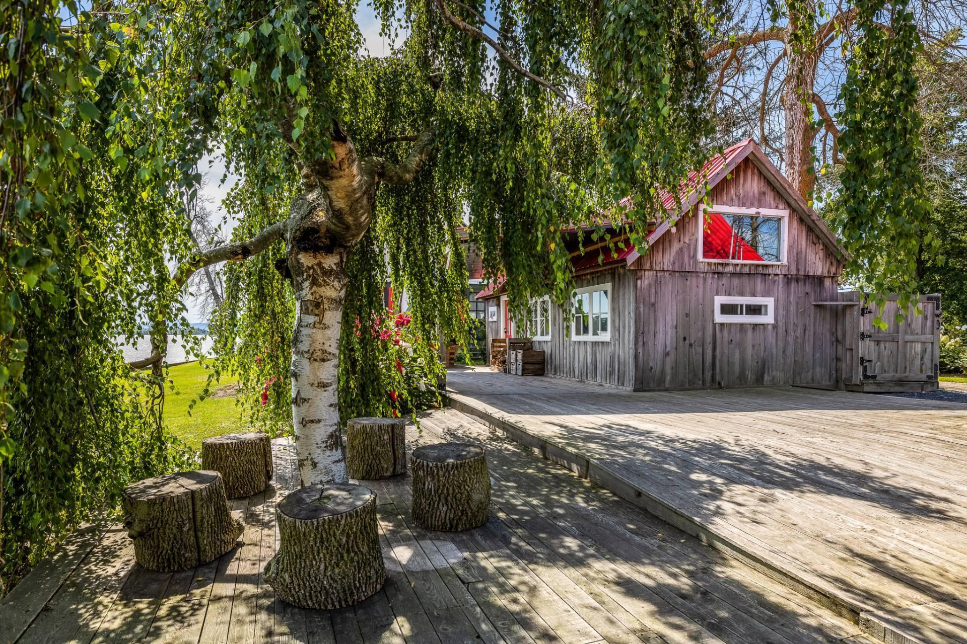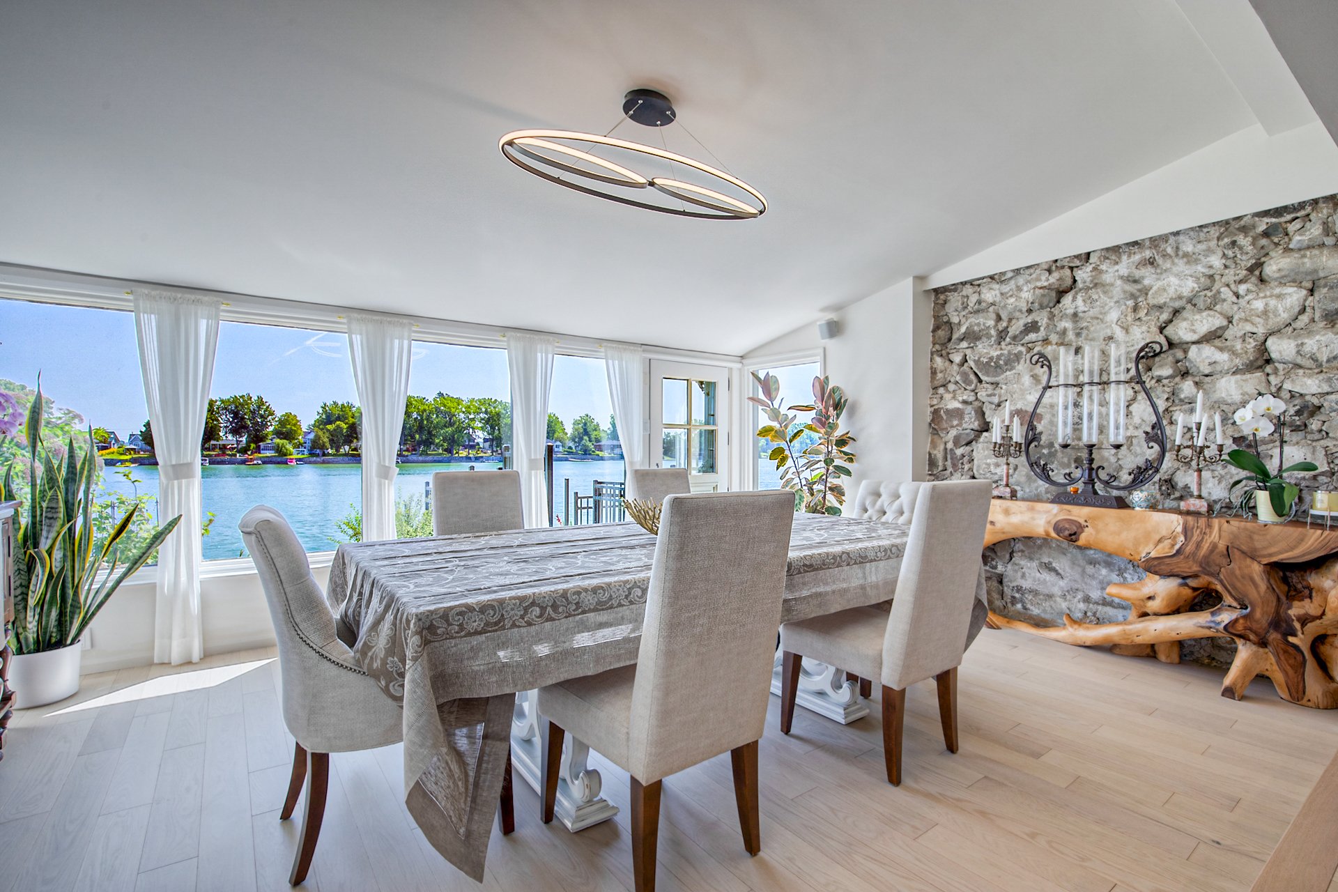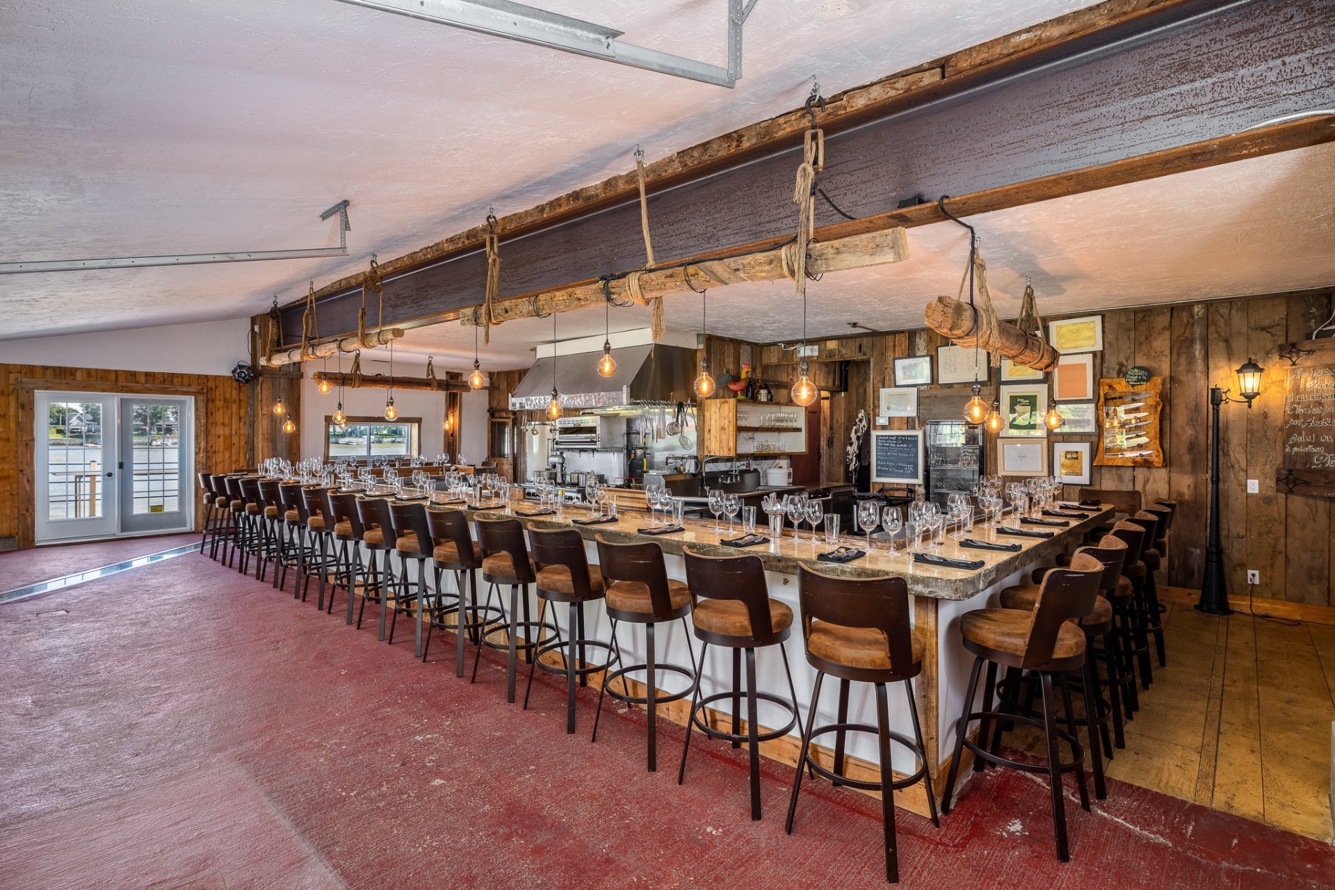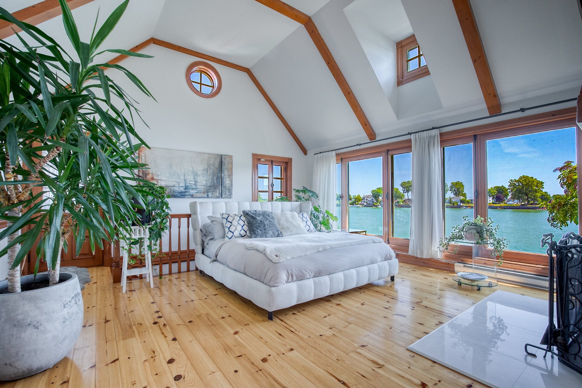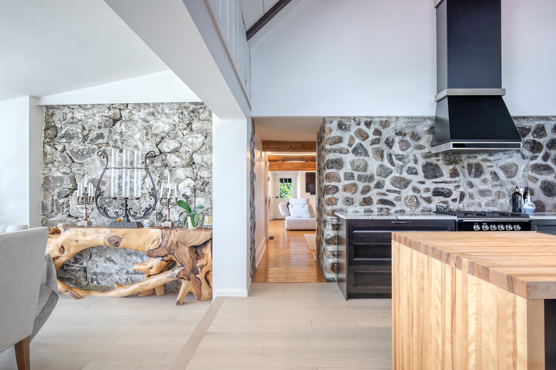 À l'intérieur, la cuisine aux plafonds cathédrale marie matériaux nobles et mur de pierre impressionnant. Une suite au rez-de-chaussée, spectaculaire avec foyer au bois et fenestration abondante, vous offre des levers de soleil inoubliables sur la rivière.