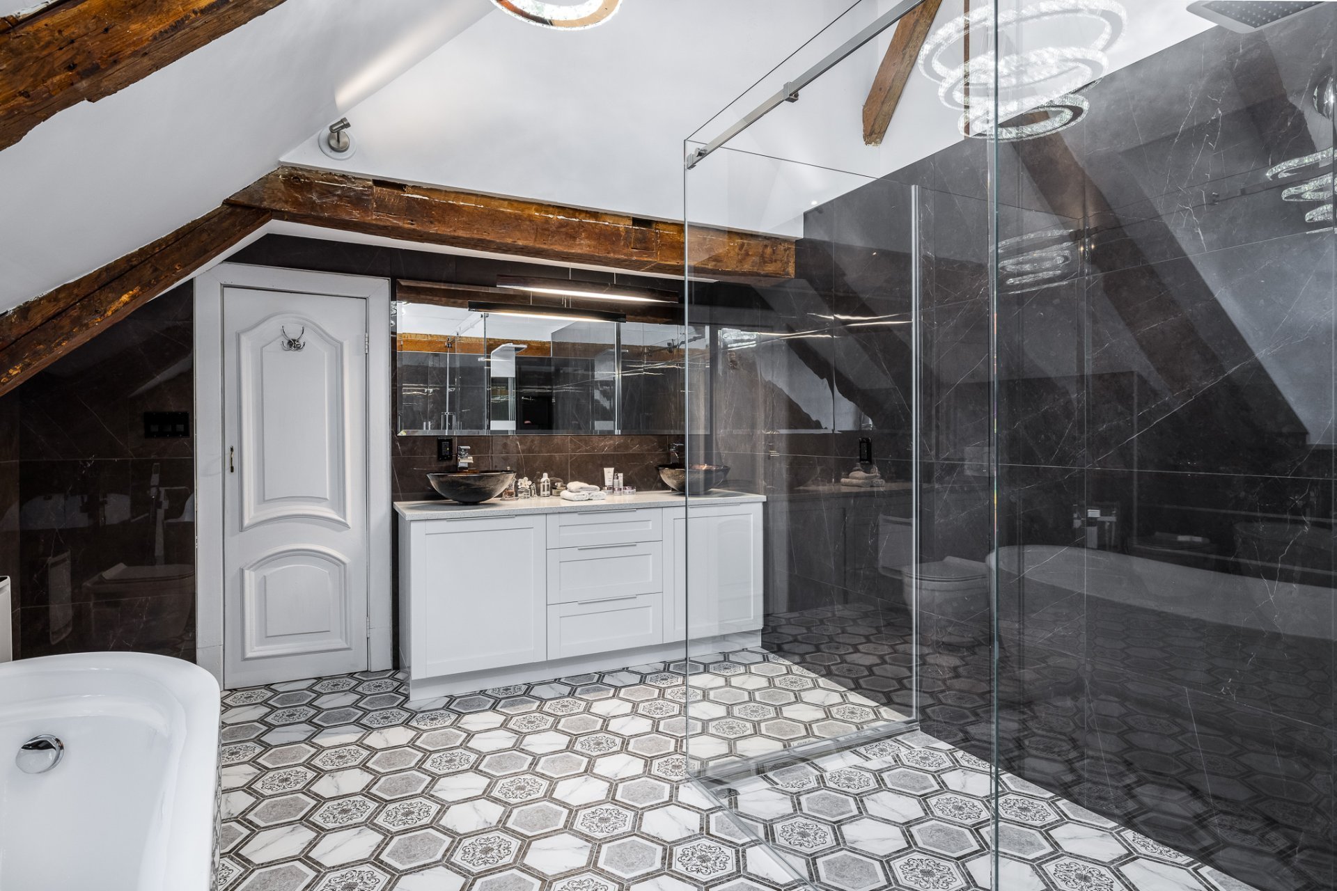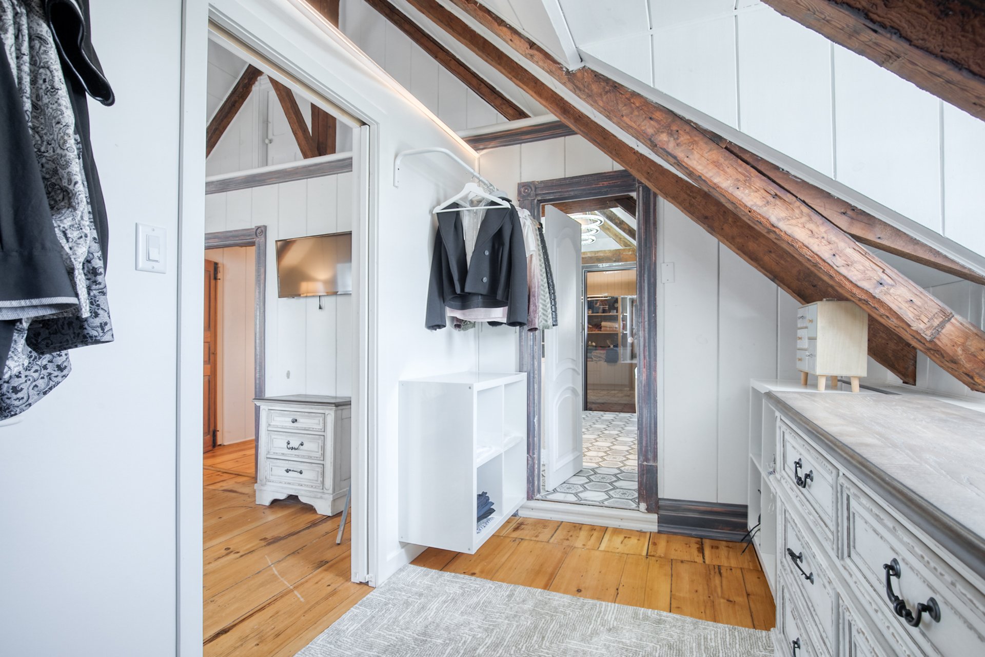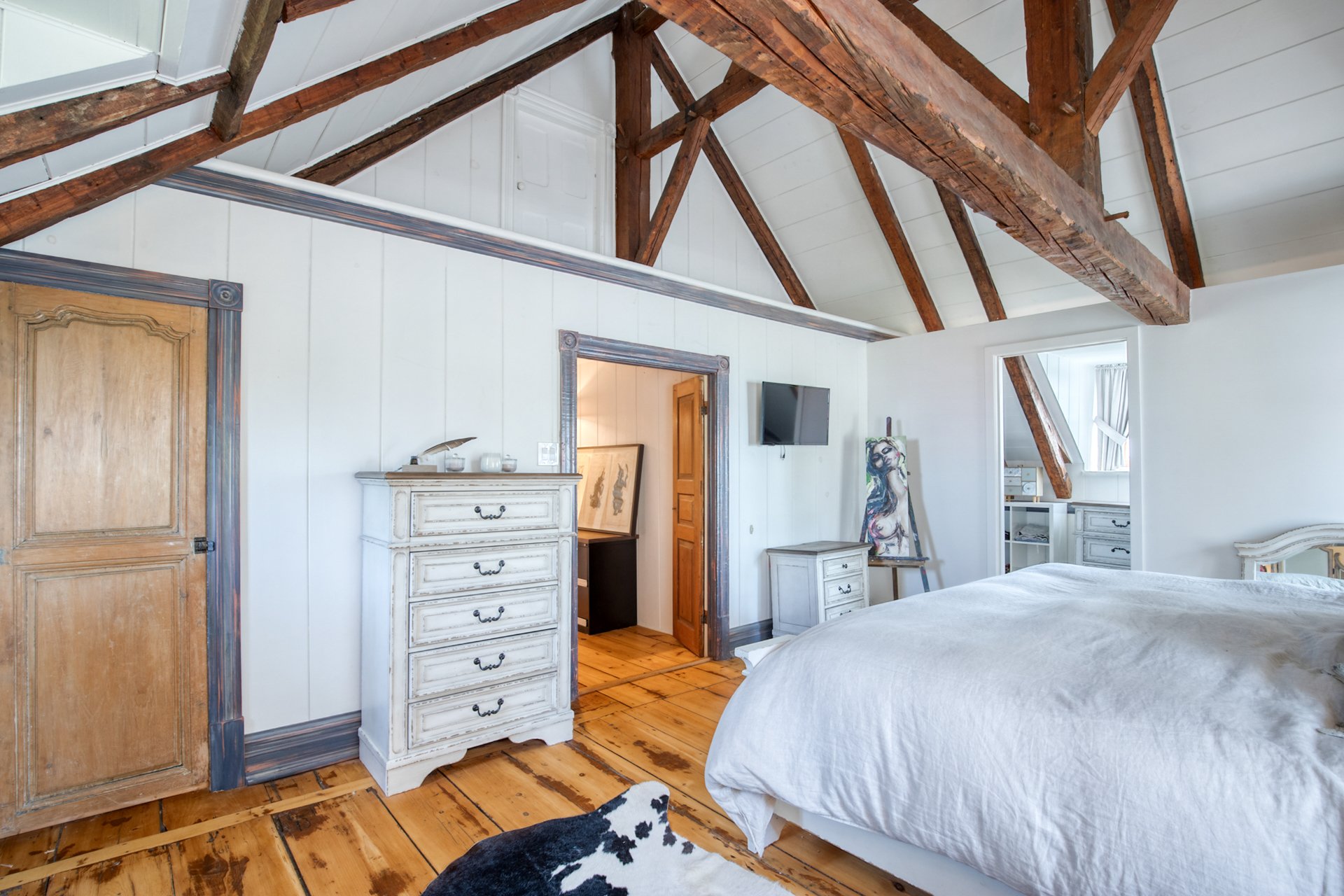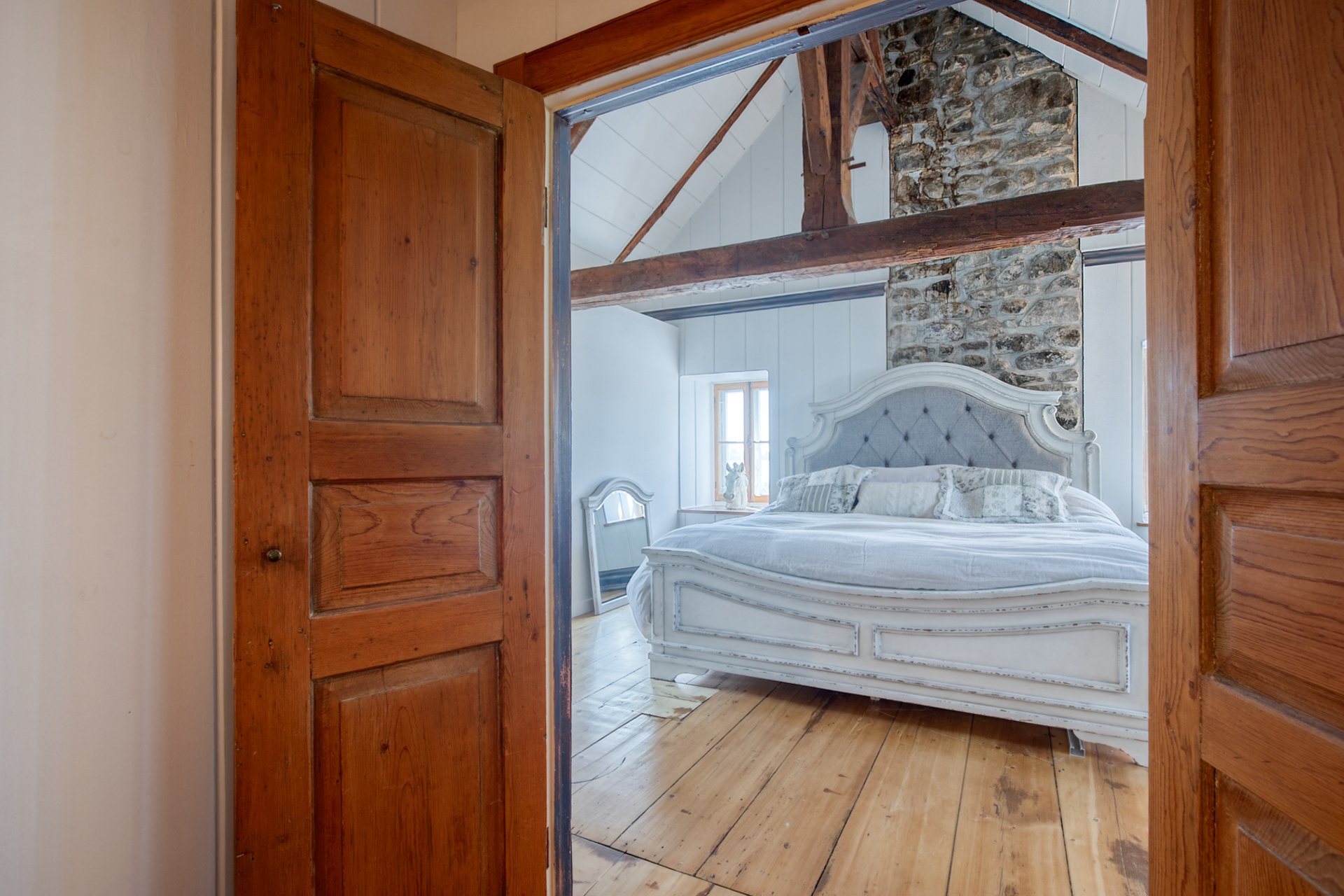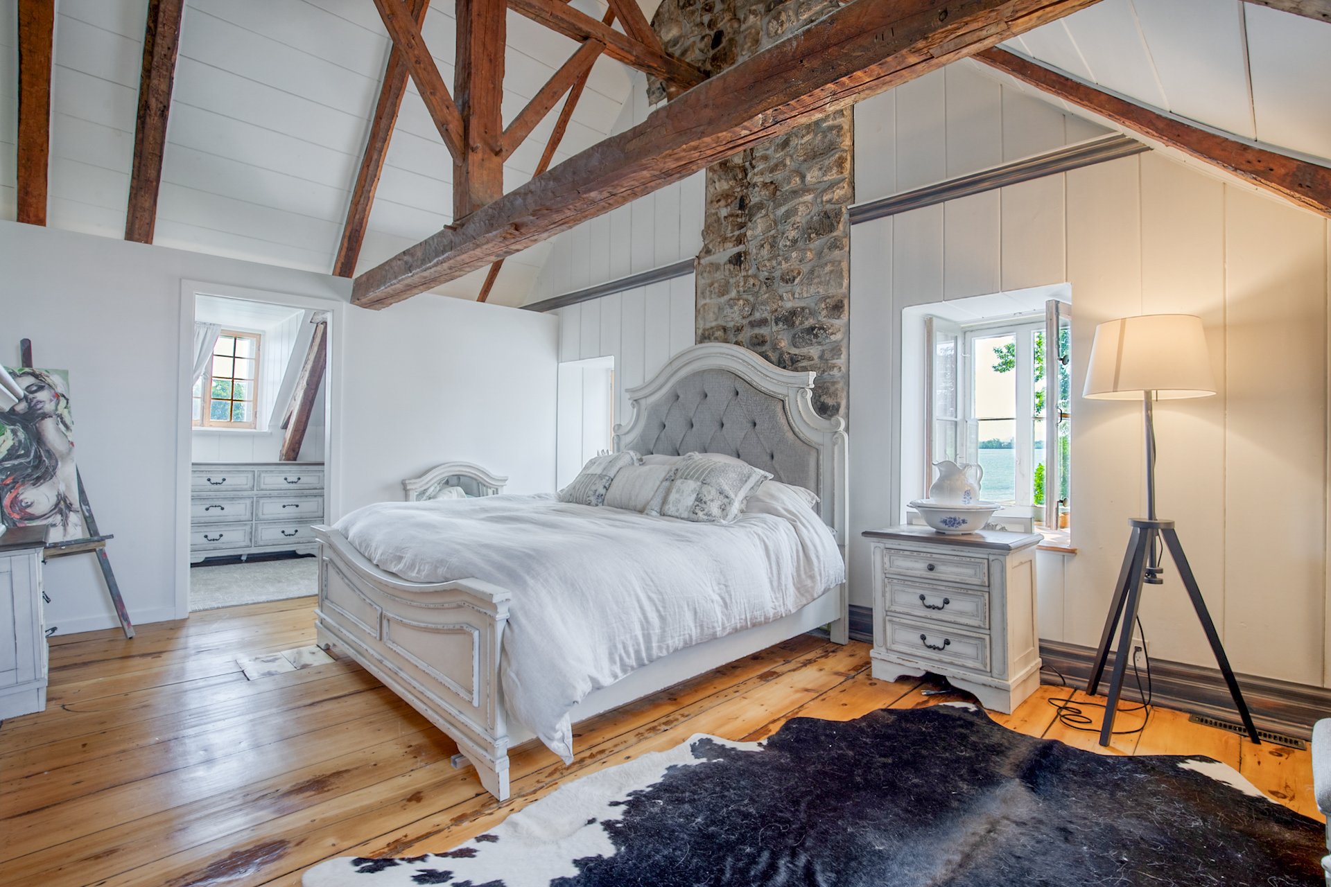 À l'étage, la suite des maîtres séduit avec ses poutres originales, planchers d'époque et salle de bain attenante au design éclectique : douche vitrée, baignoire autoportante et finitions contemporaines.
