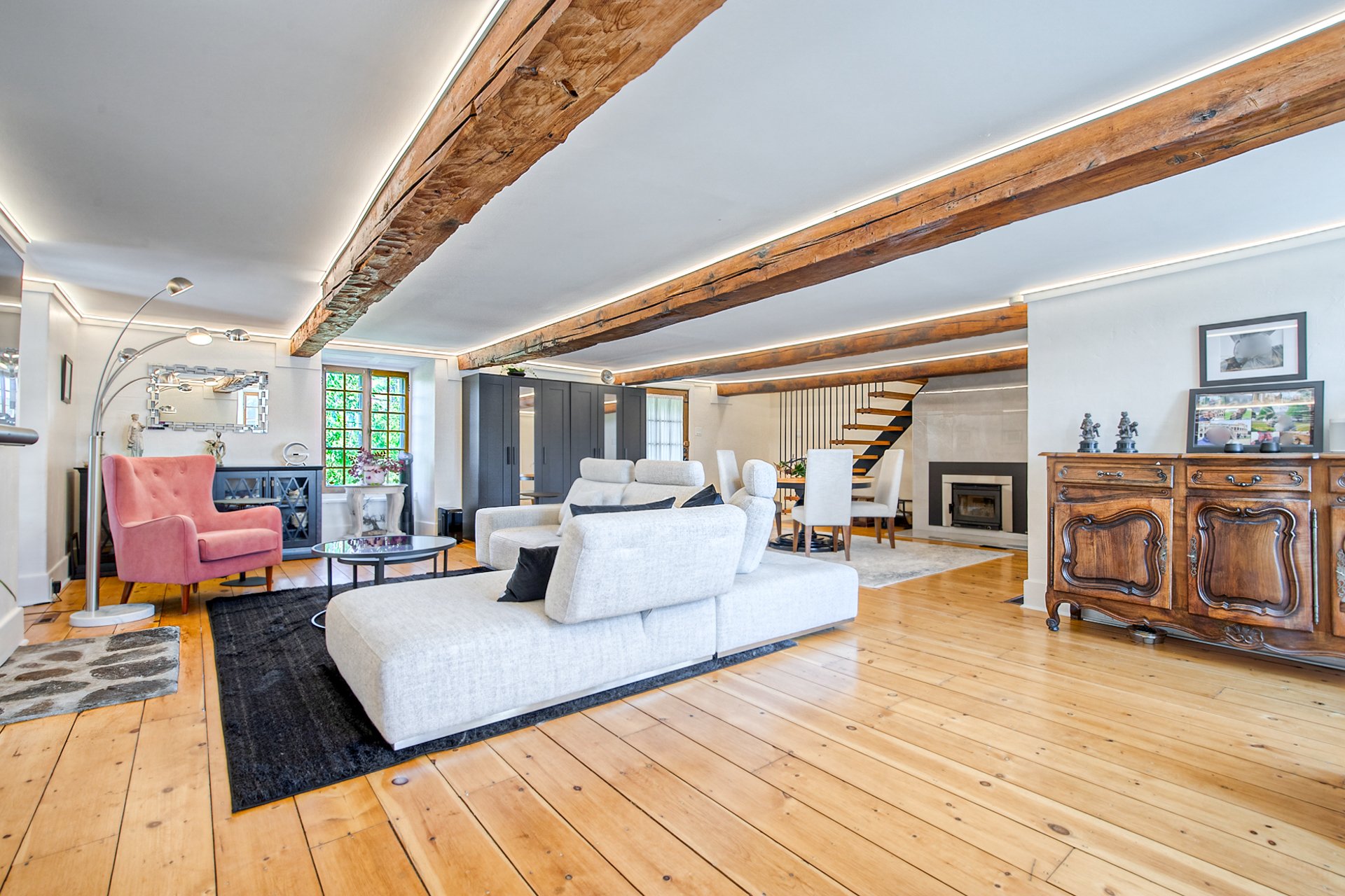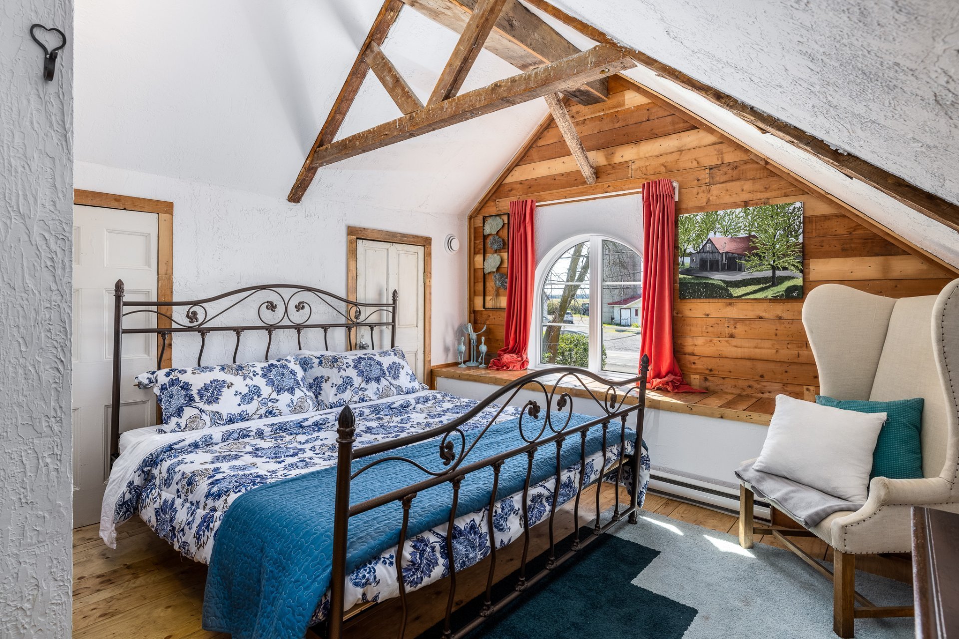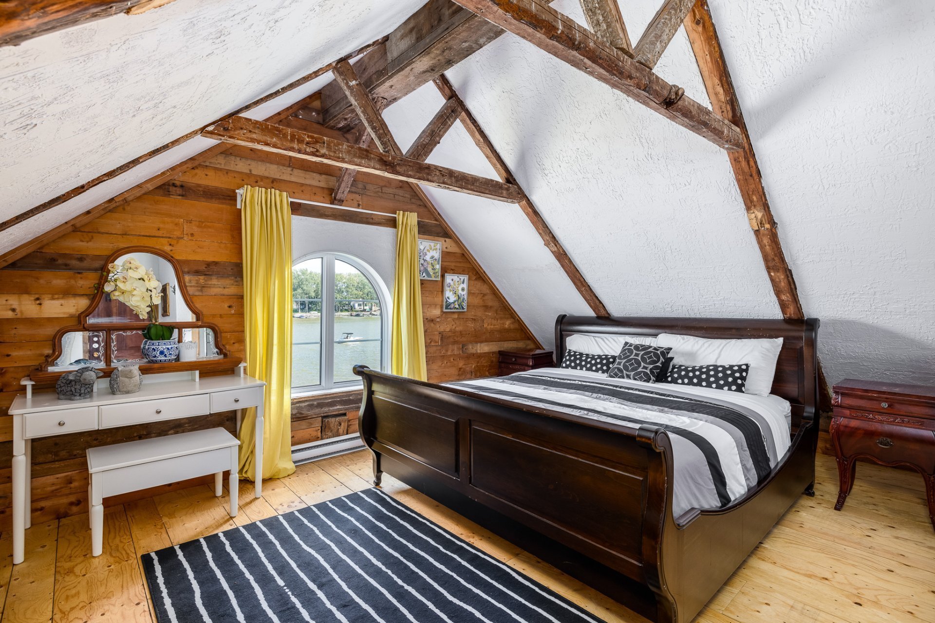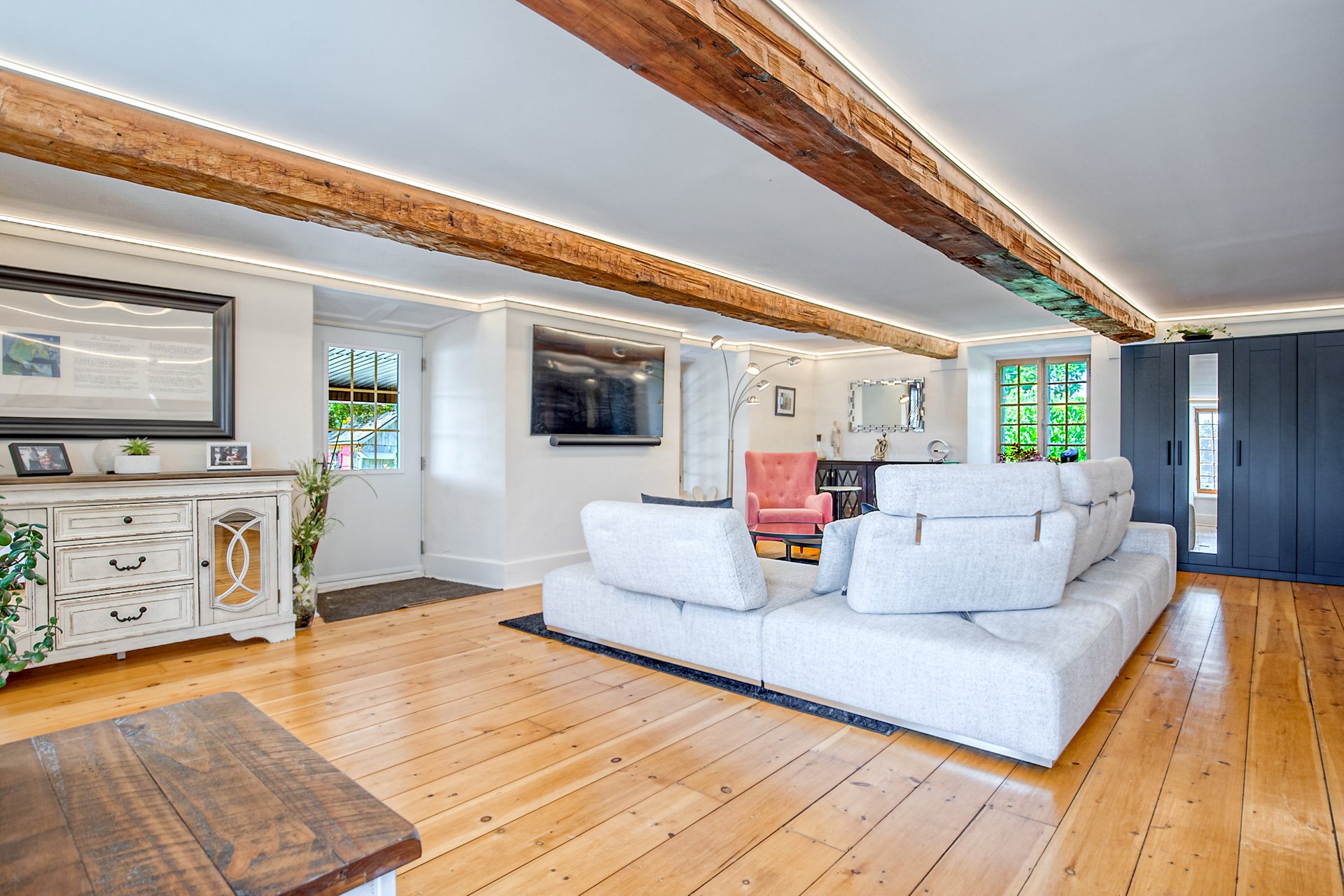 À l'étage, la suite des maîtres séduit avec ses poutres originales, planchers d'époque et salle de bain attenante au design éclectique : douche vitrée, baignoire autoportante et finitions contemporaines.
