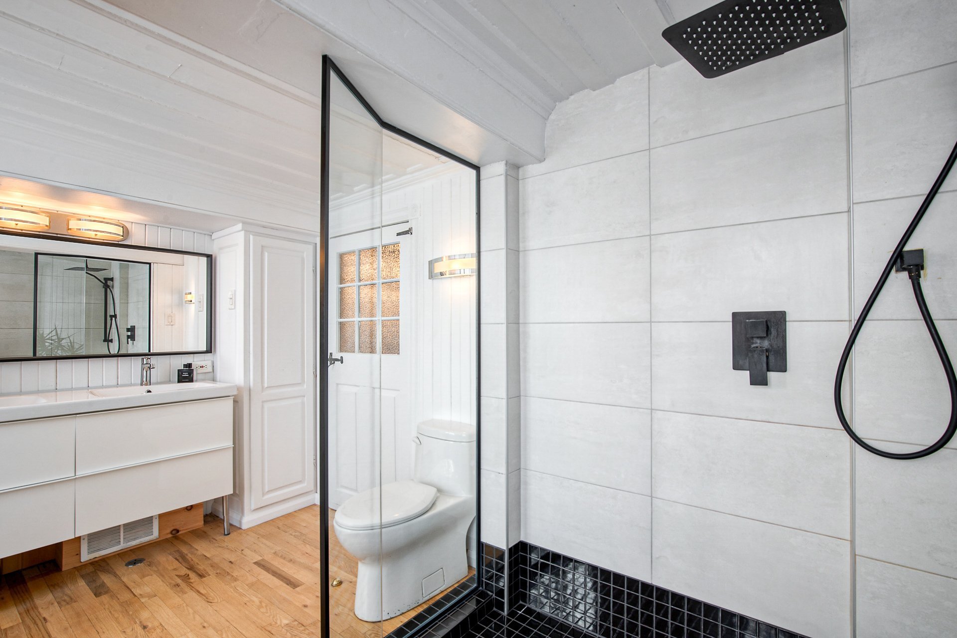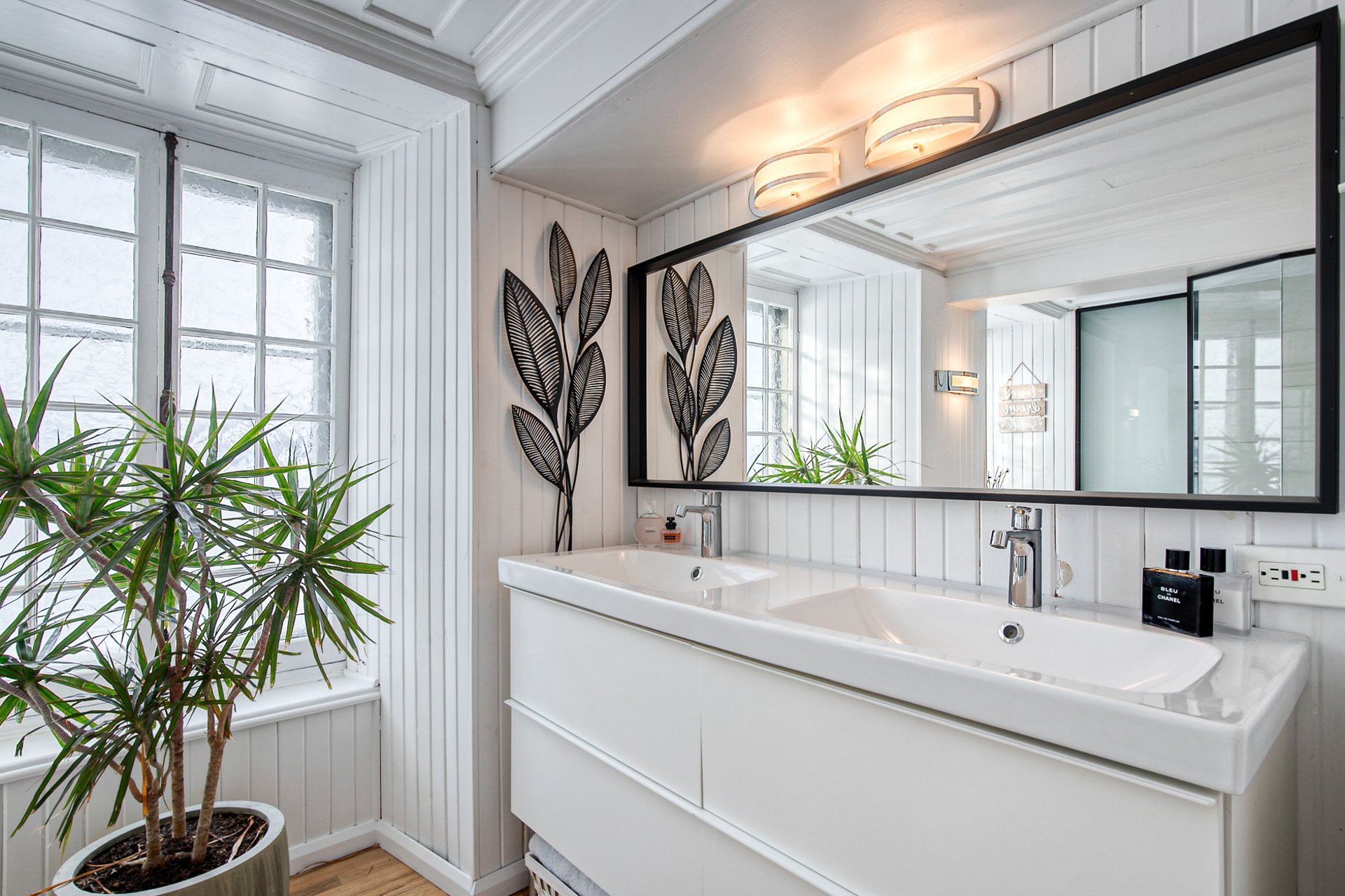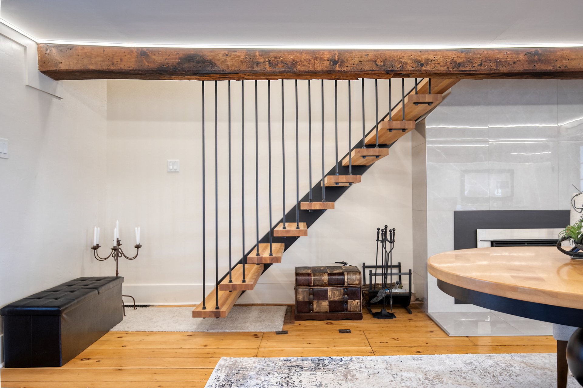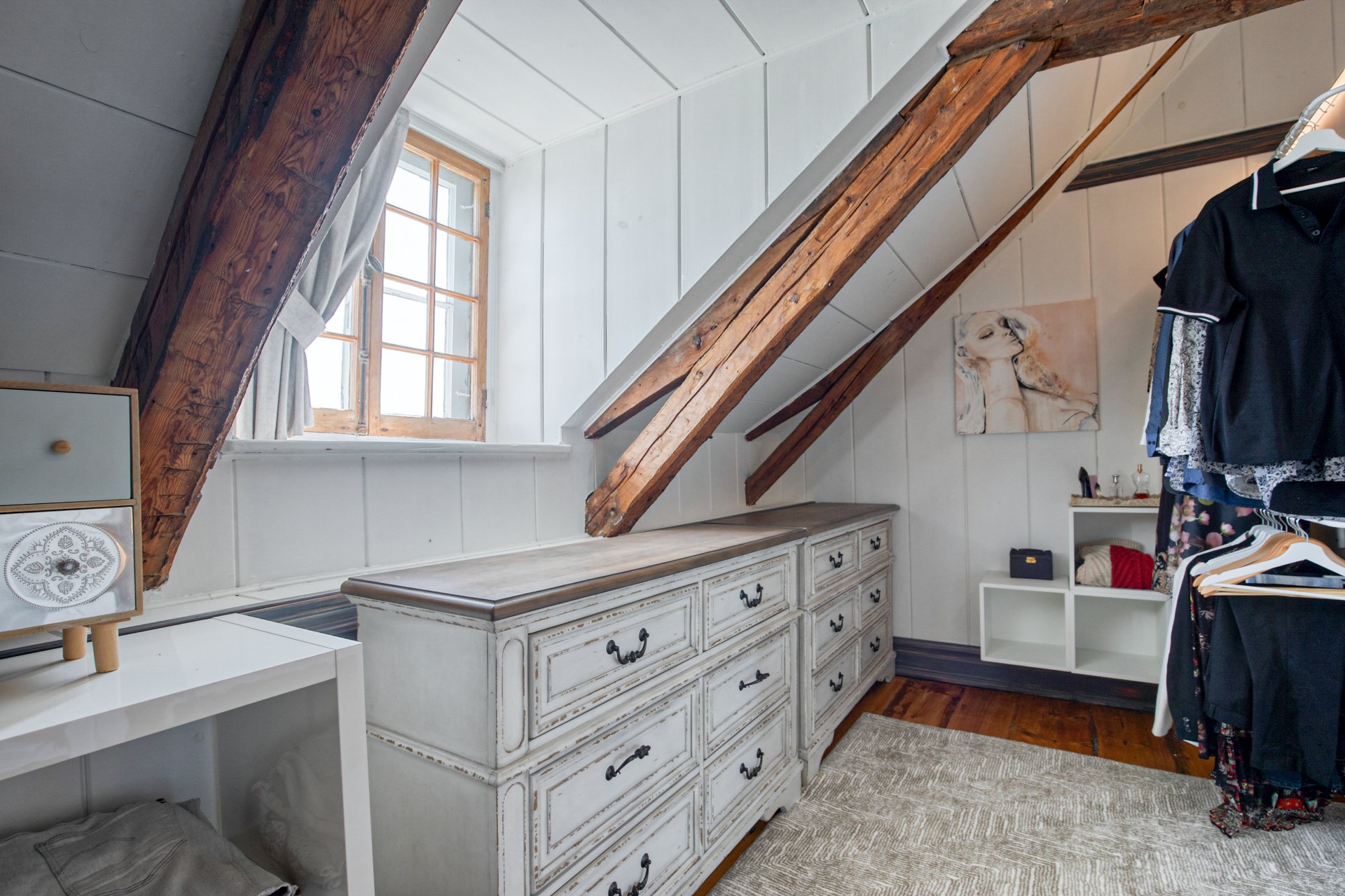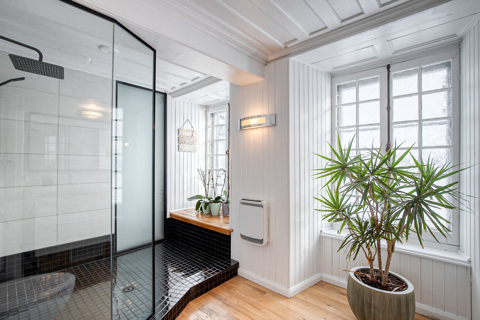 À l'étage, la suite des maîtres séduit avec ses poutres originales, planchers d'époque et salle de bain attenante au design éclectique : douche vitrée, baignoire autoportante et finitions contemporaines.