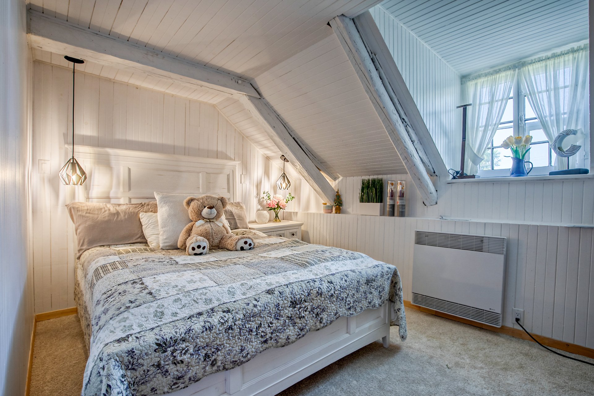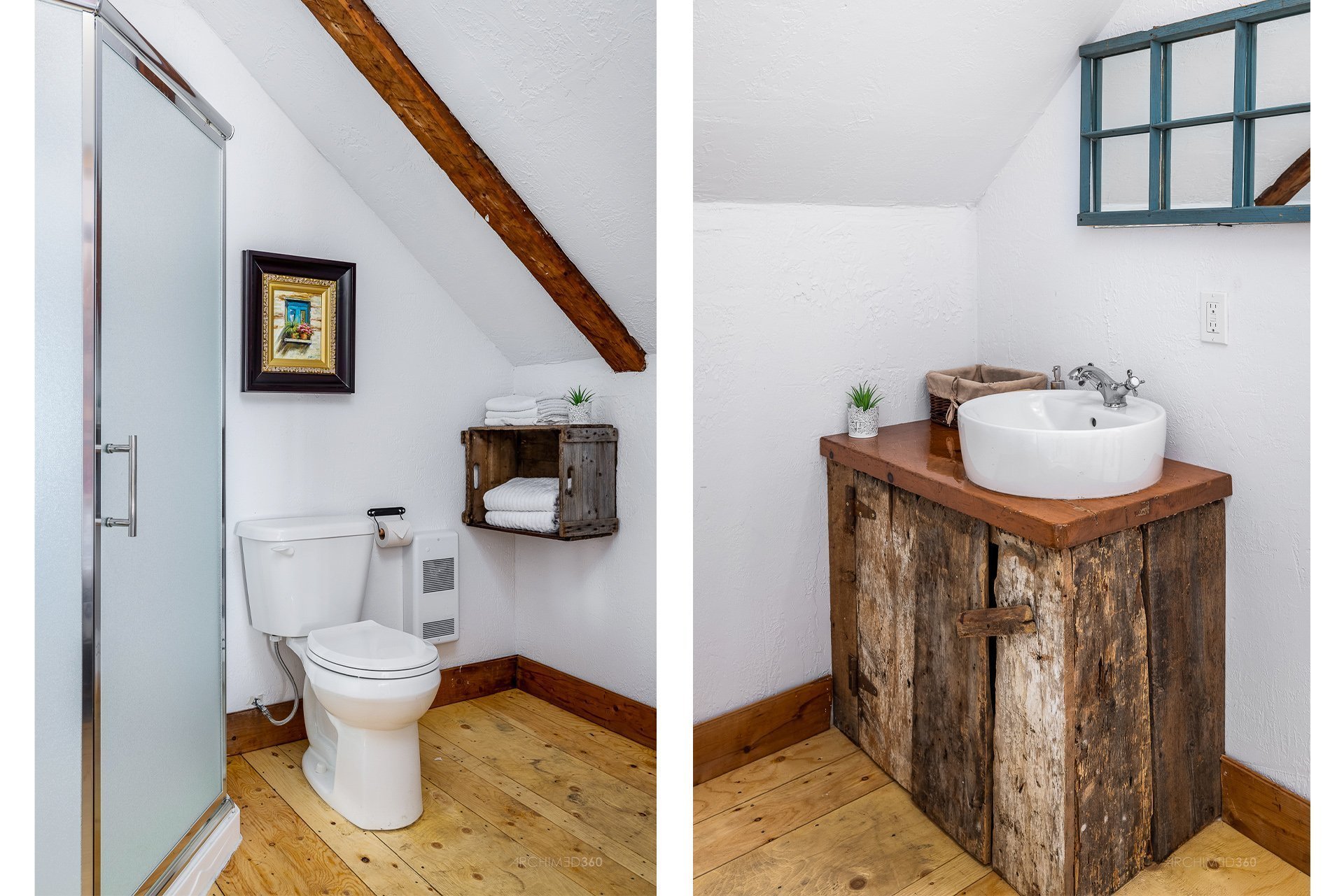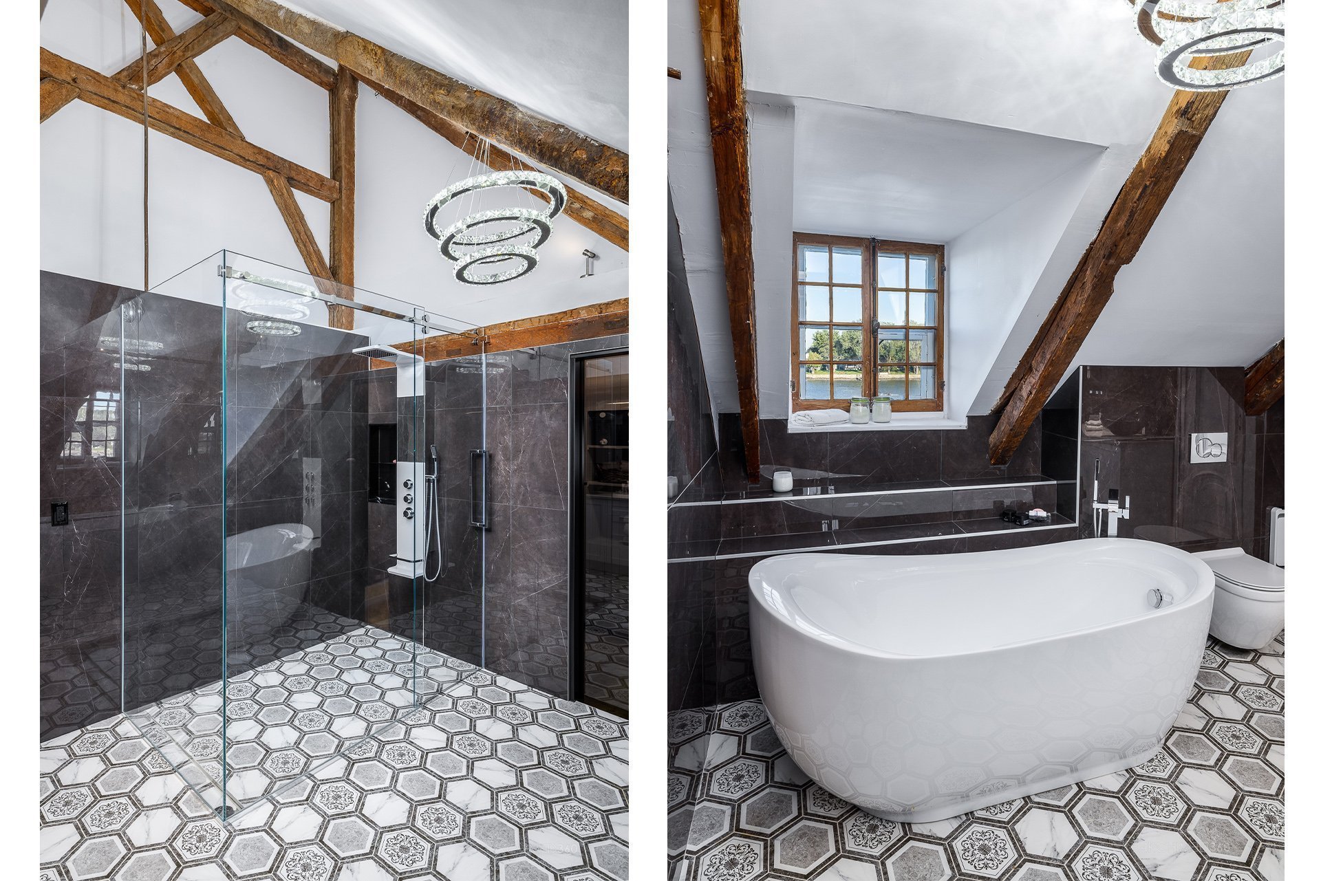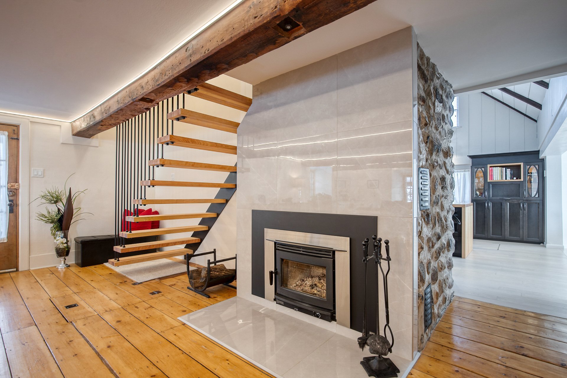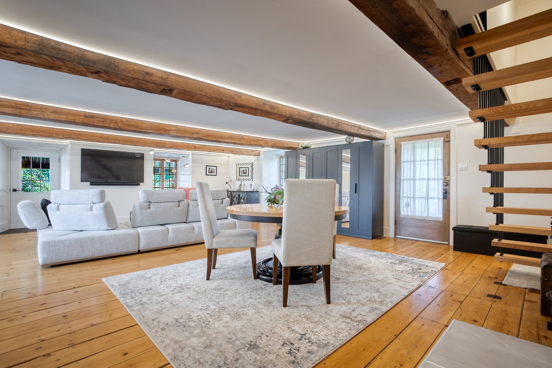 À l'étage, la suite des maîtres séduit avec ses poutres originales, planchers d'époque et salle de bain attenante au design éclectique : douche vitrée, baignoire autoportante et finitions contemporaines.
