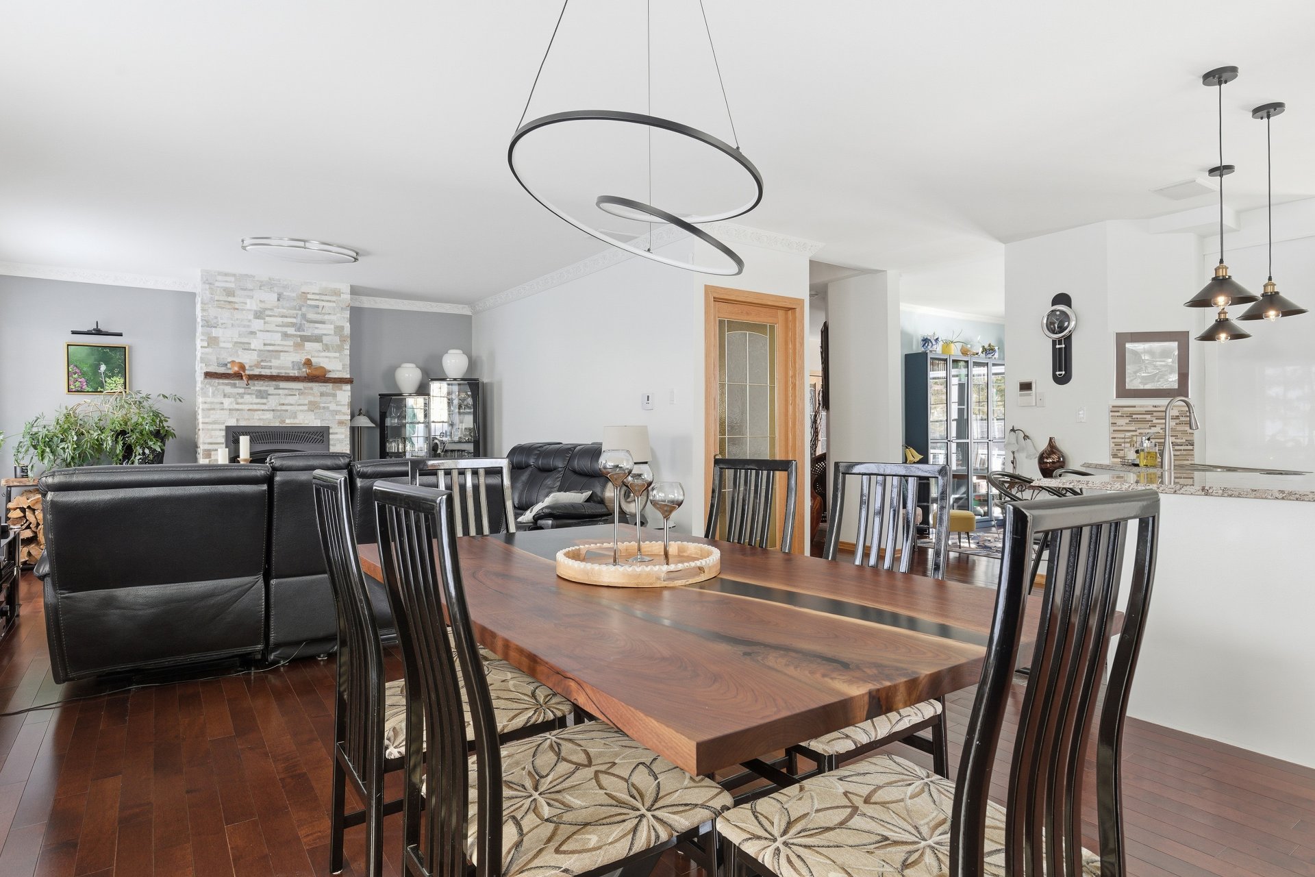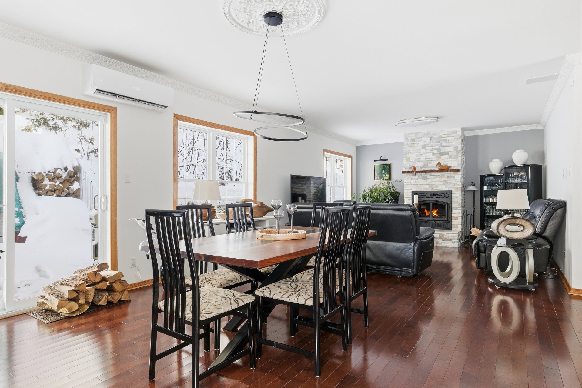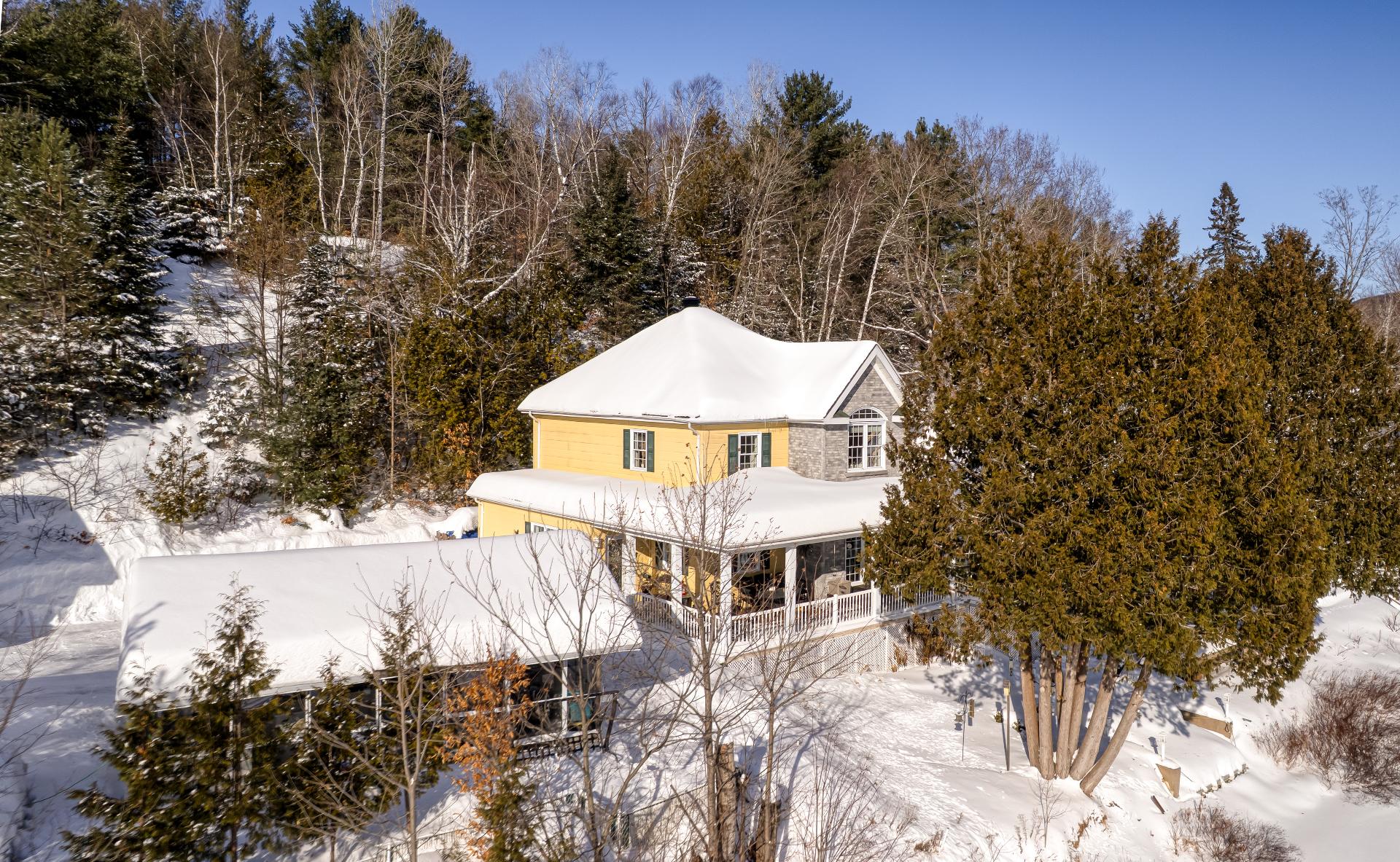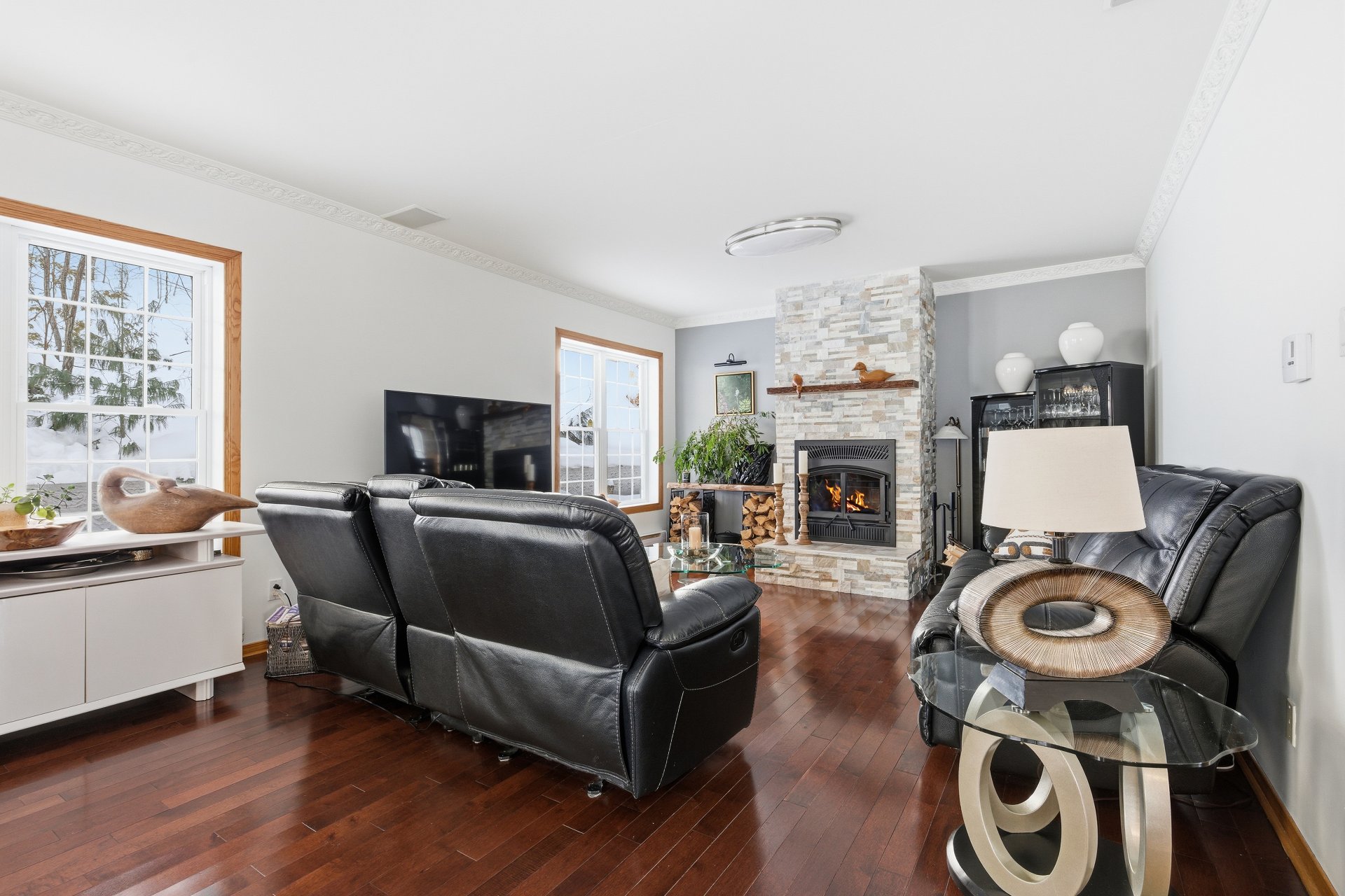 La fenestration abondante baigne les espaces de vie d'une lumière naturelle généreuse et met en valeur les vues sur la nature, créant une atmosphère à la fois chaleureuse et apaisante. Le salon est agrémenté d'un foyer au bois, ajoutant caractère, confort et ambiance aux soirées en toute saison.