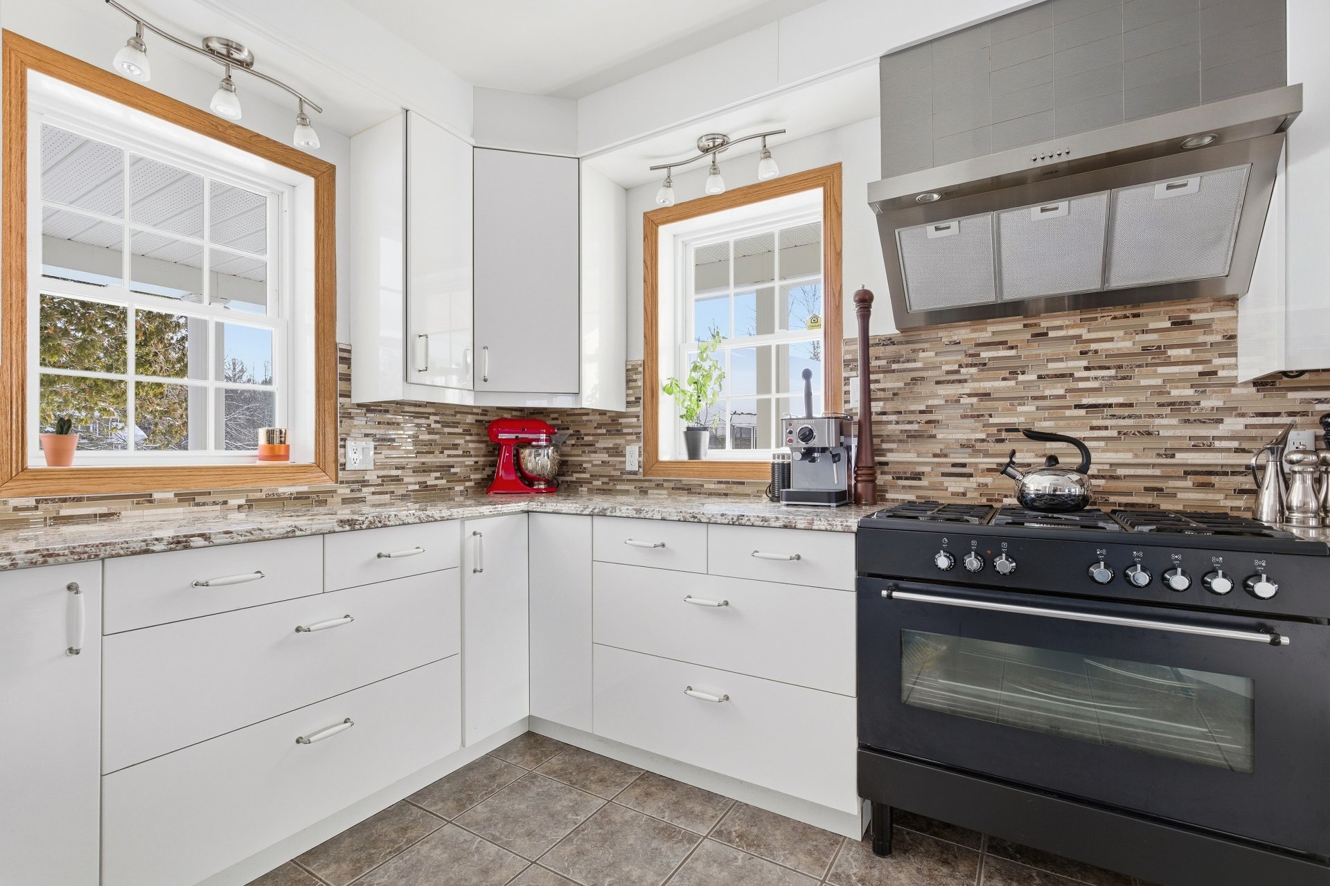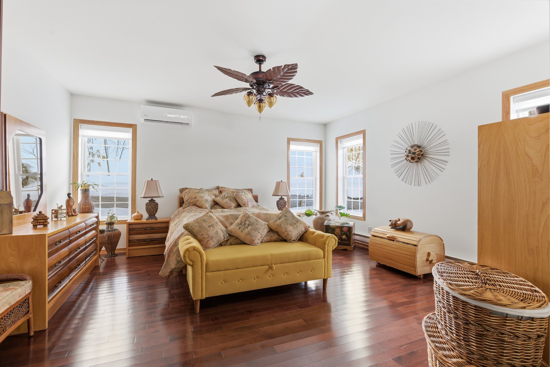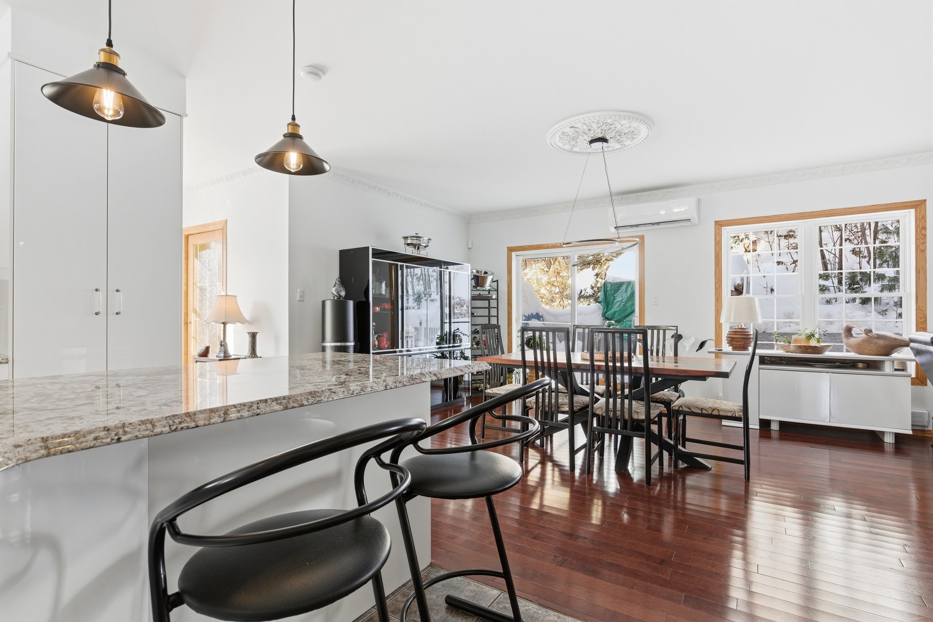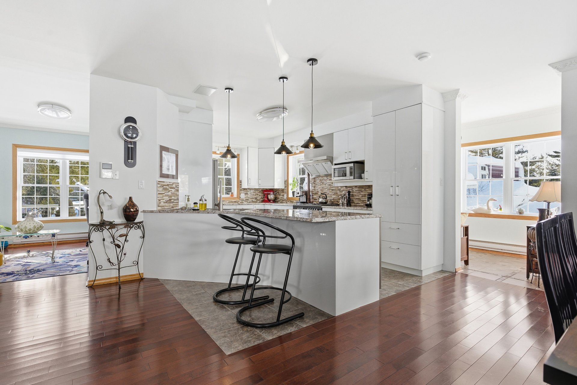 La fenestration abondante baigne les espaces de vie d'une lumière naturelle généreuse et met en valeur les vues sur la nature, créant une atmosphère à la fois chaleureuse et apaisante. Le salon est agrémenté d'un foyer au bois, ajoutant caractère, confort et ambiance aux soirées en toute saison.