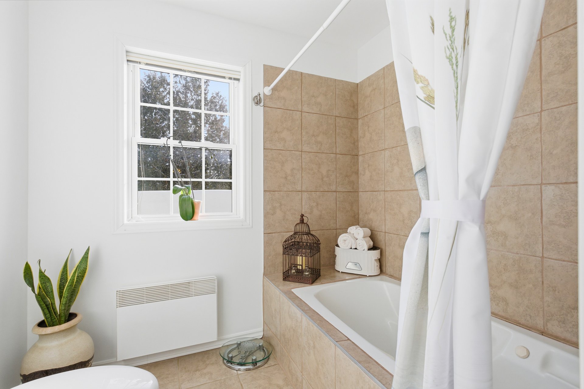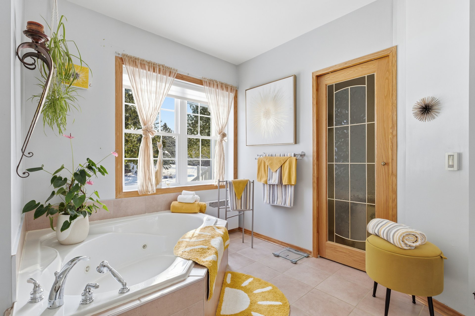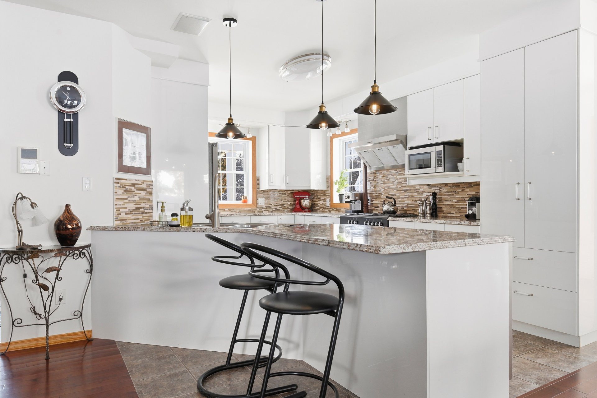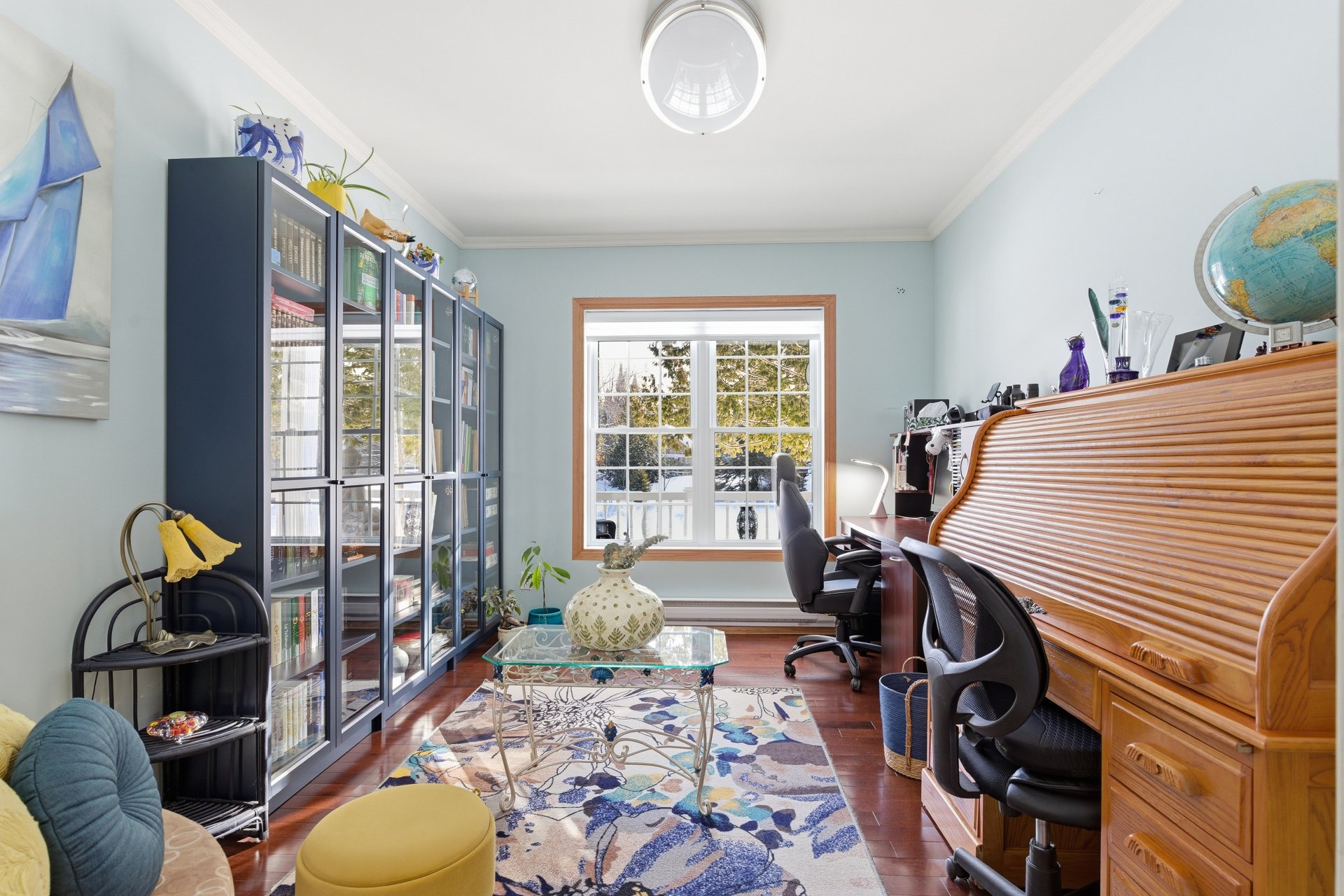La fenestration abondante baigne les espaces de vie d'une lumière naturelle généreuse et met en valeur les vues sur la nature, créant une atmosphère à la fois chaleureuse et apaisante. Le salon est agrémenté d'un foyer au bois, ajoutant caractère, confort et ambiance aux soirées en toute saison.