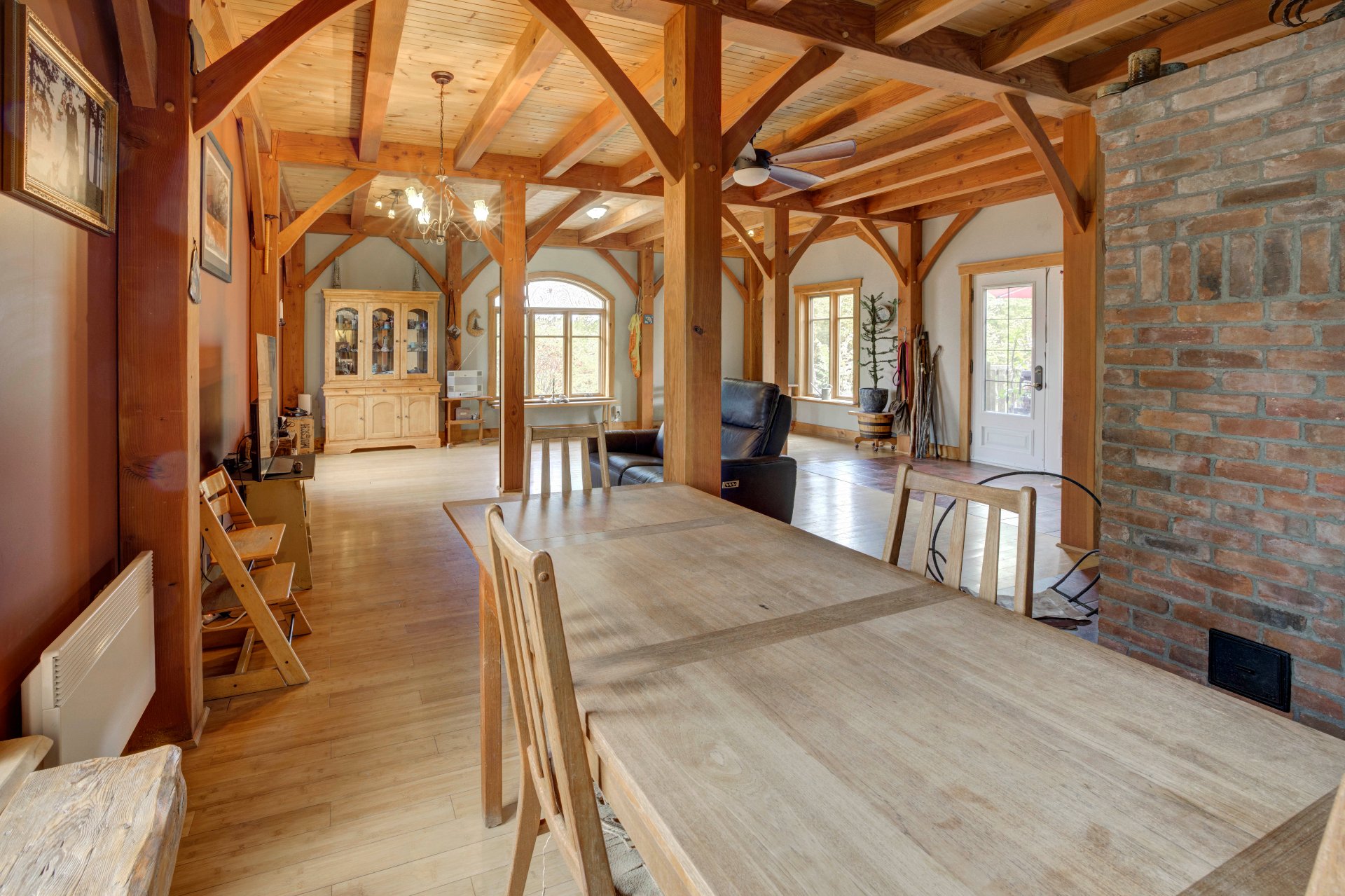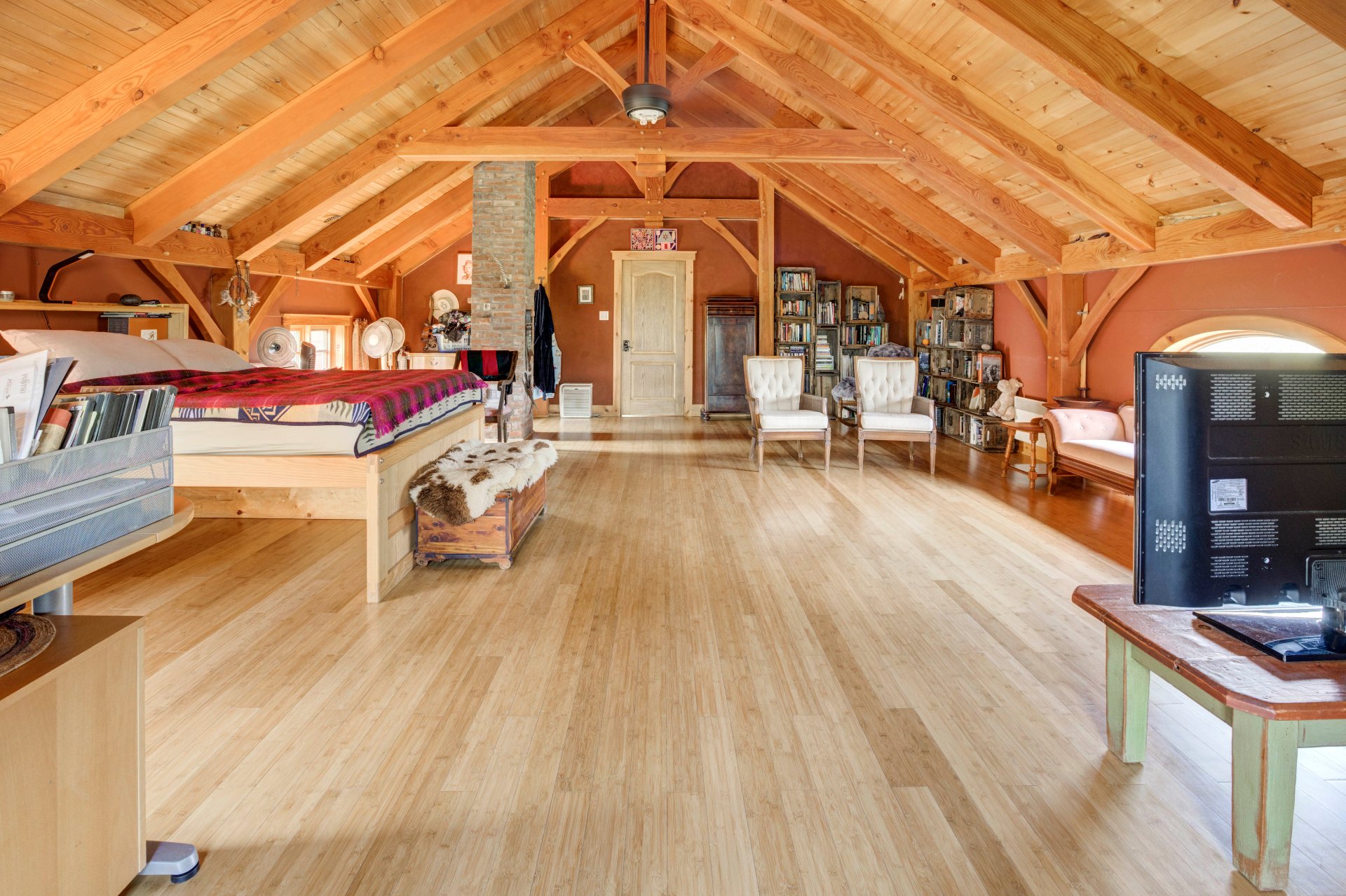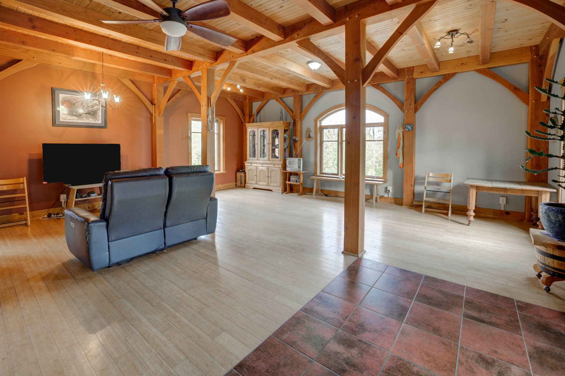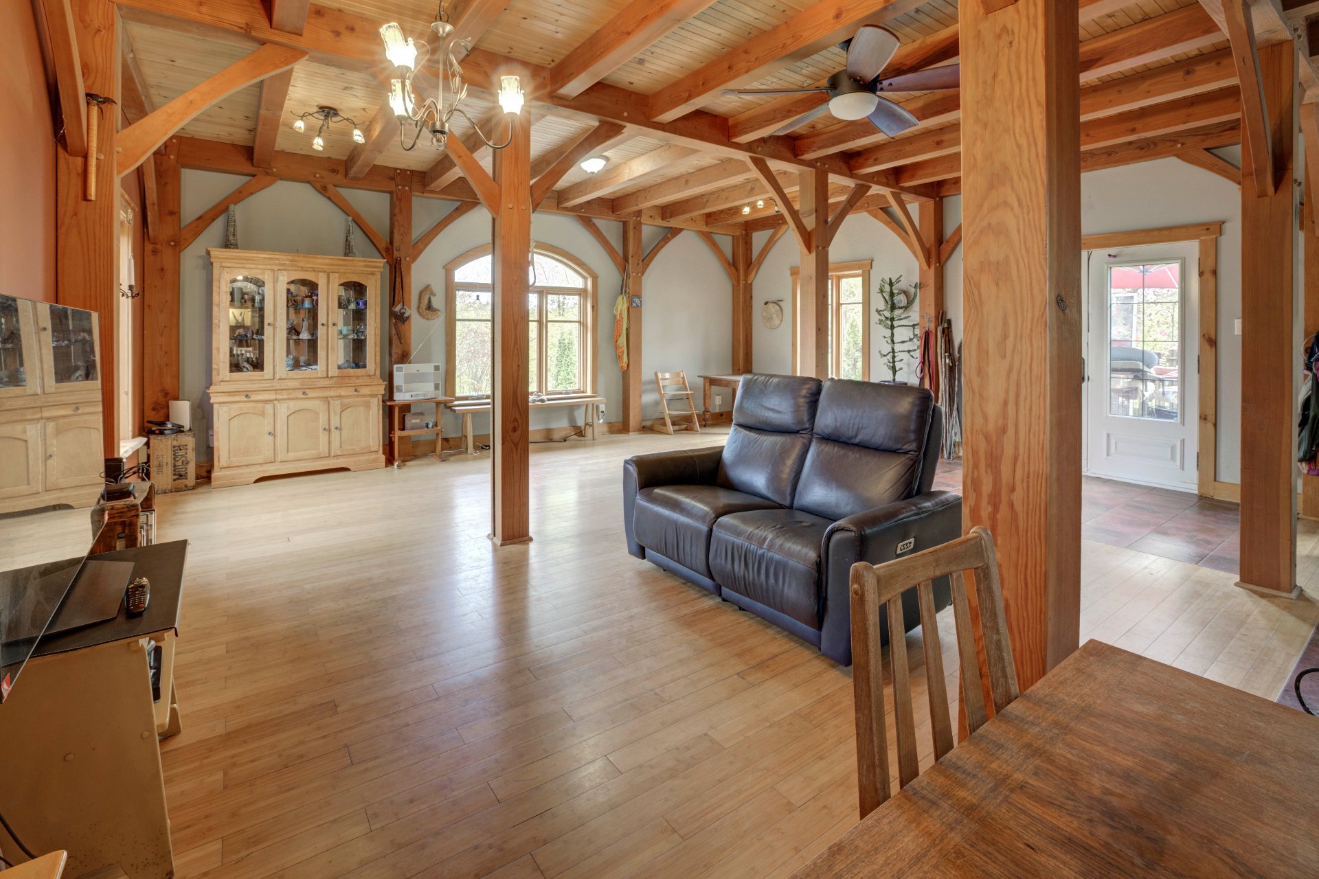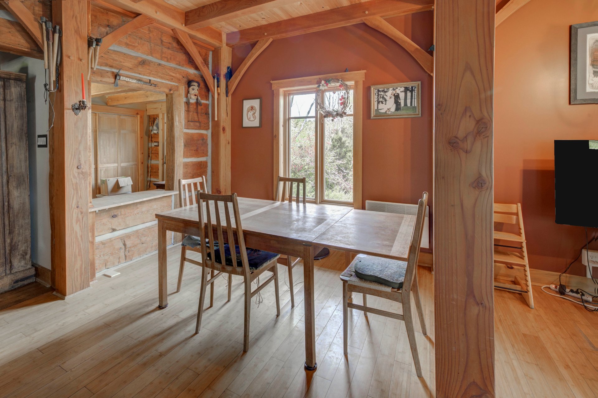 Domaine exceptionnel de 145 acres avec maison en retrait de la route pour une tranquilité absolue. La maison originale a été surélevée et a été intégrée à une nouvelle construction de type "timber frame". Poutres apparentes, plafonds cathédrale, escaliers en érable piqué massif, boiseries, foyer de masse en brique et espace de vie à aire ouverte sont tous des éléments qui donnent une ambiance chaleureuse à cette spacieuse propriété. L'immense chambre des maîtres offre de multiples possibilités d'aménagement en plus d'un accès à son propre petit balcon. Érigée à flanc de colline, le sous-sol bénéficie d'un accès au niveau du sol.