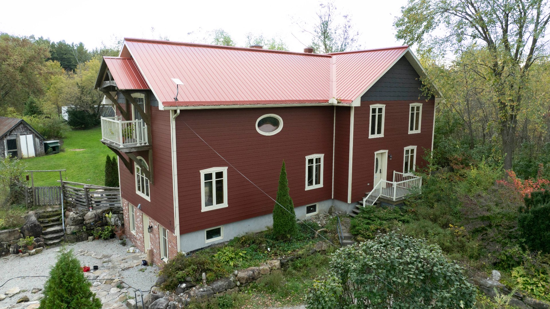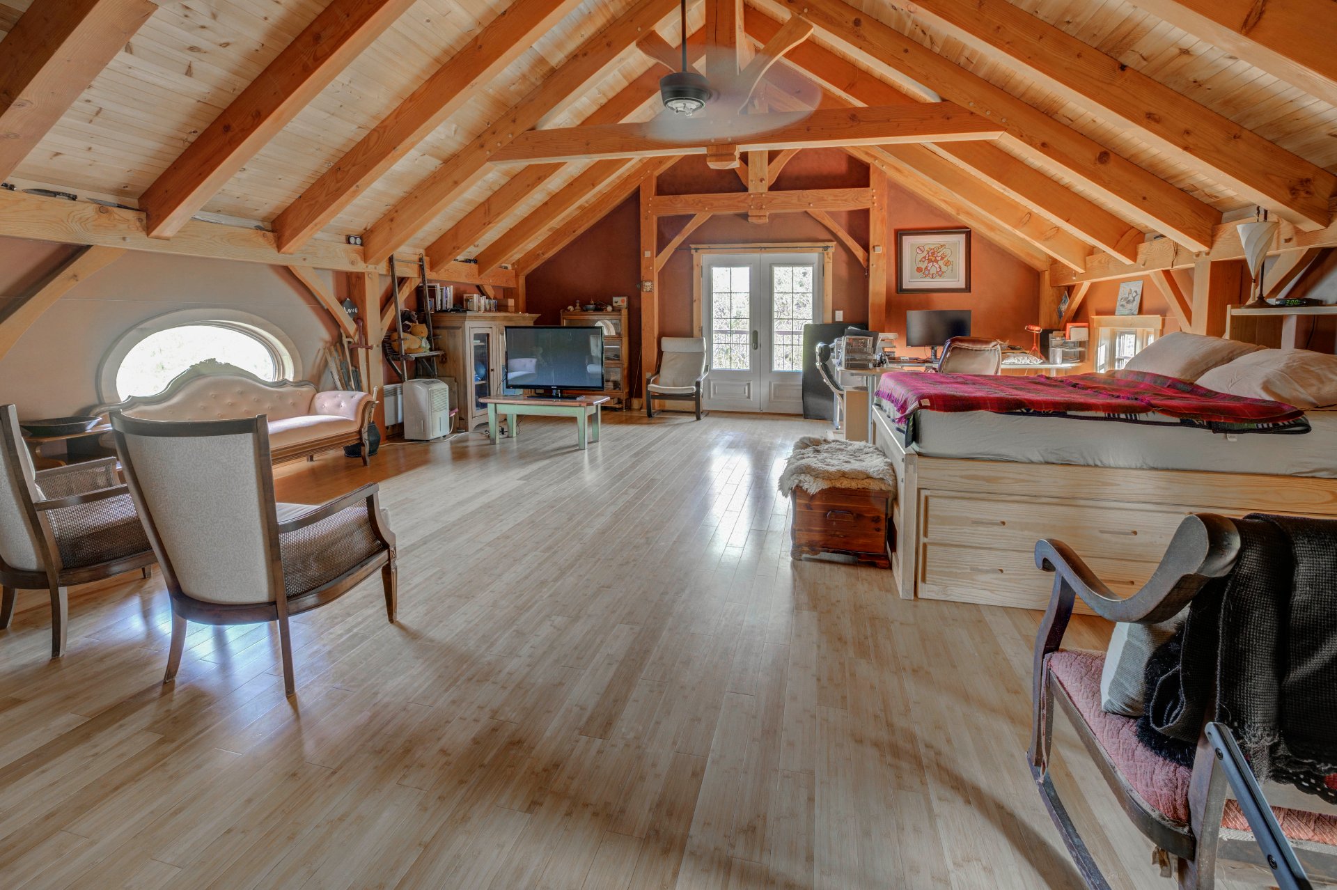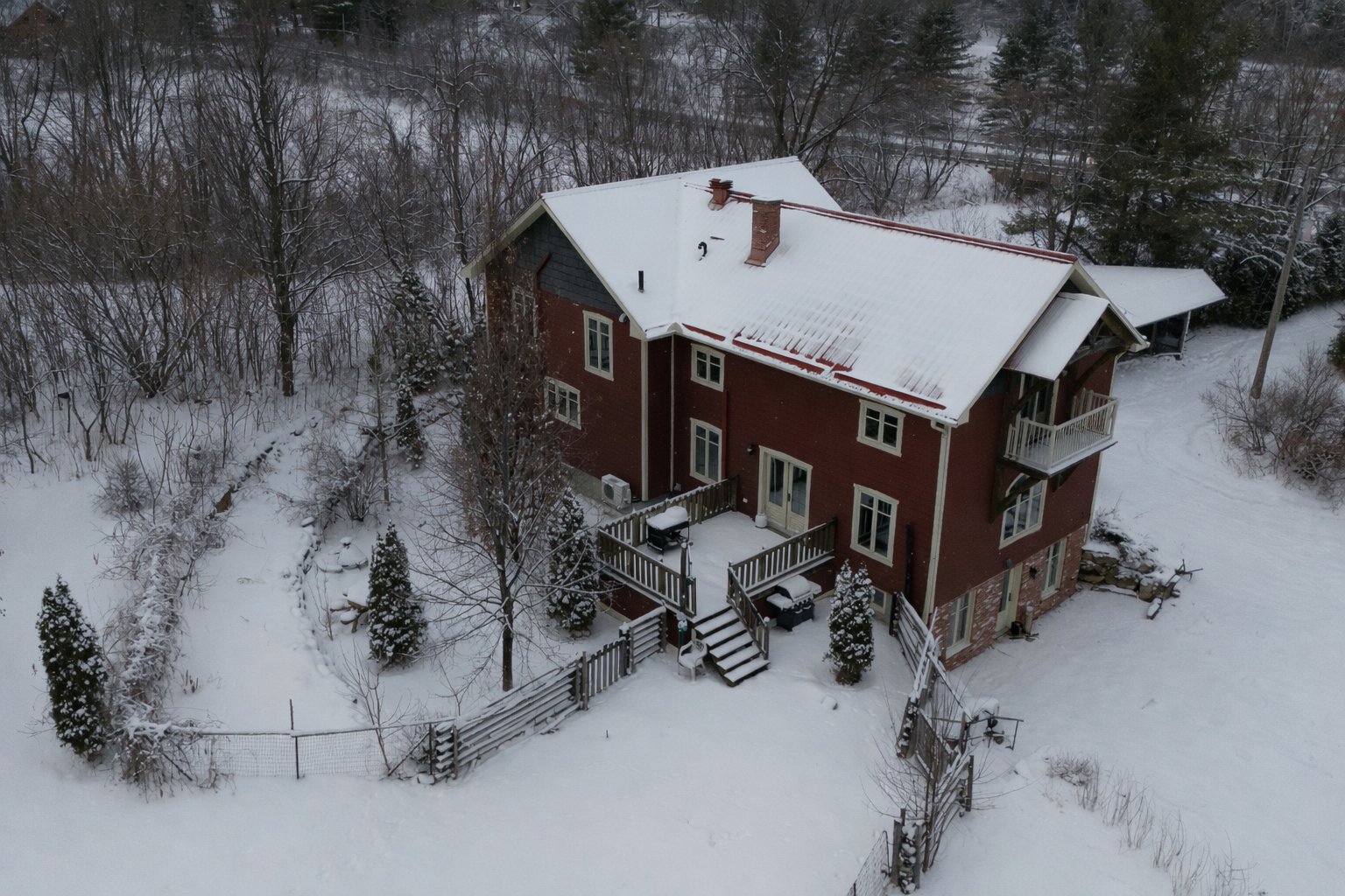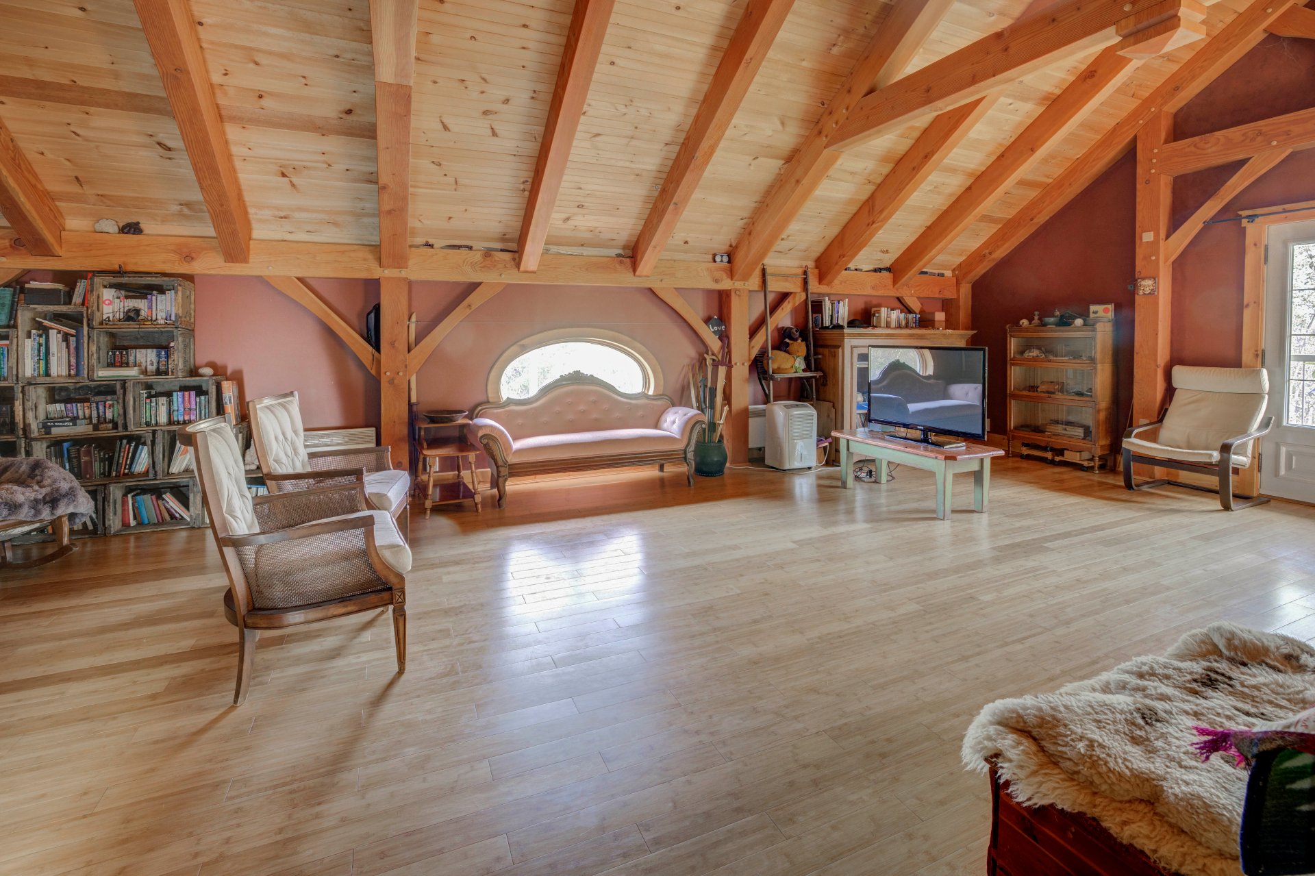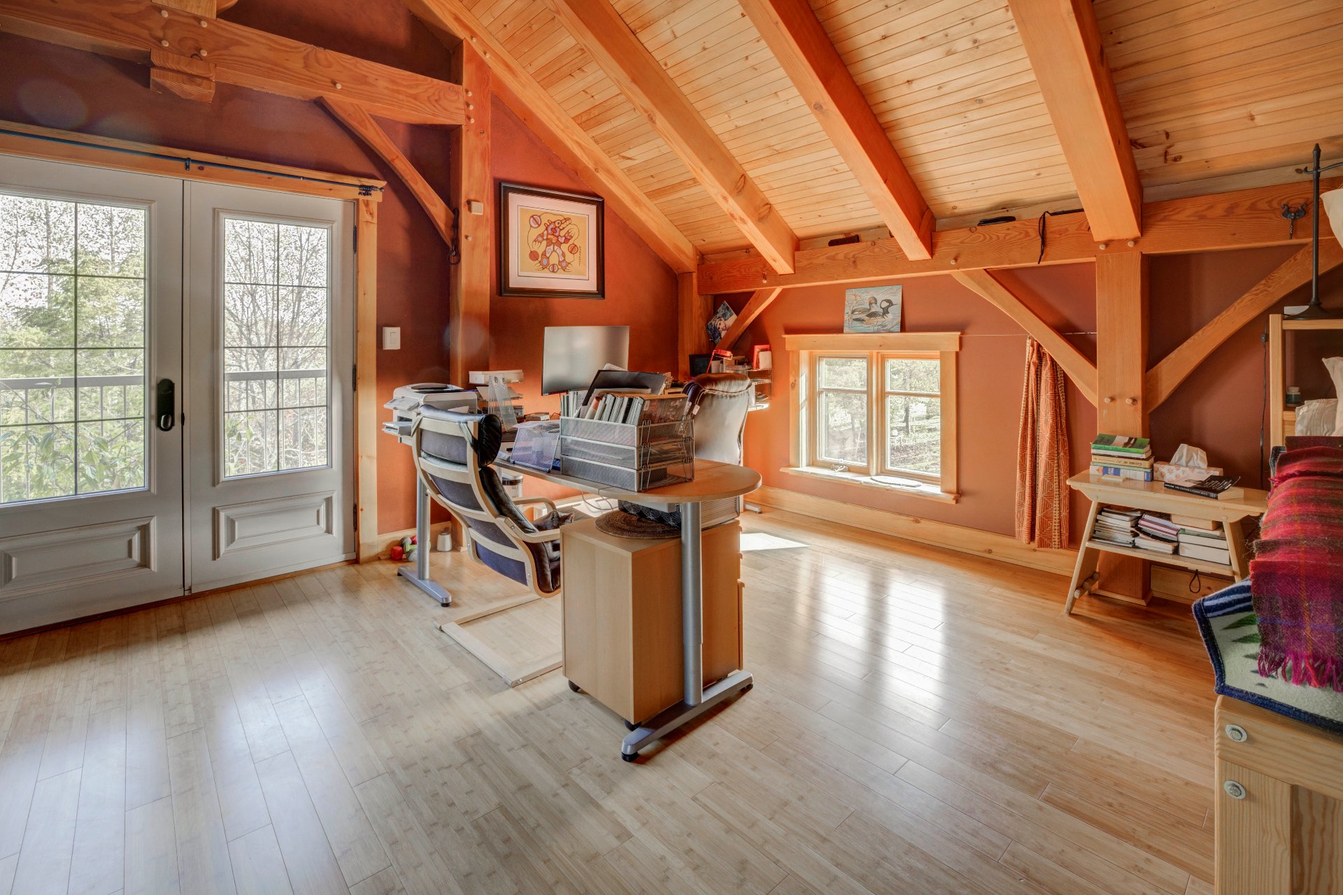 Domaine exceptionnel de 145 acres avec maison en retrait de la route pour une tranquilité absolue. La maison originale a été surélevée et a été intégrée à une nouvelle construction de type "timber frame". Poutres apparentes, plafonds cathédrale, escaliers en érable piqué massif, boiseries, foyer de masse en brique et espace de vie à aire ouverte sont tous des éléments qui donnent une ambiance chaleureuse à cette spacieuse propriété. L'immense chambre des maîtres offre de multiples possibilités d'aménagement en plus d'un accès à son propre petit balcon. Érigée à flanc de colline, le sous-sol bénéficie d'un accès au niveau du sol.