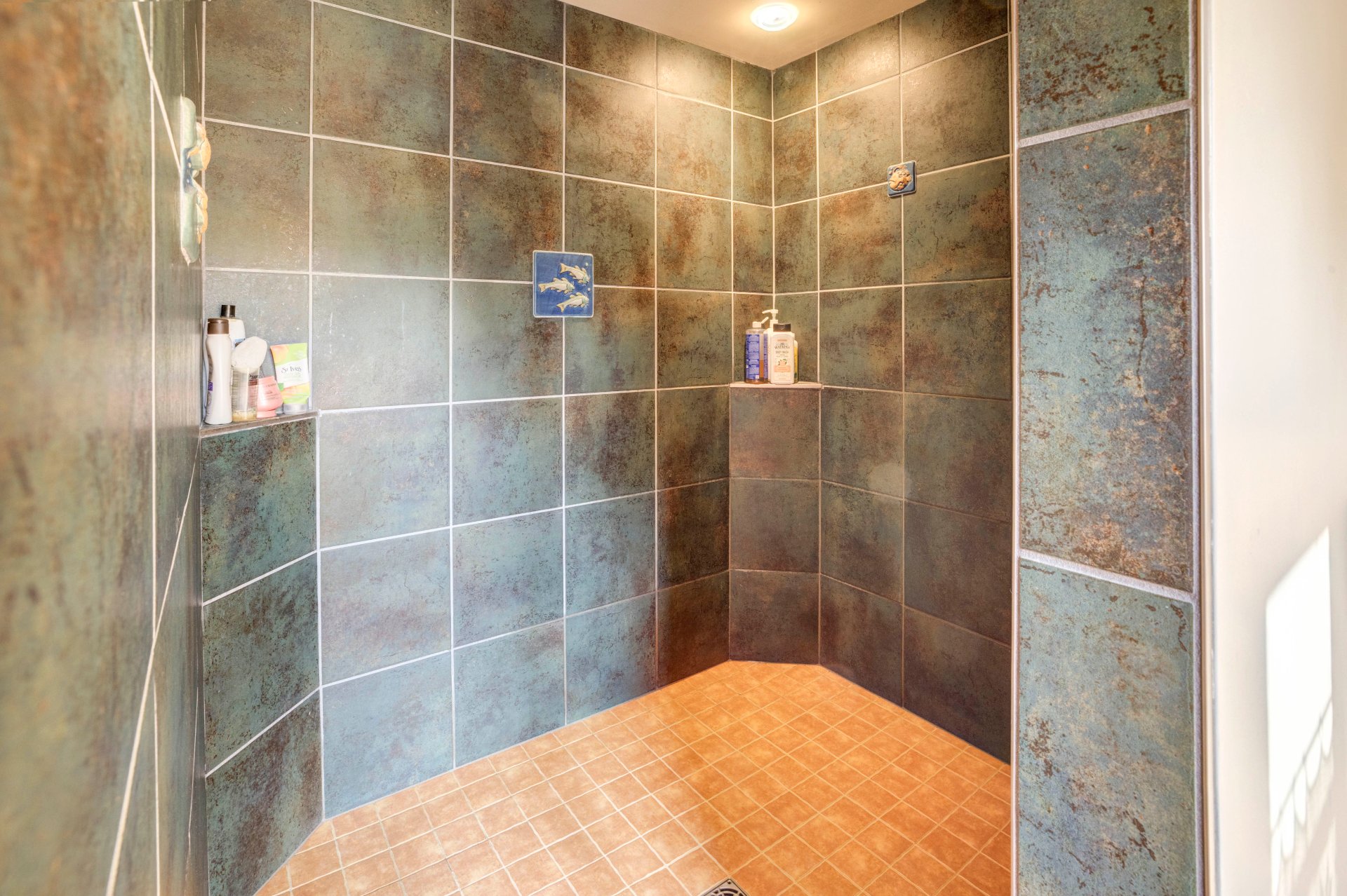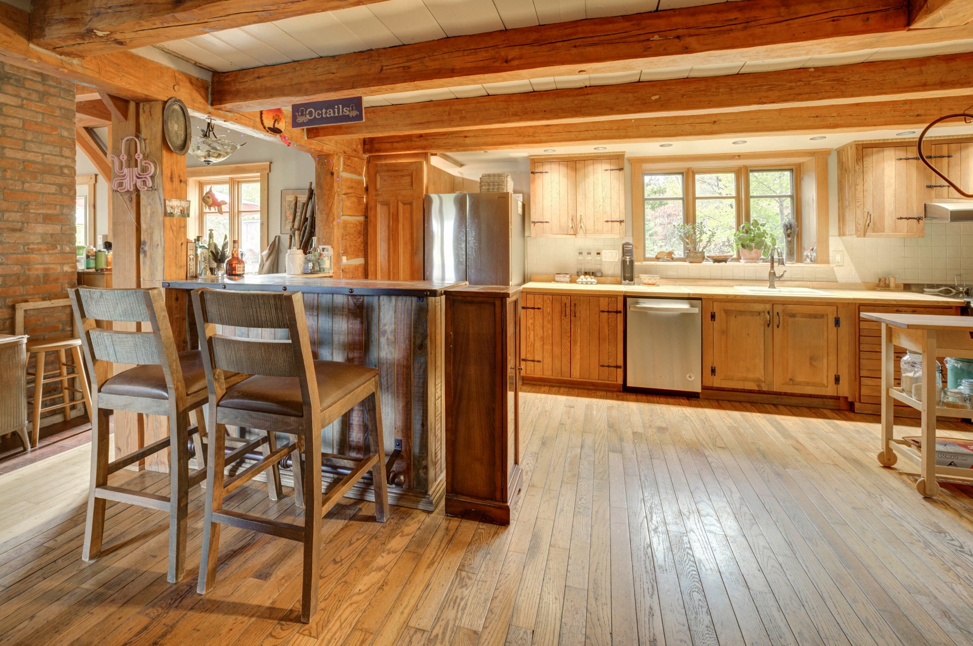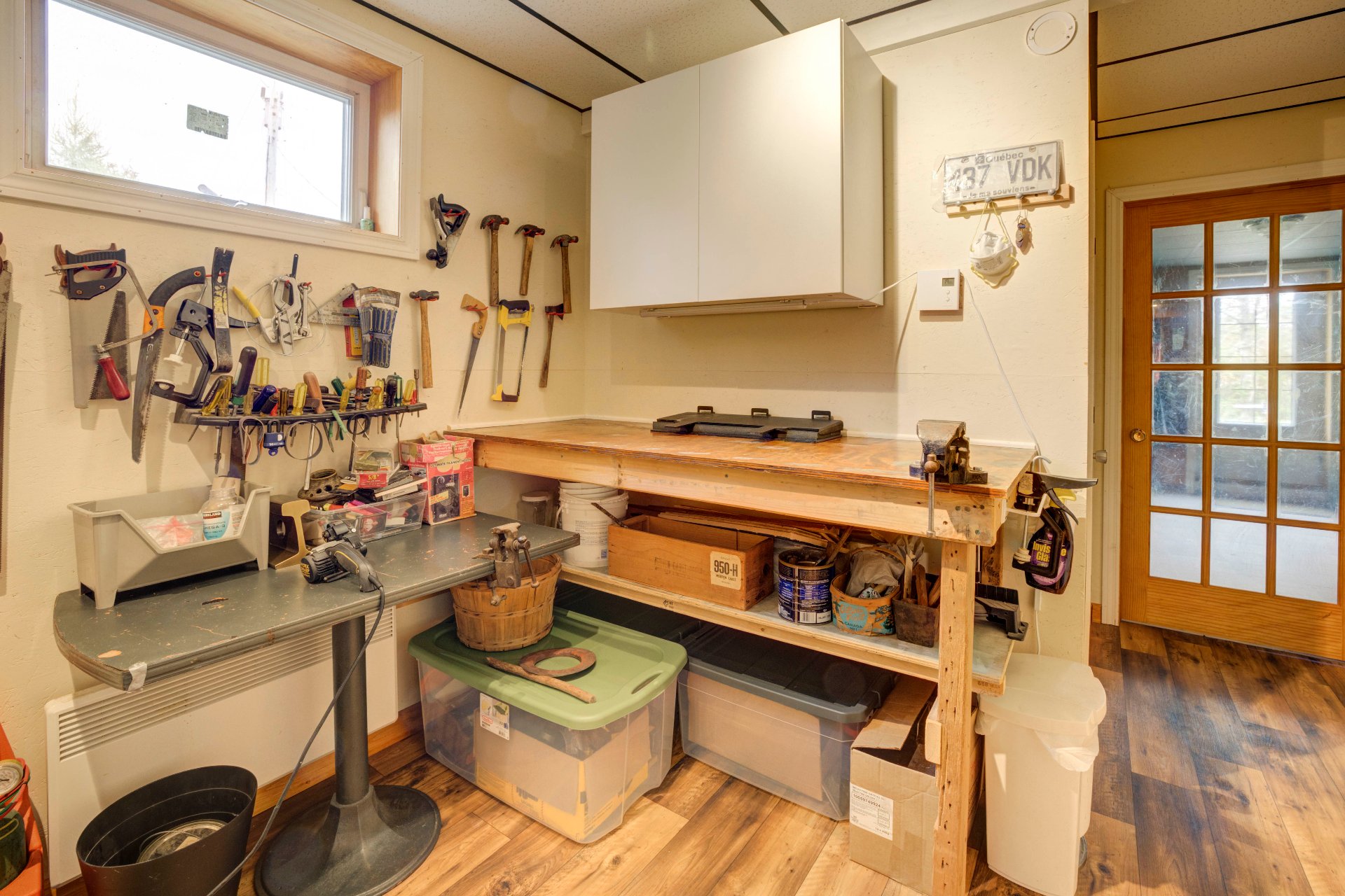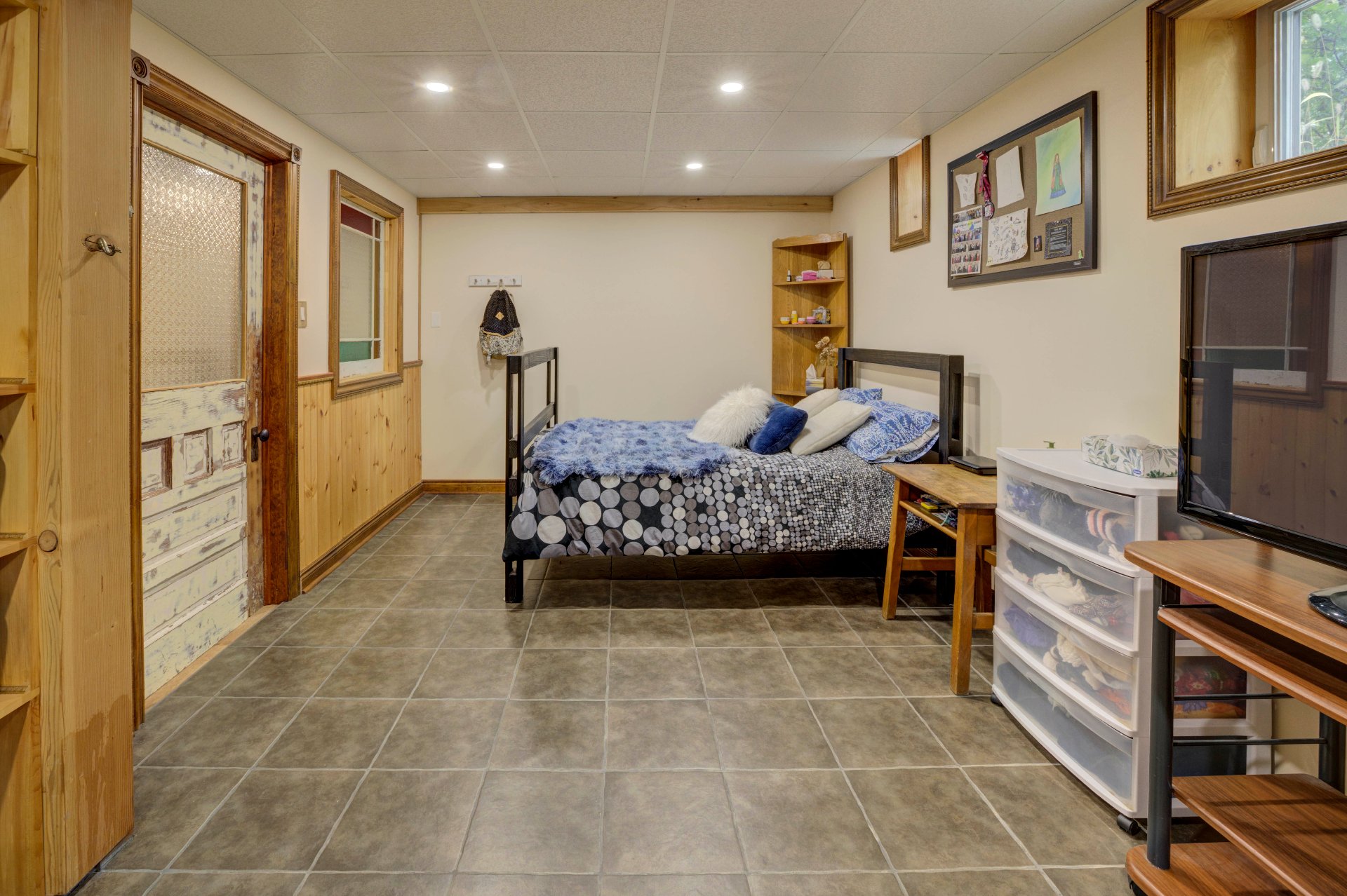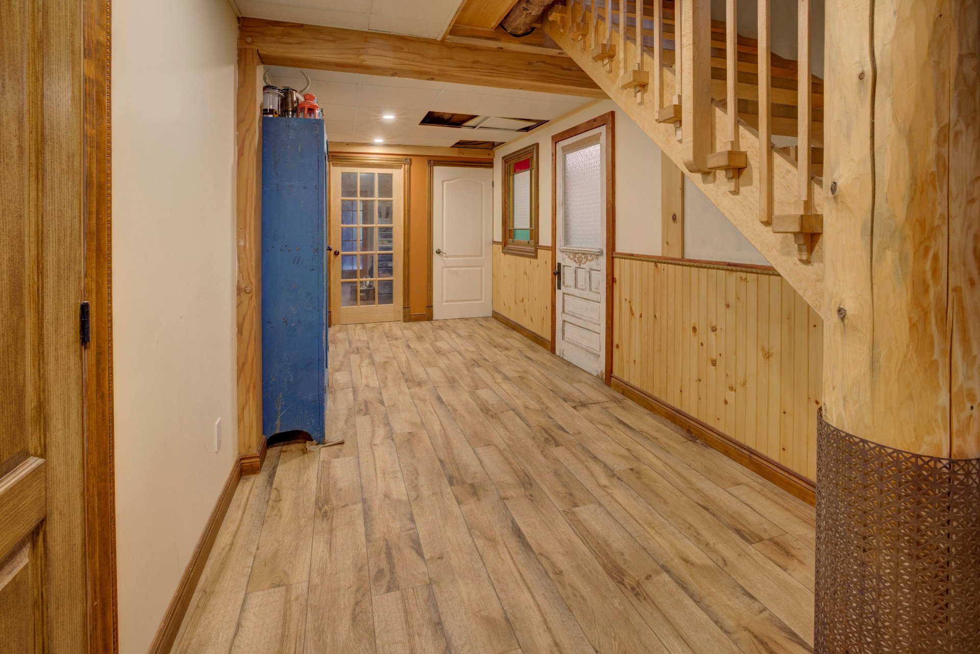 - Applique murale à droite de la chambre principale et lustre en verre derrière le bar, armoire brune dans la cuisine, réfrigérateur de la cuisine, congélateur vertical au sous-sol, laveuse et sécheuse, tondeuse à gazon John Deere, coffre-fort au sous-sol, casiers au sous-sol, bureau à bijoux, oeuvres d'art aux murs.