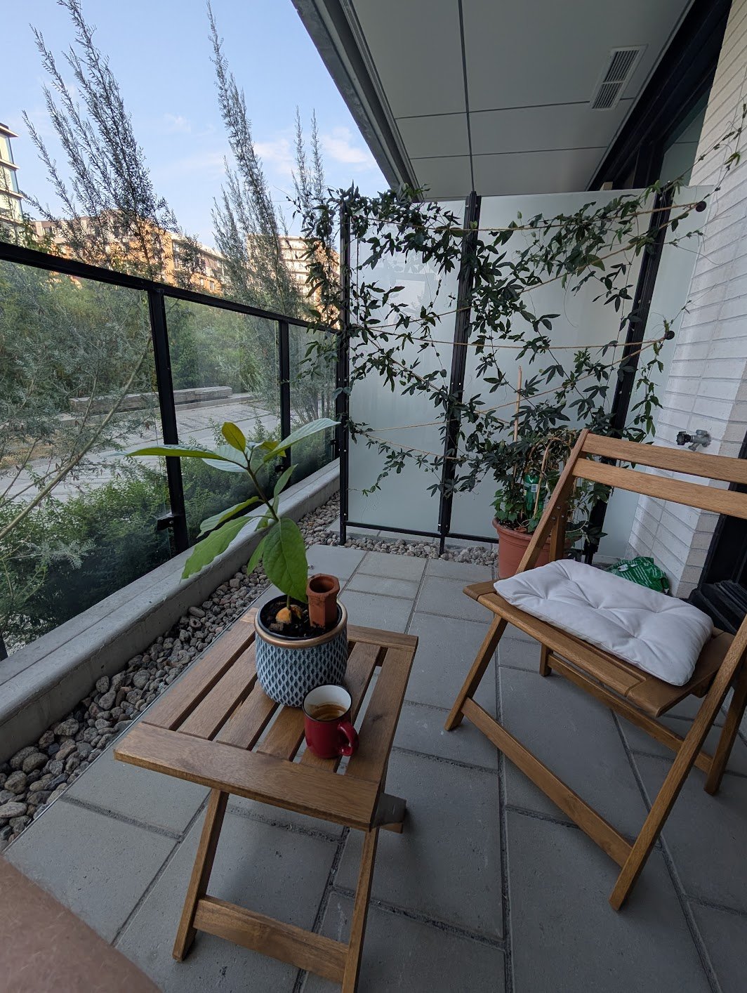-- Studio moderne et lumineux avec balcon donnant sur la verdure.