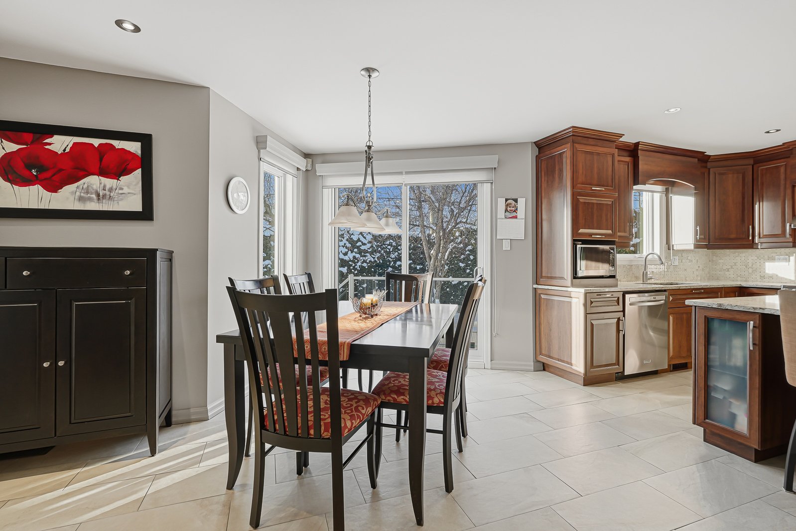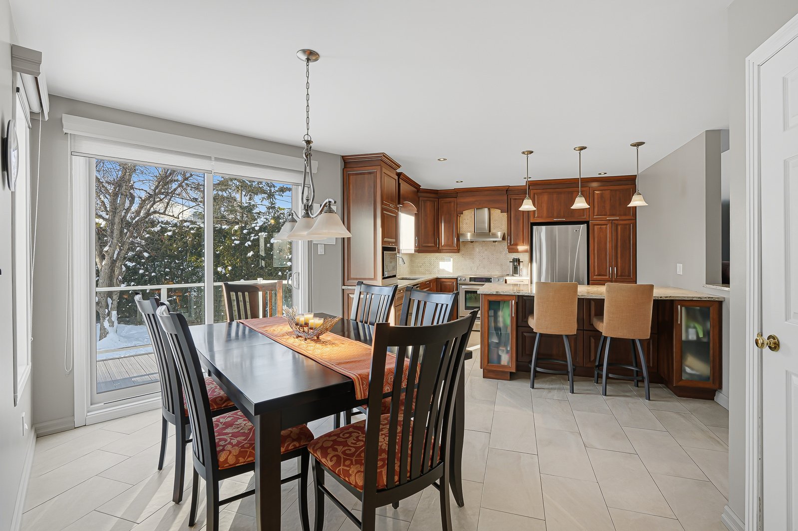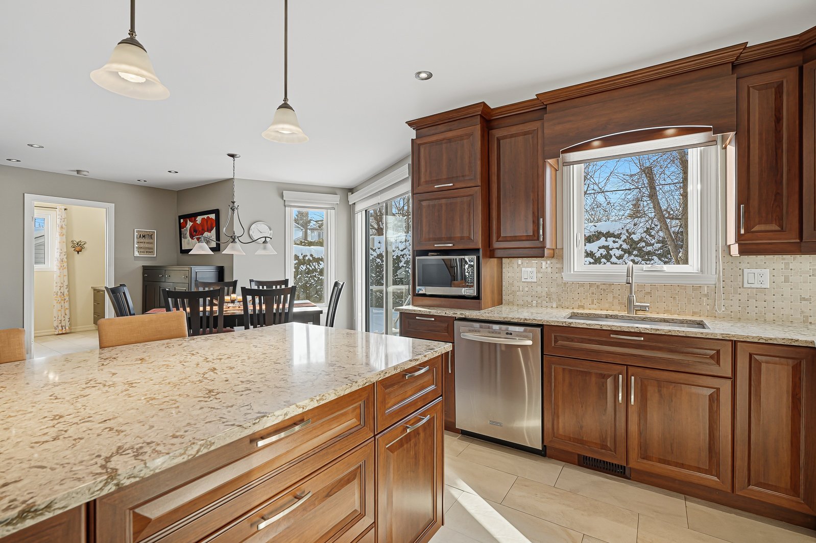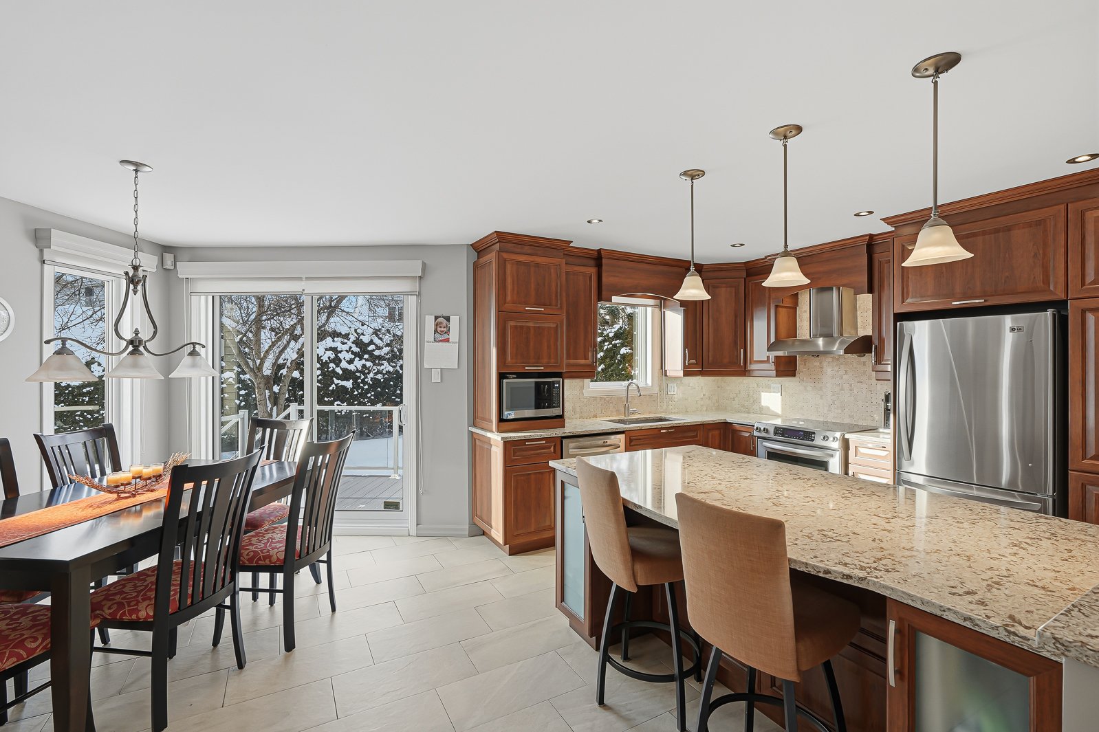La cuisine, à la fois élégante et pratique, propose de nombreuses armoires en bois, des comptoirs de granit, un vaste îlot central et un éclairage bien pensé. Elle s'ouvre sur la salle à manger, donnant accès à la terrasse arrière, idéale pour les repas à l'extérieur, les moments de détente ou les réceptions estivales.