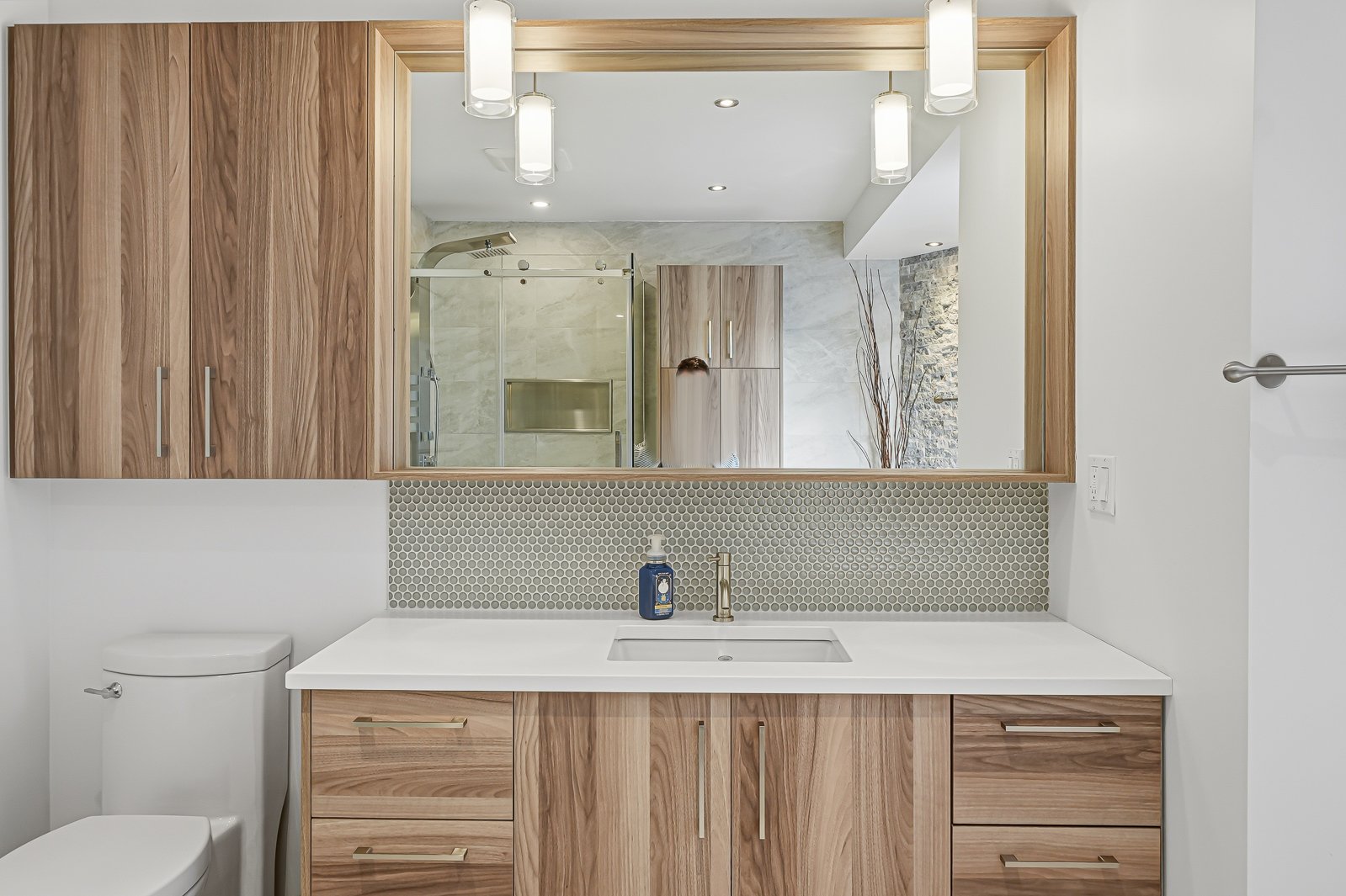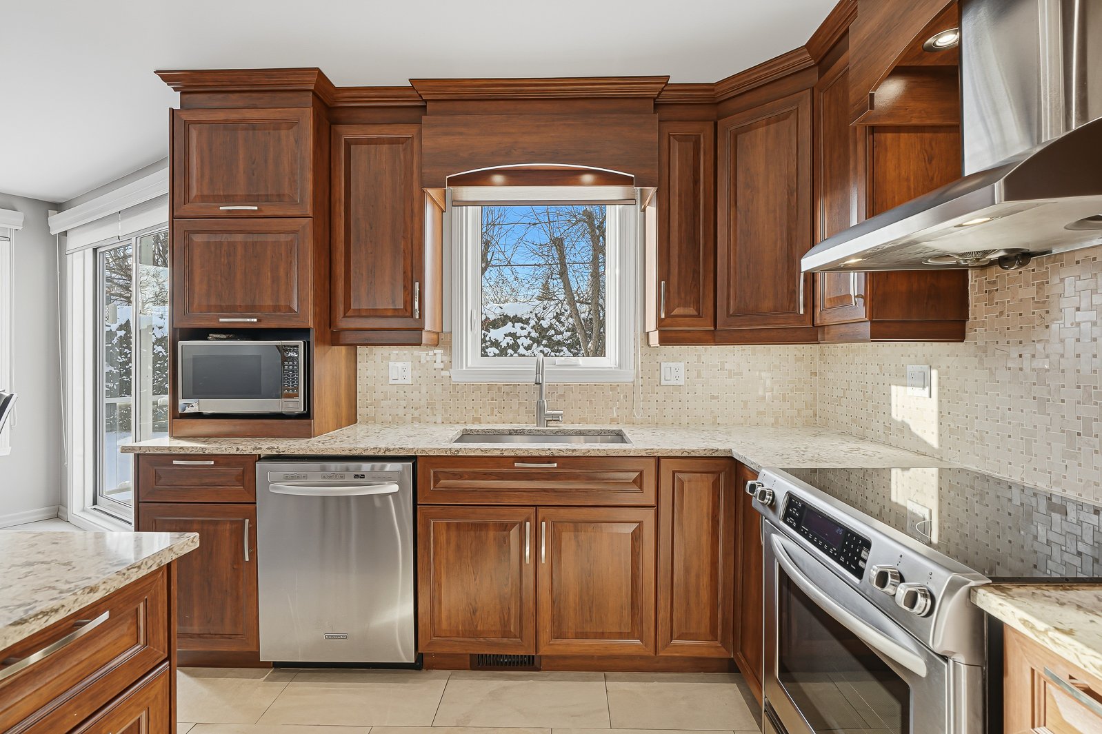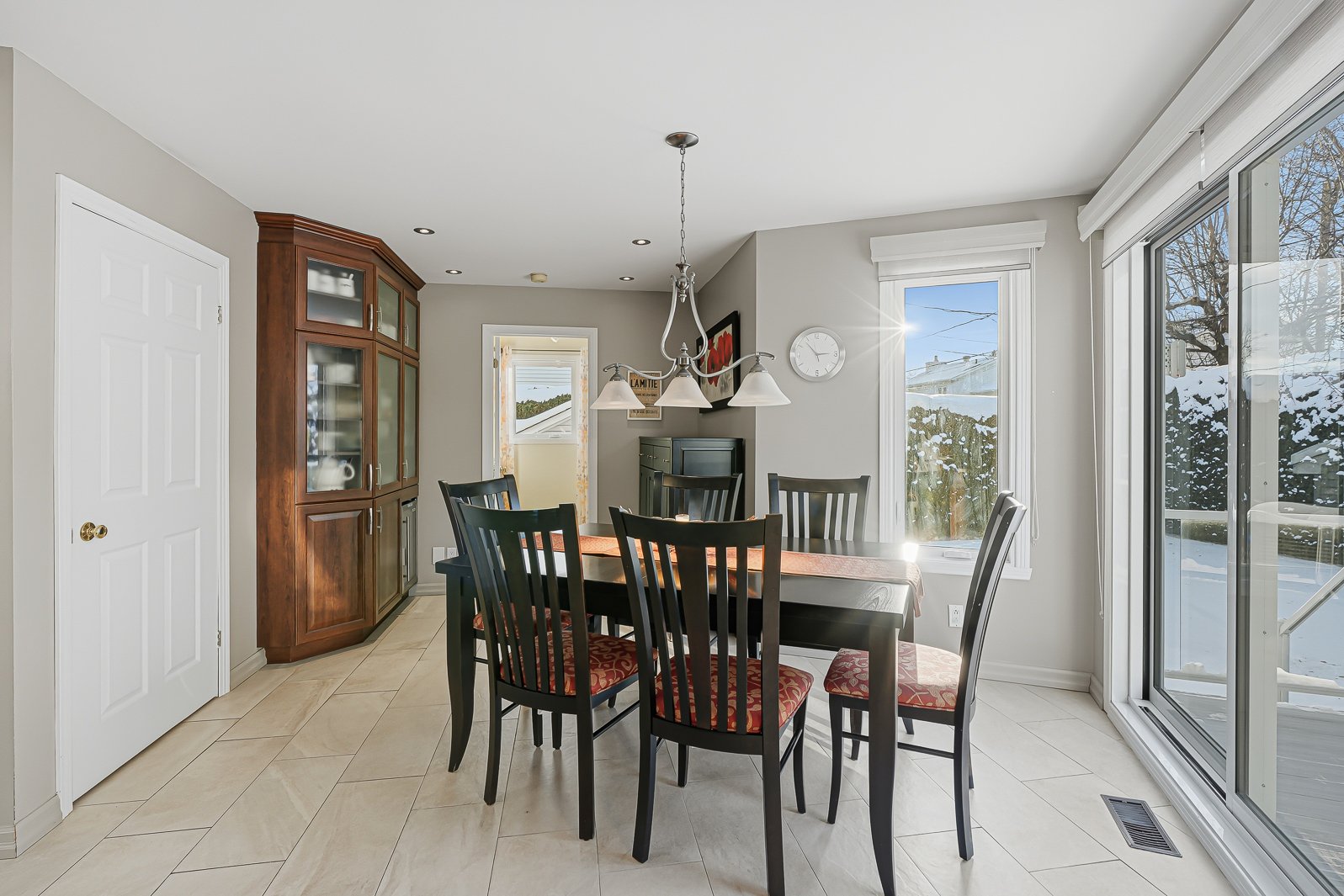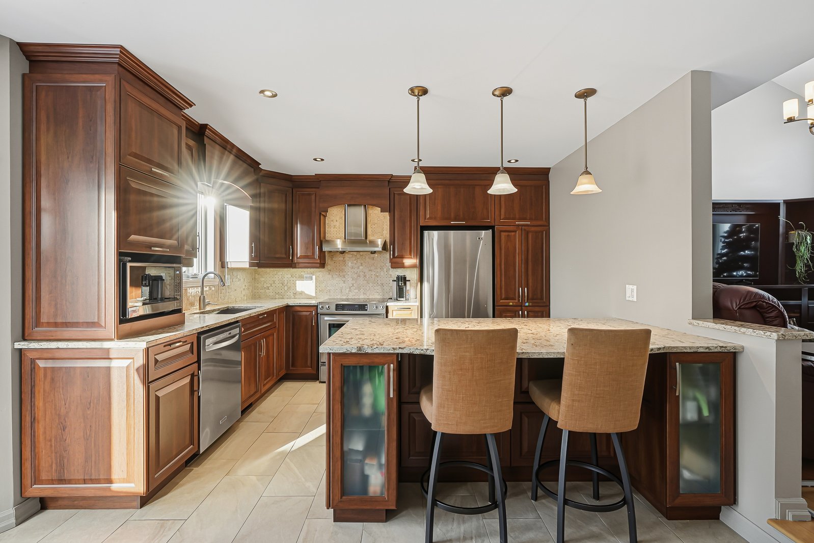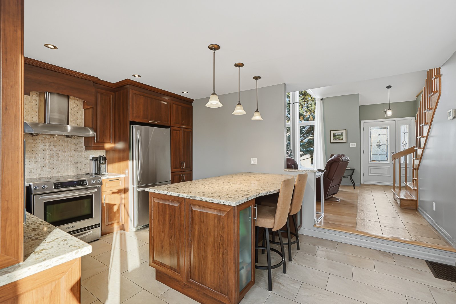 La cuisine, à la fois élégante et pratique, propose de nombreuses armoires en bois, des comptoirs de granit, un vaste îlot central et un éclairage bien pensé. Elle s'ouvre sur la salle à manger, donnant accès à la terrasse arrière, idéale pour les repas à l'extérieur, les moments de détente ou les réceptions estivales.