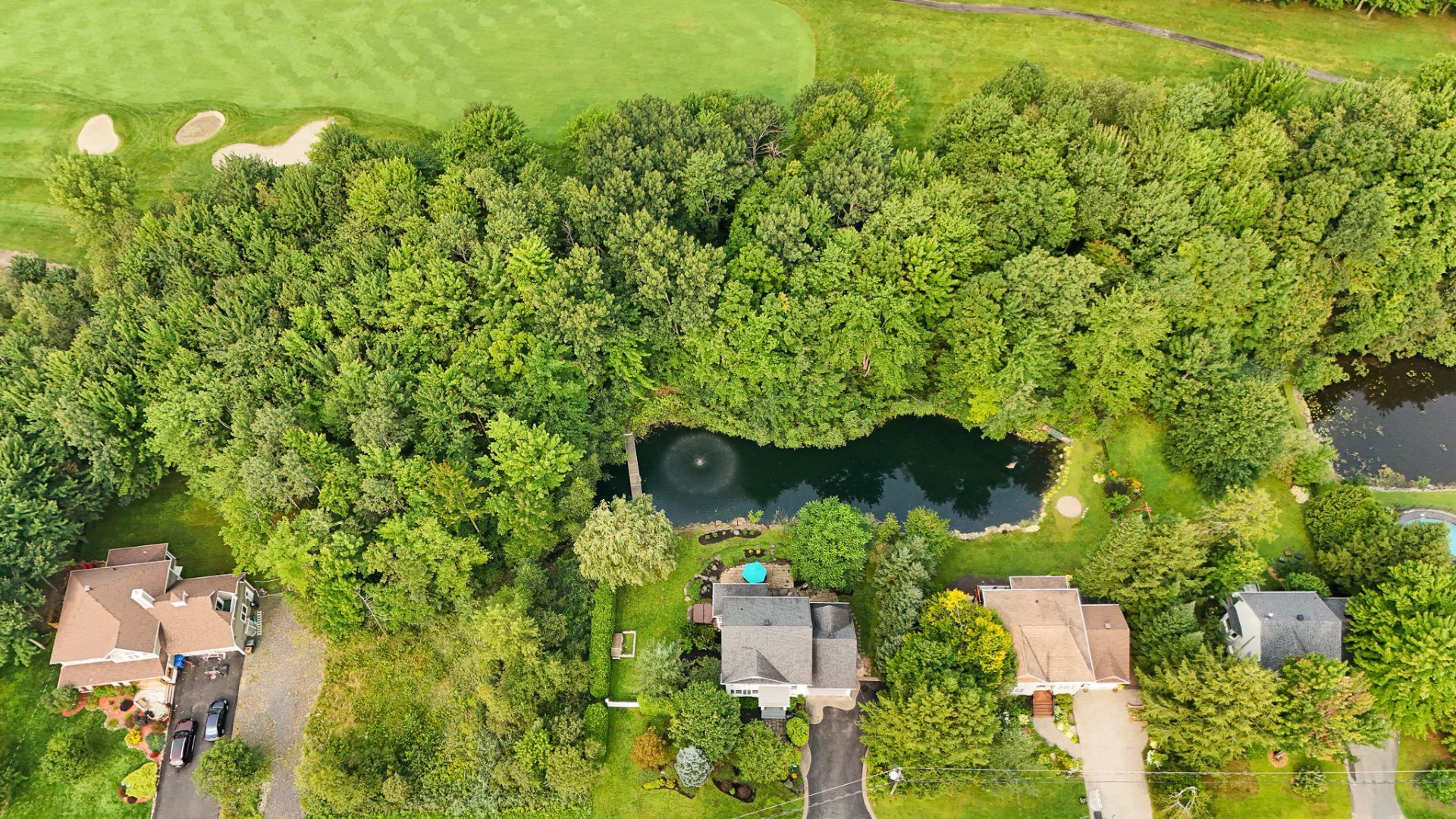À l'extérieur, un étang avec fontaine et quai ajoute une touche de quiétude et de raffinement. L'été, il offre une vue reposante; l'hiver, il se transforme en une charmante patinoire.