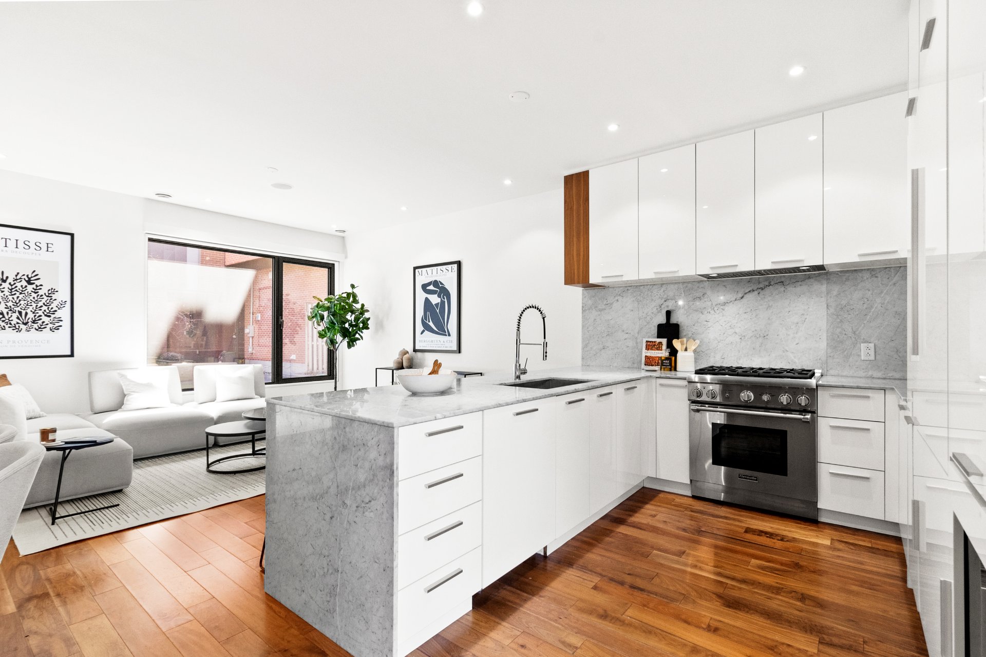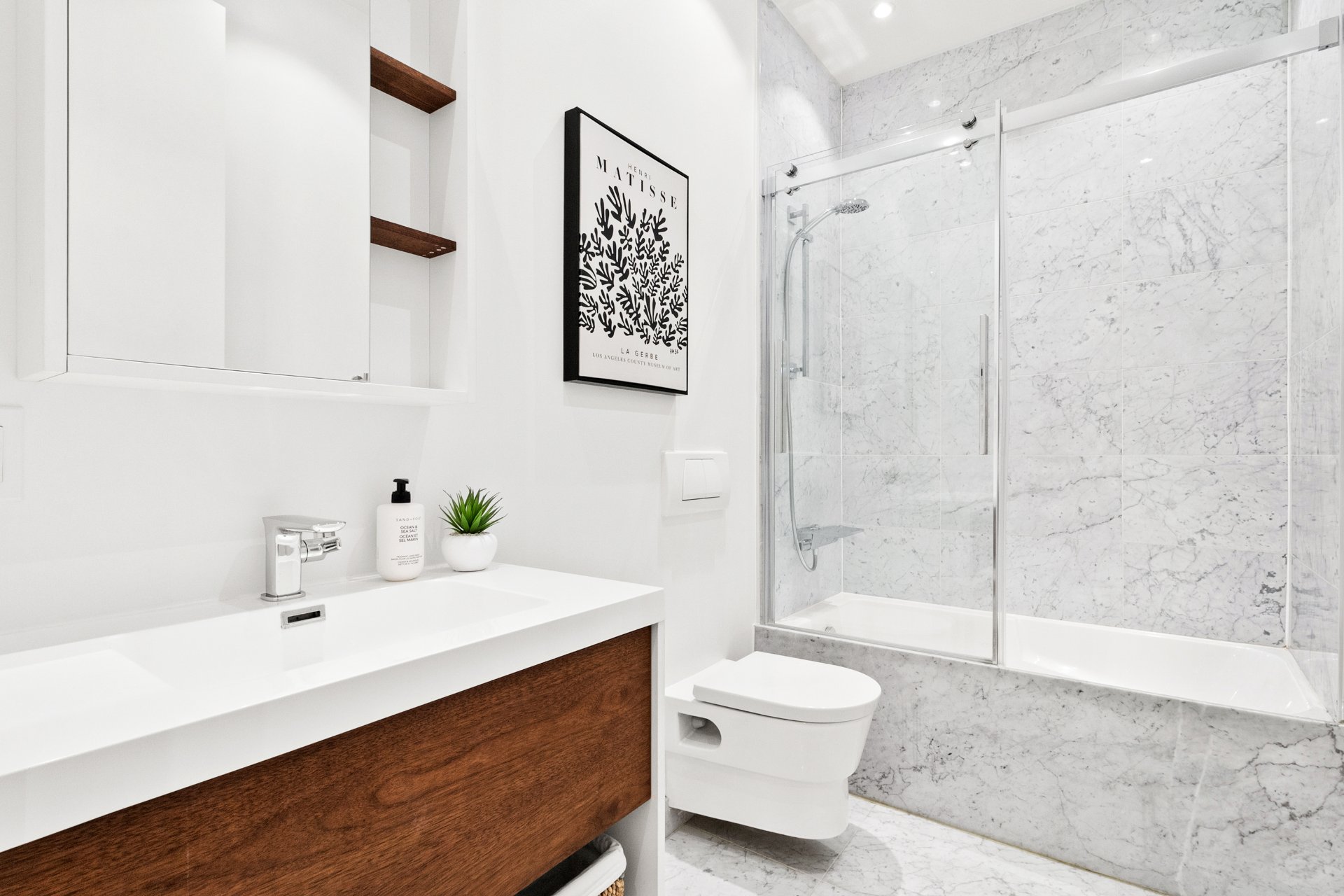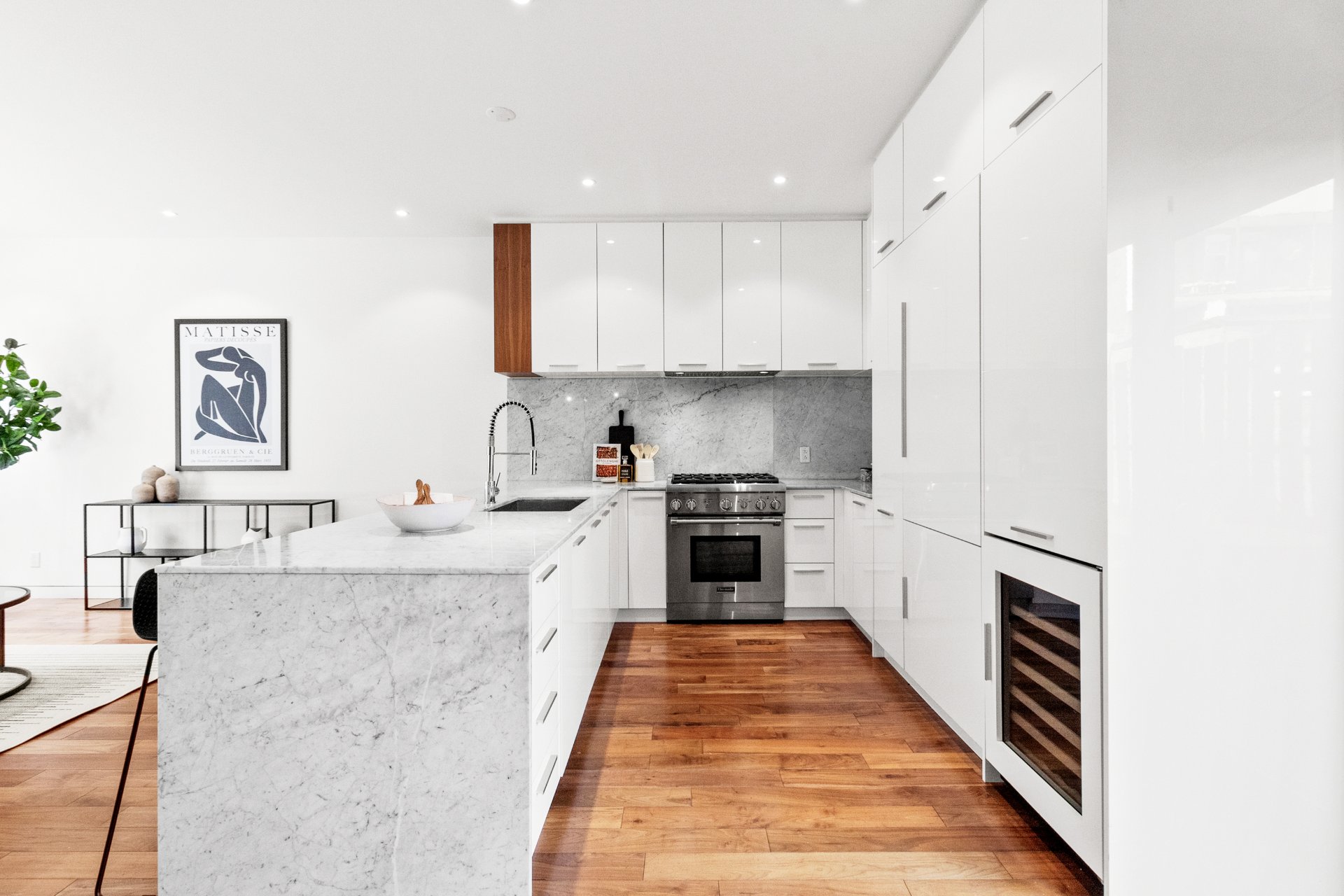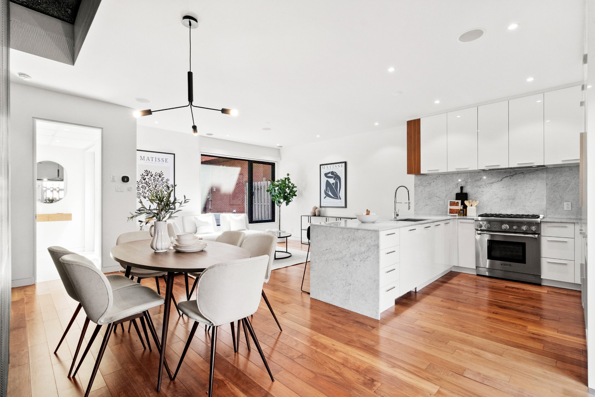 Le rez-de-chaussée se distingue par une aire de vie ouverte, lumineuse et bien équilibrée. La cuisine haut de gamme, avec ses armoires laquées, son îlot central et comptoir/dosseret en marbre Arabescato, s'intègre harmonieusement à la salle à manger et au salon. Une terrasse prolonge cet espace vers l'extérieur, côté jardin.