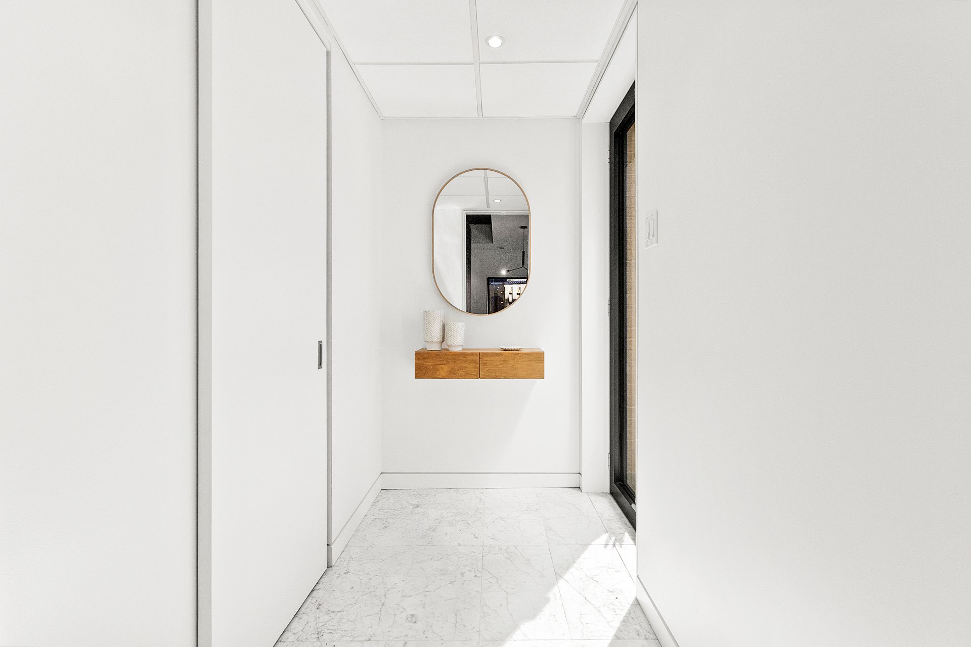 La propriété bénéficie d'une entrée privée ainsi que d'un accès direct au garage double souterrain, offrant une circulation pratique et discrète au quotidien. Le sous-sol propose également un espace de rangement et une salle d'eau.