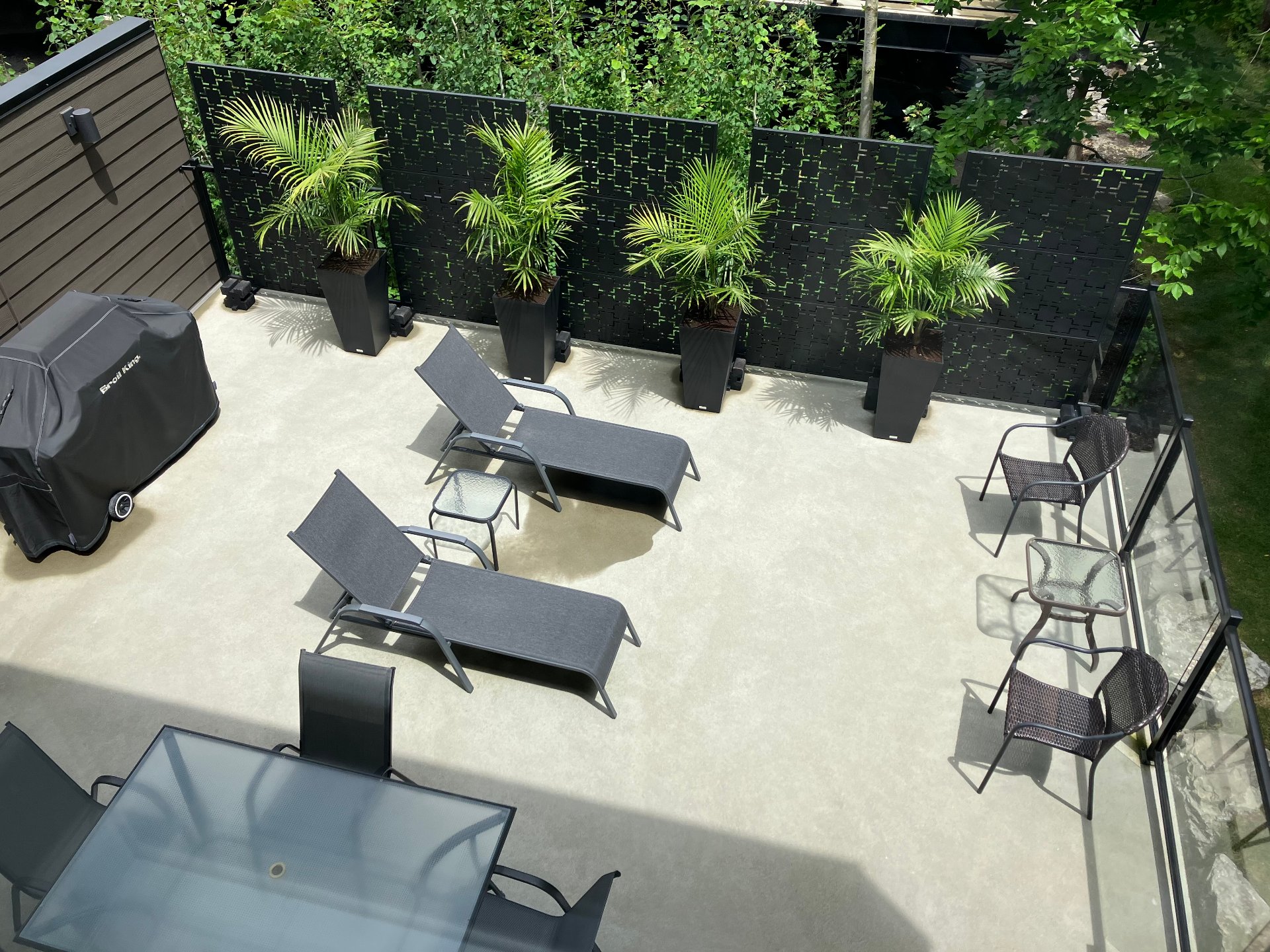 Magnifique terrasse surdimensionnée de 24 x 25 pieds, munie de panneaux d'intimité, idéale pour recevoir et profiter pleinement de la belle saison. Elle est équipée d'une prise de gaz naturel pour le BBQ, d'une sortie d'eau ainsi que d'un espace de rangement extérieur. Un escalier privé mène directement au terrain arrière et au boisé, offrant un cadre naturel exceptionnel, rare en copropriété.
